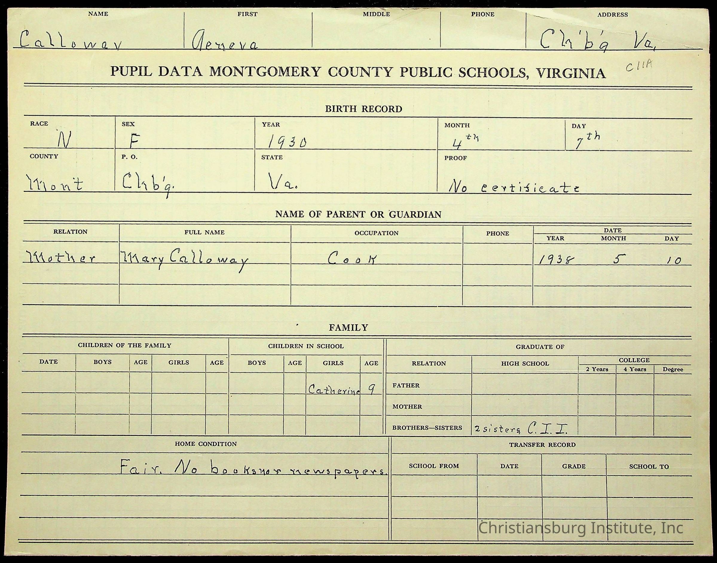 Christiansburg Institute, Montgomery County Public Schools, Calloway, Geneva