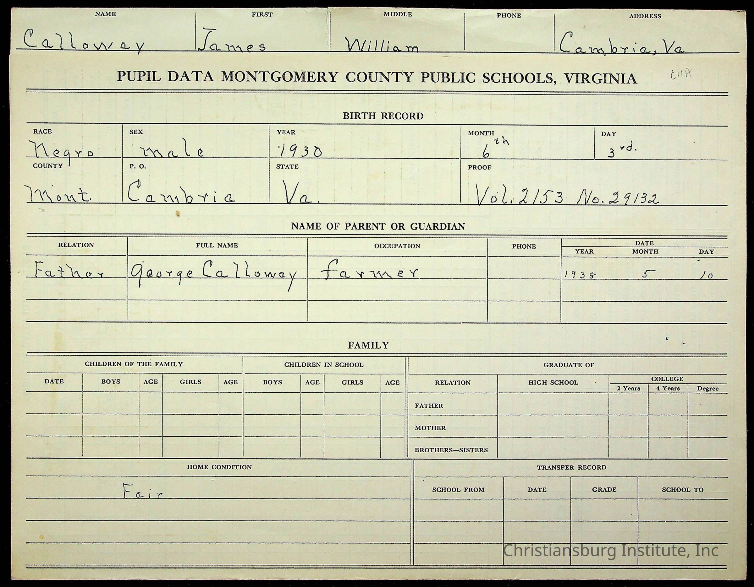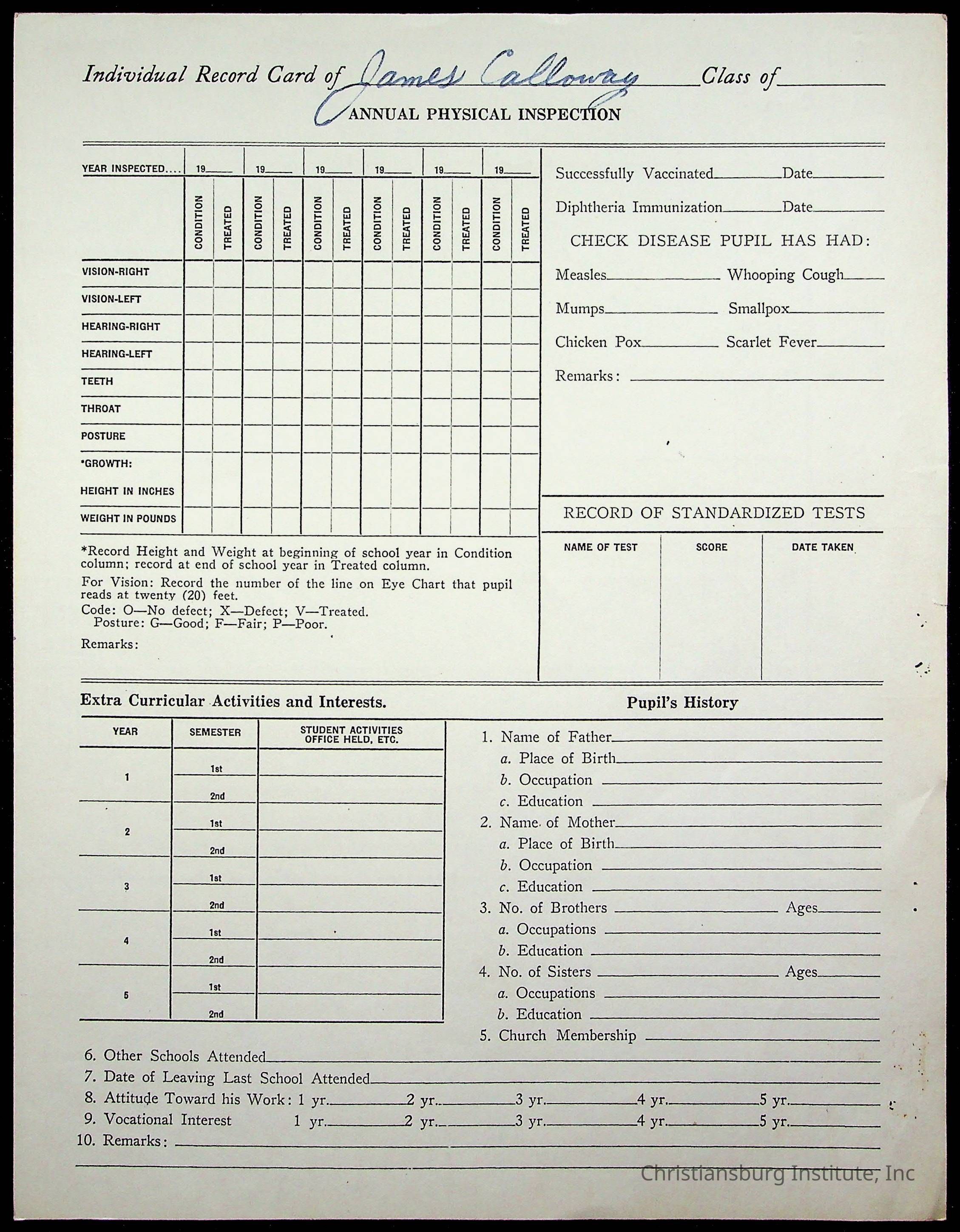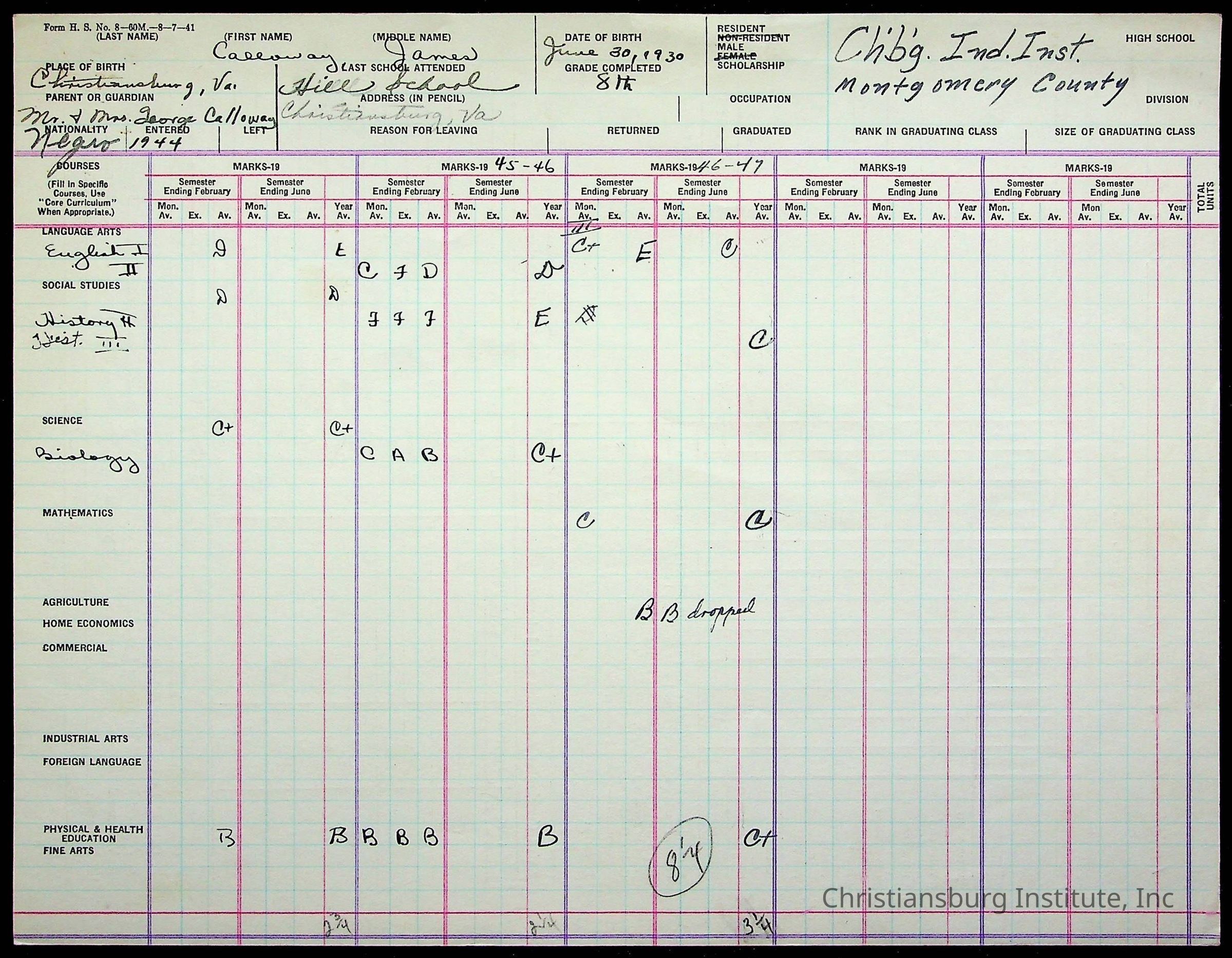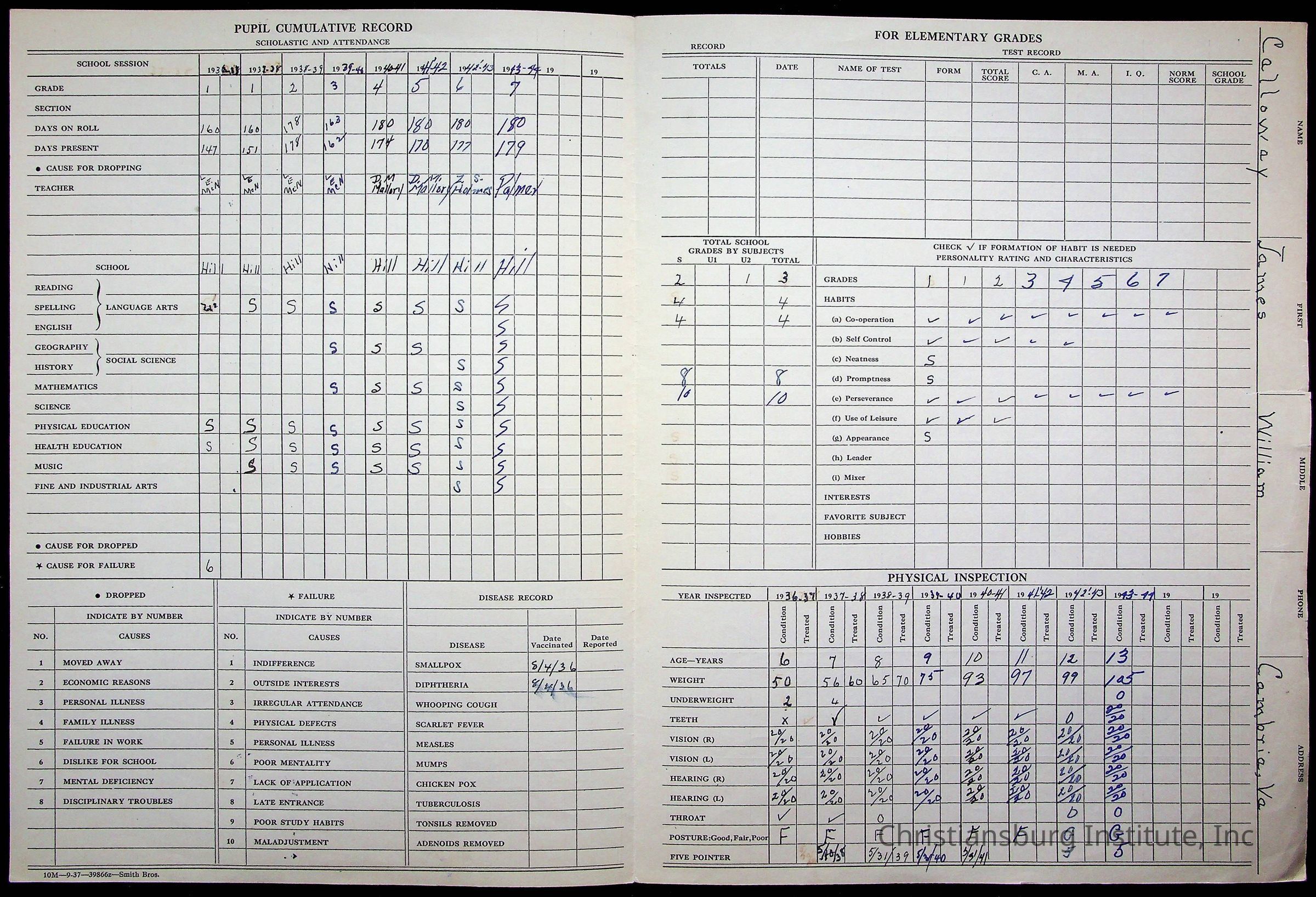 The student file for the Christiansburg Institute student, James William Calloway circa 1930-1940s.