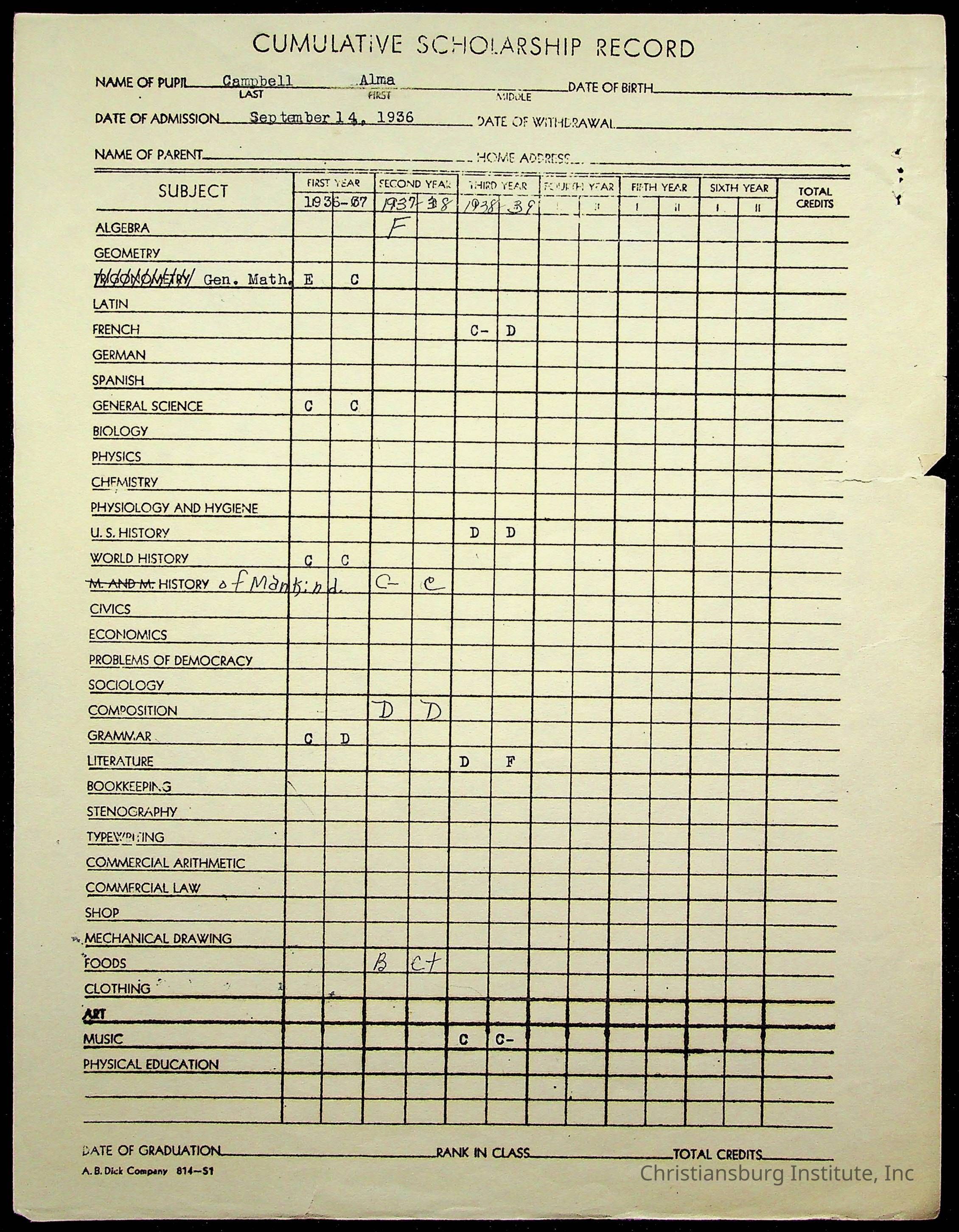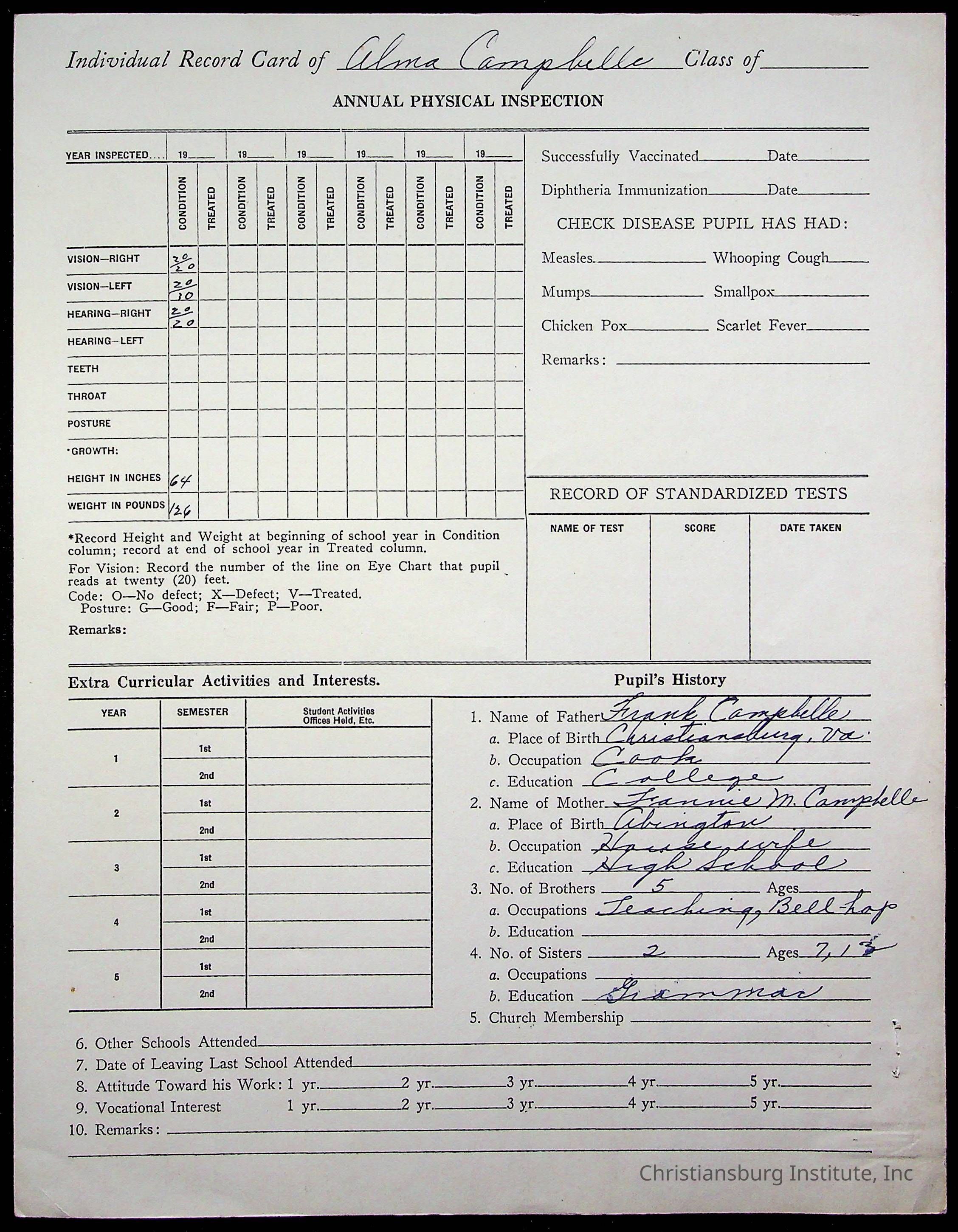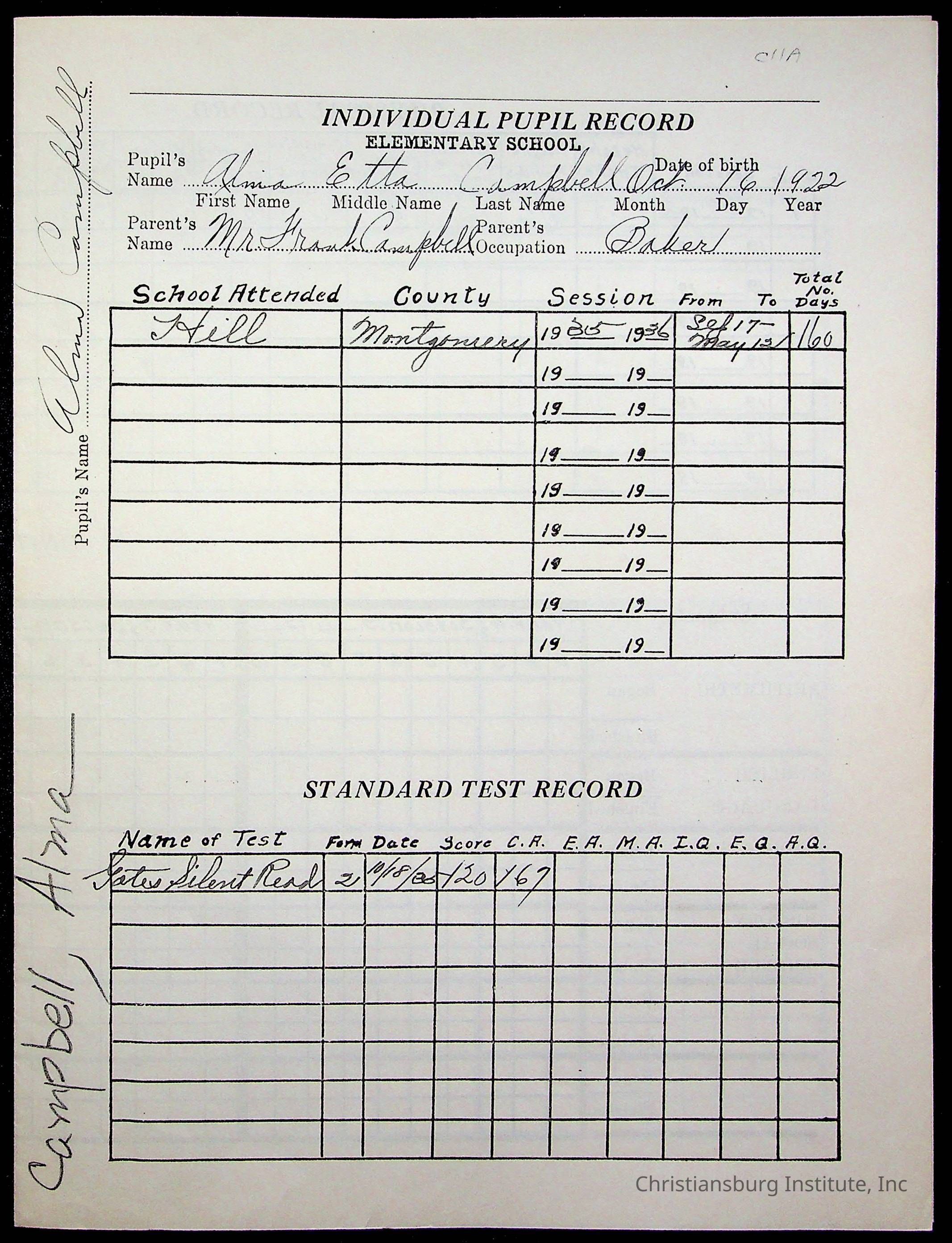 The student file for the Christiansburg Institute student, Alma Campbell circa 1930s.