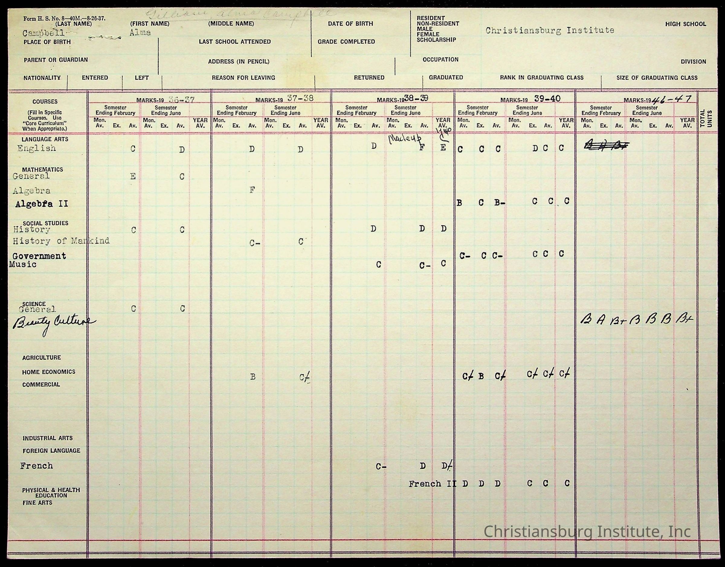 Christiansburg Institute, Montgomery County Public Schools, Campbell, Alma