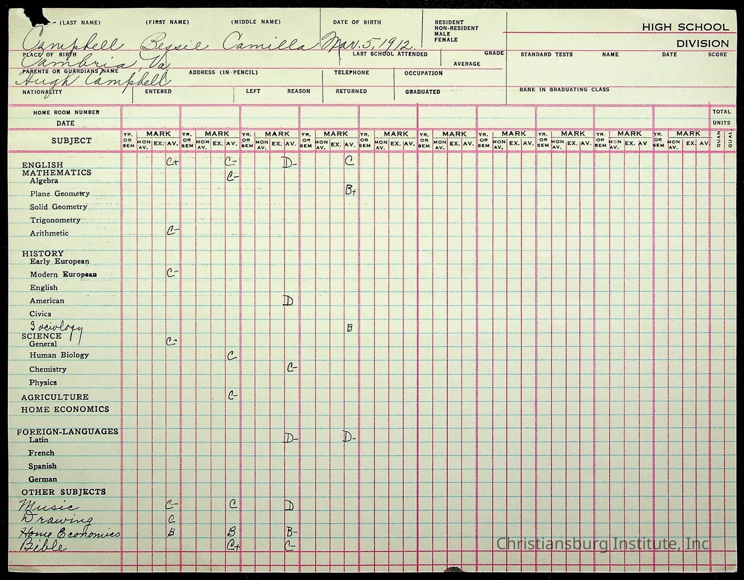 The student file for the Christiansburg Institute student, Bessie Camilla Campbell circa 1930s.