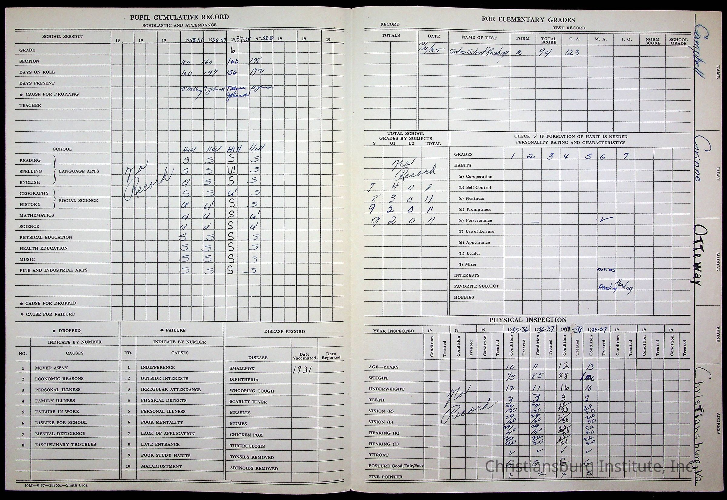 The student file for the Christiansburg Institute student, Corinnie Ottway Campbell circa 1940s.