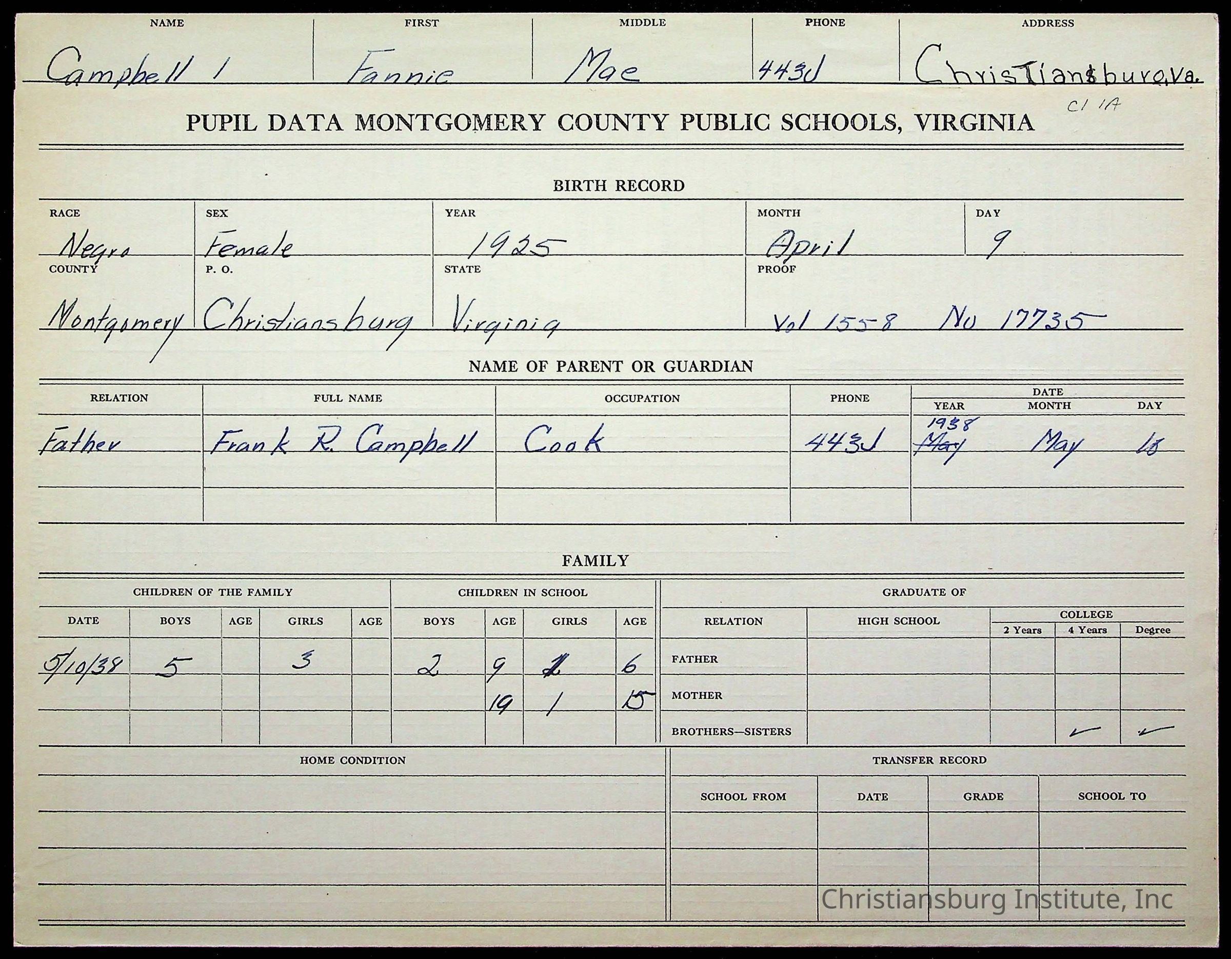 Montgomery County Public Schools, Christiansburg Institute, Campbell, Fannie Mae