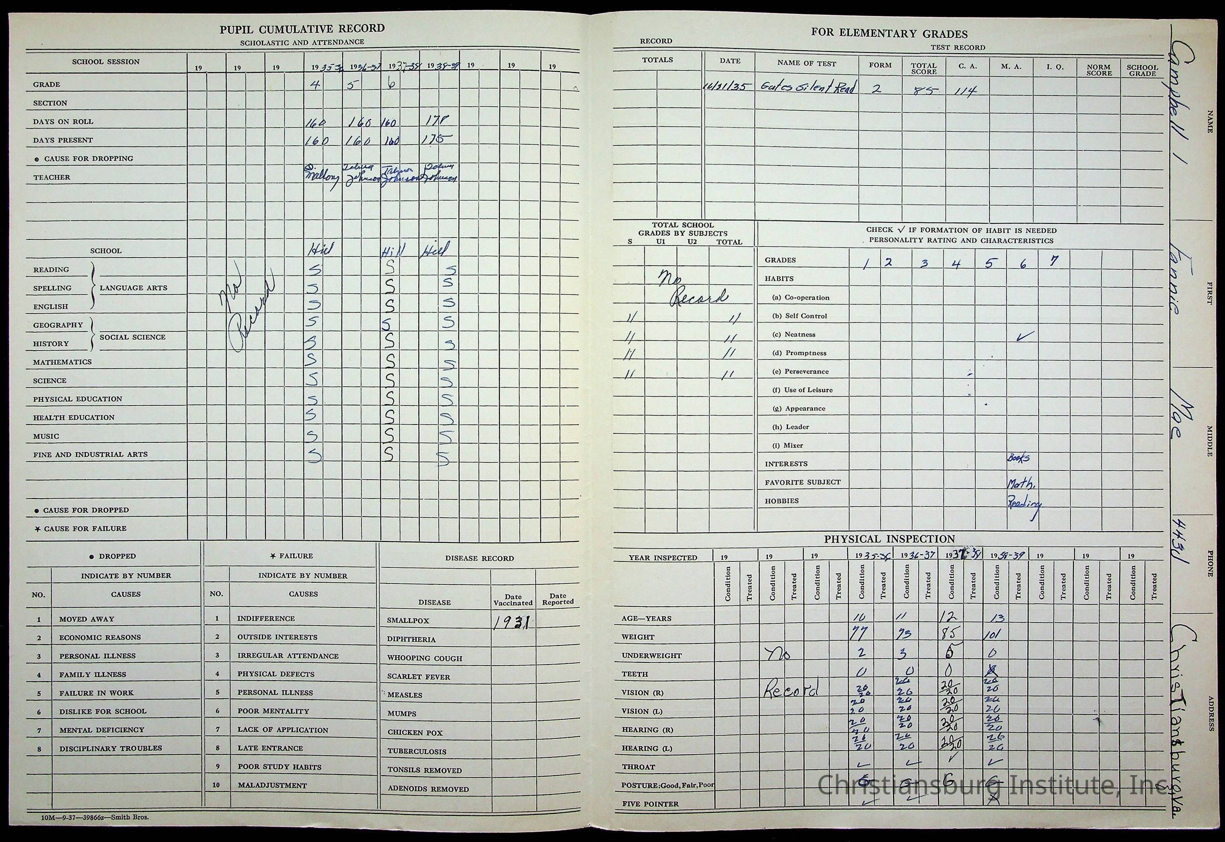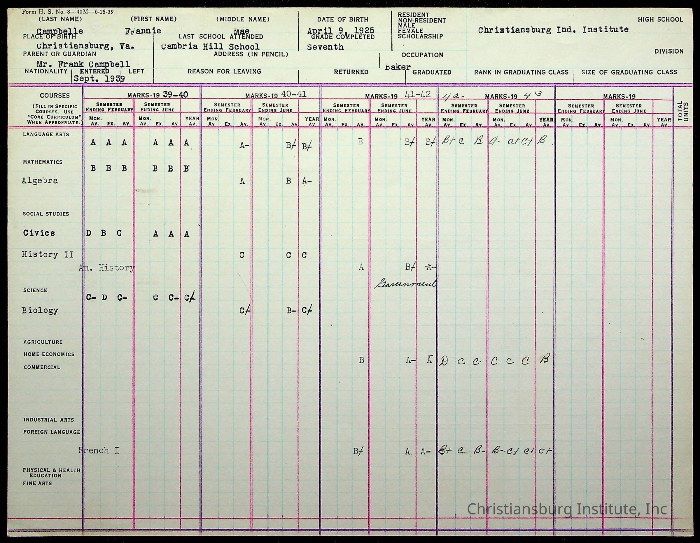 The student file for the Christiansburg Institute student, Fannie Mae Campbell circa 1940s.