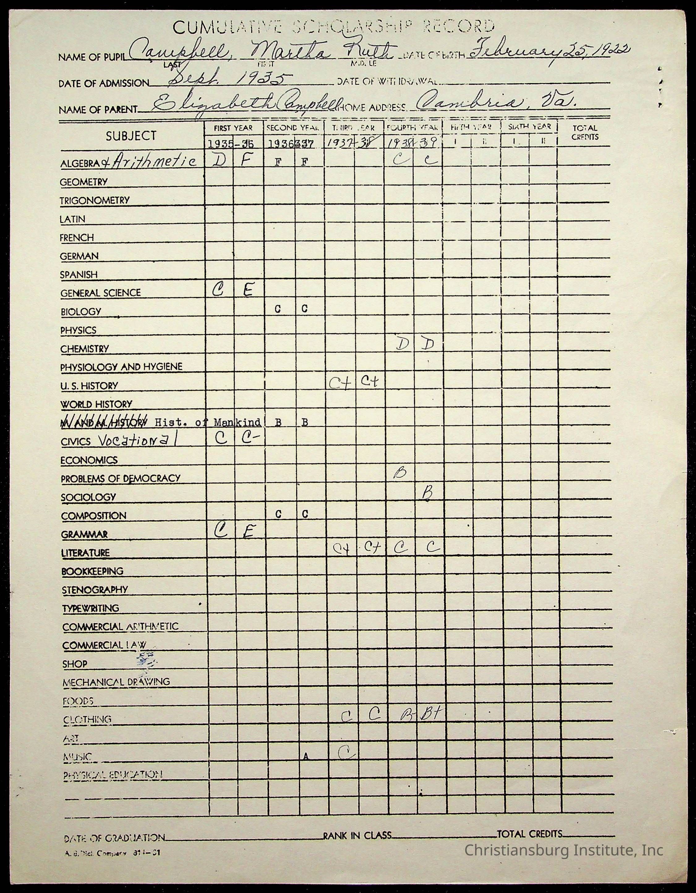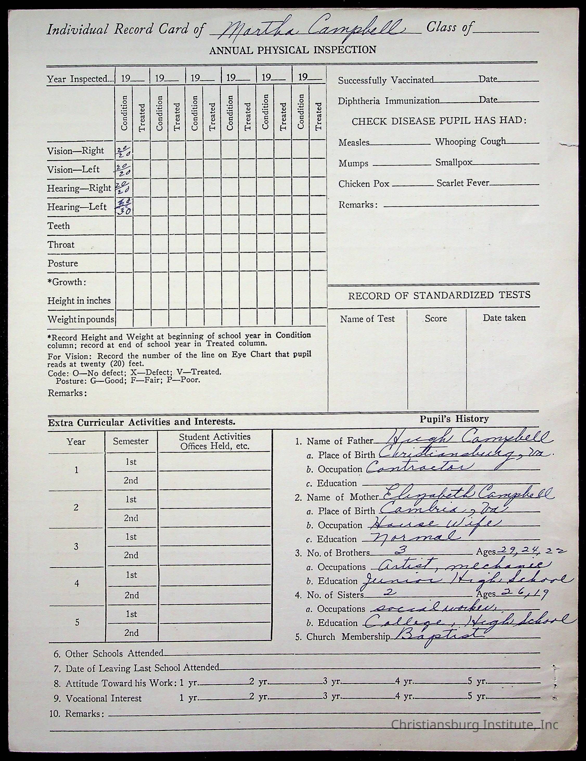 The student file for the Christiansburg Institute student, Martha Ruth Campbell circa 1930s.
