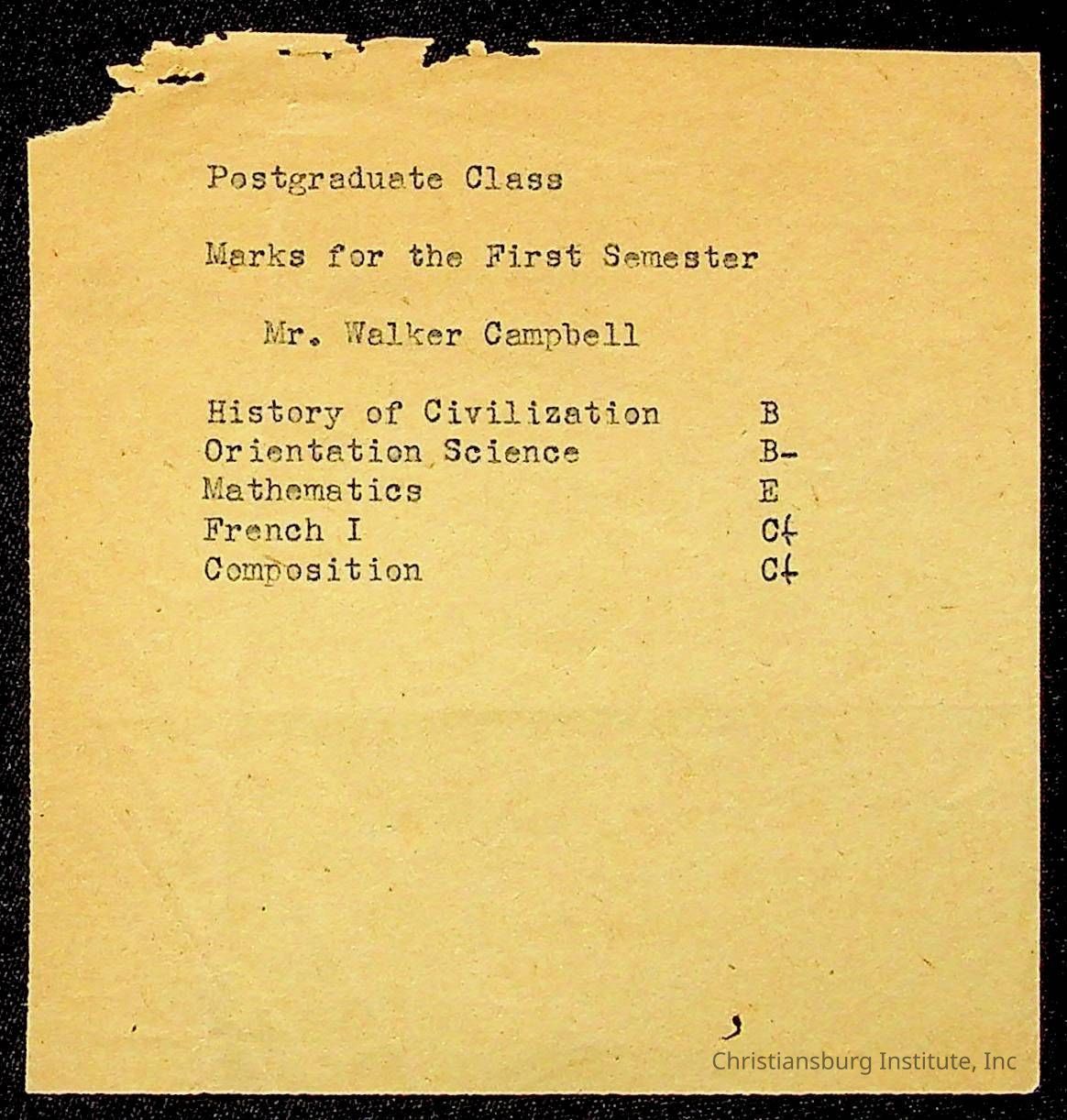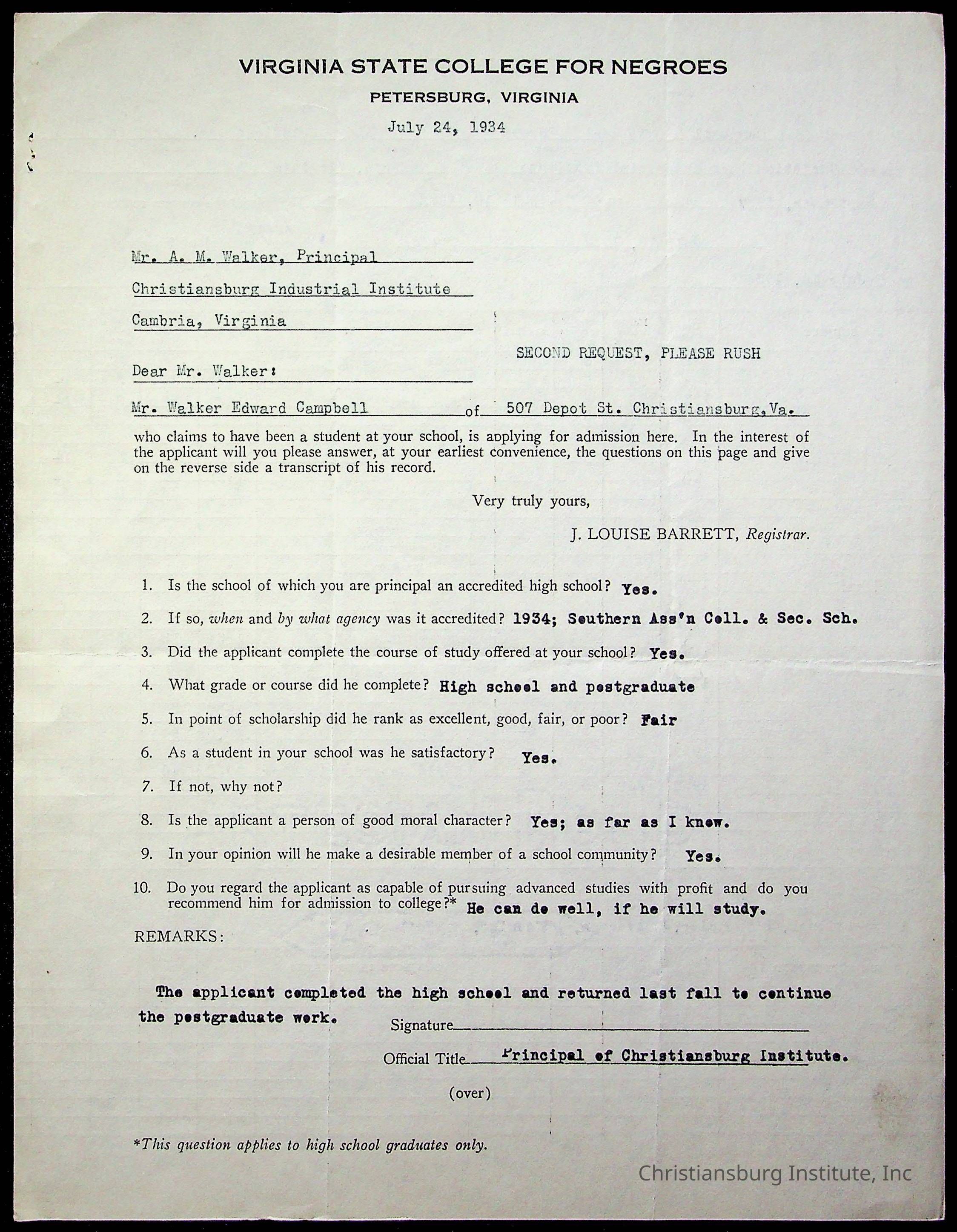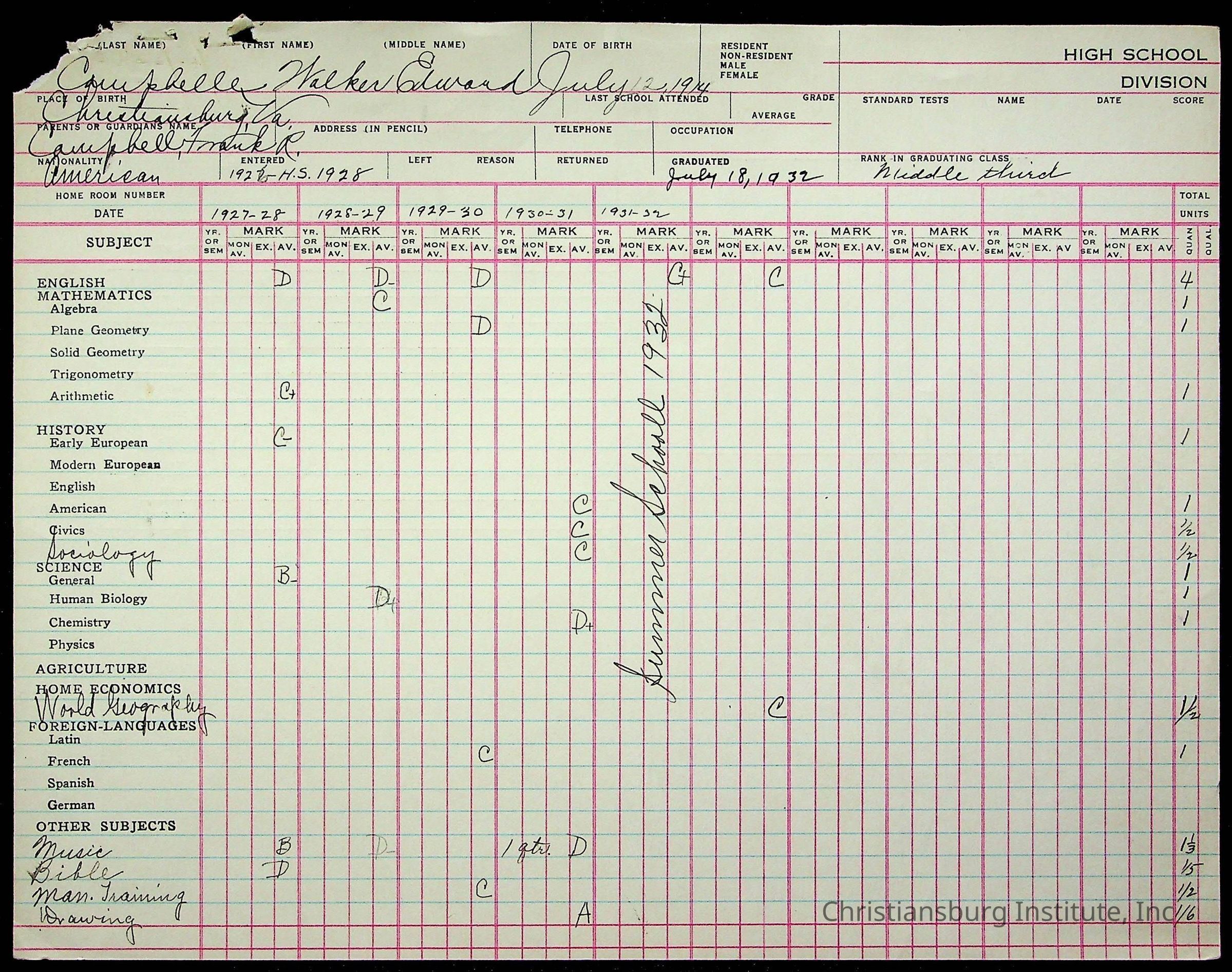 The student file for the Christiansburg Institute student, Walker Edward Campbell circa 1920s.