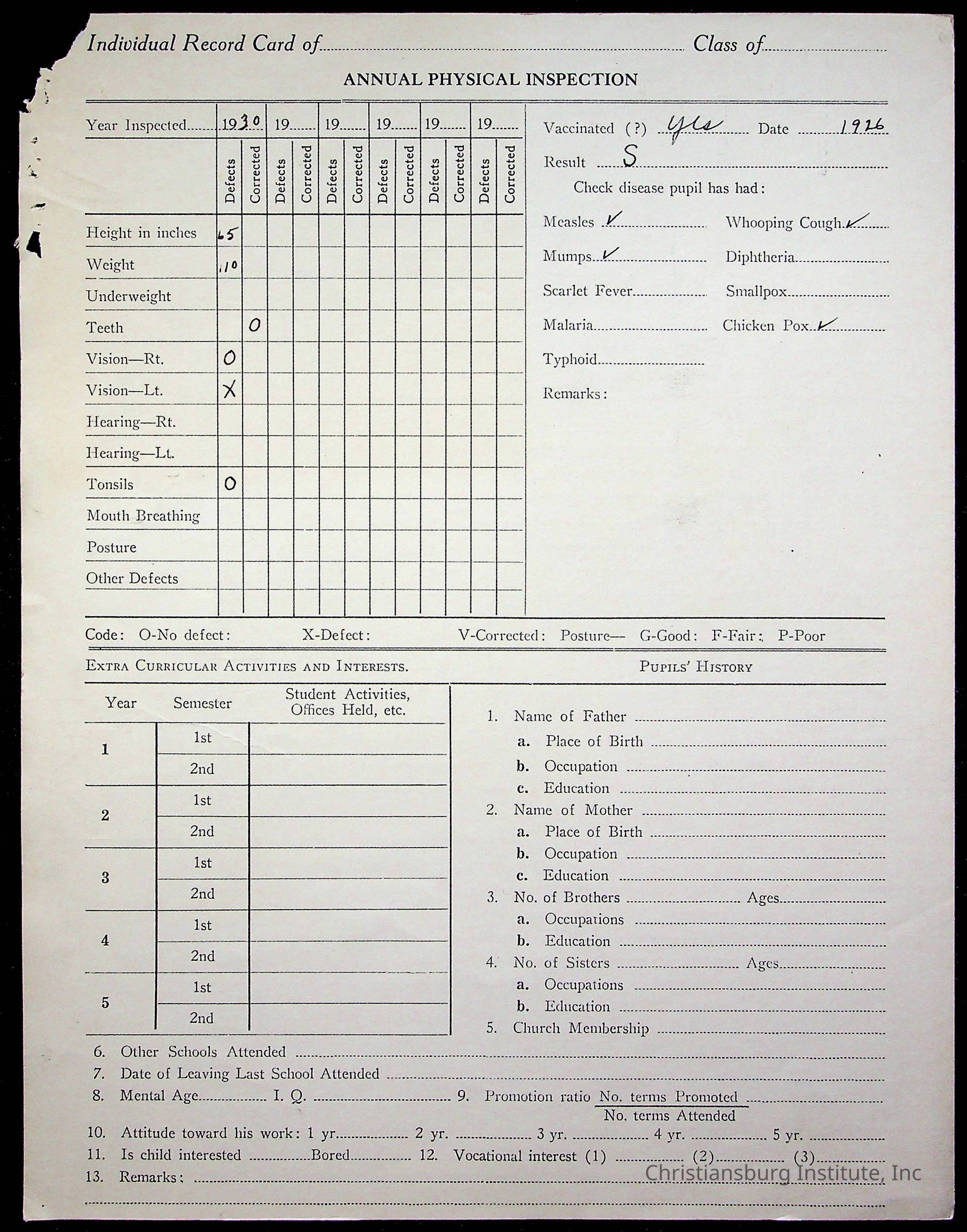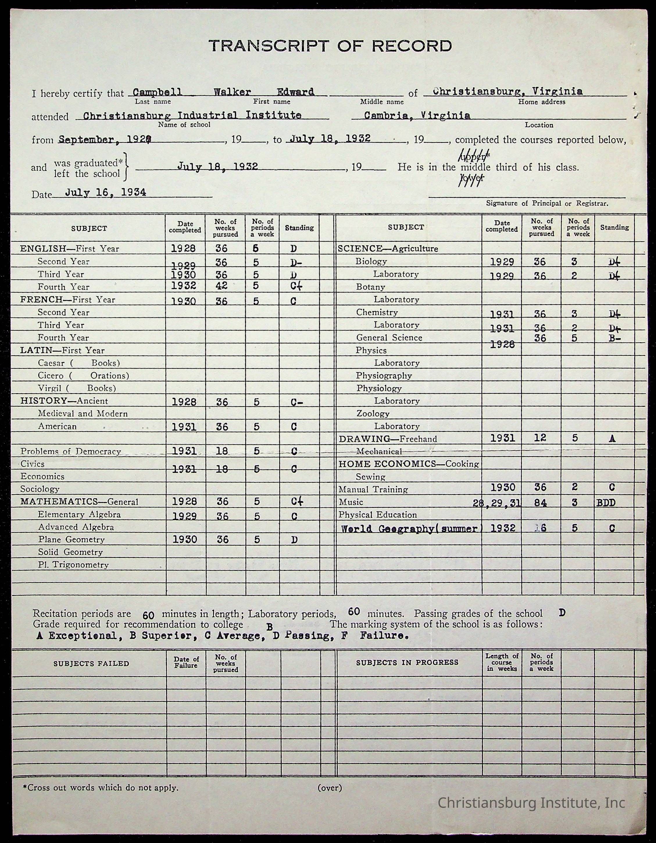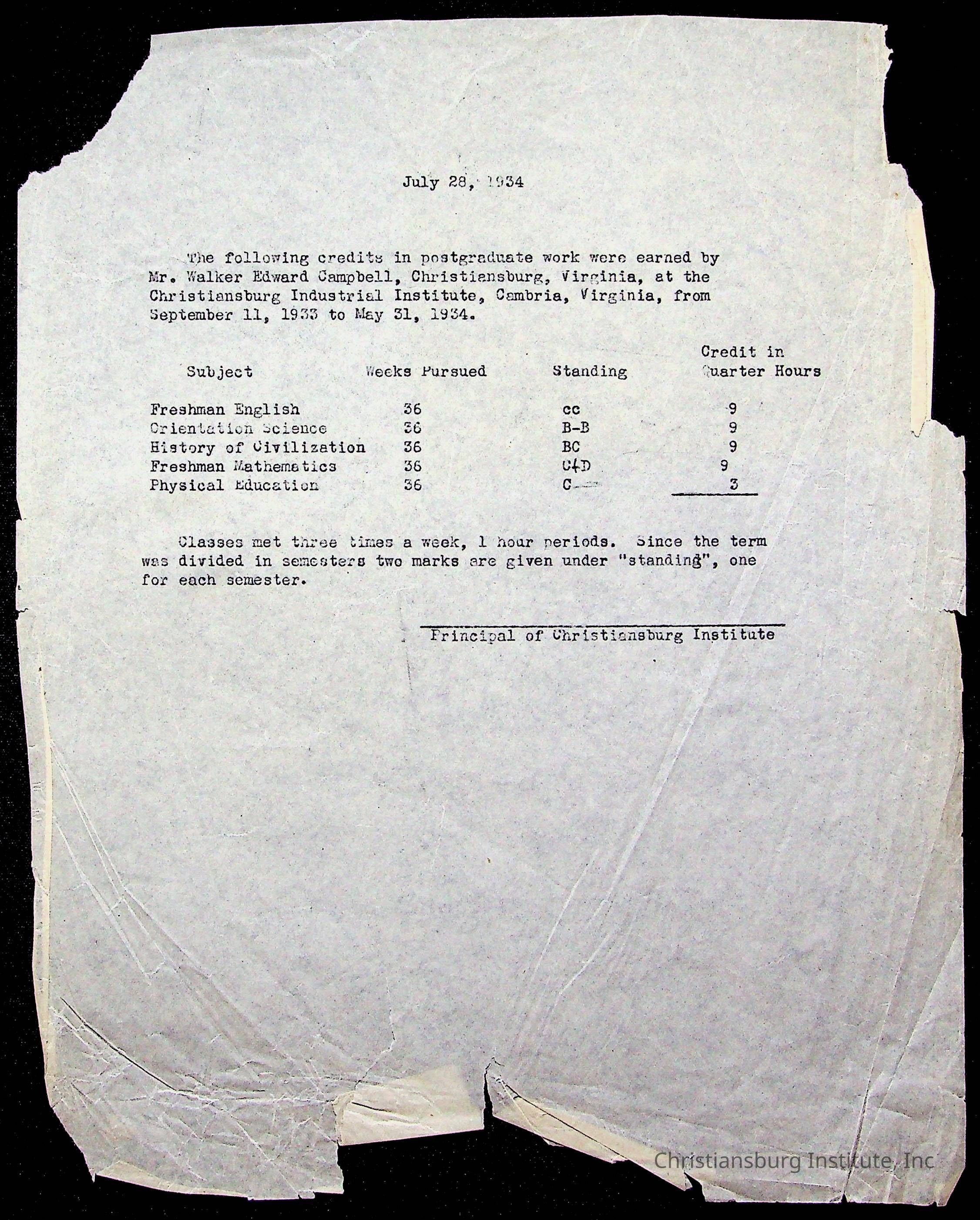 The student file for the Christiansburg Institute student, Walker Edward Campbell circa 1920s.
