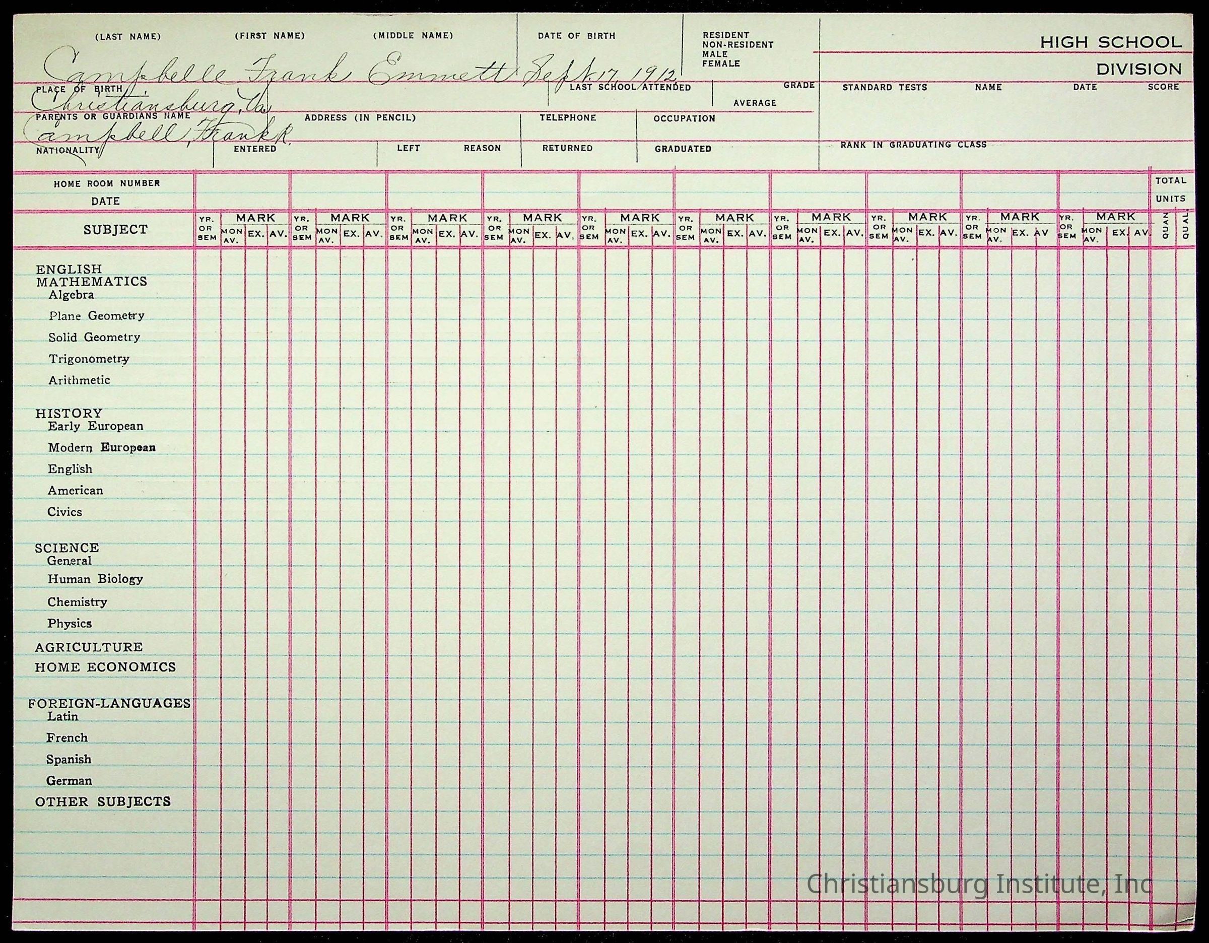 The student file for the Christiansburg Institute student, Frank Emmett Campbelle circa 1930s.