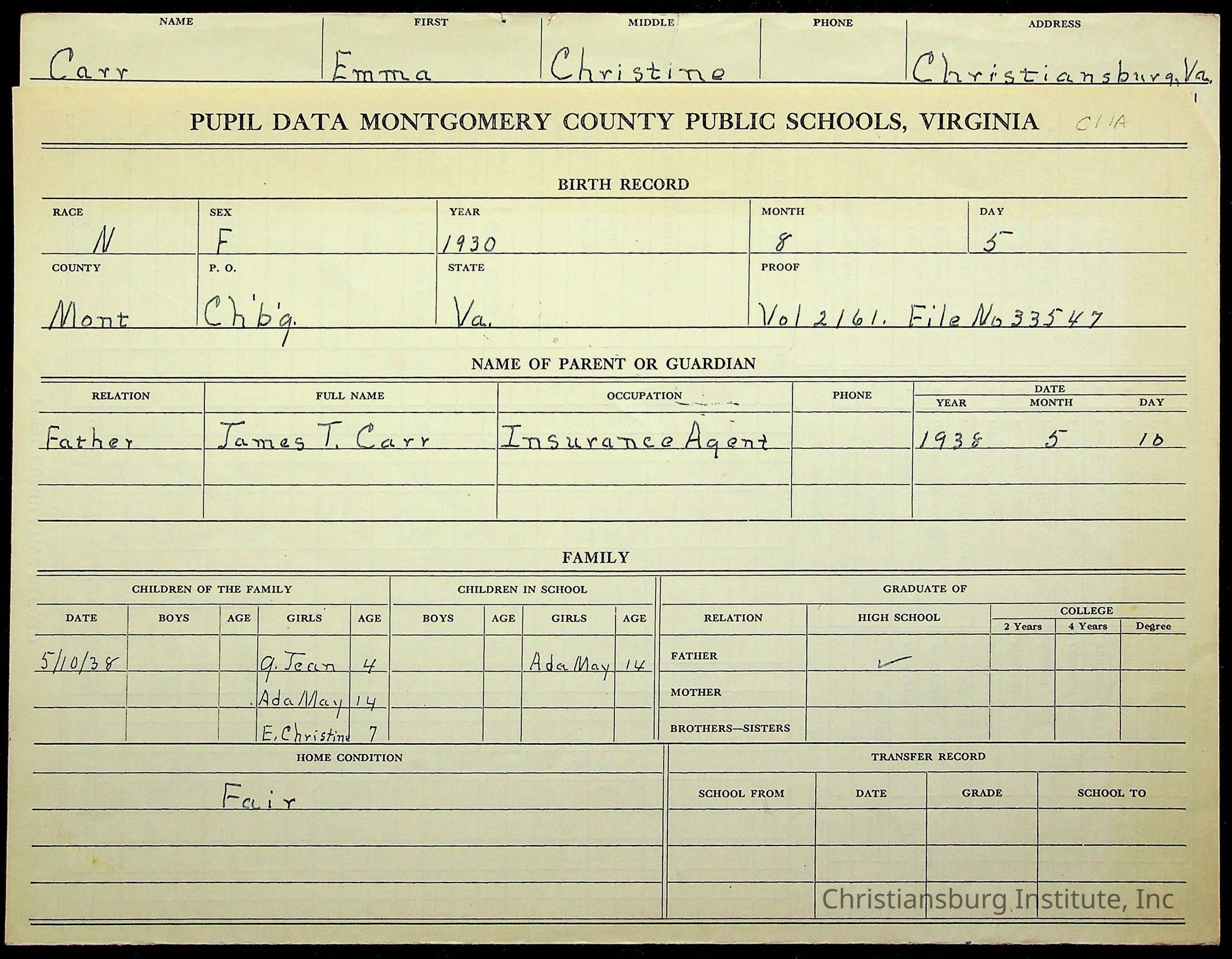 Christiansburg Institute, Montgomery County Public Schools, Carr, Emma Christine