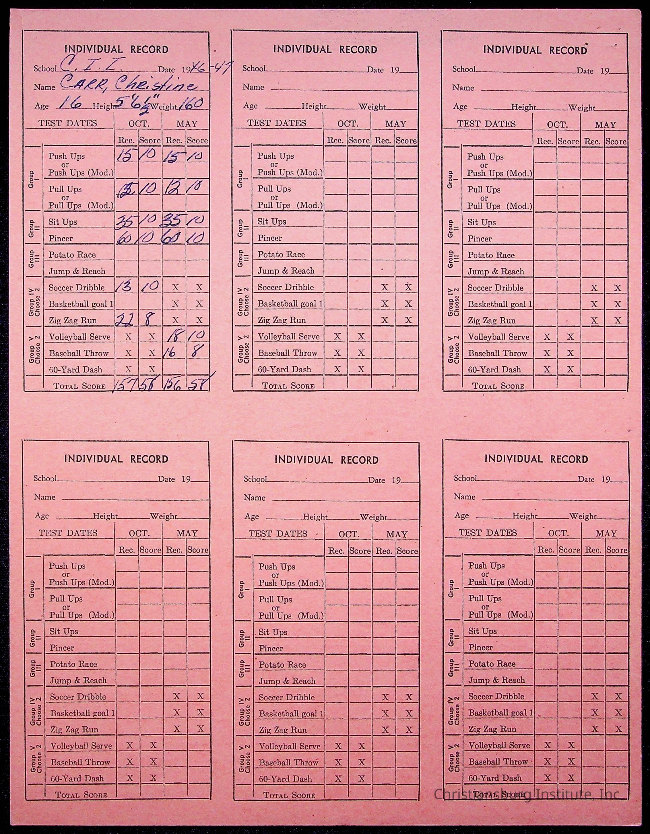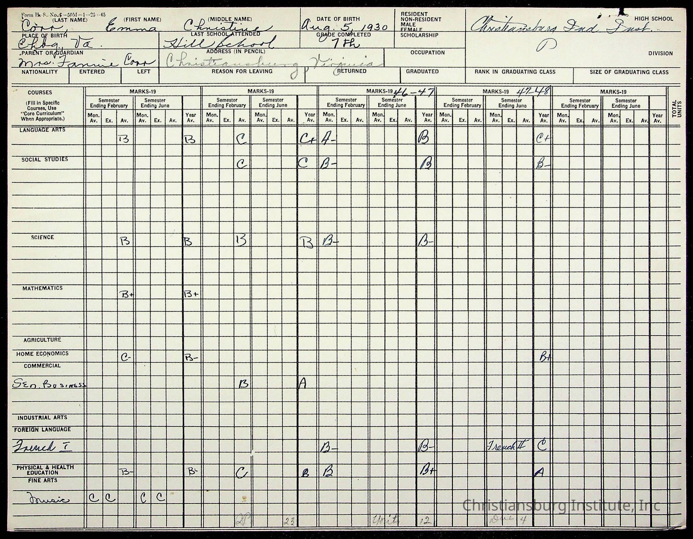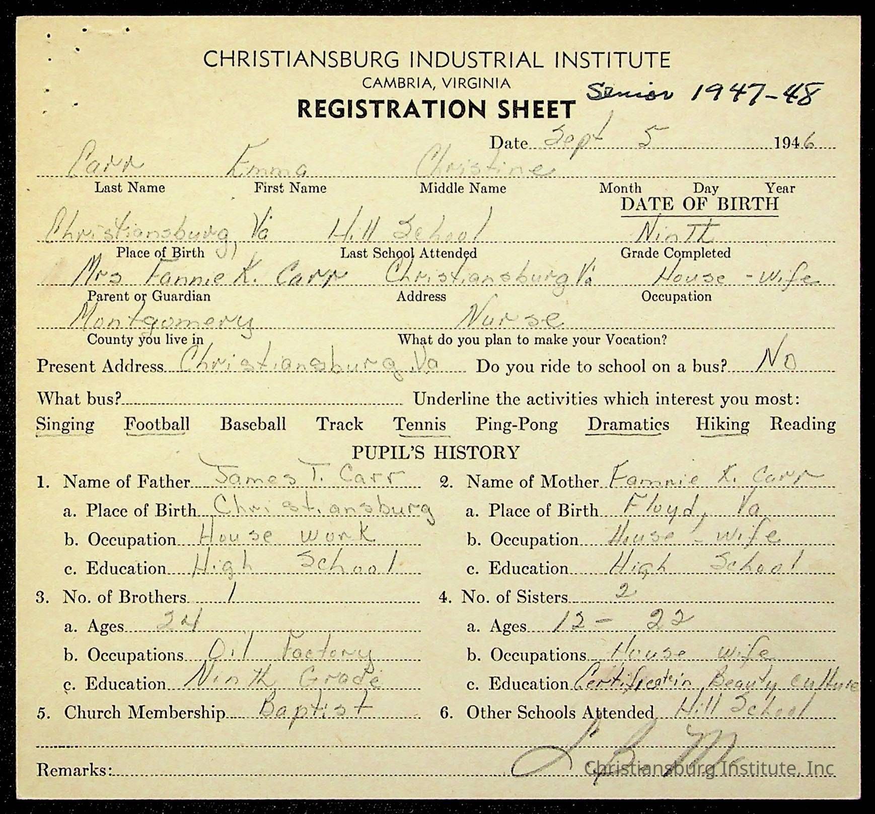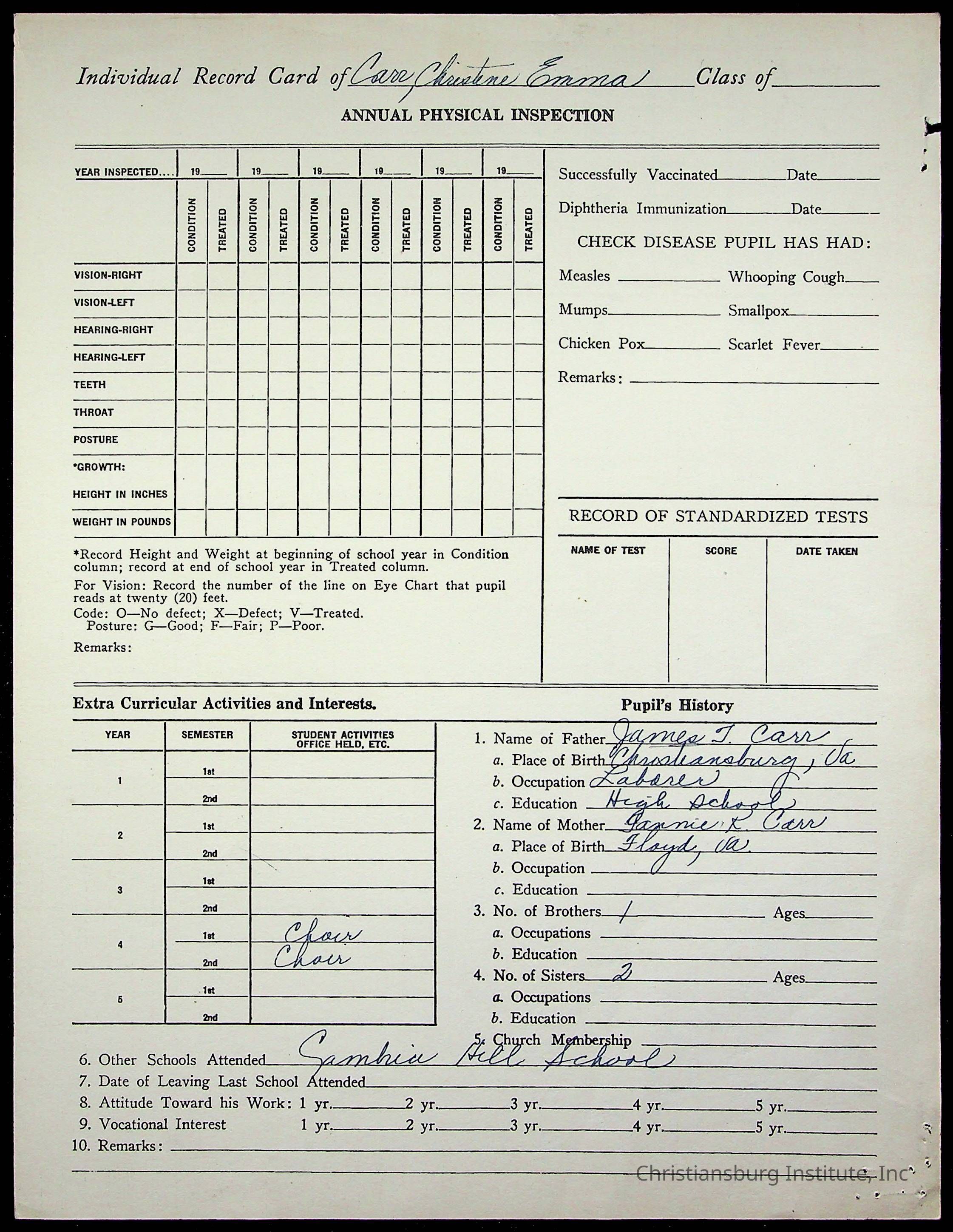 The student file for the Christiansburg Institute student, Emma Christine Carr circa 1930s-1940s.
