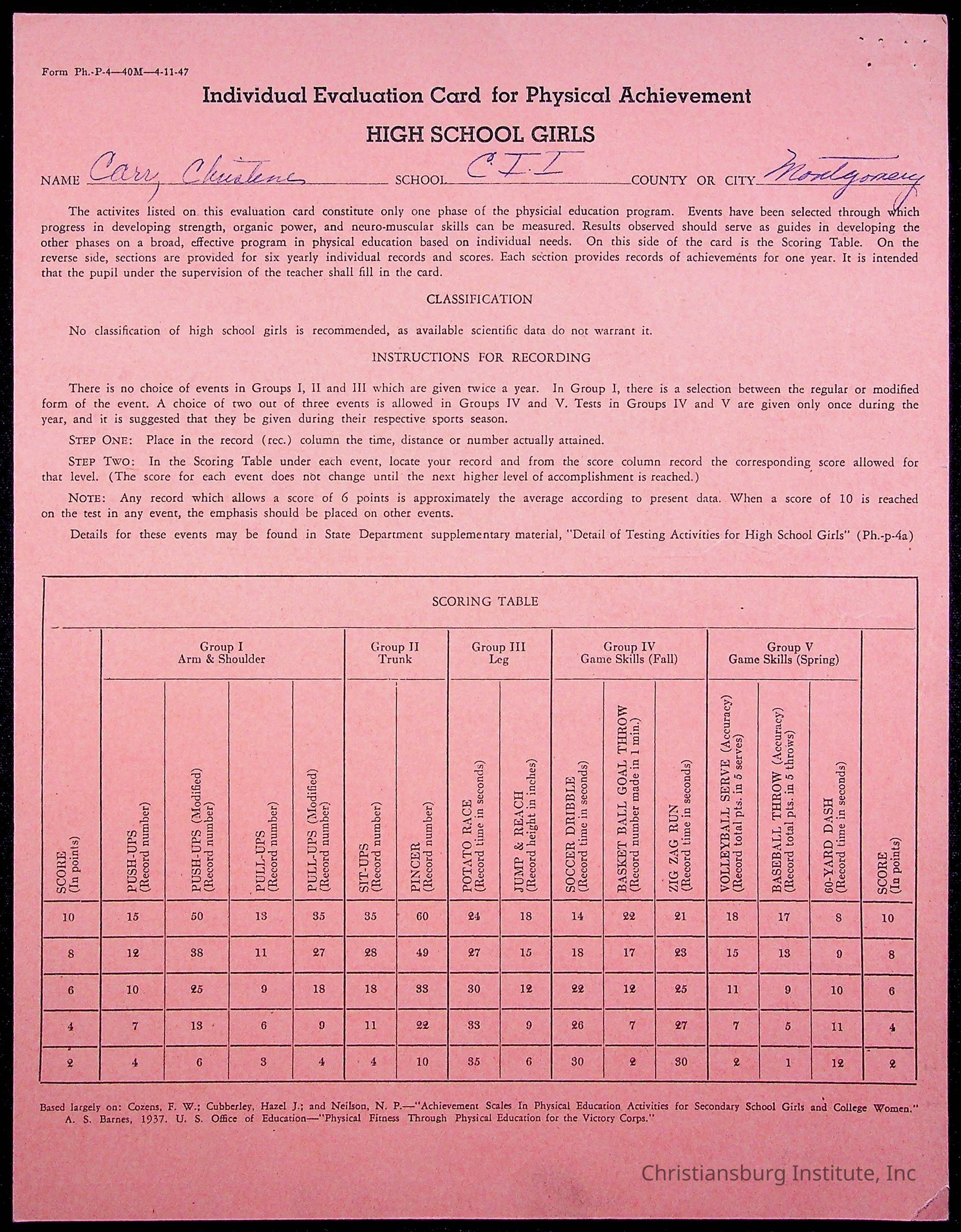 Copyright has been assigned to Christiansburg Institute Museum & Archives by Montgomery County Public Schools. For permission to publish materials created by the donor, contact CIMA@christiansburginstitute.com. Materials not created by Christiansburg Industrial Institute may still be under copyright.