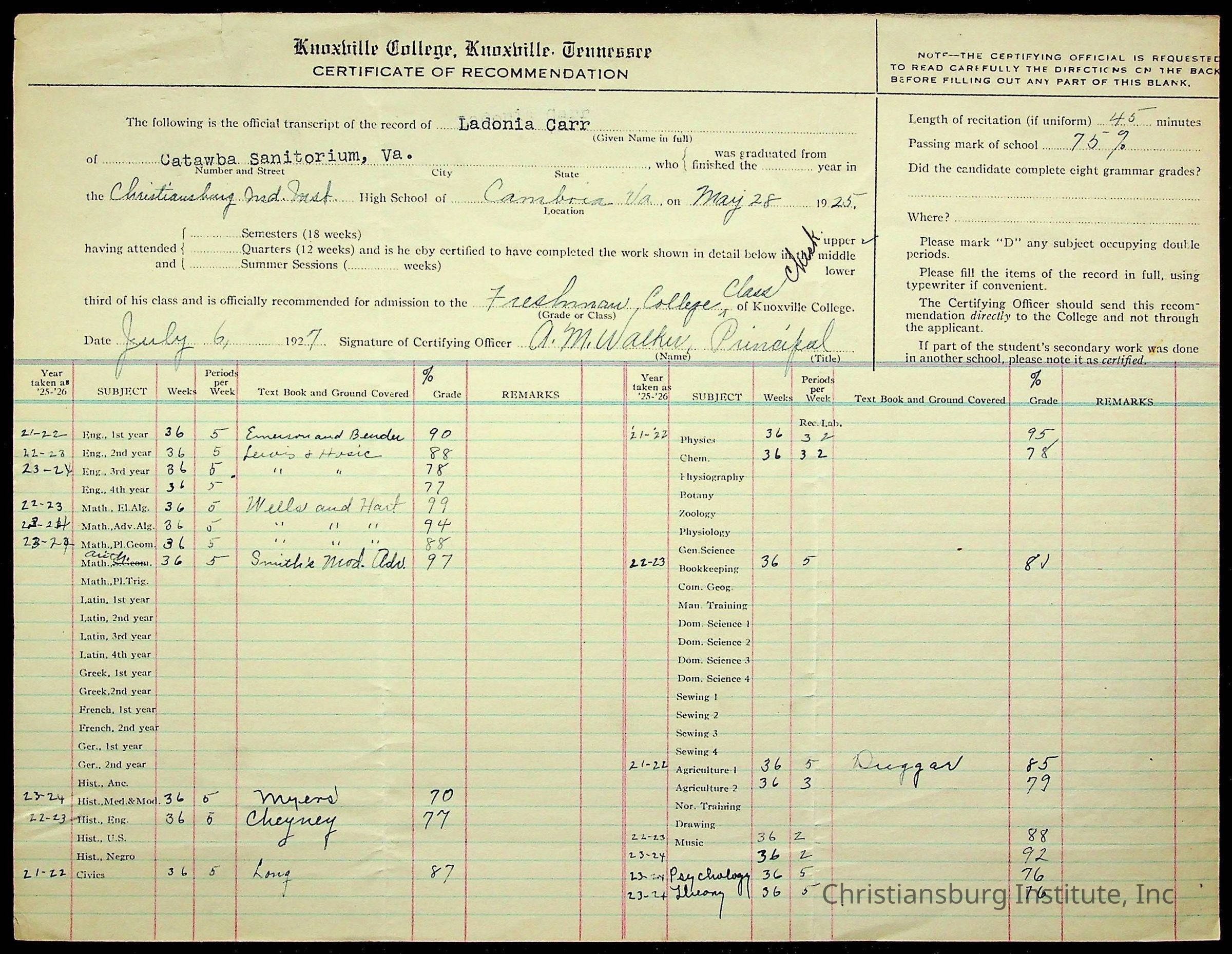 Christiansburg Institute, Montgomery County Public Schools, Carr, Ladonia