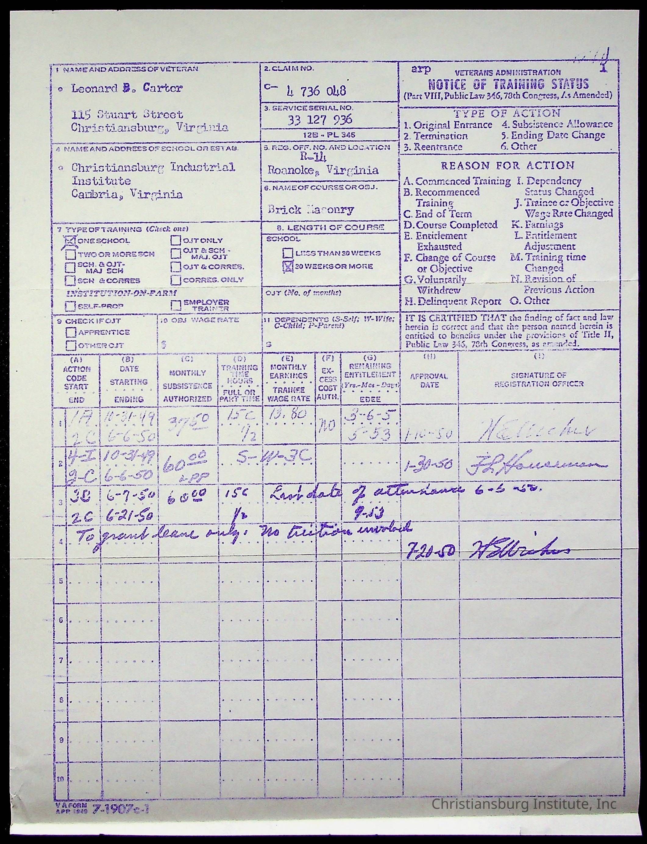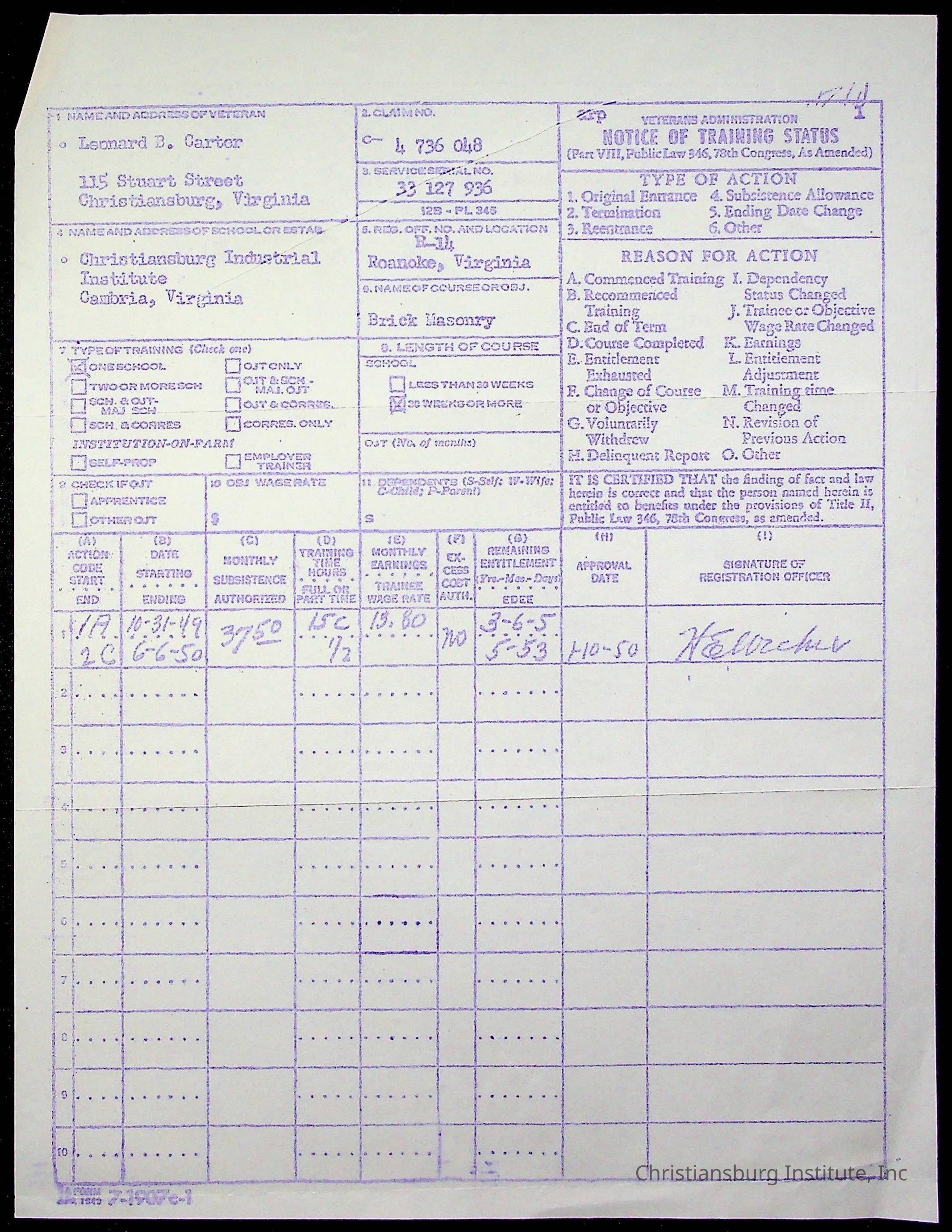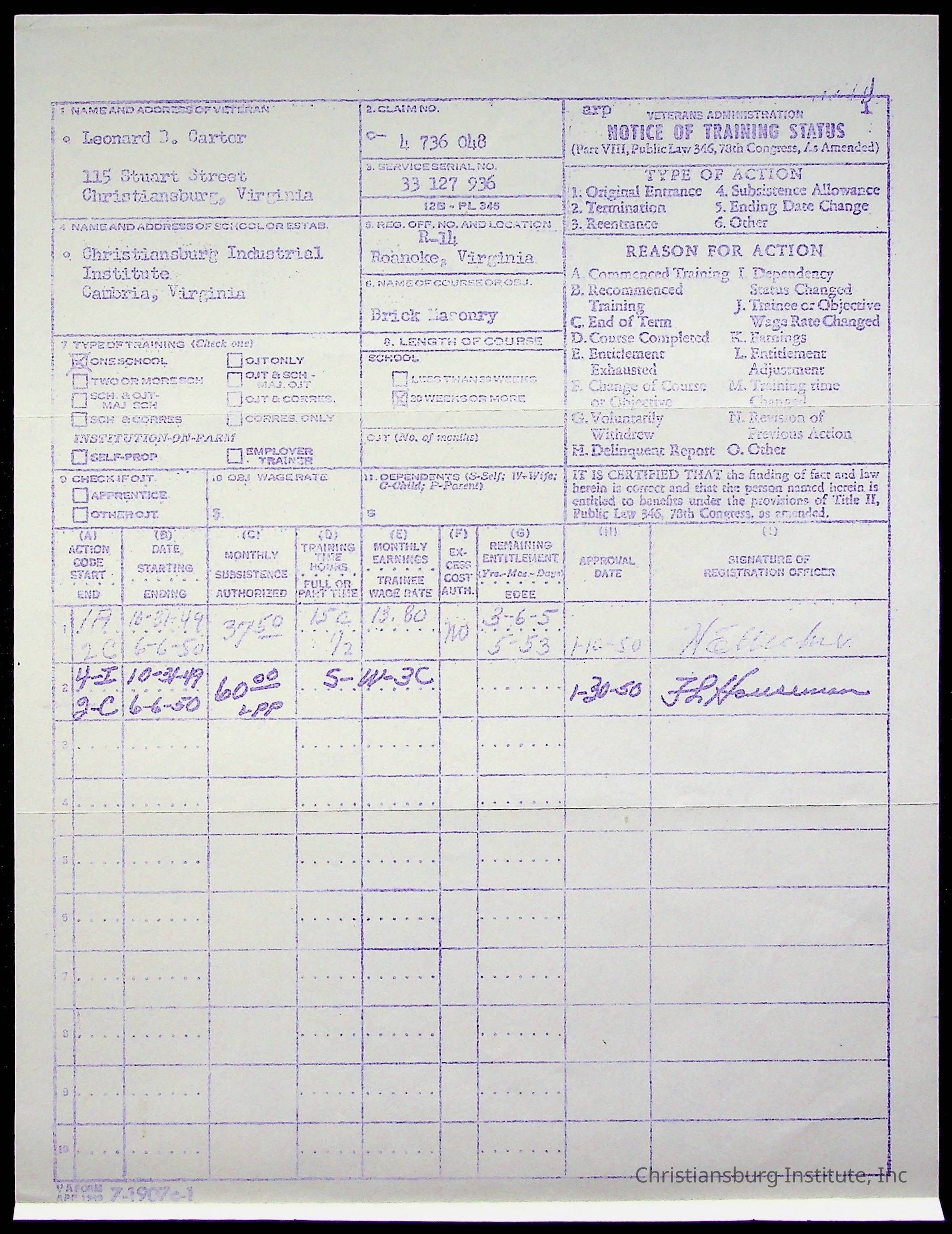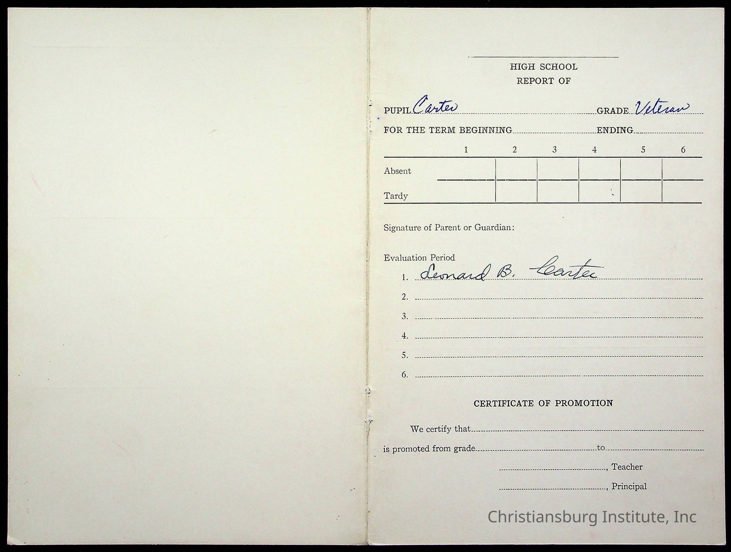 The student file for the Christiansburg Institute student, Leonard Carter circa 1930s-1940s.