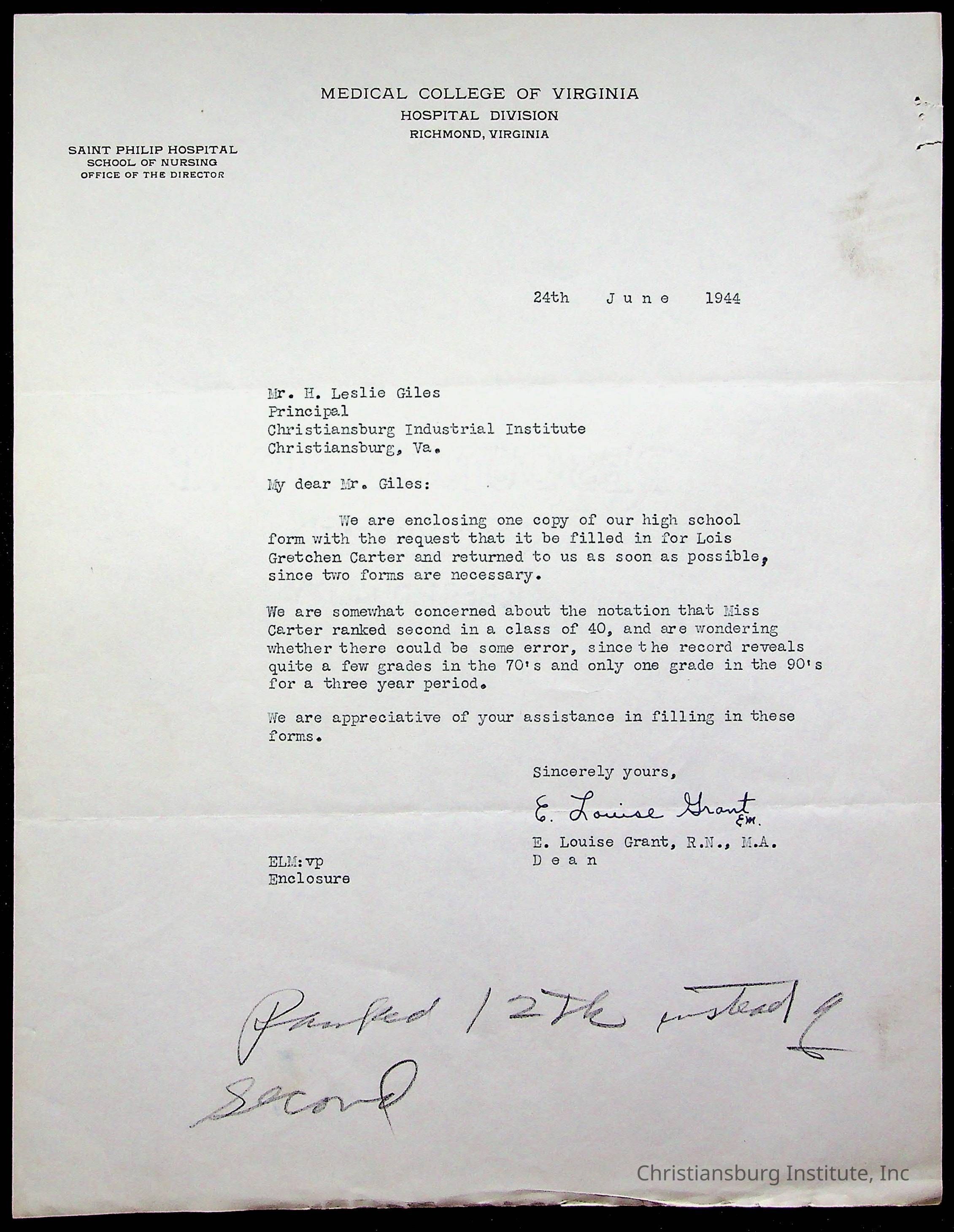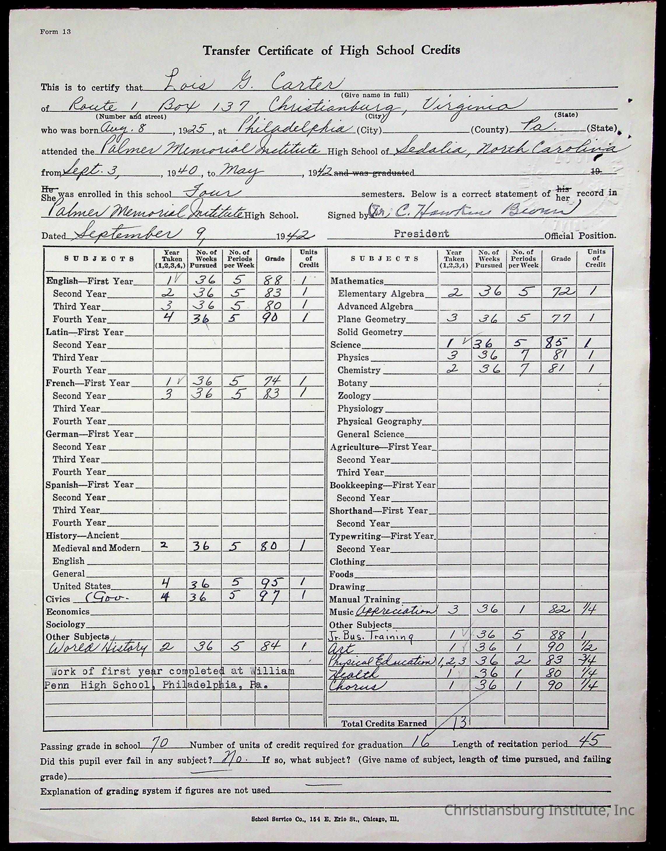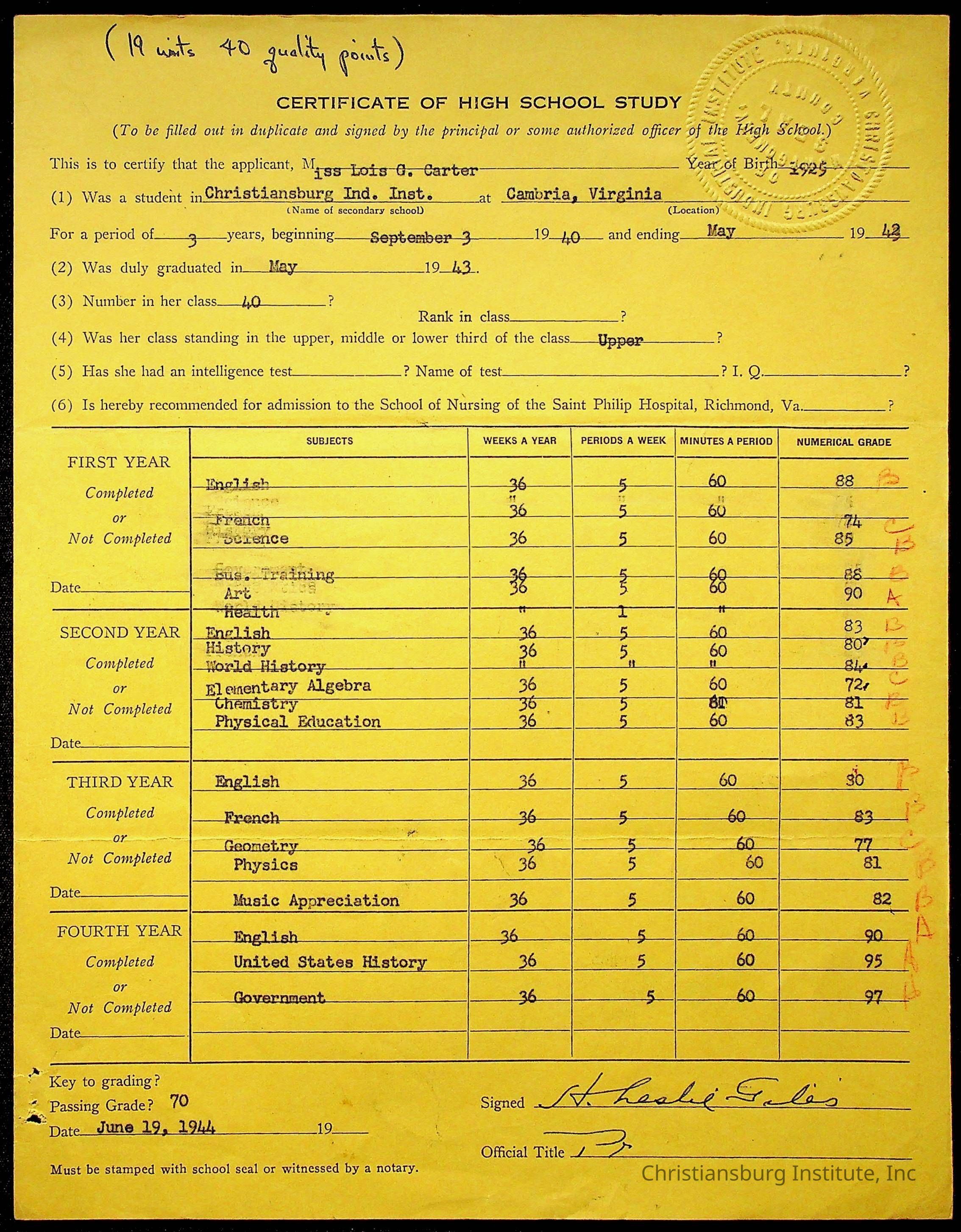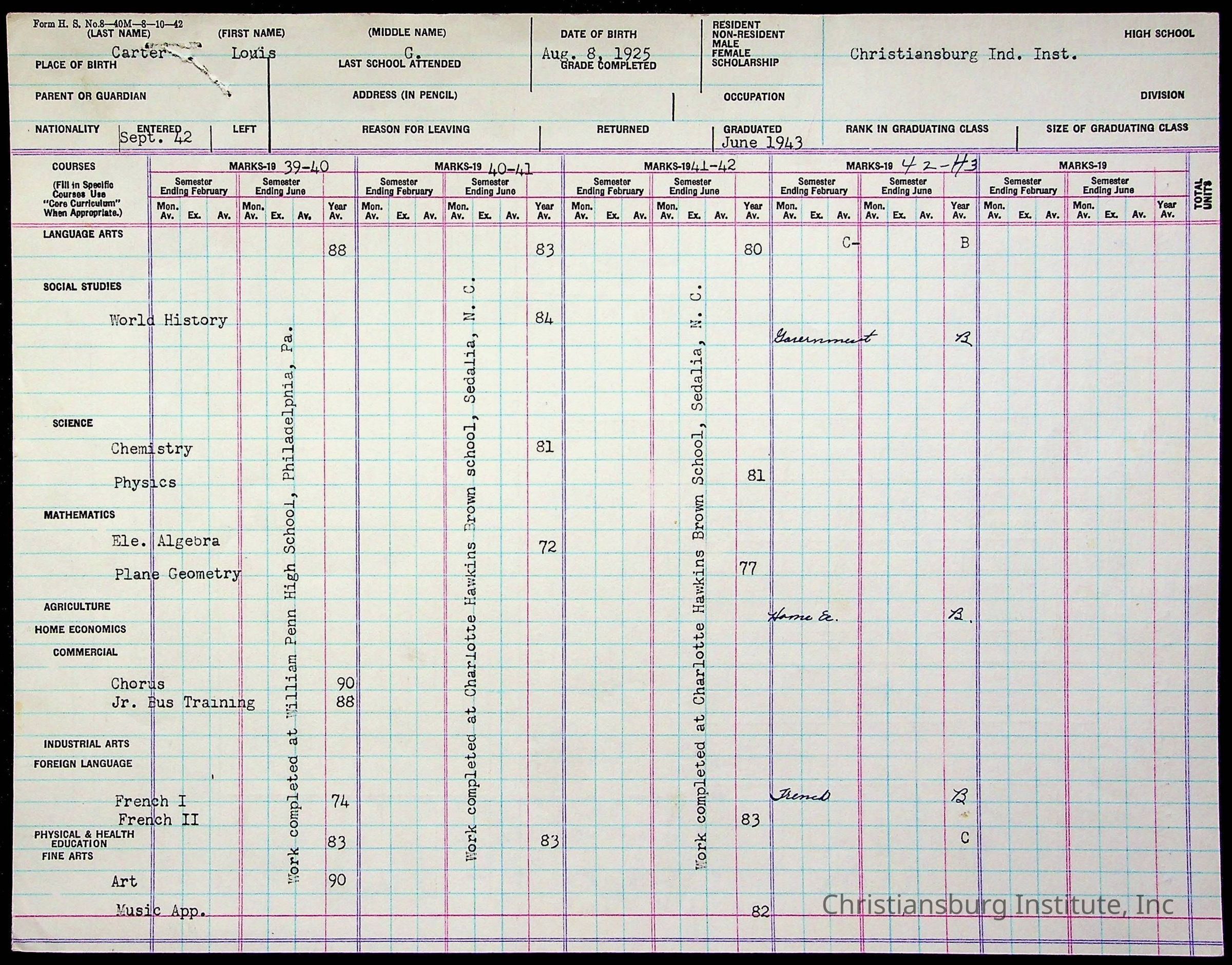 The student file for the Christiansburg Institute student, Louis G. Carter circa 1940s.