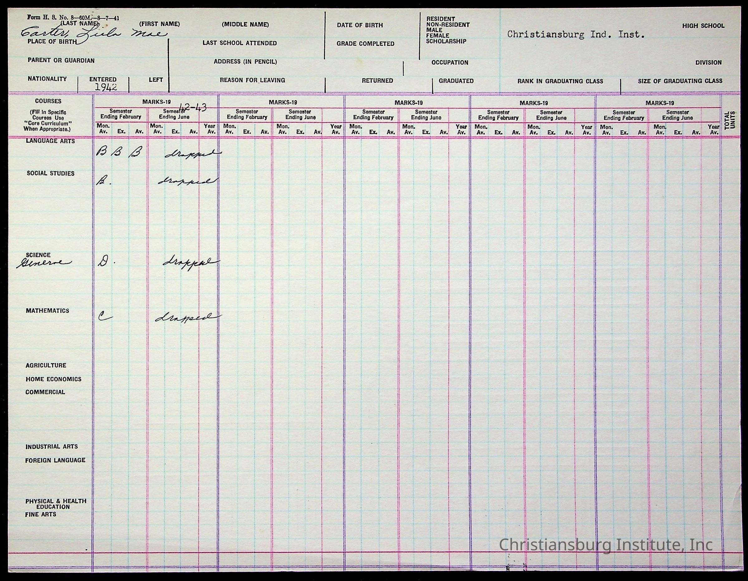 The student file for the Christiansburg Institute student, Lula Mae Carter circa 1940s.