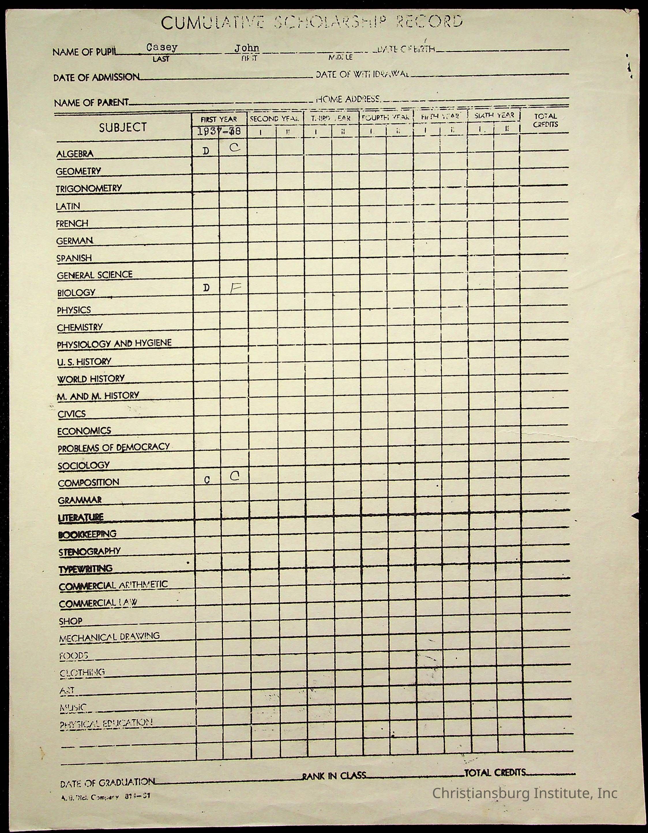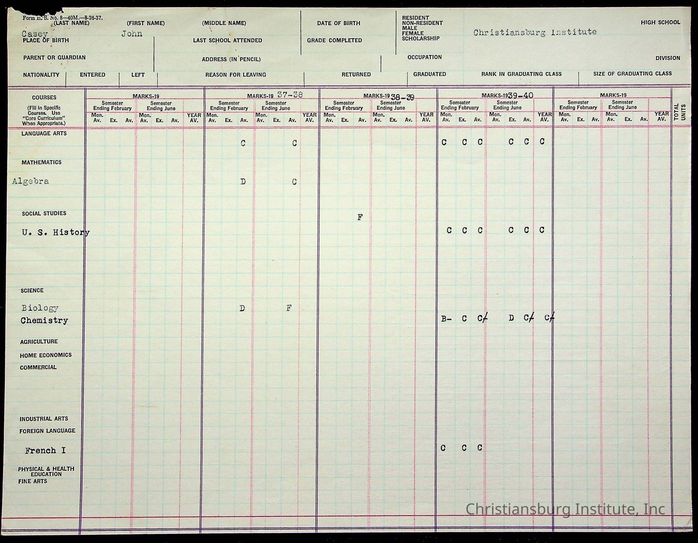 The student file for the Christiansburg Institute student, John Casey circa 1930s.