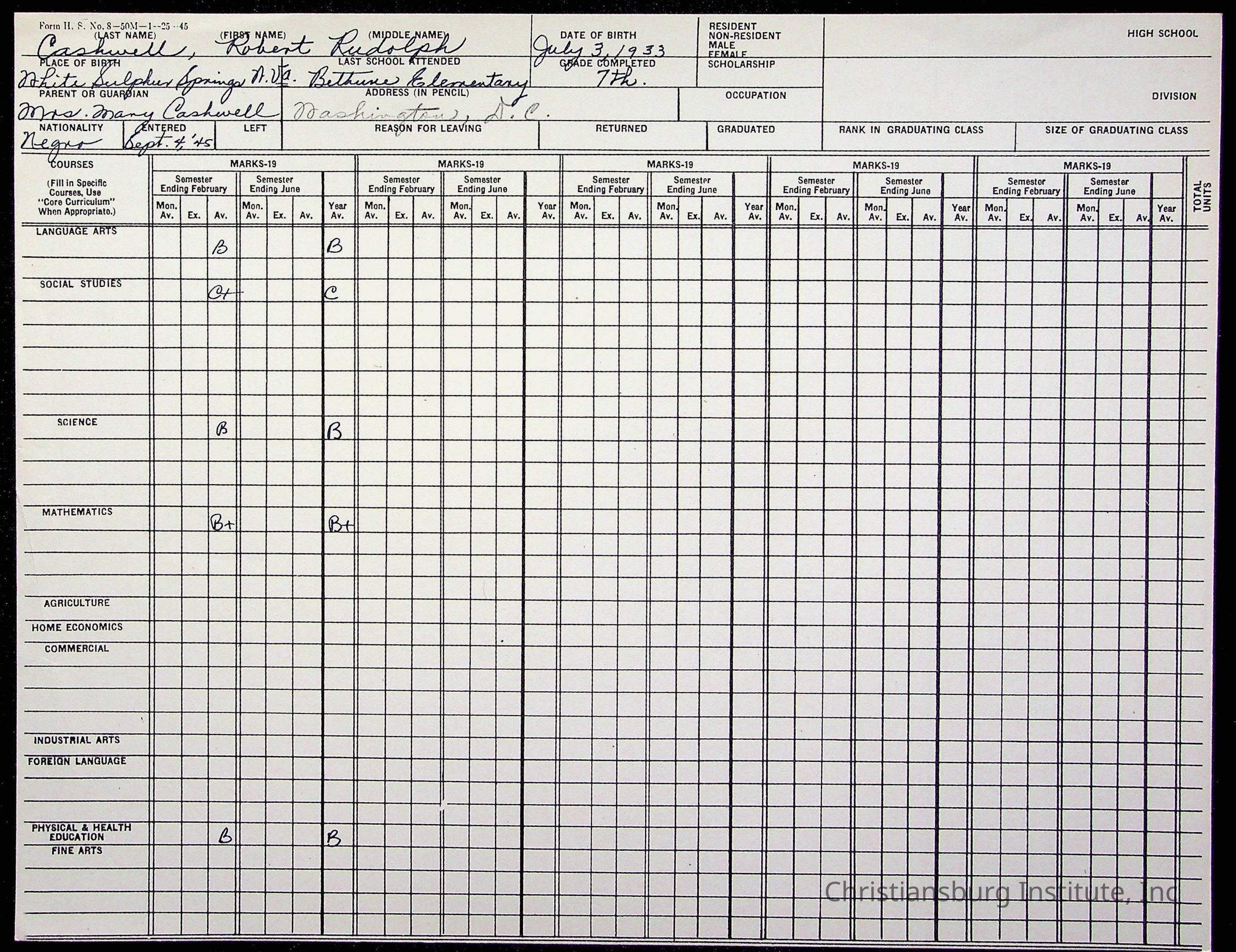 The student file for the Christiansburg Institute student, Robert Rudolph Cashwell circa 1940s.