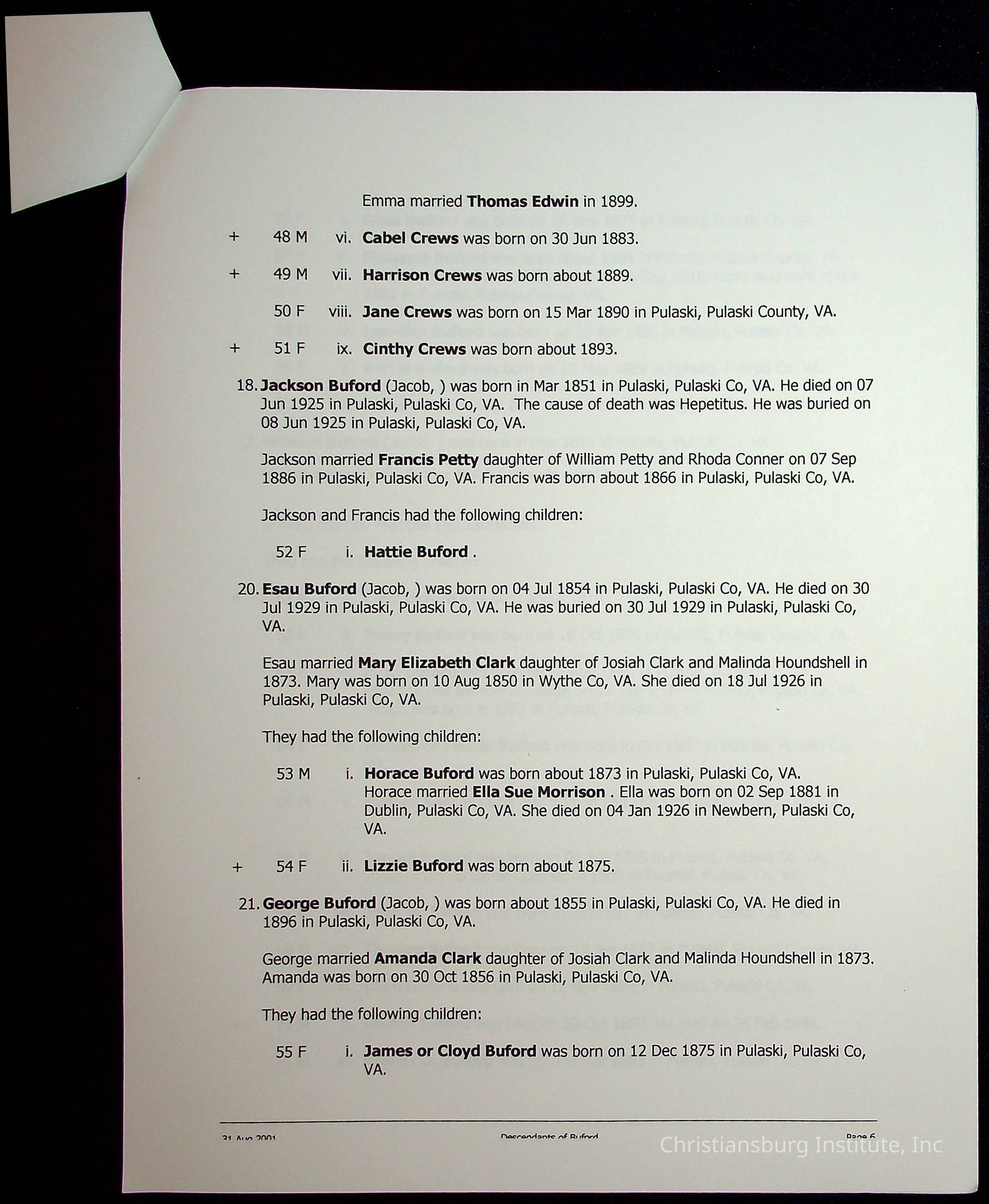 A folder of research materials collected by Radford University professor, Dr Linda Killen. This folder is titled 'A & B' and includes Killen's research on the A and B families names of Pulaski County, Virginia. This folder includes genealogy record, marriage licenses, and census records.