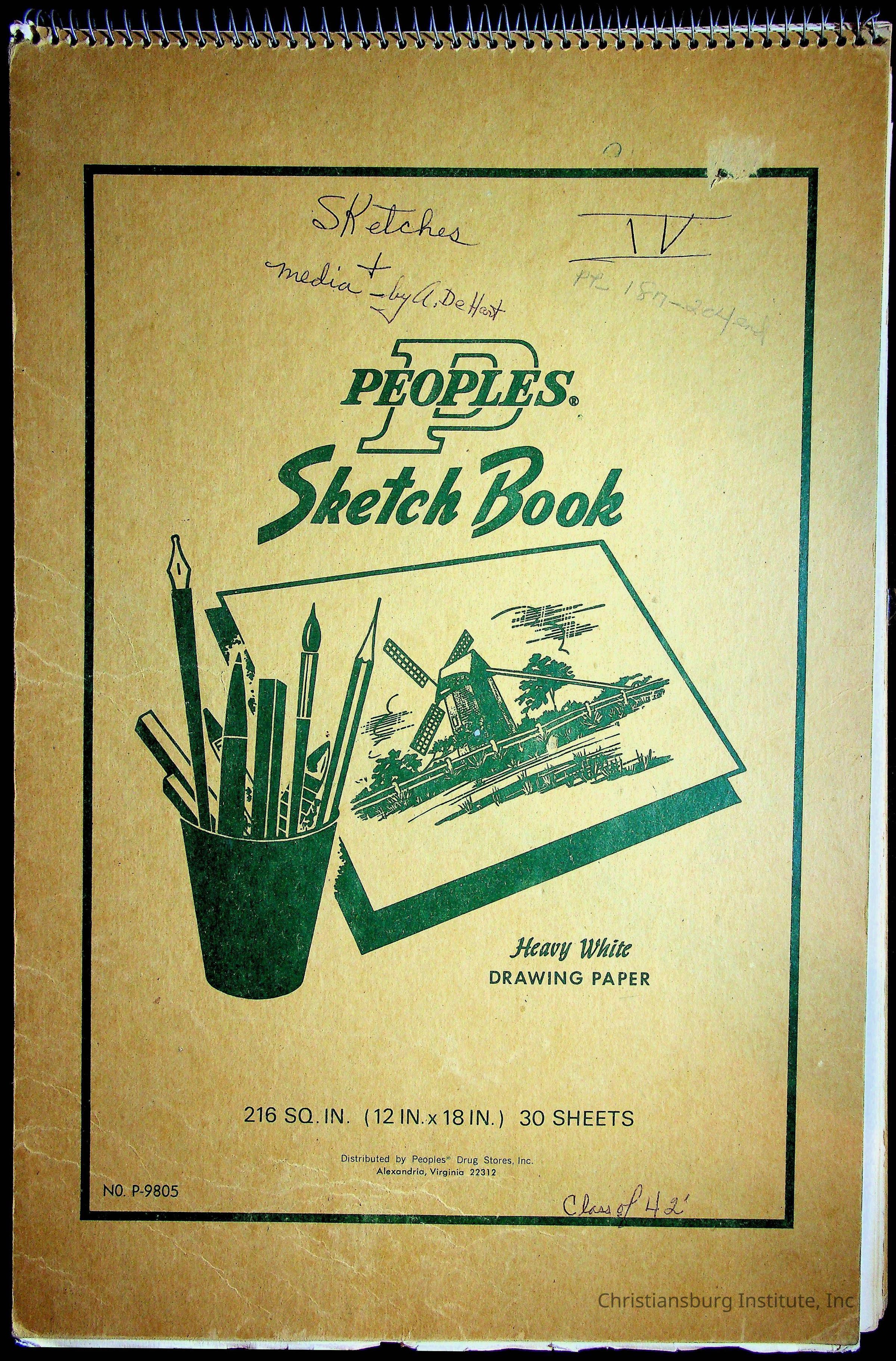 A sketchbook filled with mixed media of different people, including sketches and photographs drawn and compiled by Amanda DeHart, undated.Collection