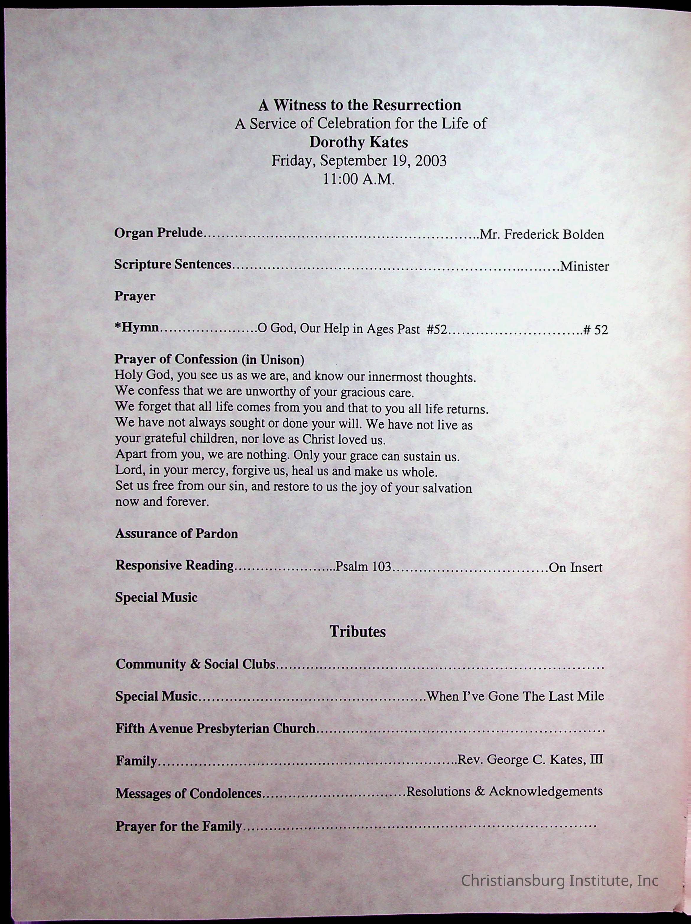 Copyright has been assigned to Christiansburg Institute Museum & Archives by Fifth Avenue Presbyterian Church. For permission to publish materials created by the donor, contact CIMA@christiansburginstitute.com. Materials not created by Fifth Avenue Presbyterian Church may still be under copyright.