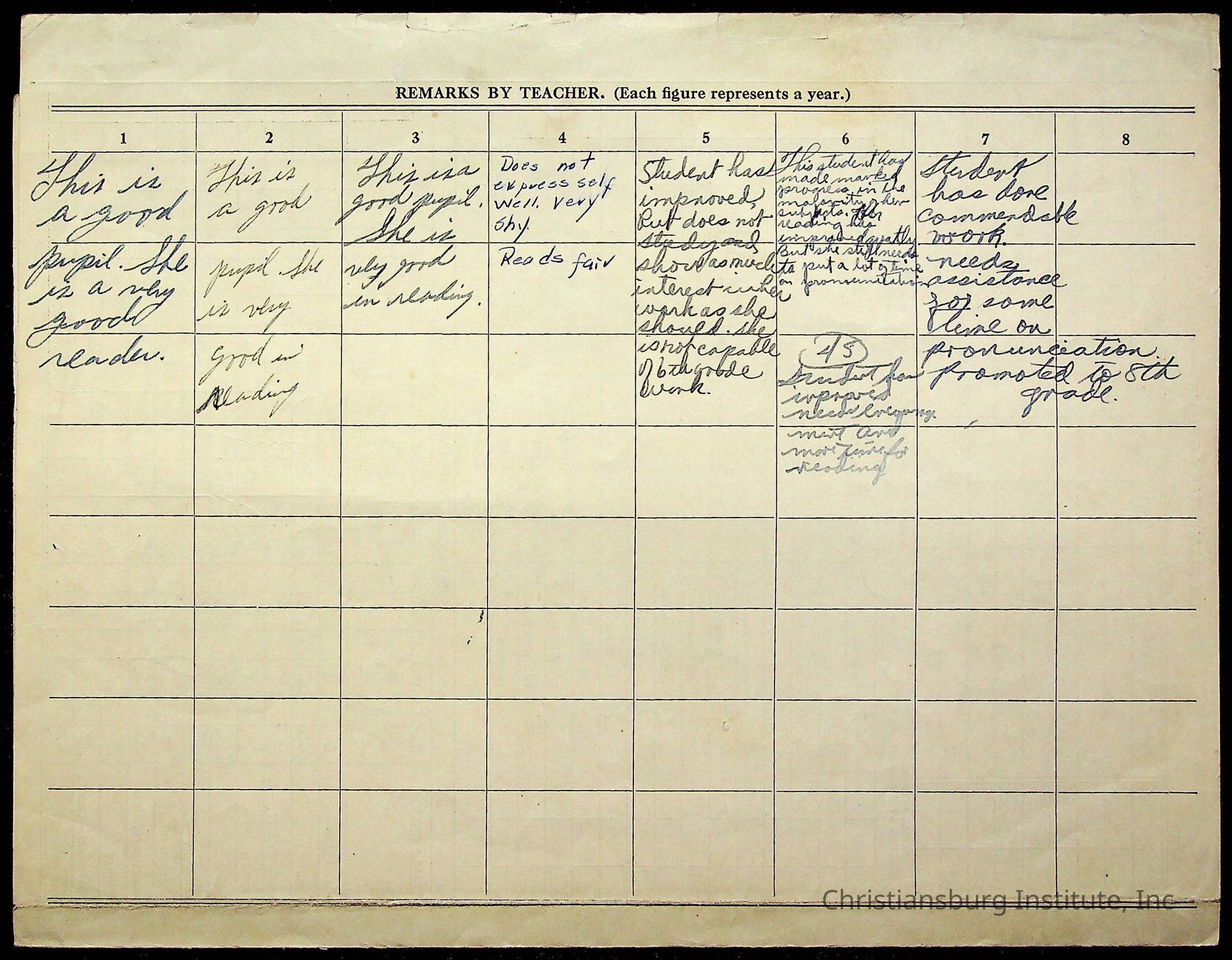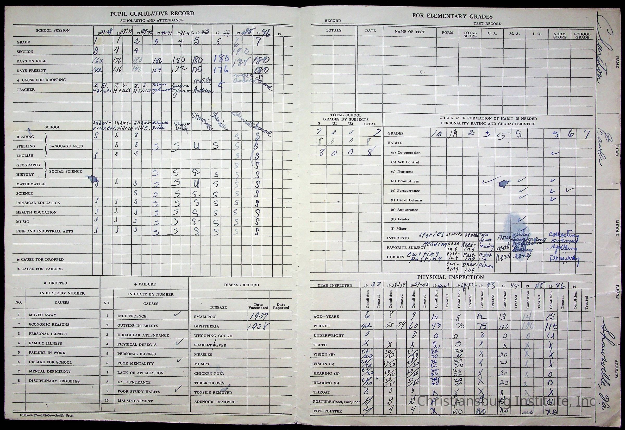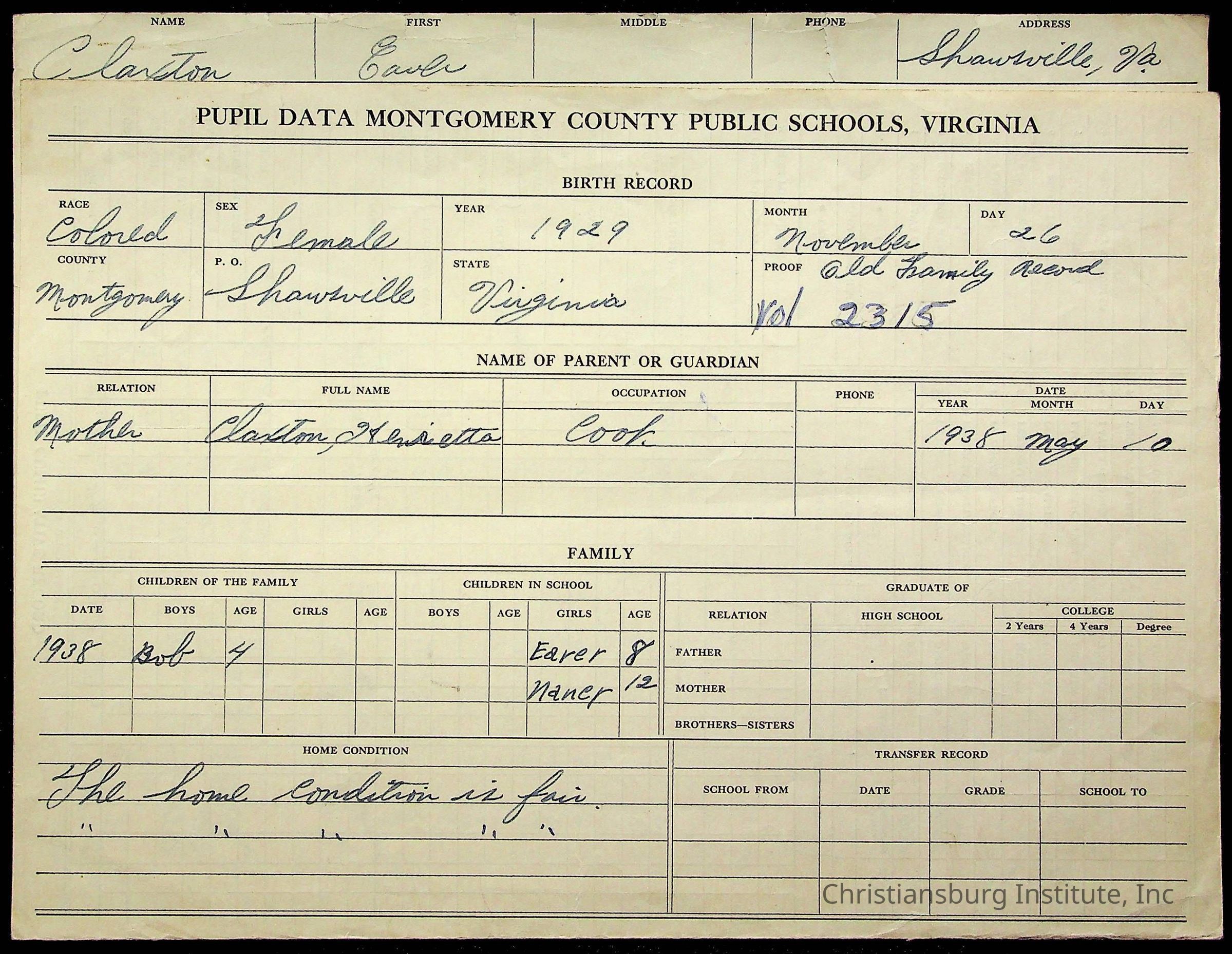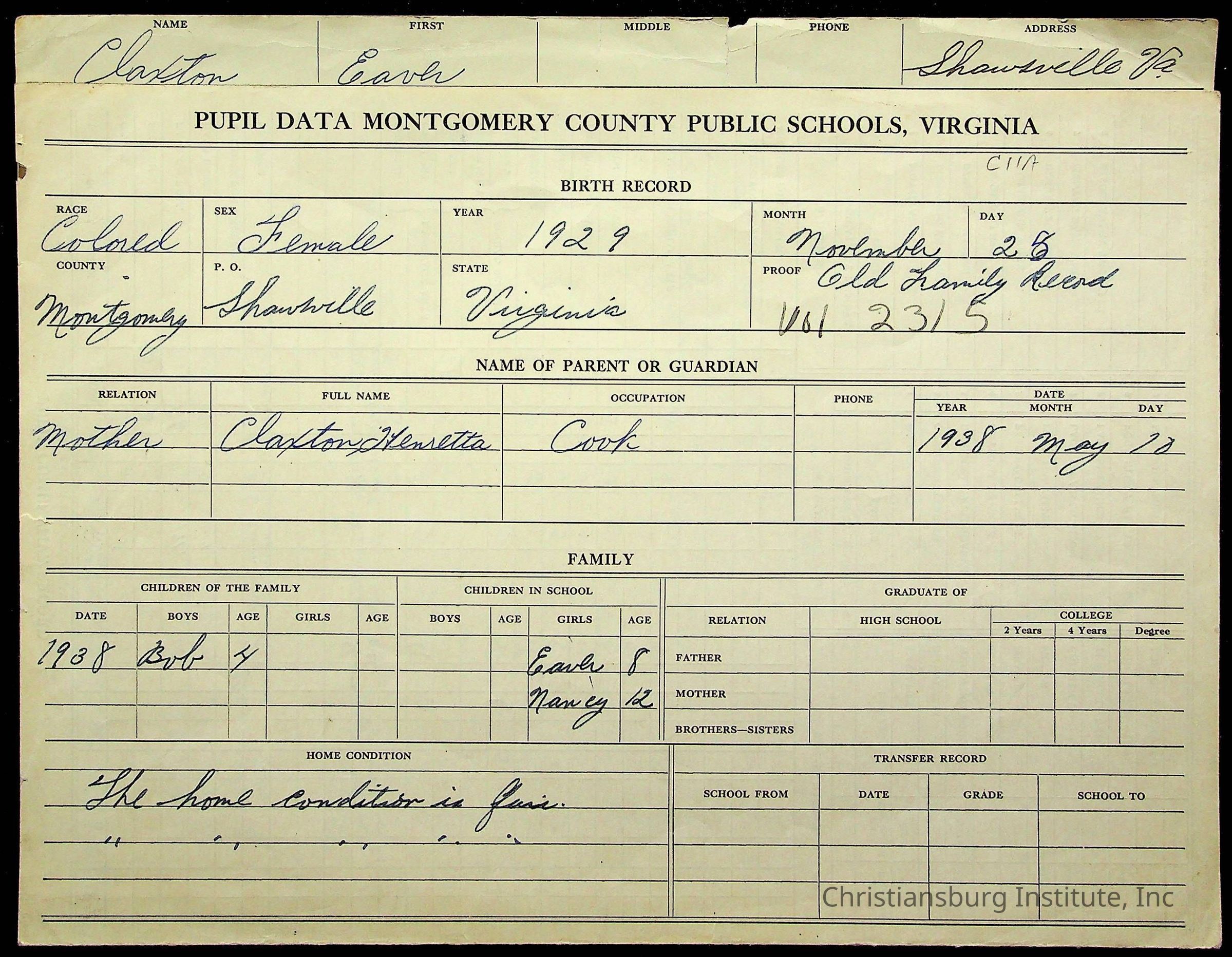 The student file for the Christiansburg Institute student, Evain Charlton circa 1930s-1940s.
