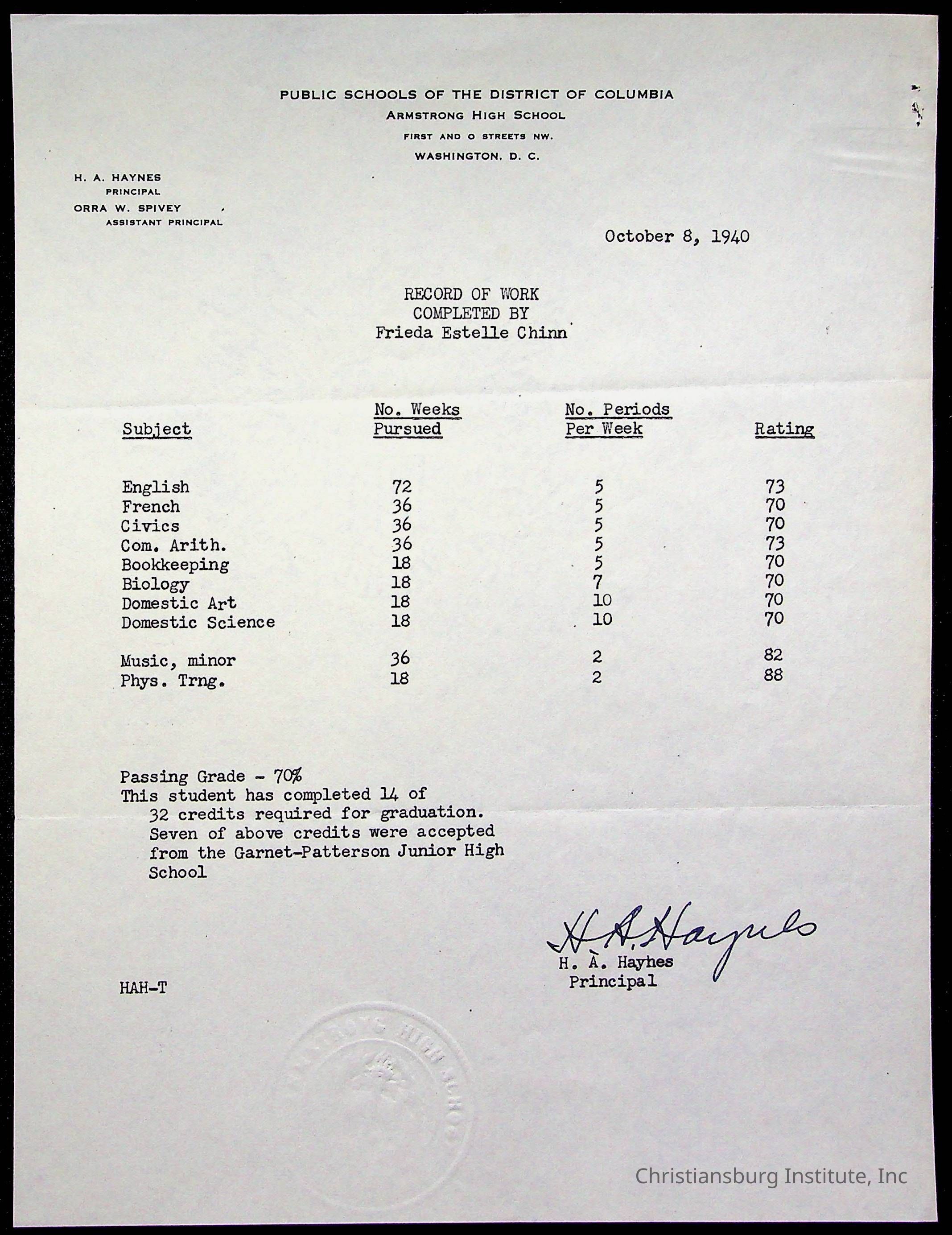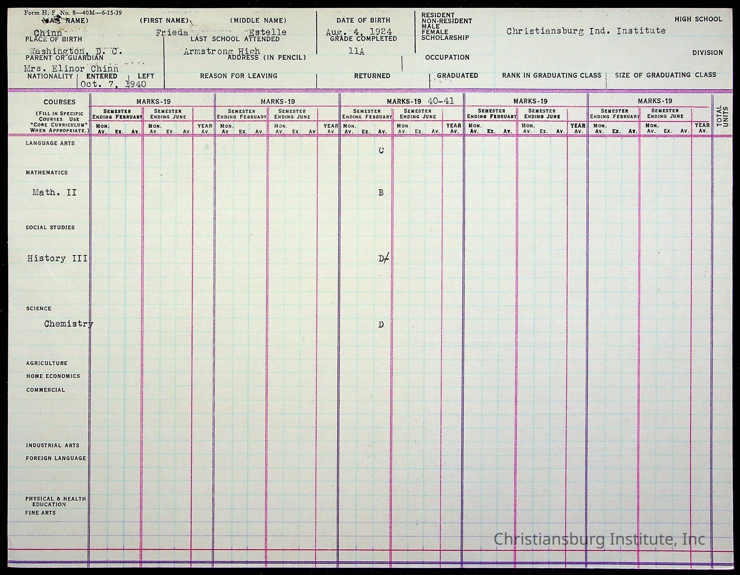 The student file for the Christiansburg Institute student, Frieda Estelle Chinn circa 1940s.
