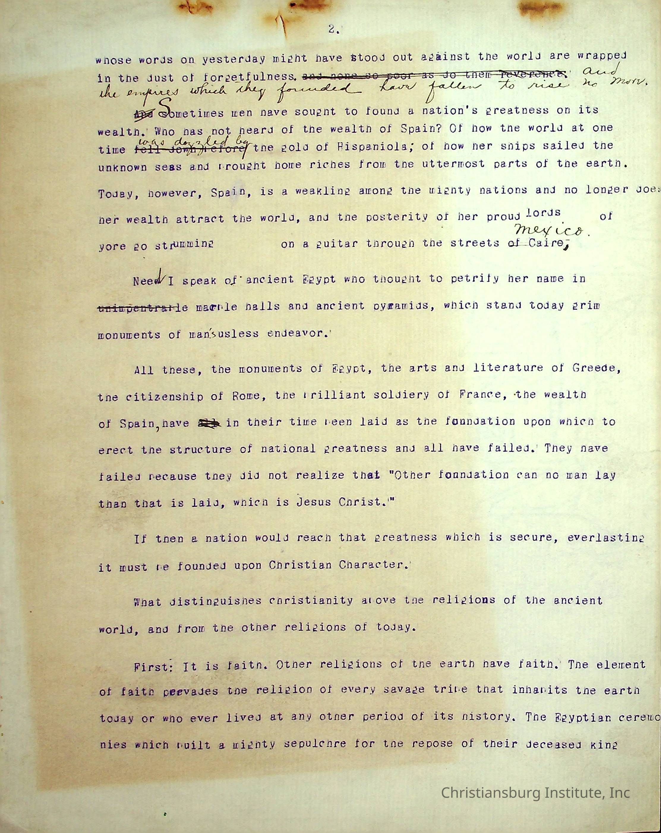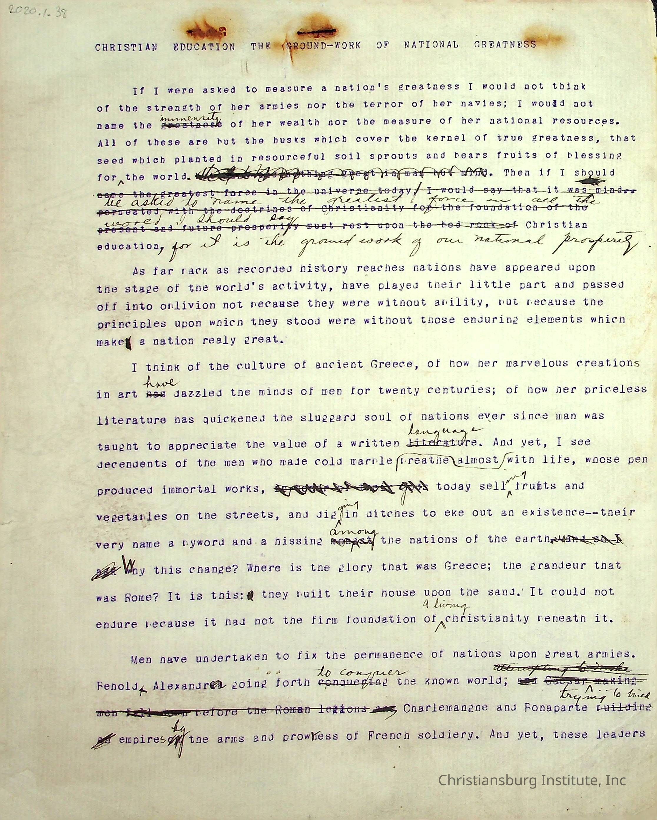 A typed document written by Edgar A. Long titled 'Christian Education' that is undated. Gifted by Carlton Banks in 2001.