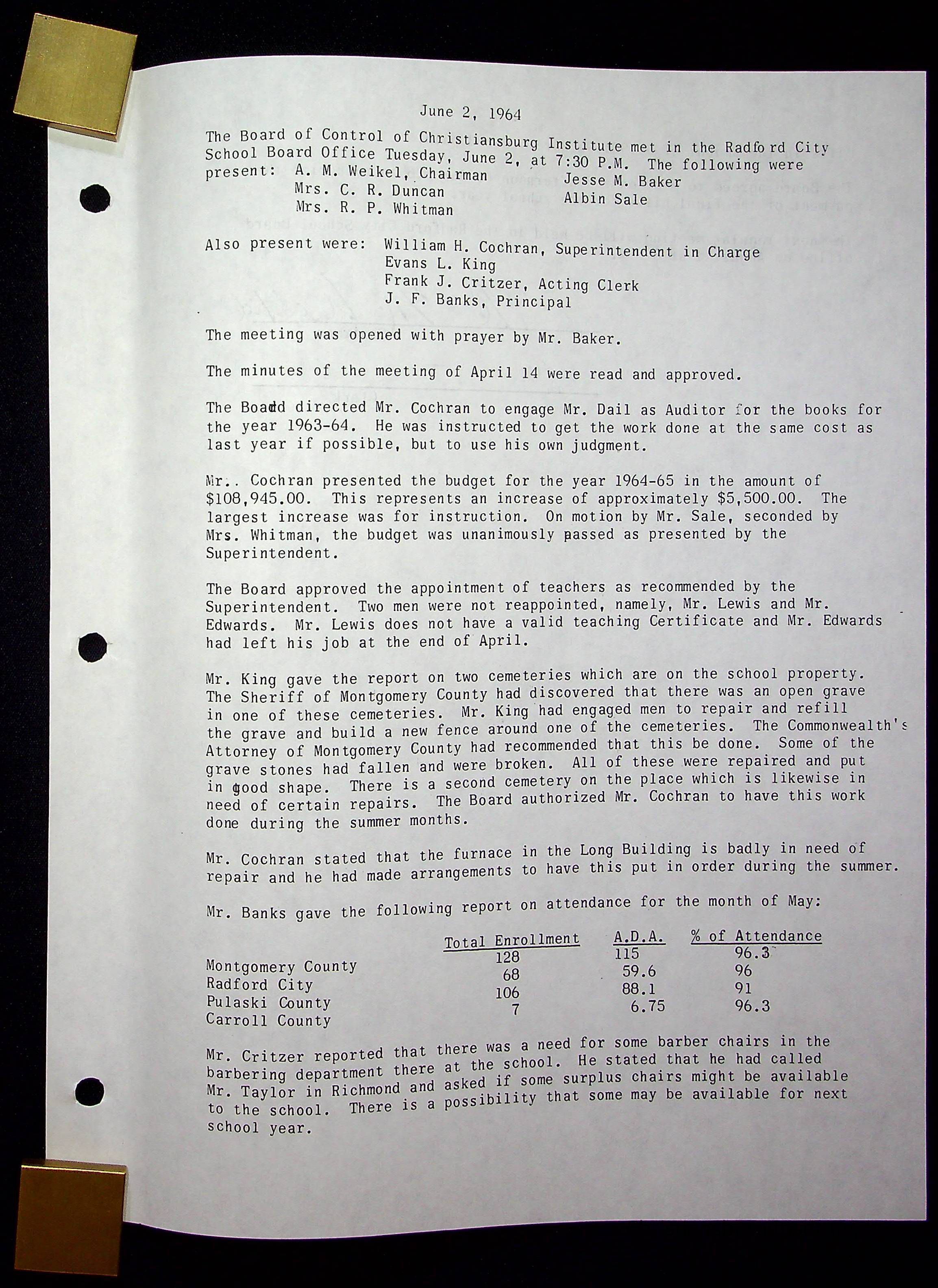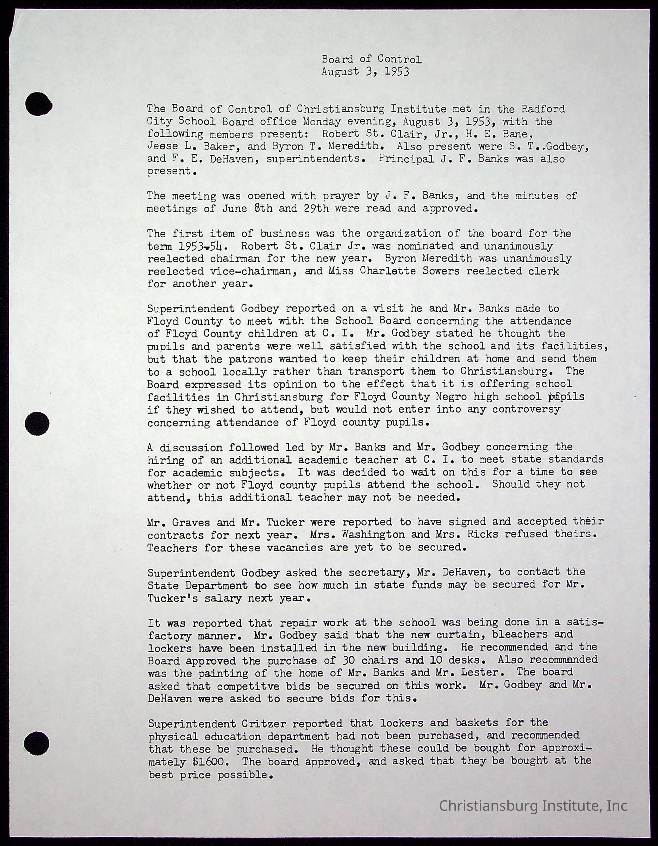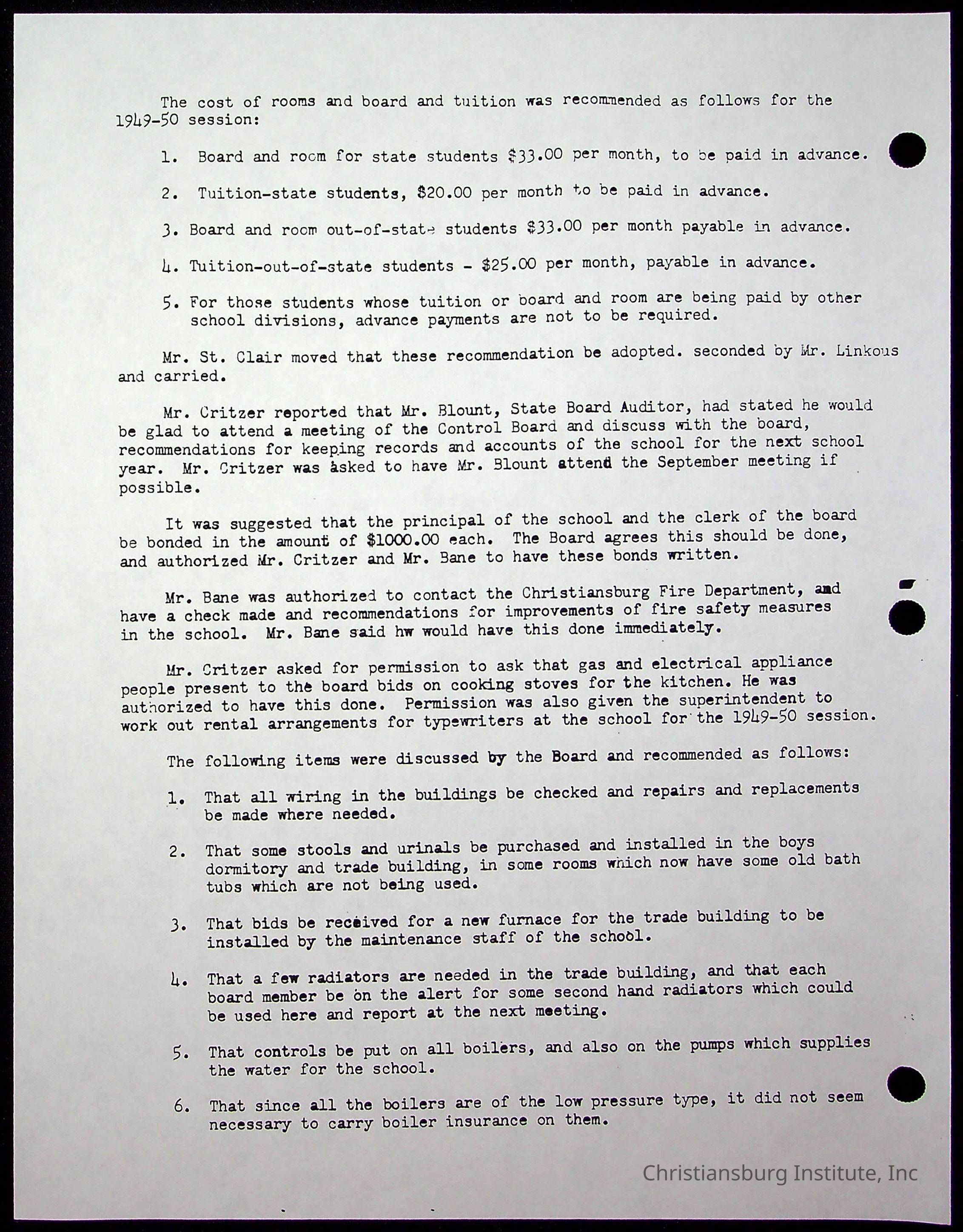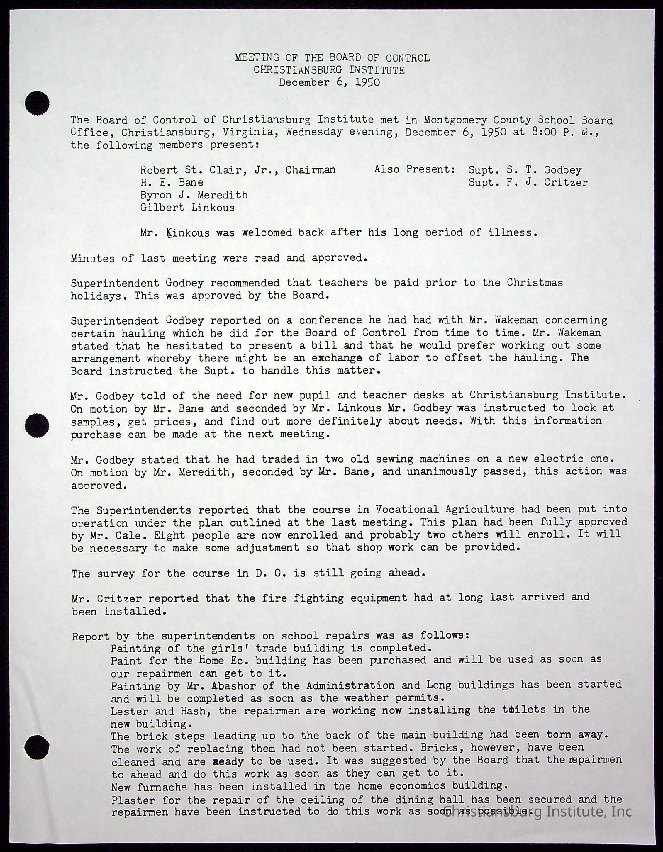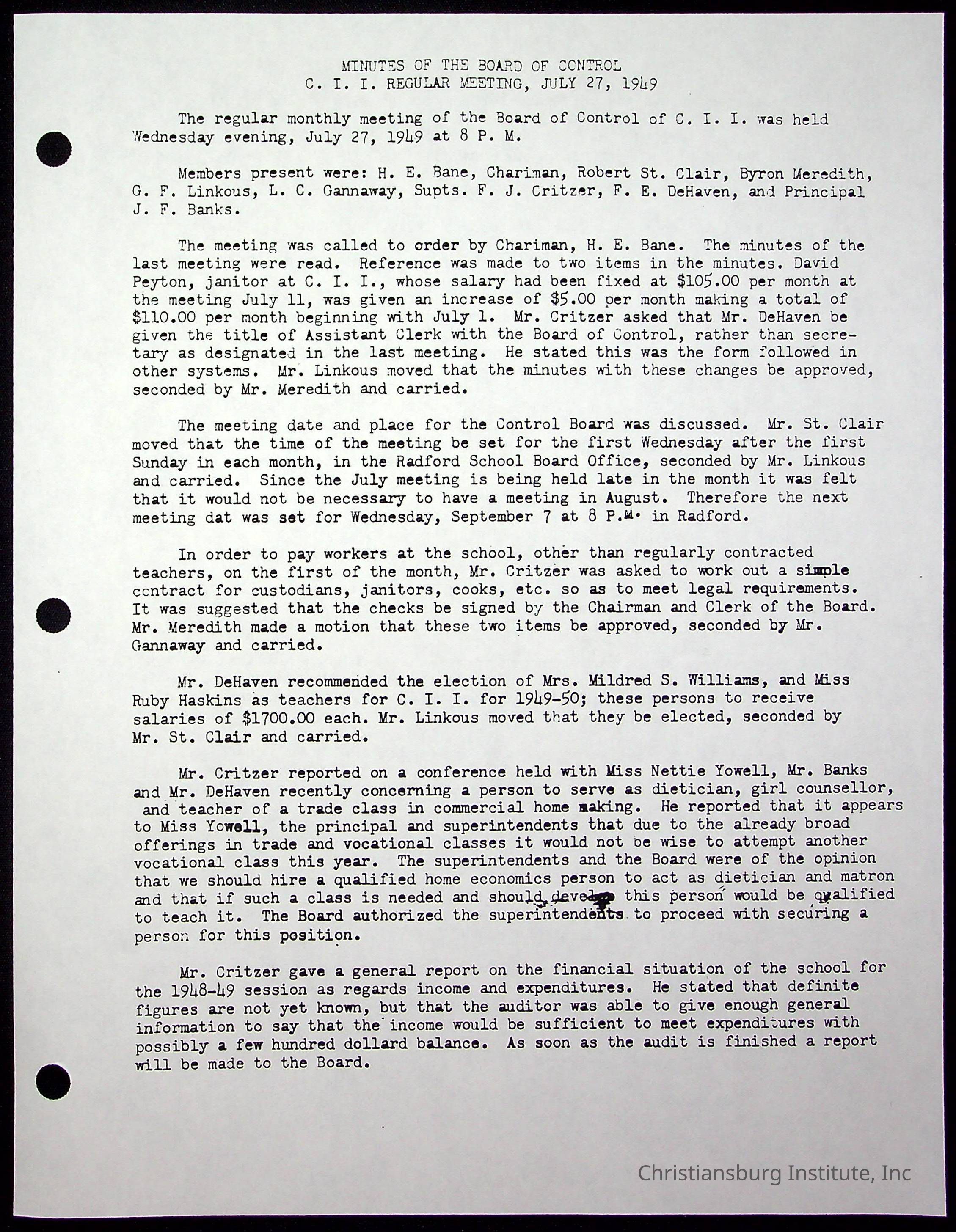 Christiansburg Industrial Institute Board Minutes, July 1947-August 1963 (photocopy)Description