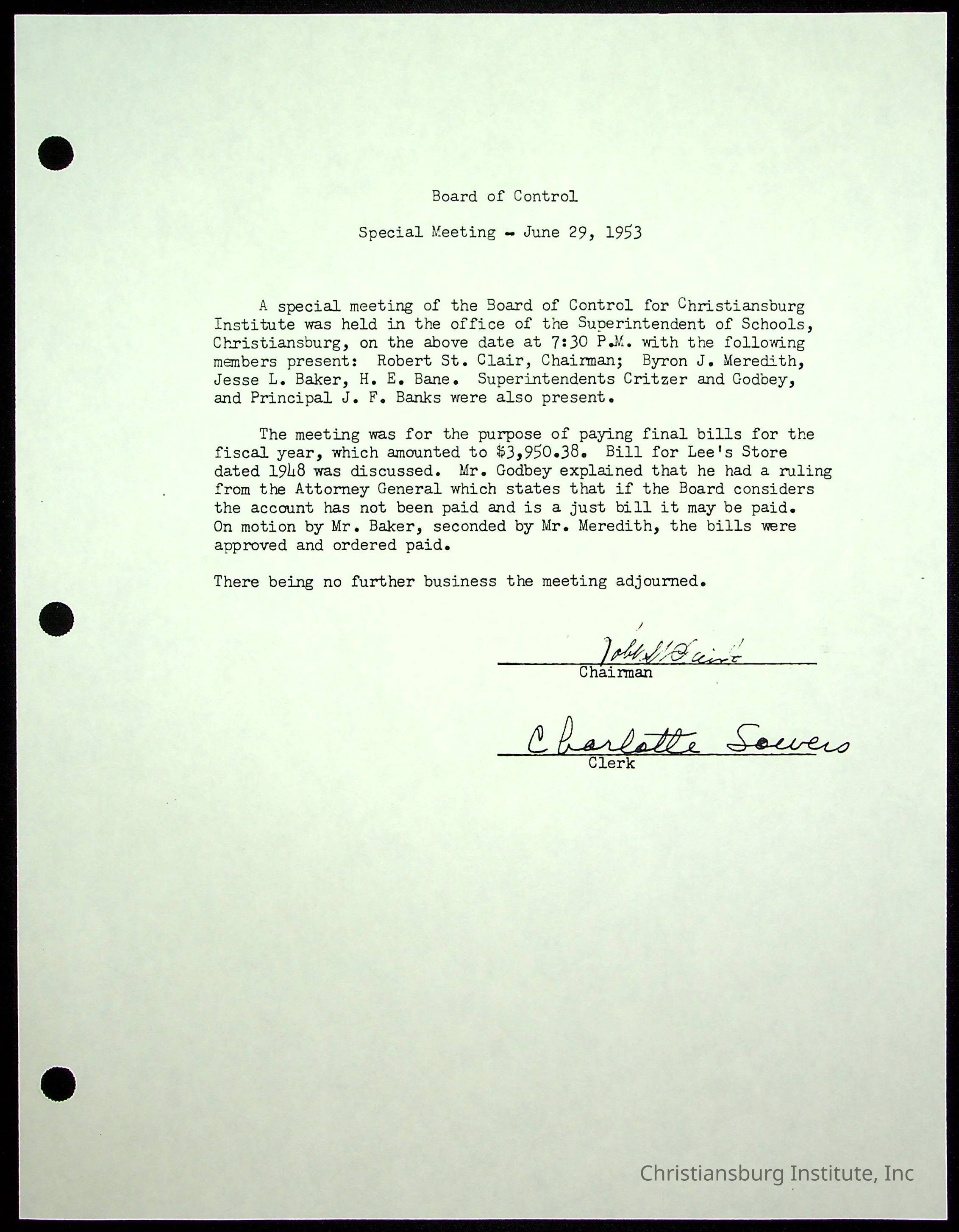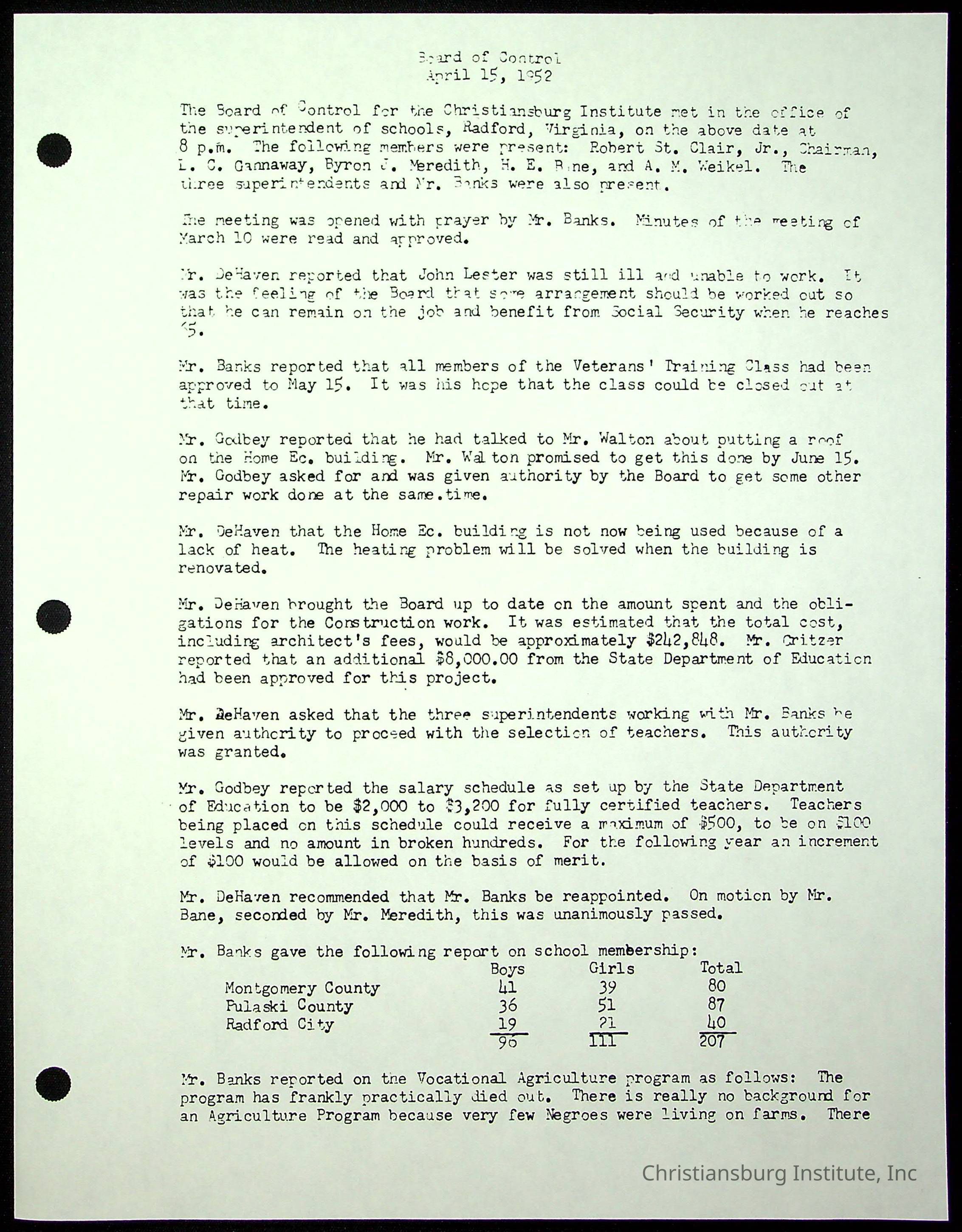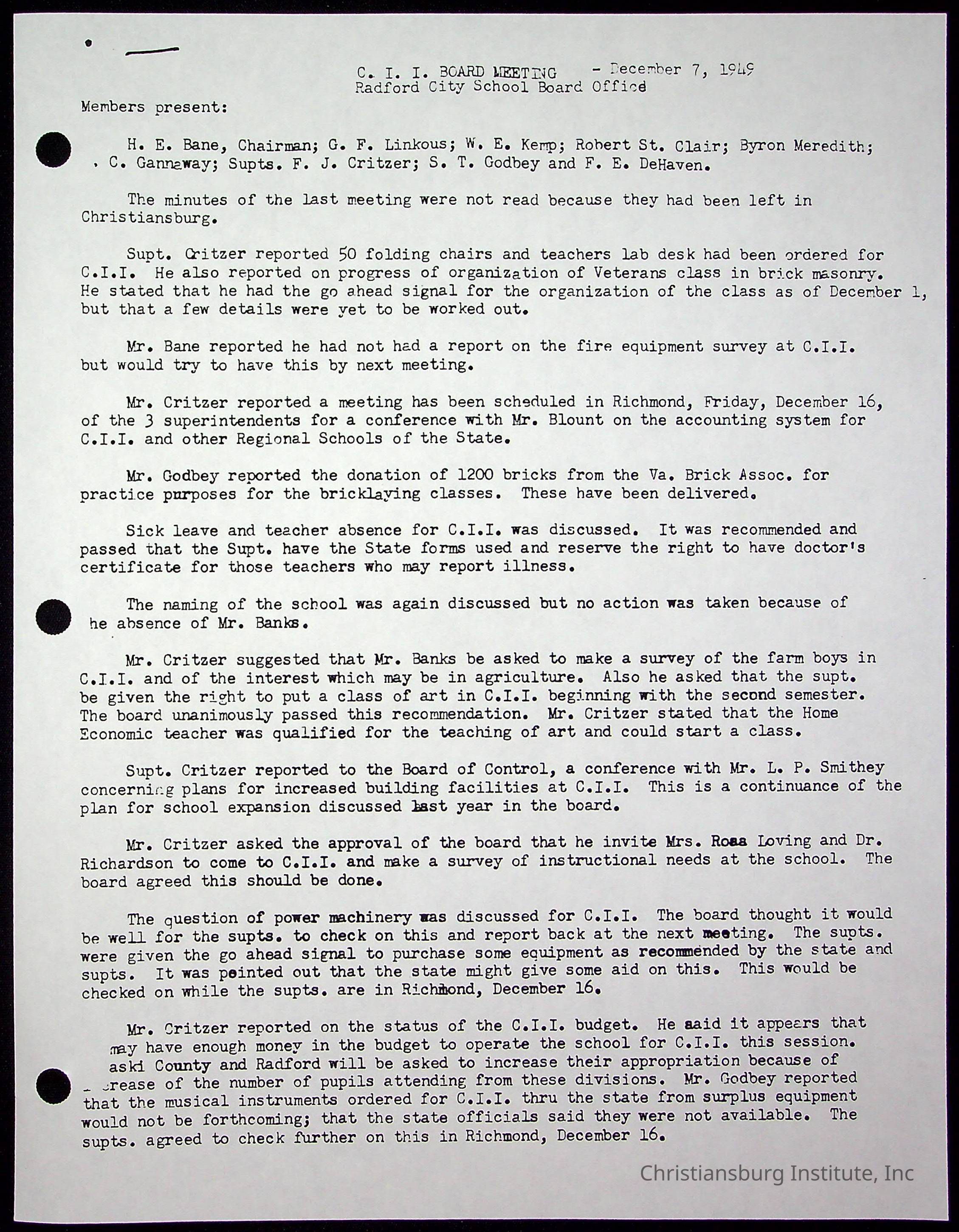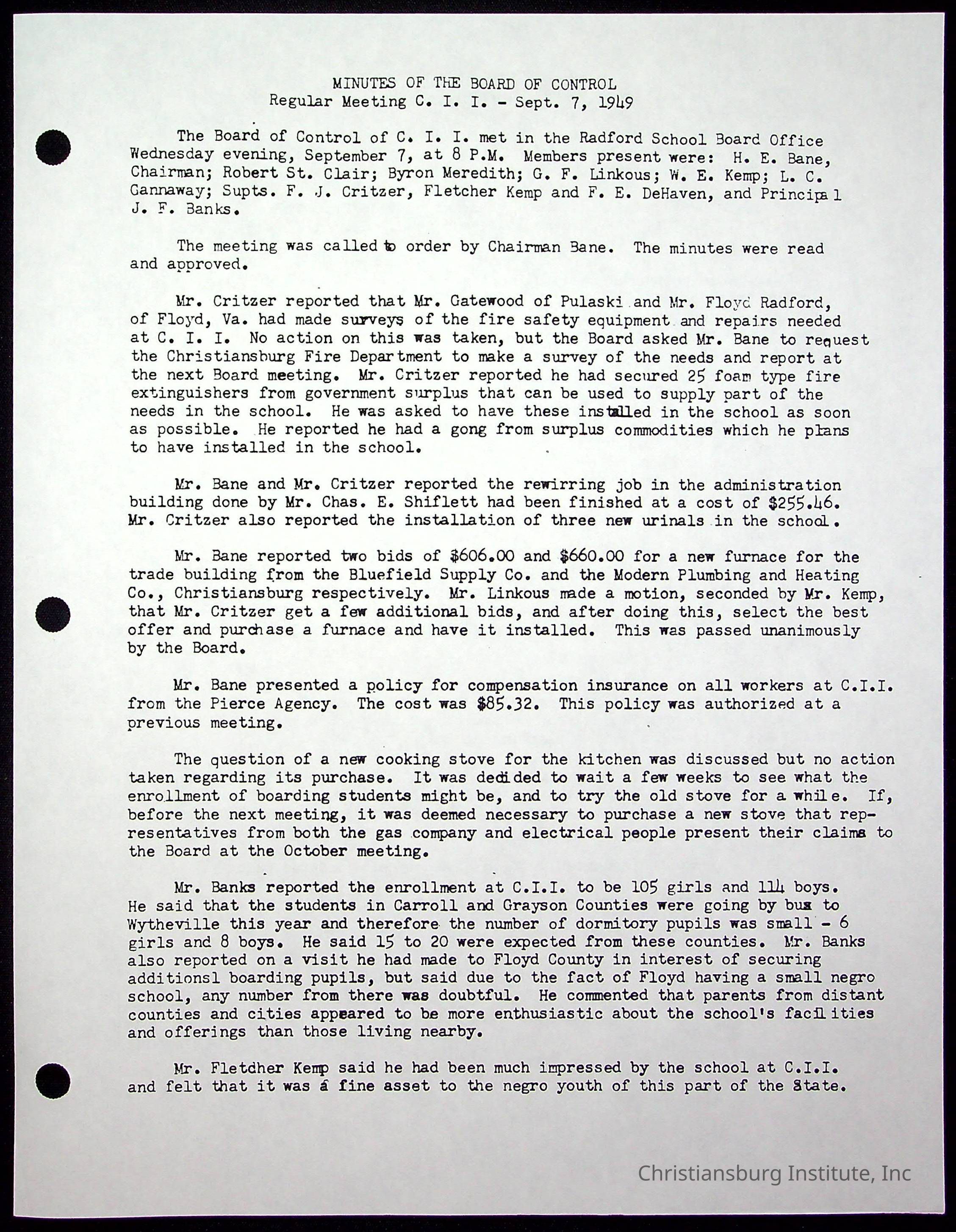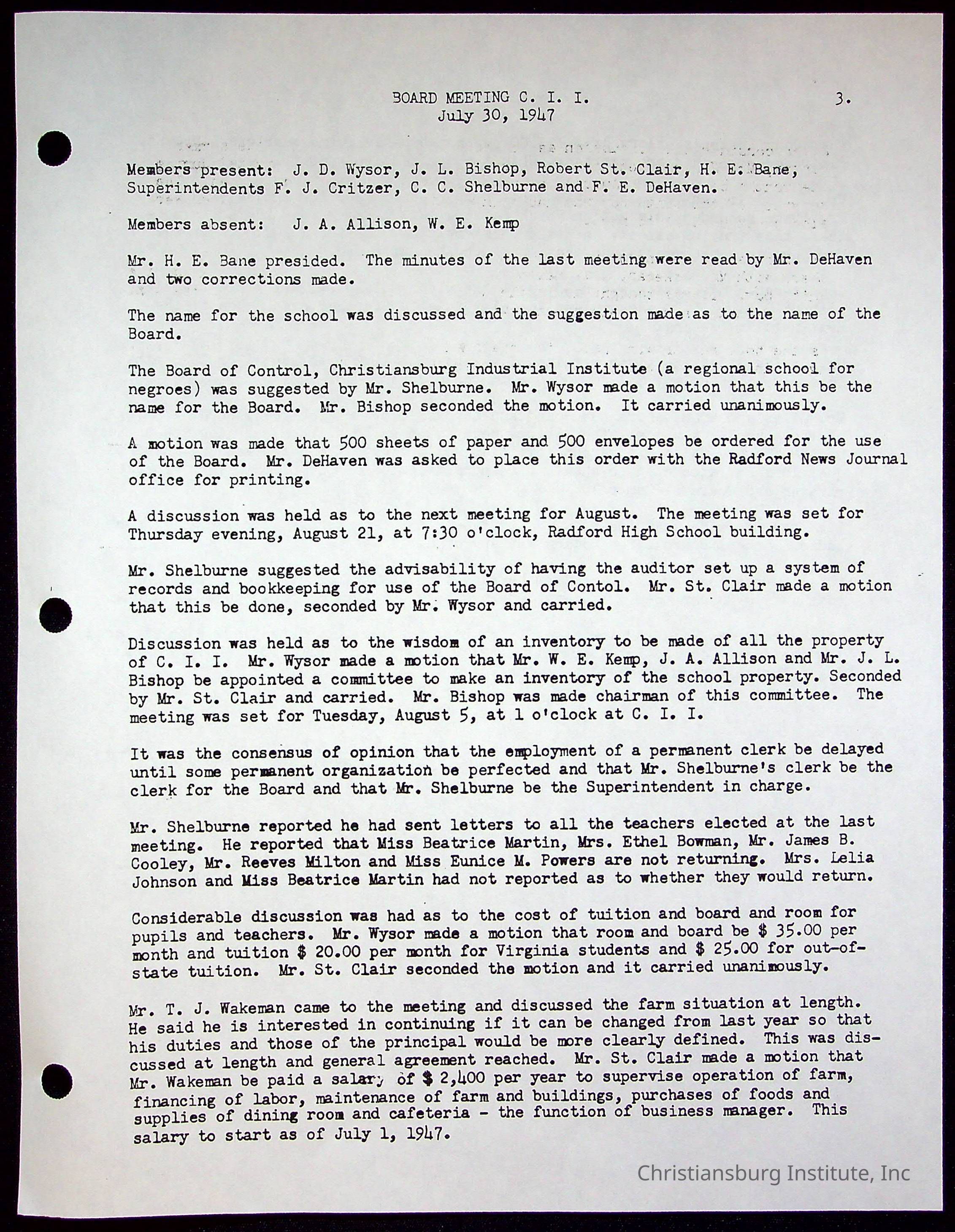 Christiansburg Industrial Institute Board Minutes, July 1947-August 1963 (photocopy)Description