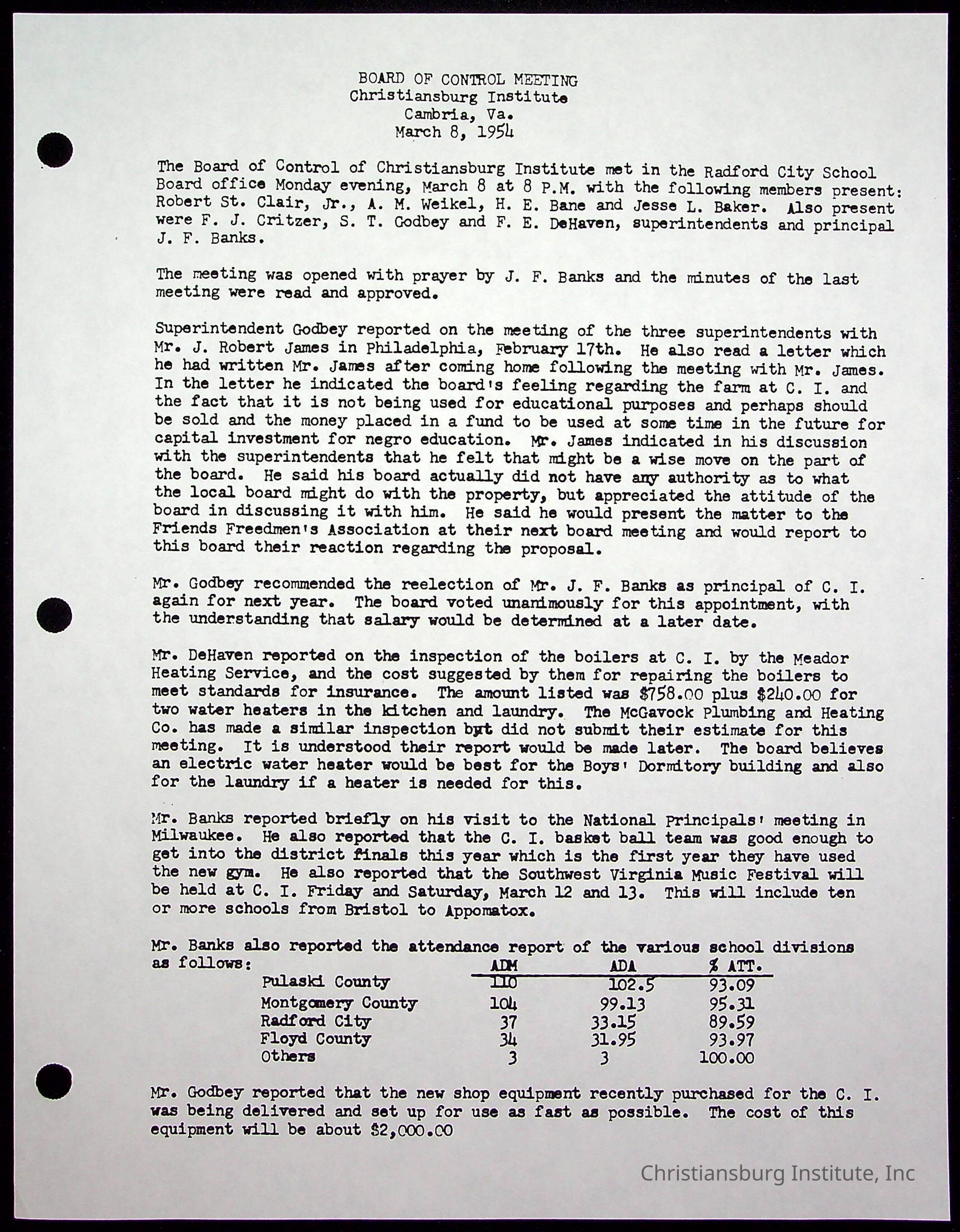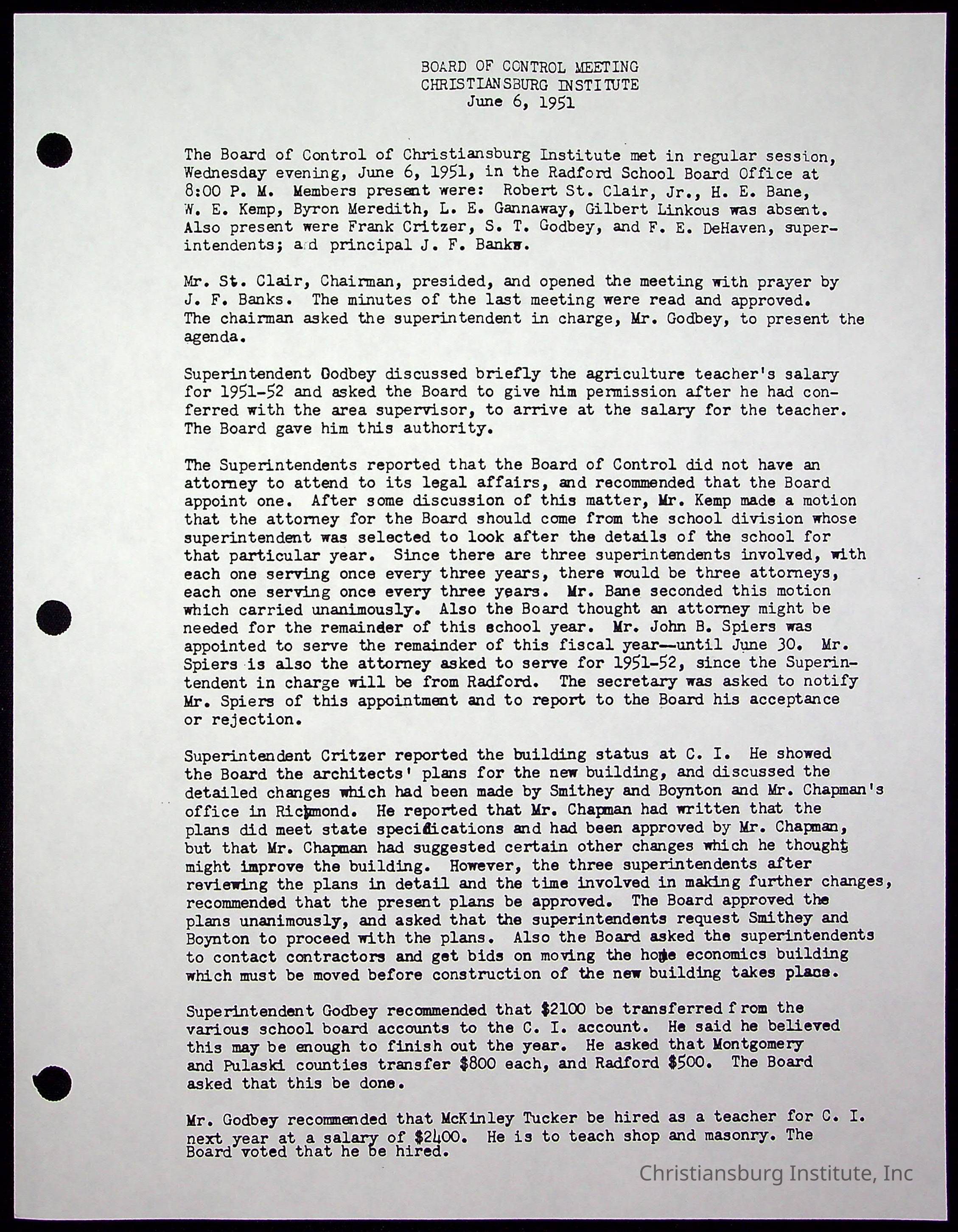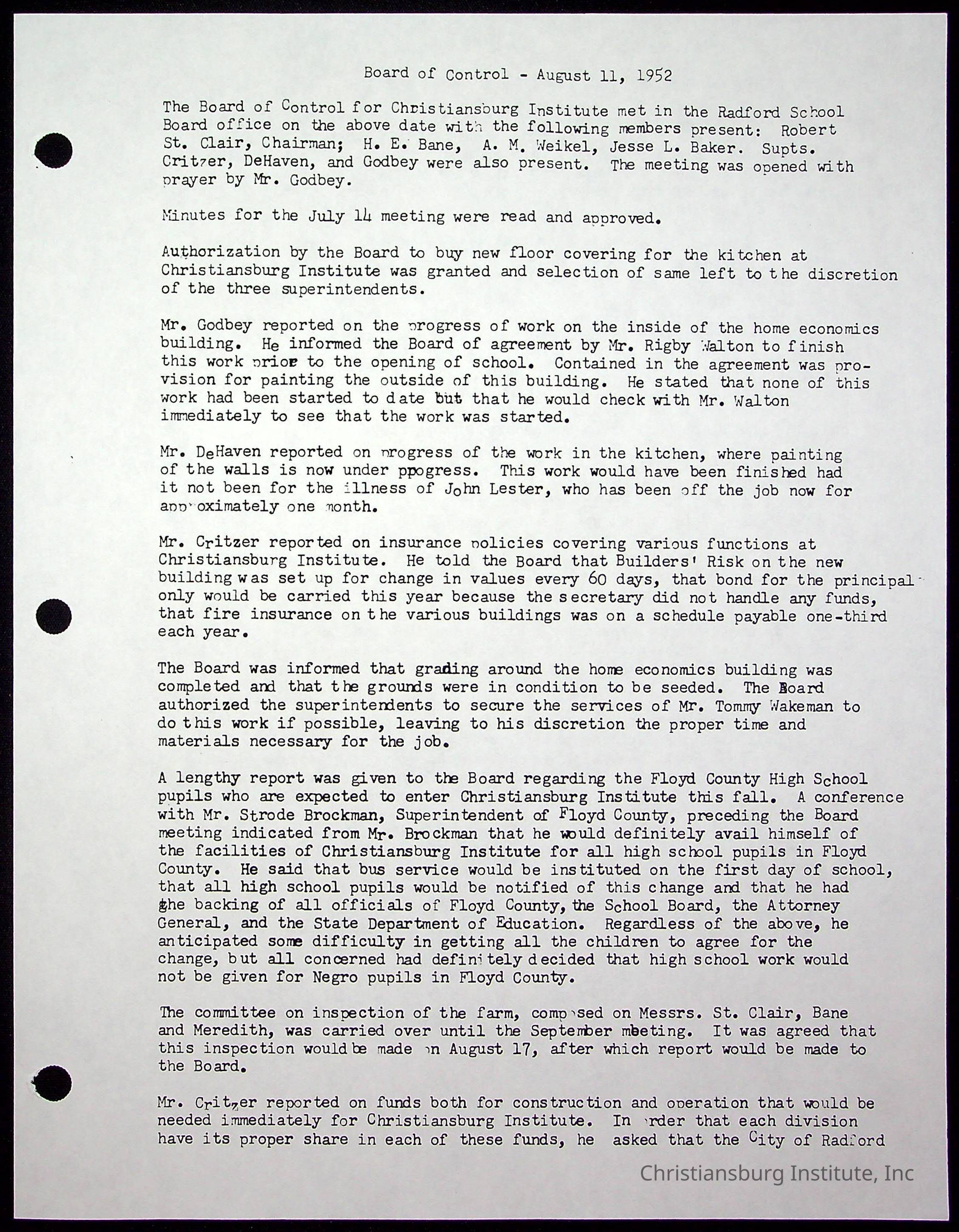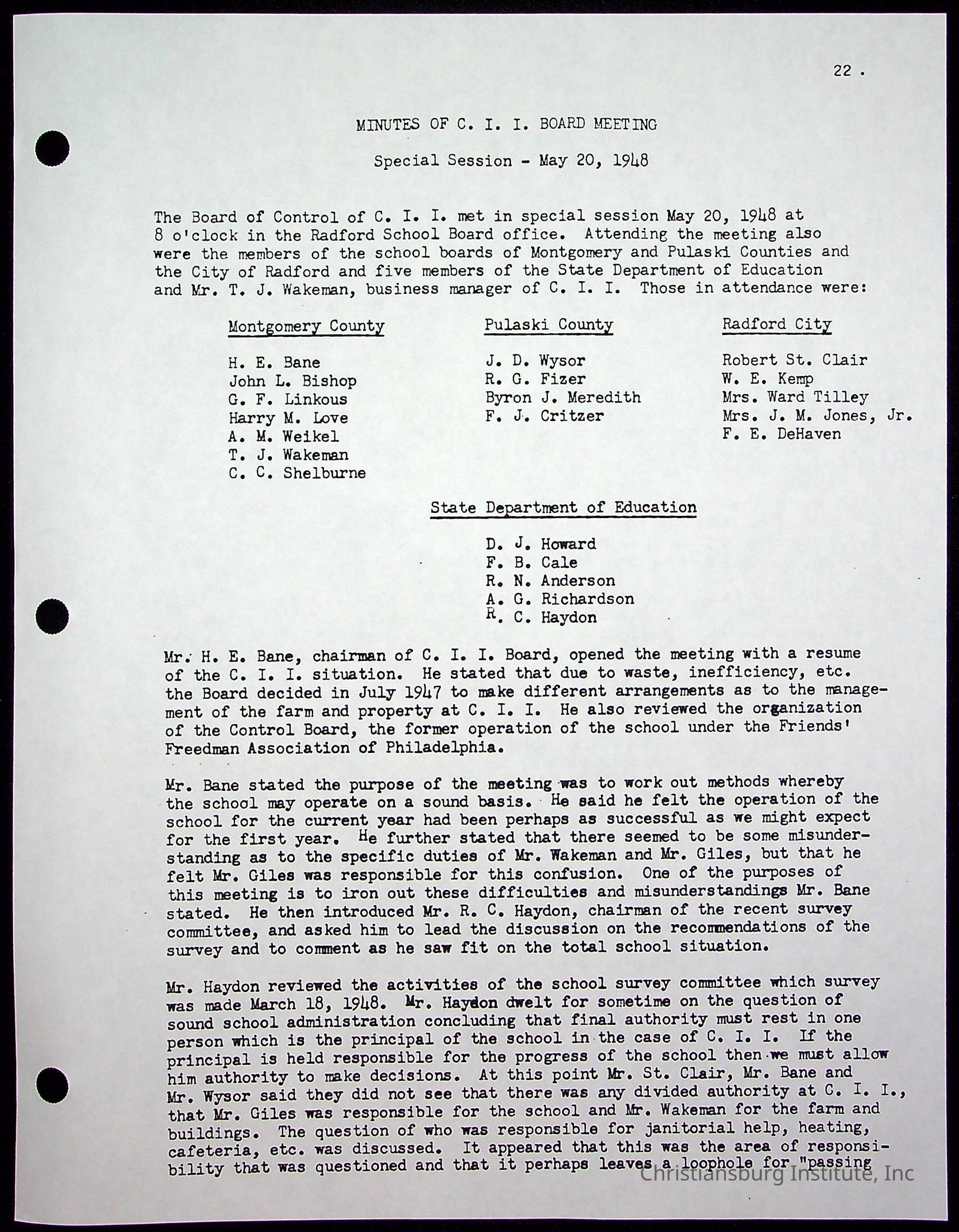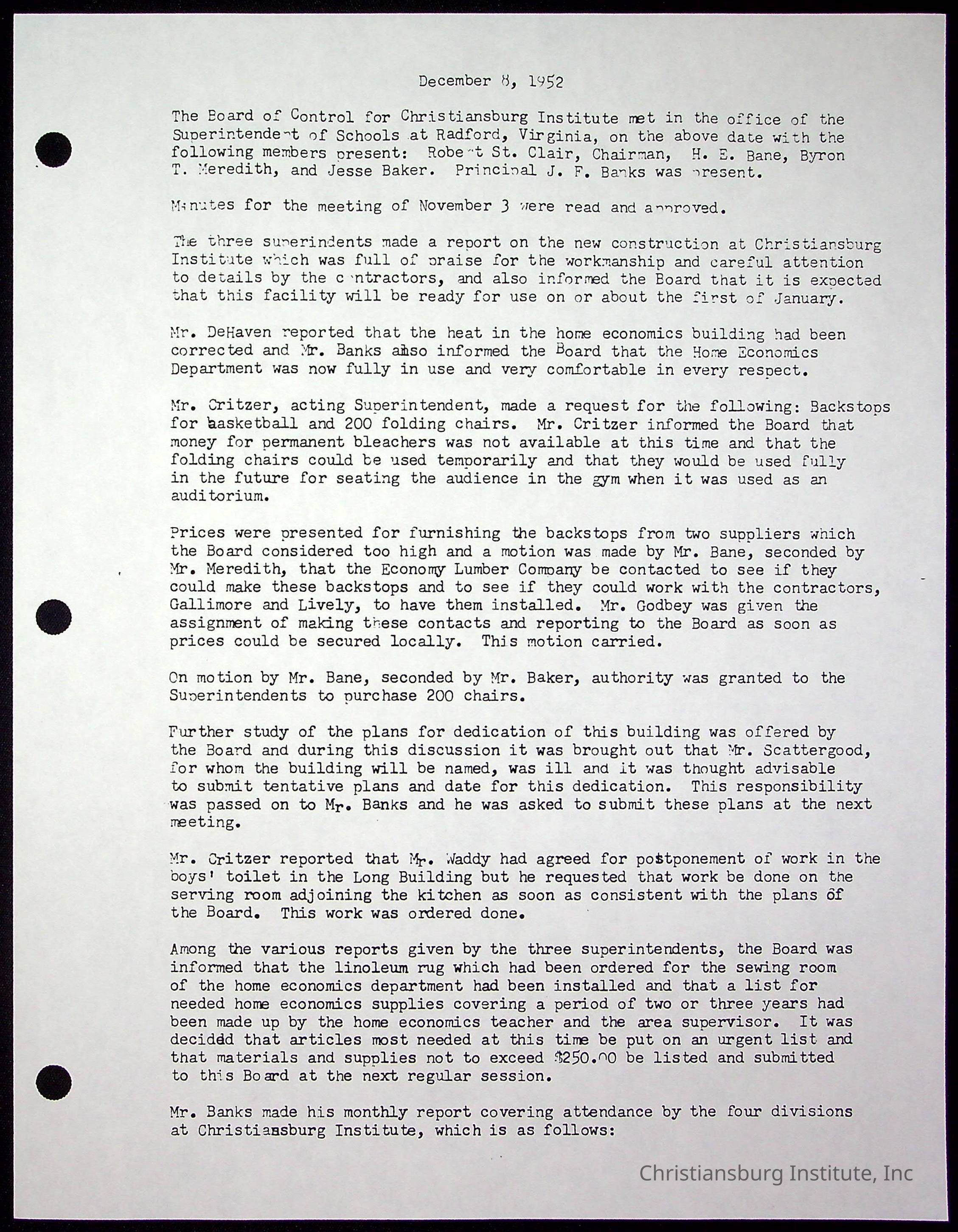 Christiansburg Industrial Institute Board Minutes, July 1947-August 1963 (photocopy)Description