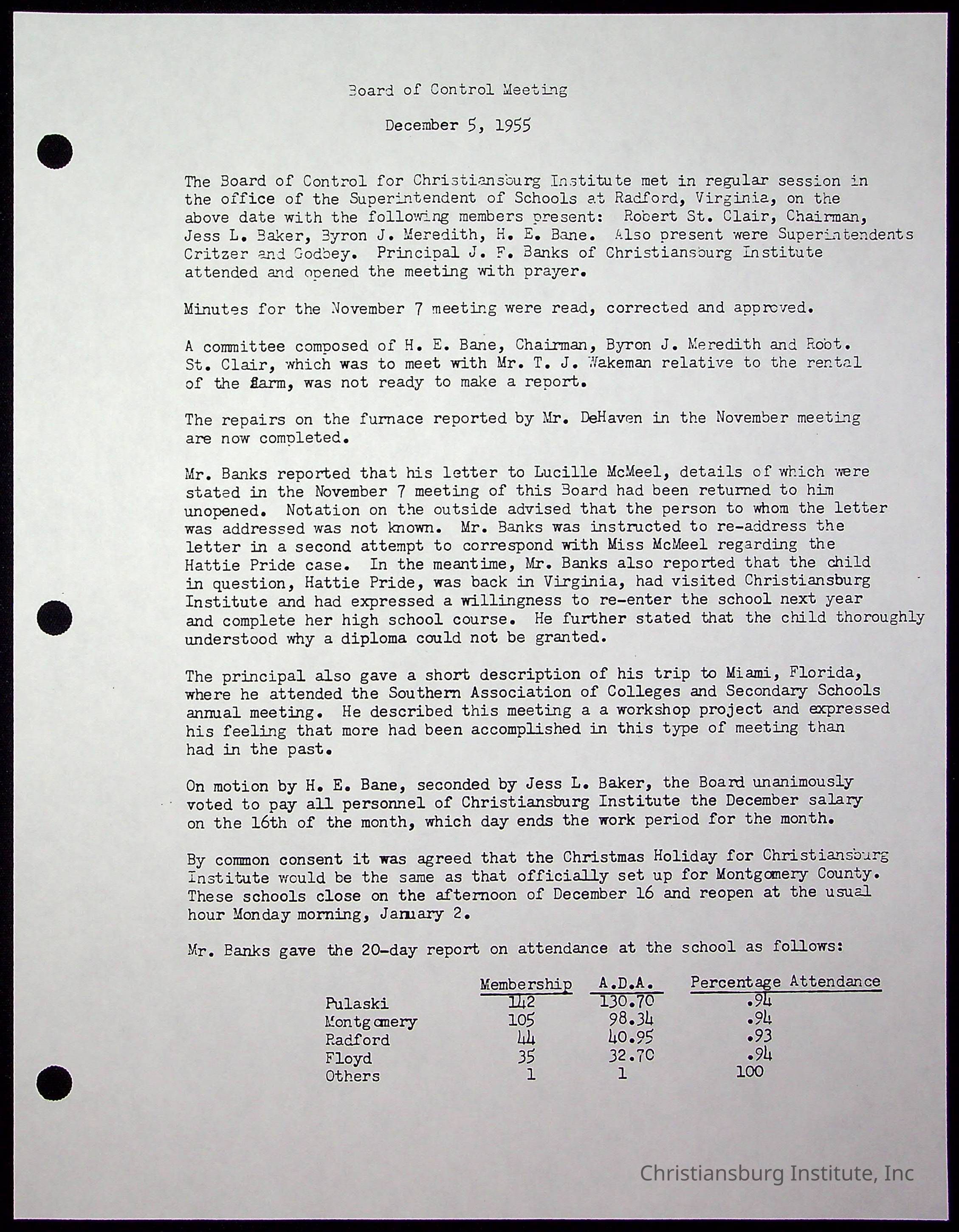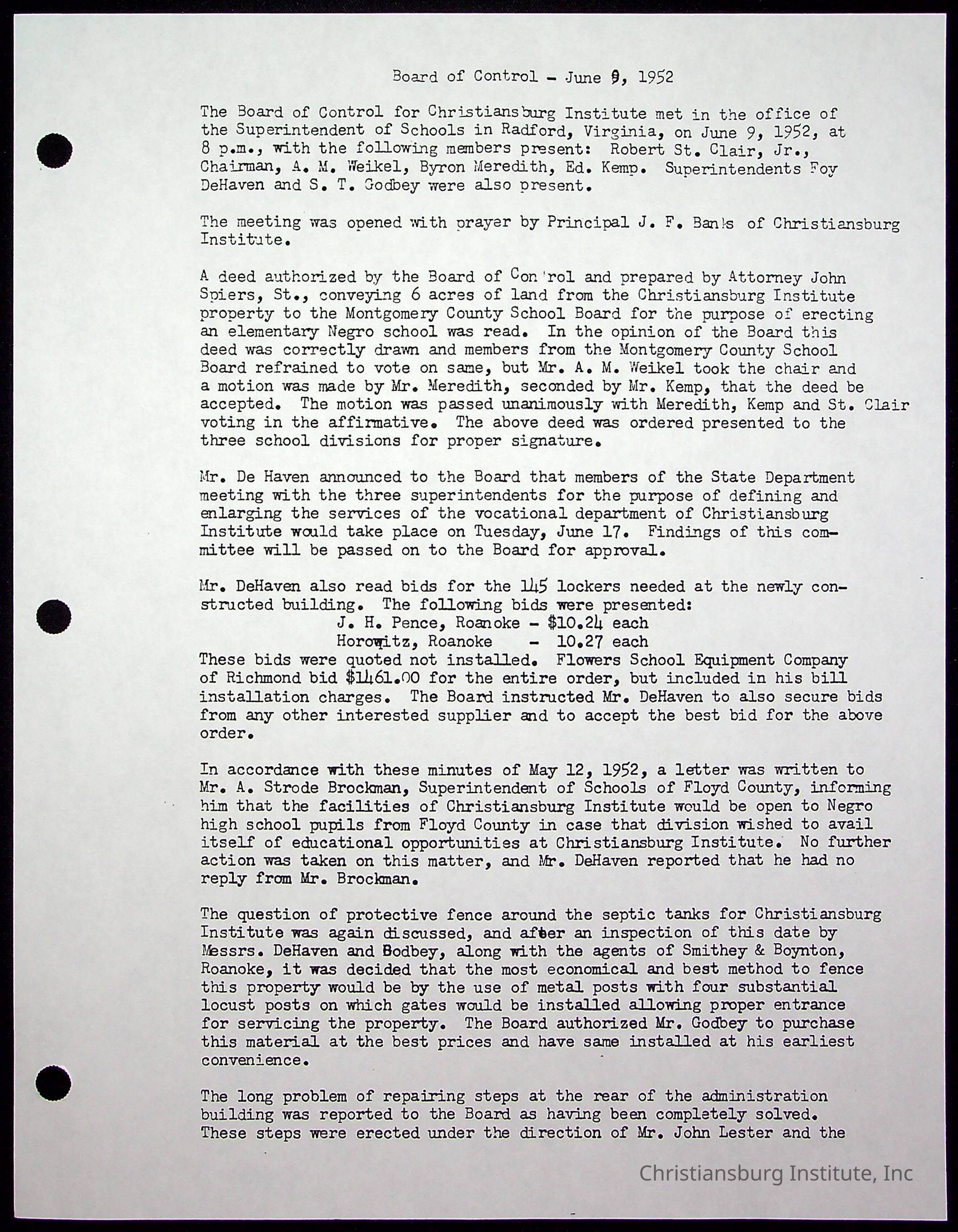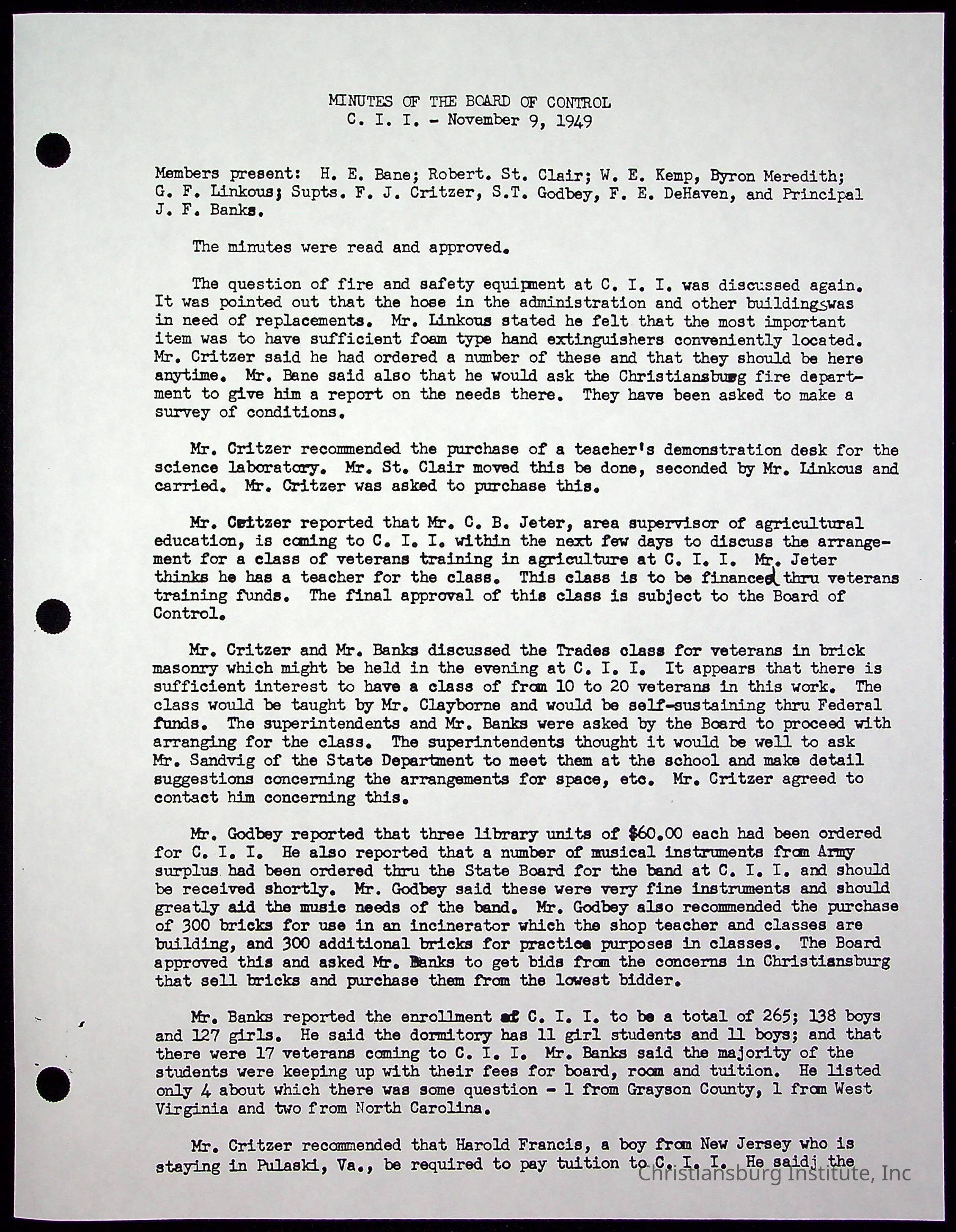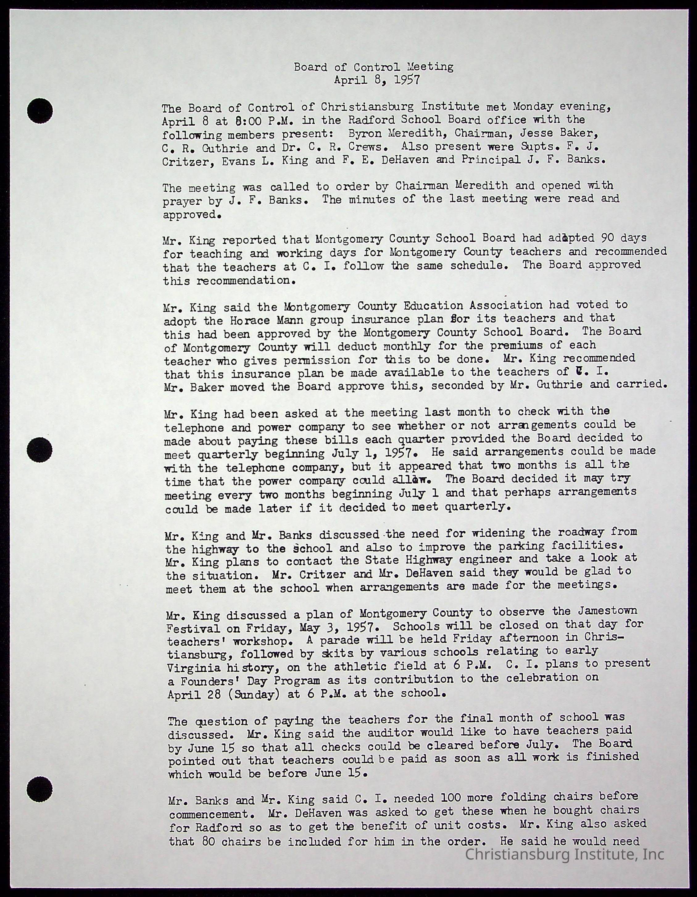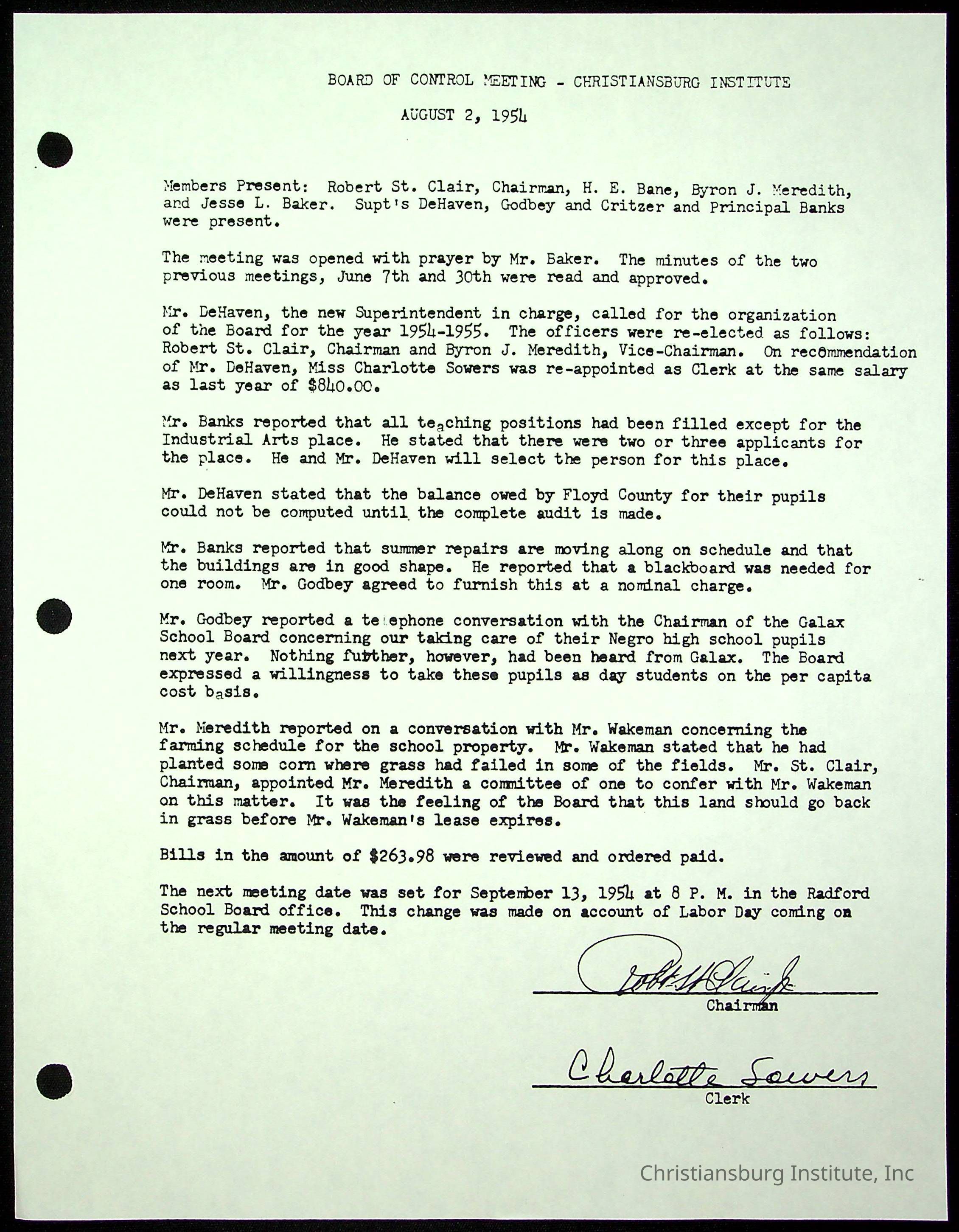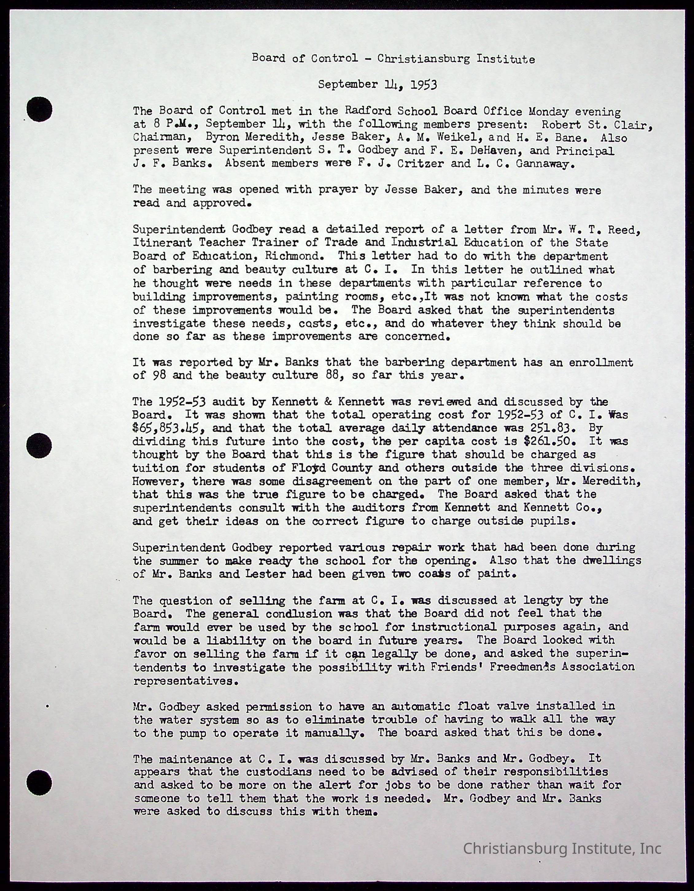 Christiansburg Industrial Institute Board Minutes, July 1947-August 1963 (photocopy)Description