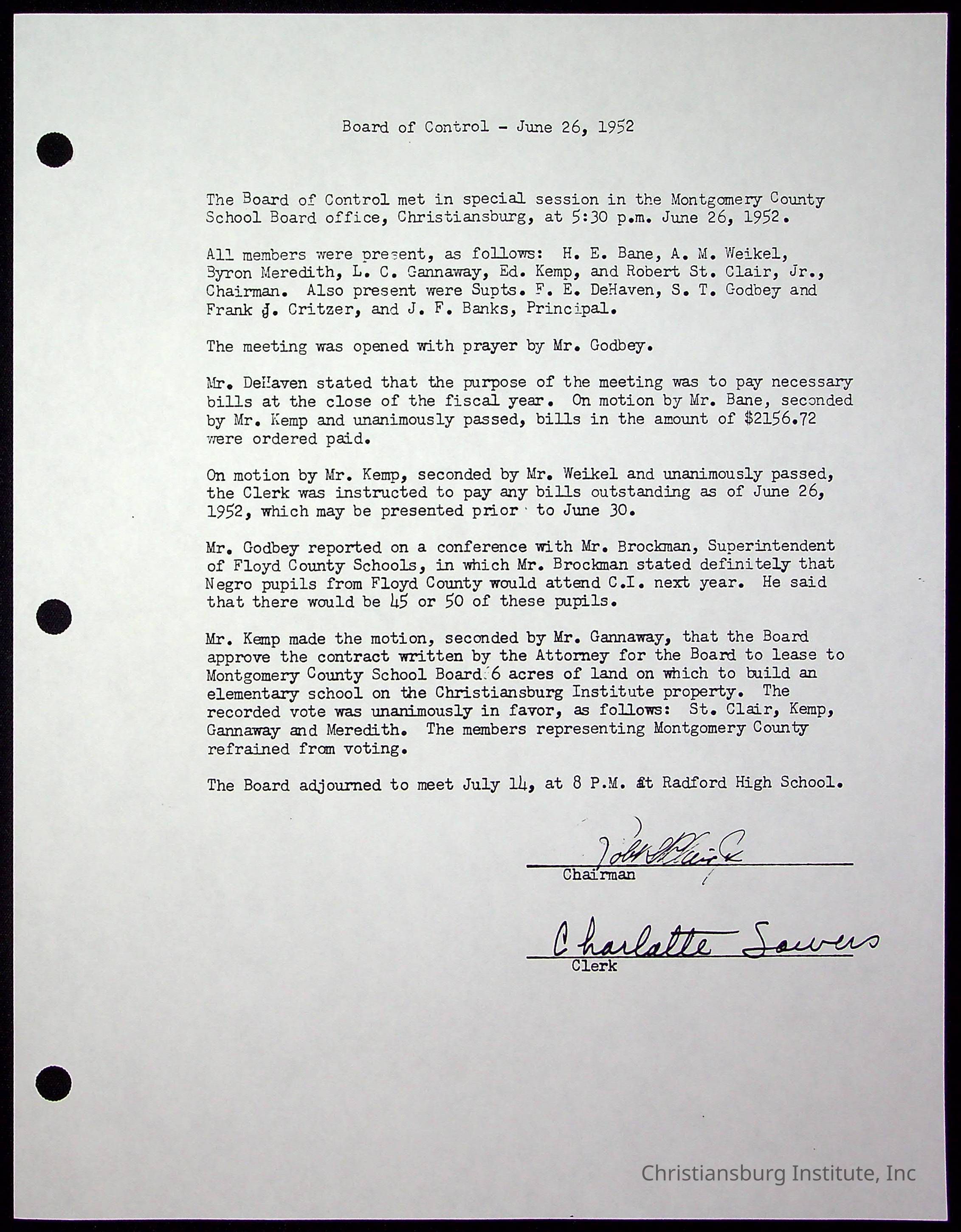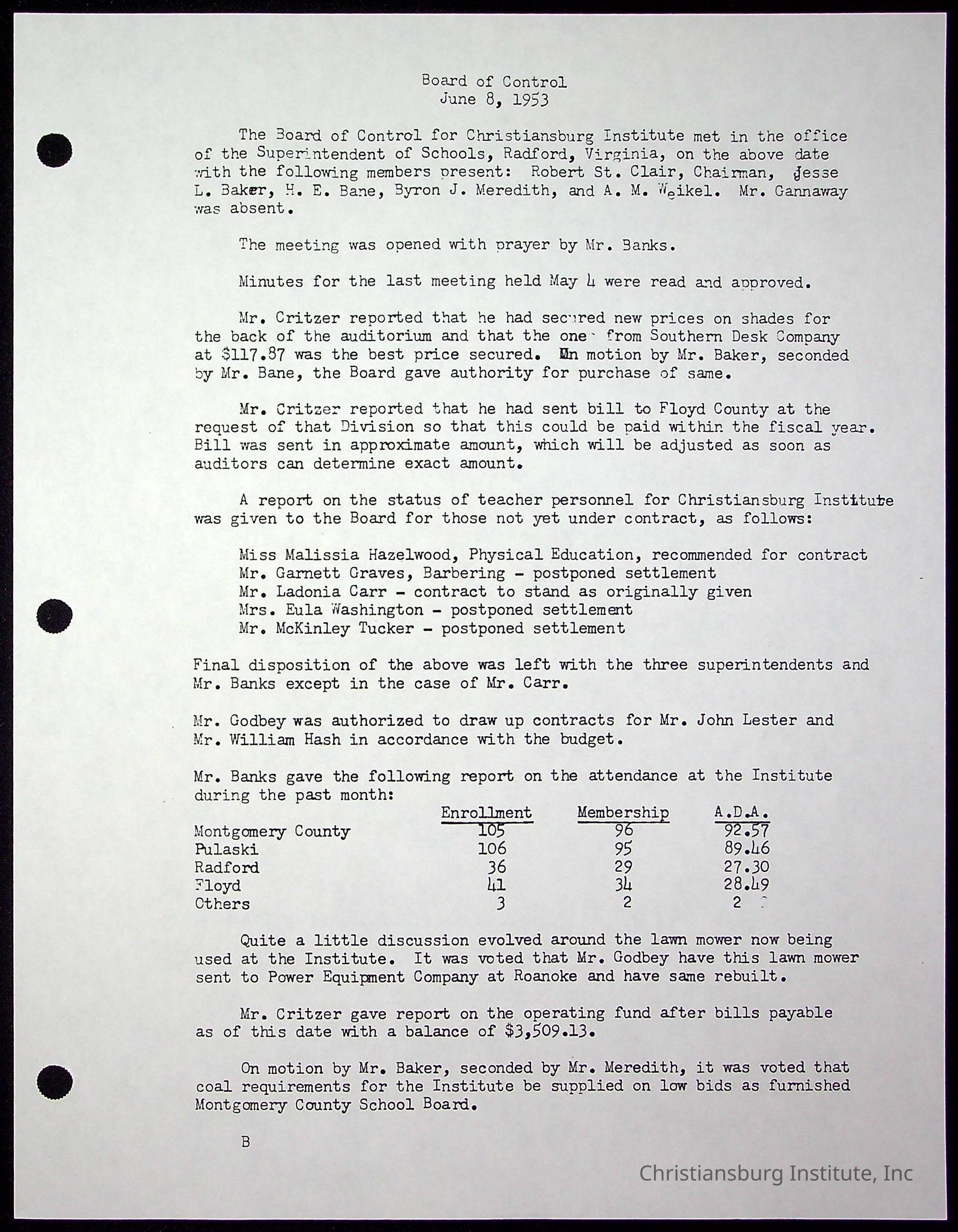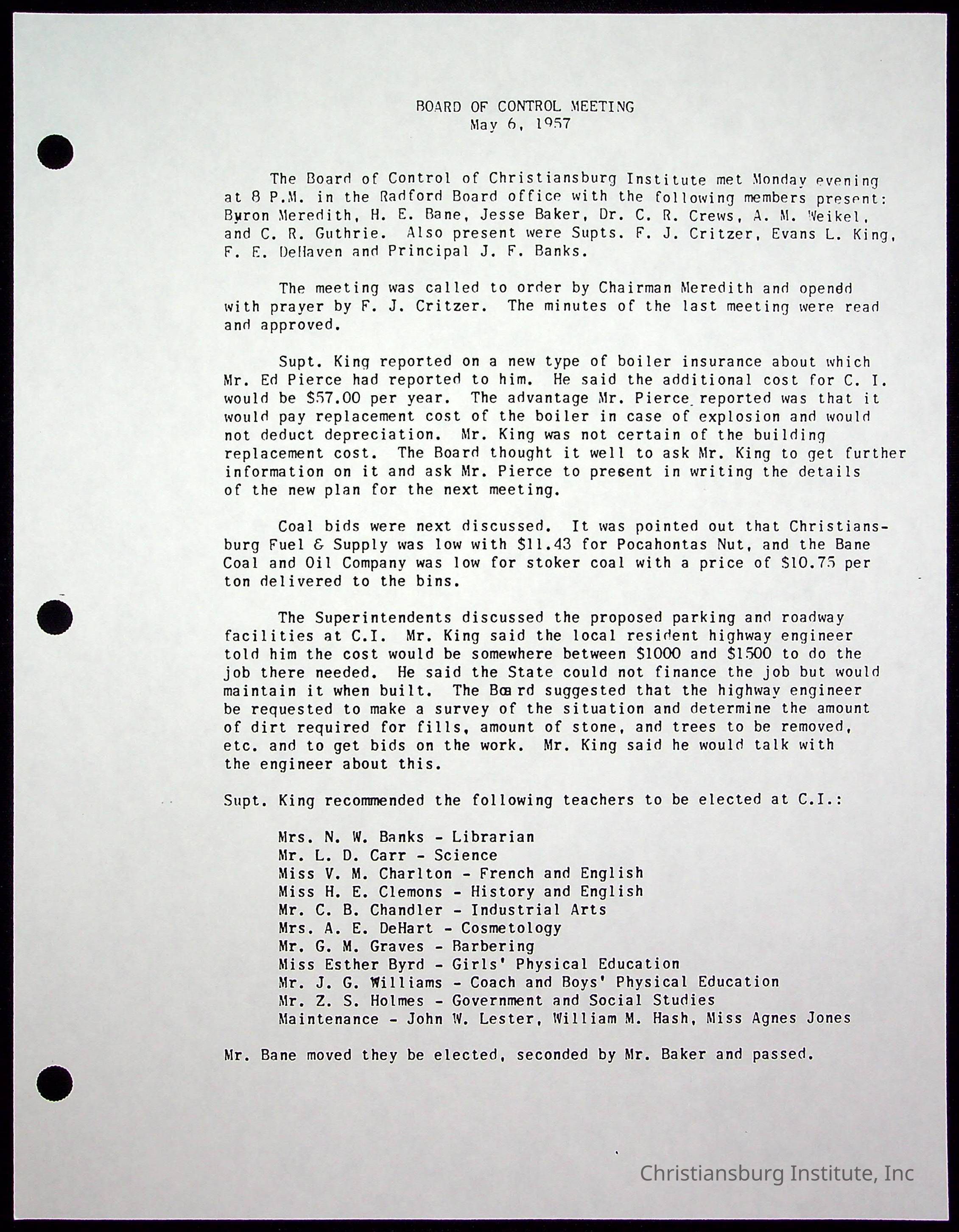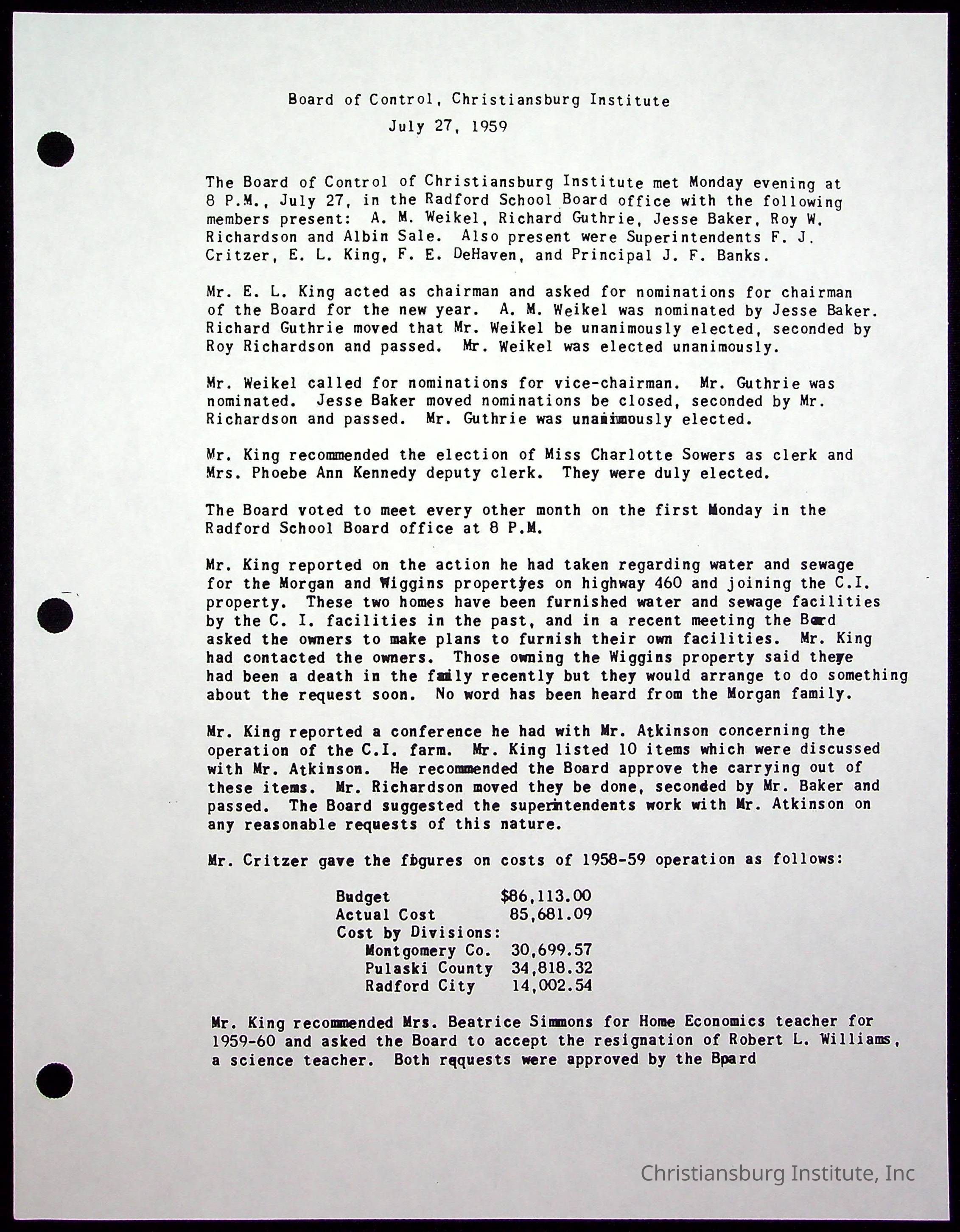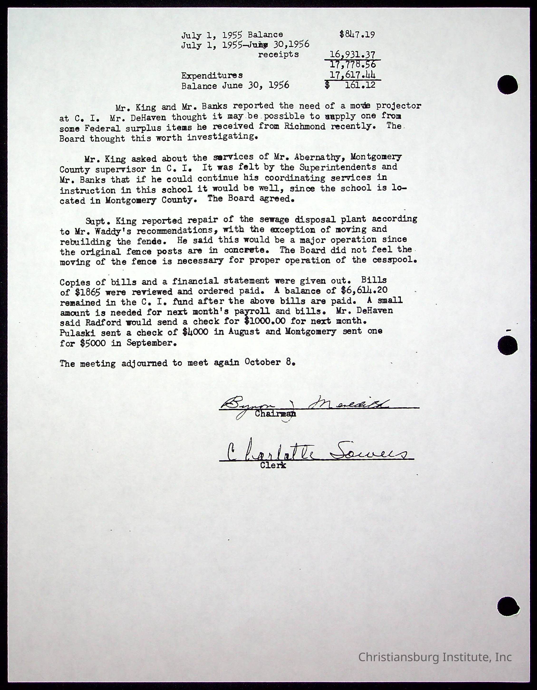 Christiansburg Industrial Institute Board Minutes, July 1947-August 1963 (photocopy)Description