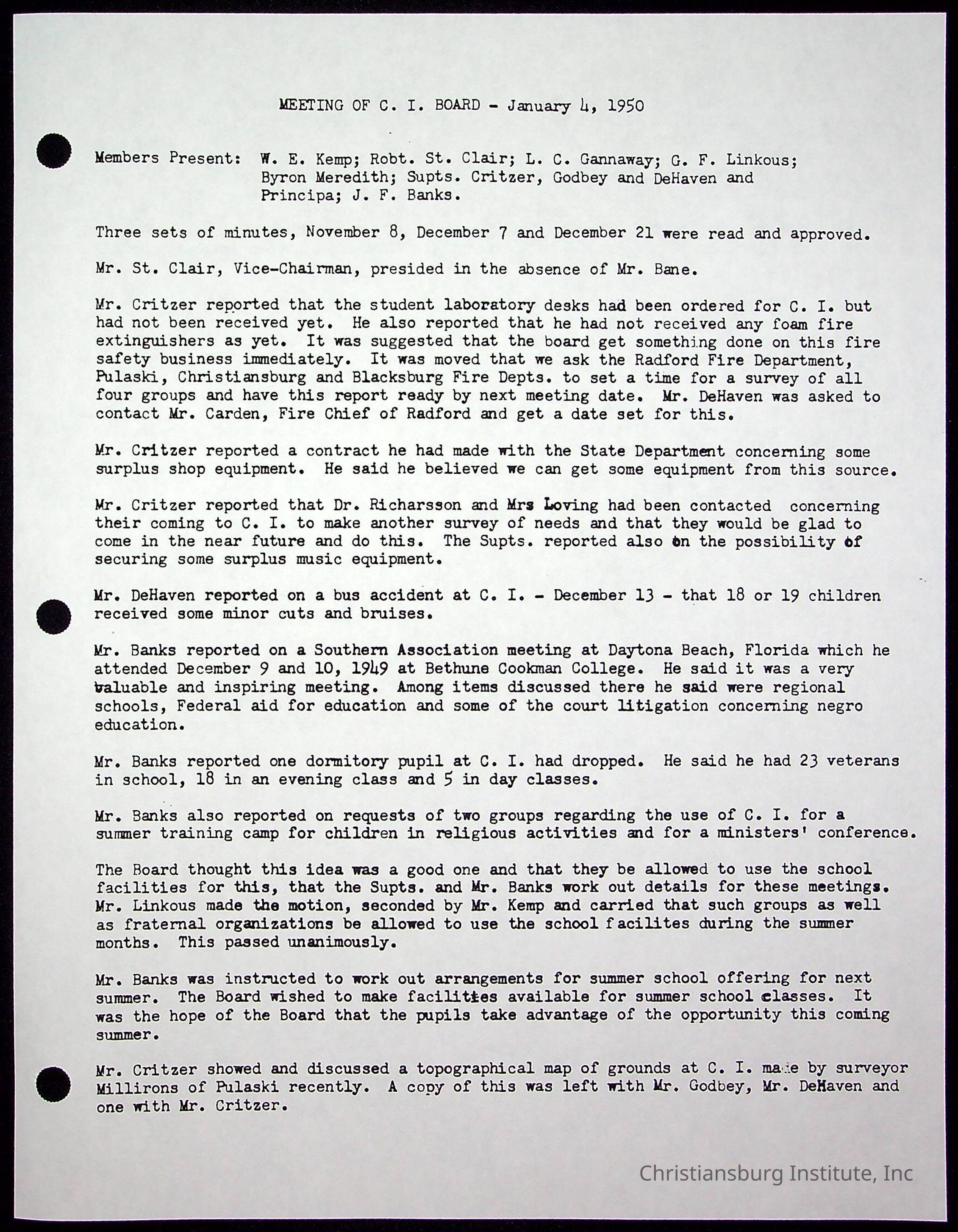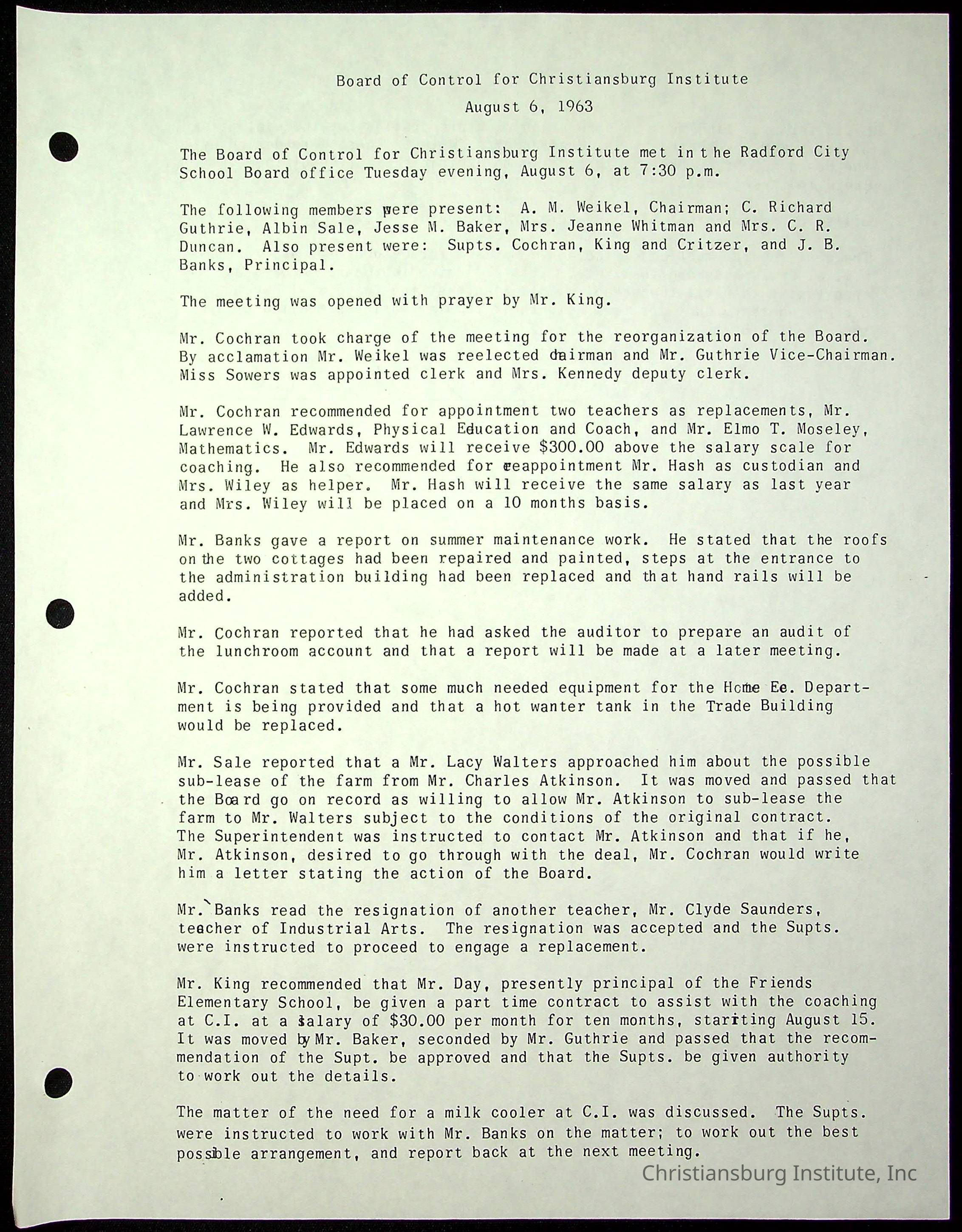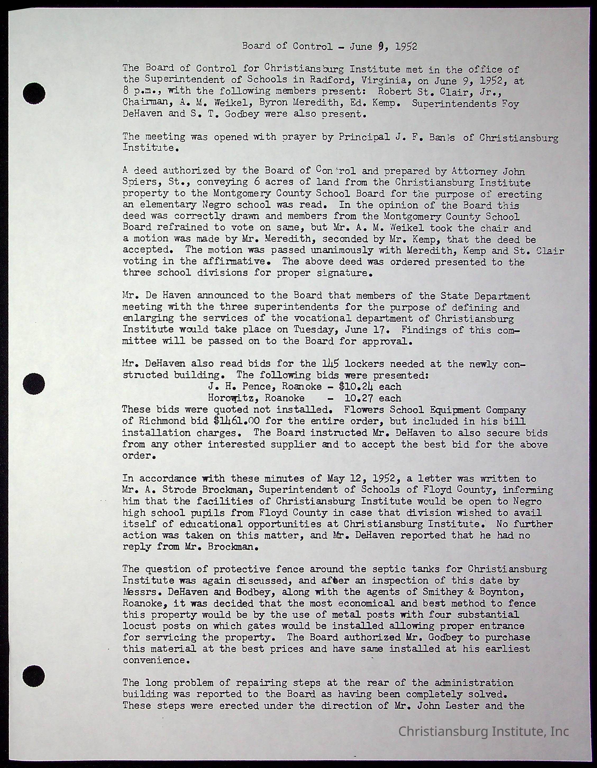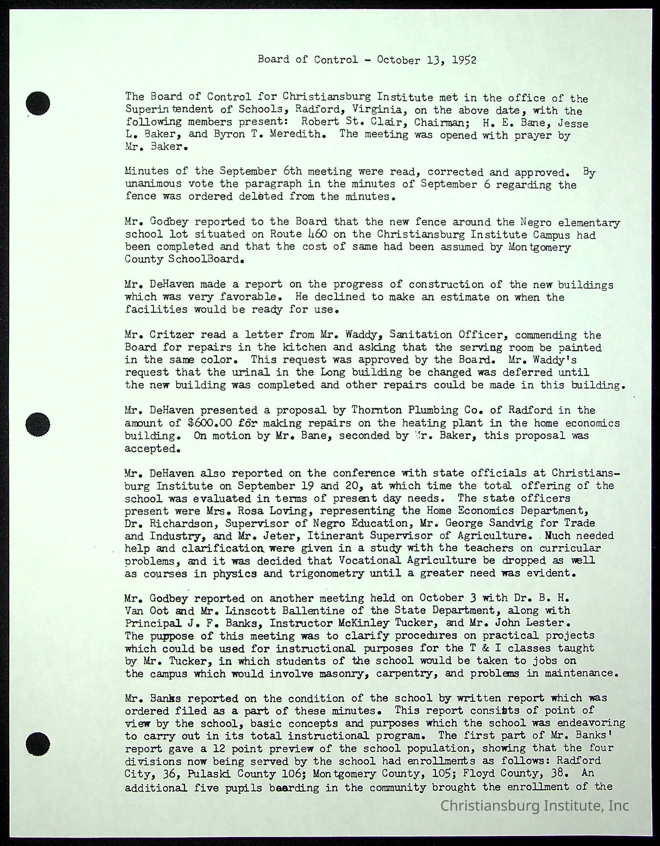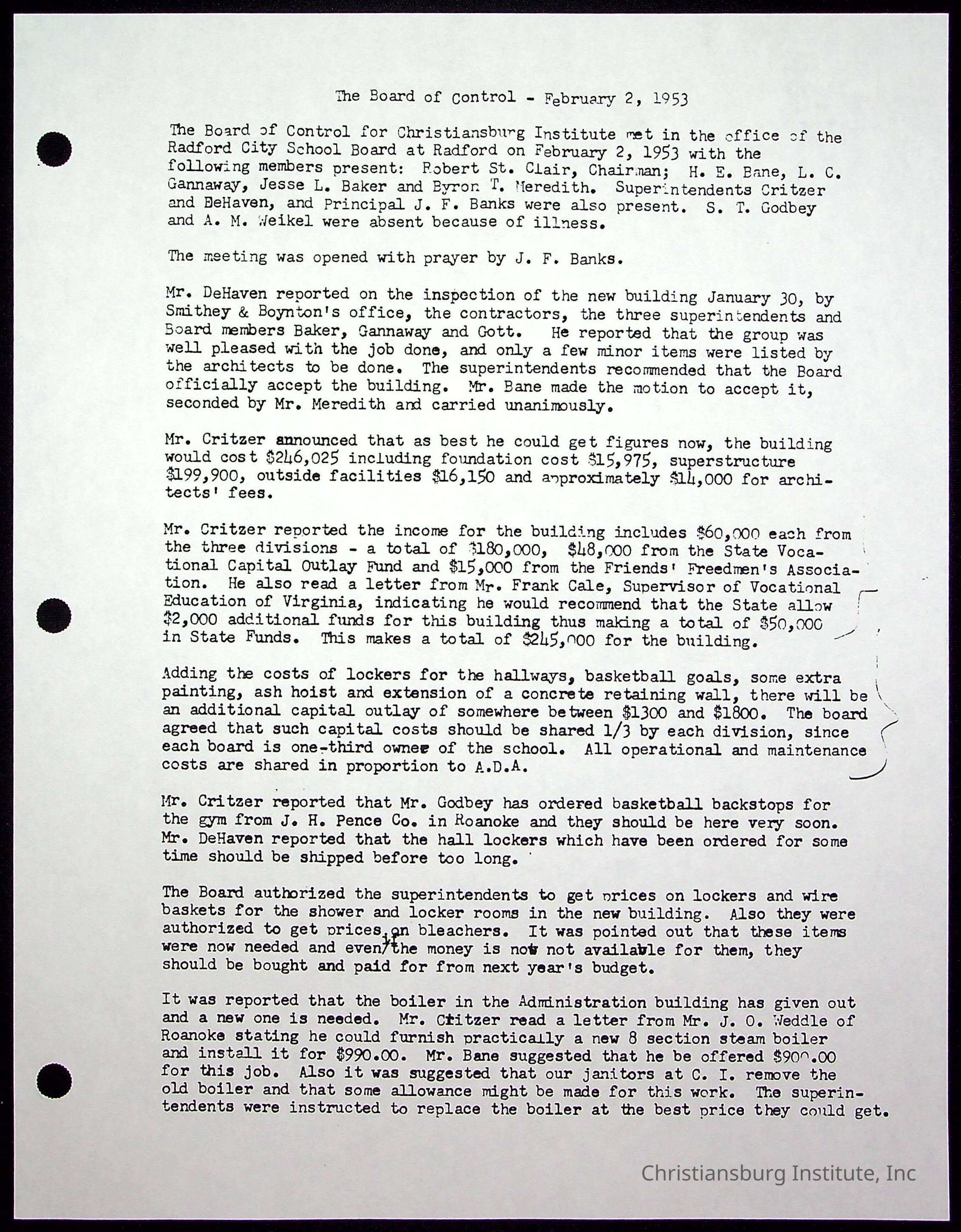 Christiansburg Industrial Institute Board Minutes, July 1947-August 1963 (photocopy)Description