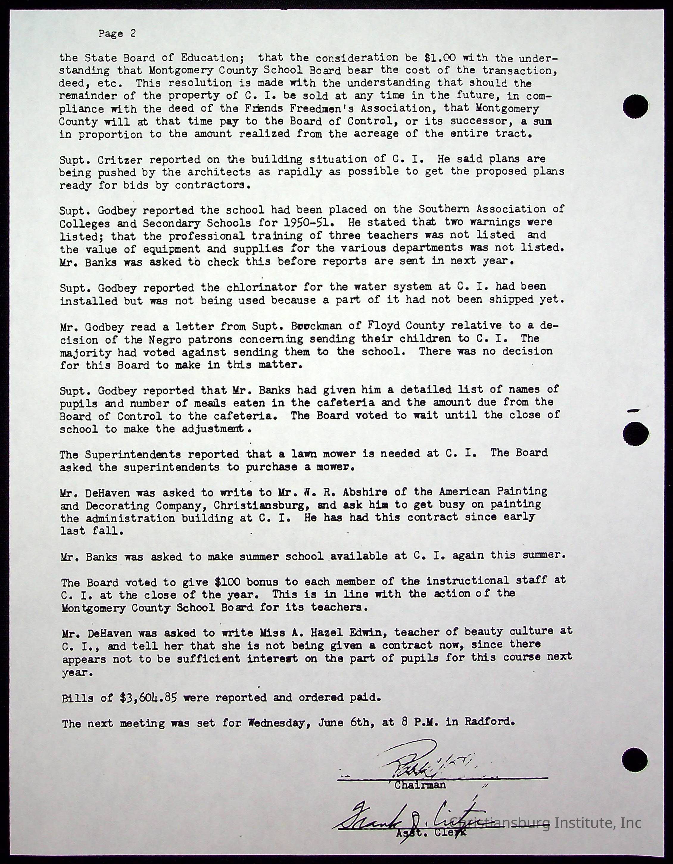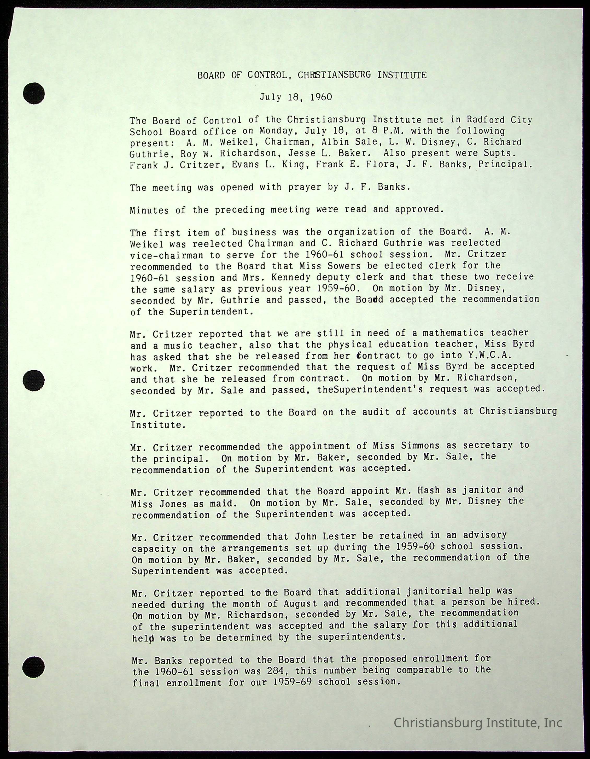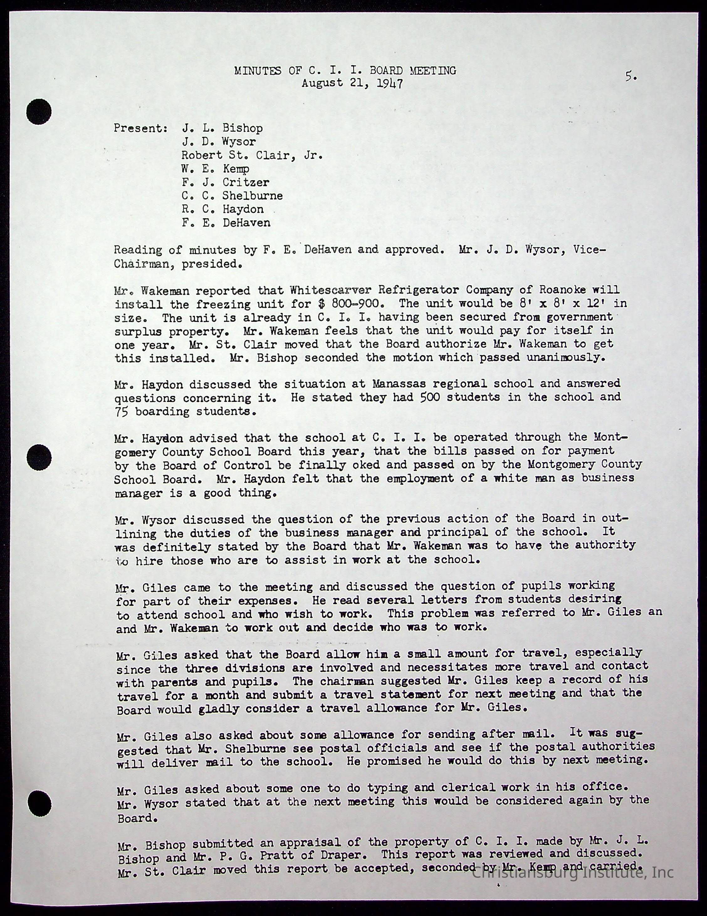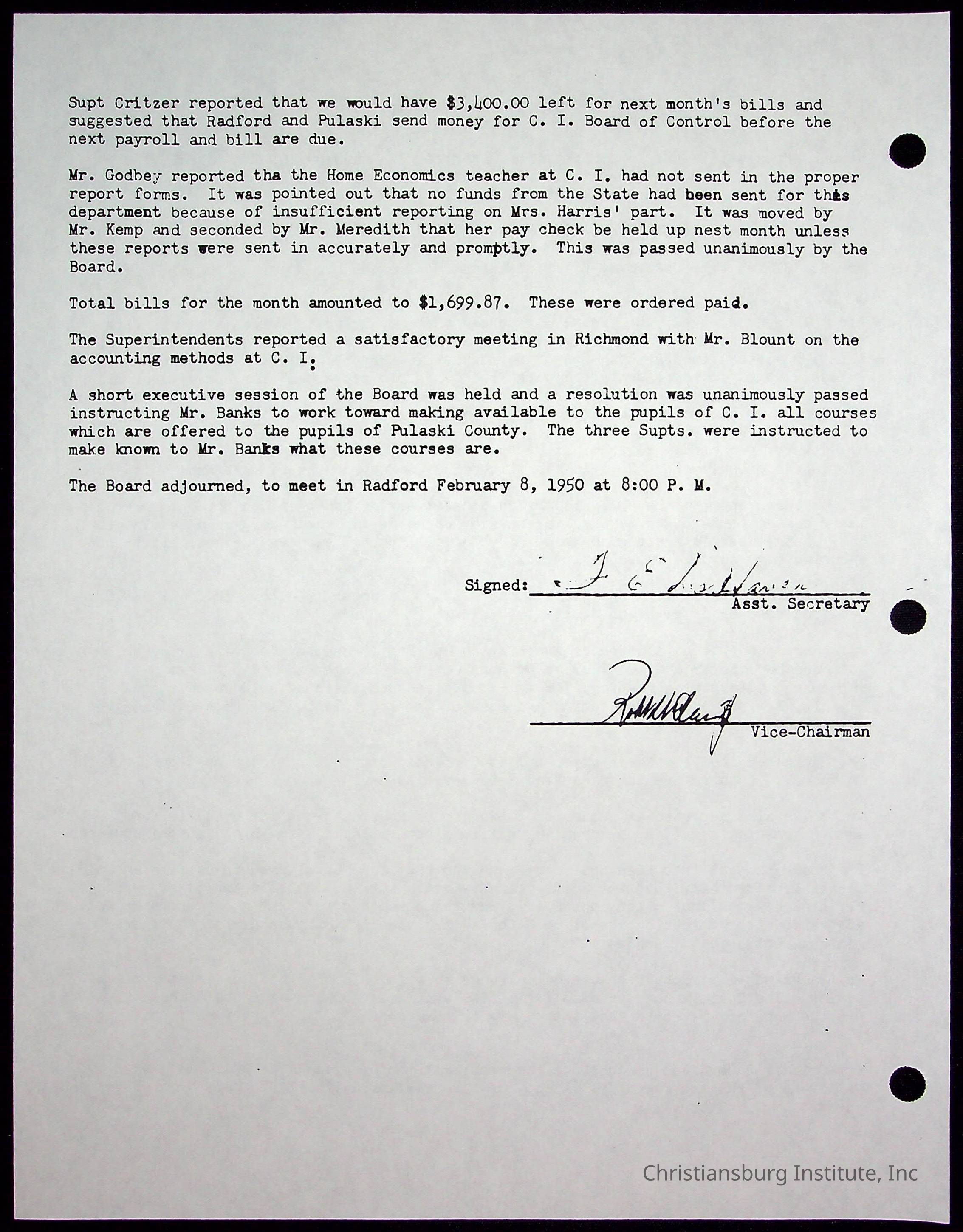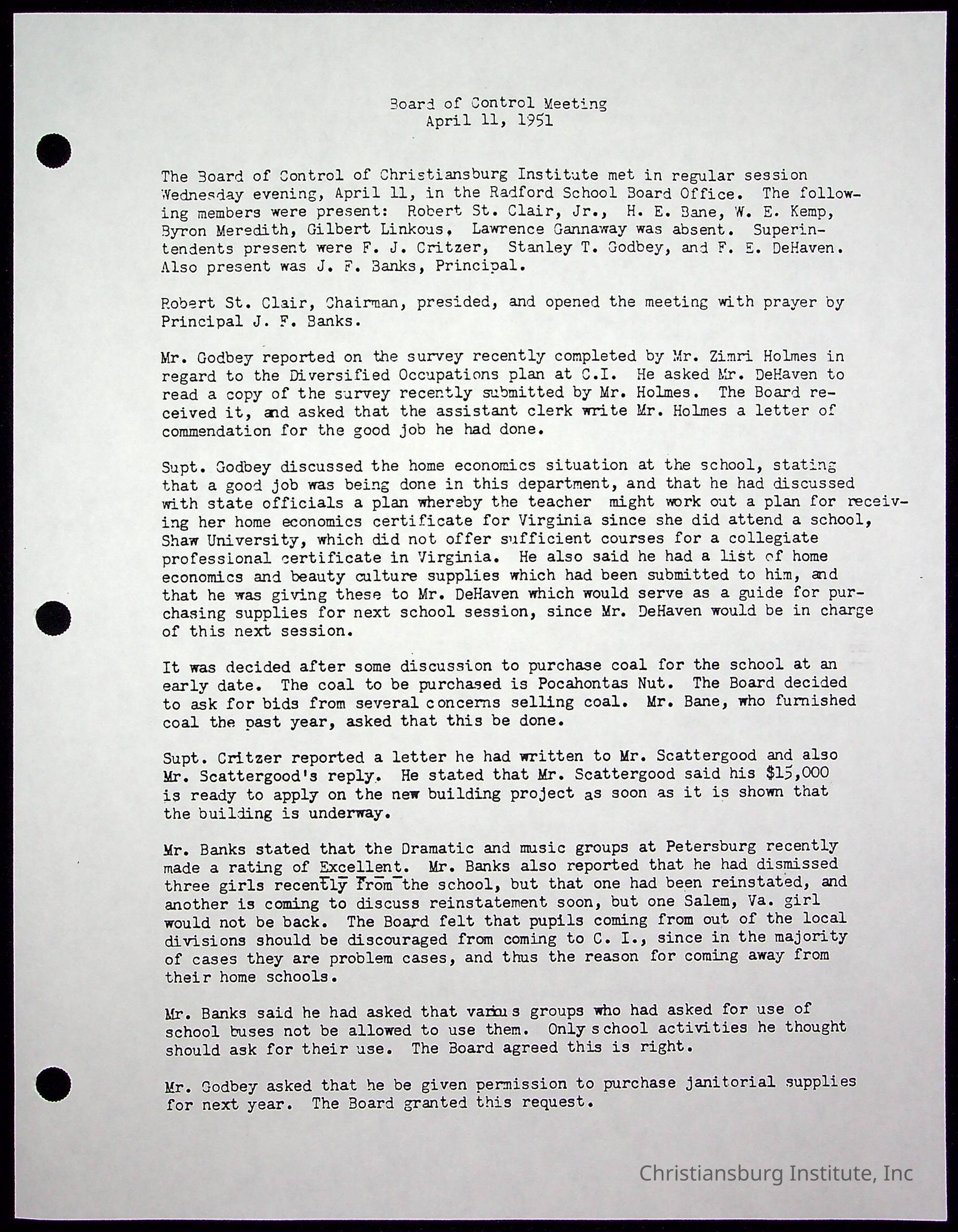 Christiansburg Industrial Institute Board Minutes, July 1947-August 1963 (photocopy)Description