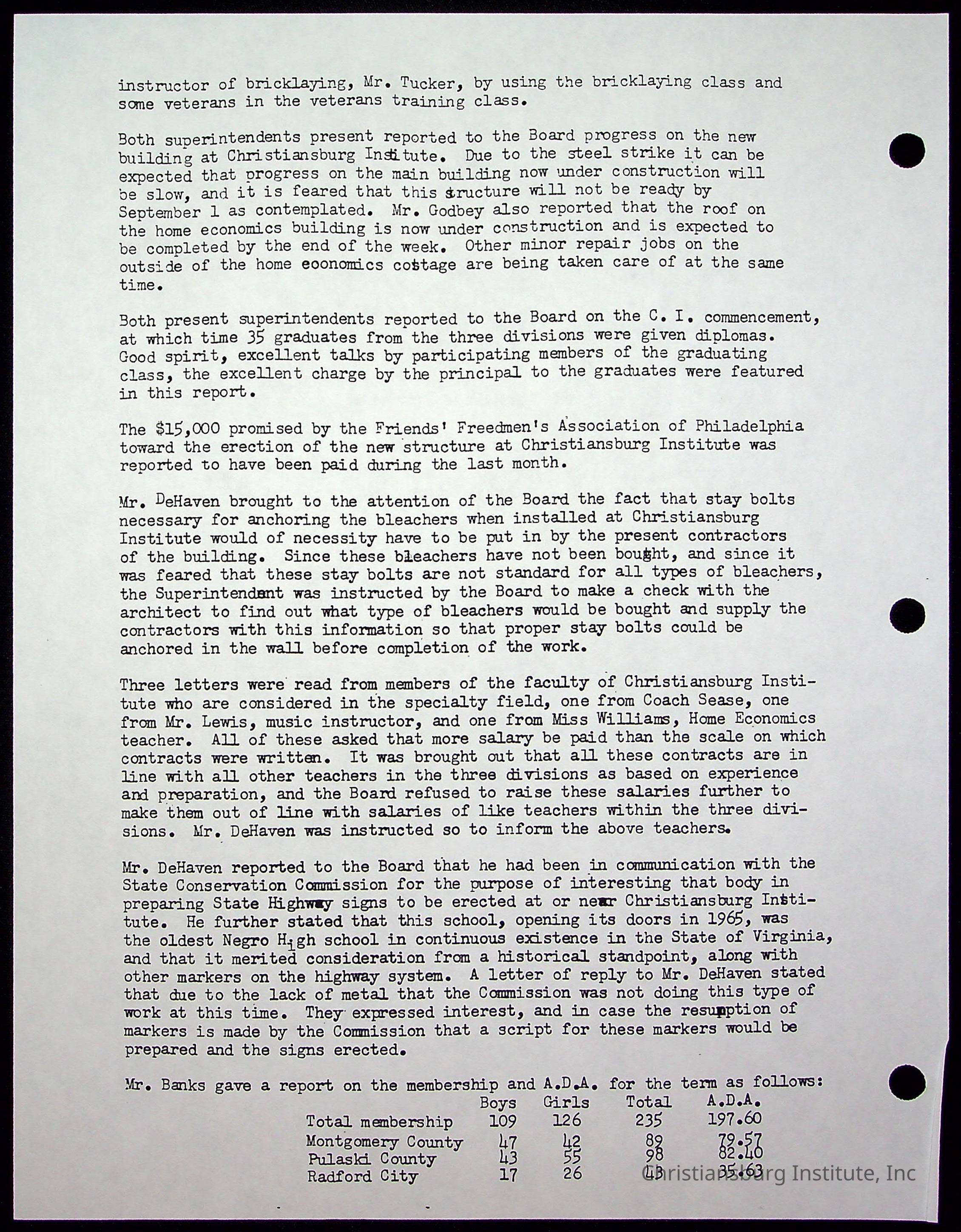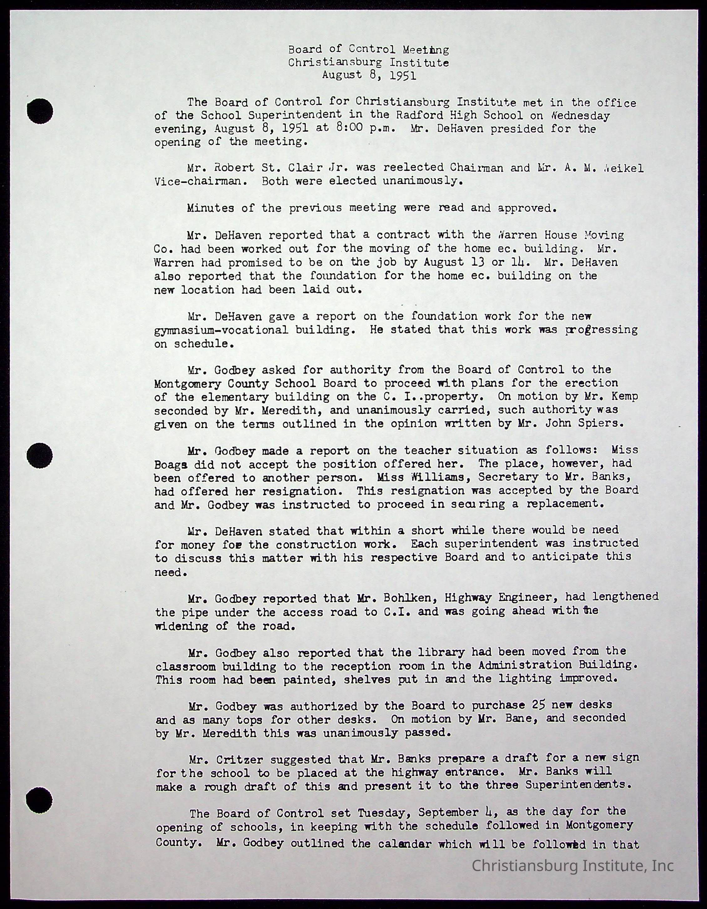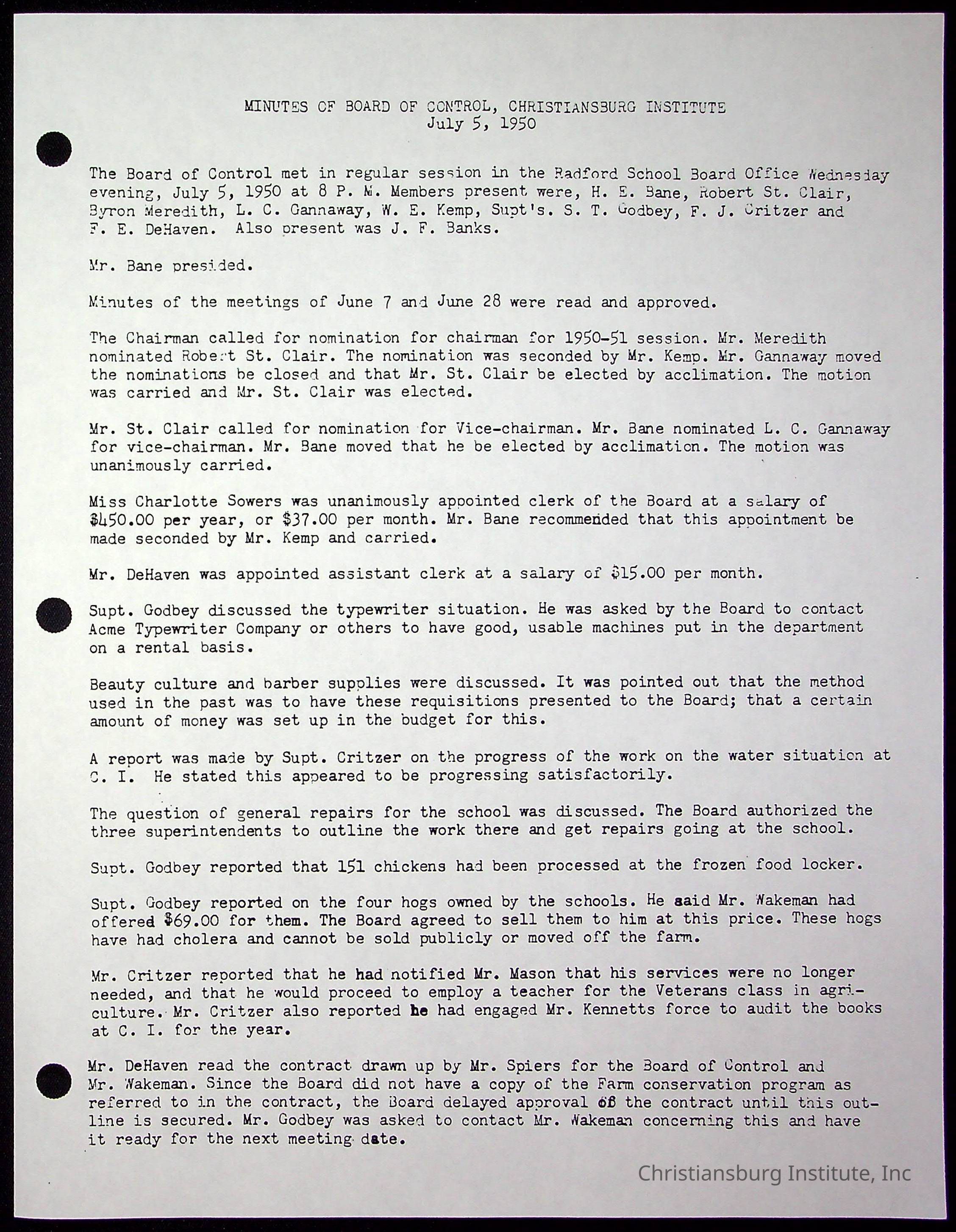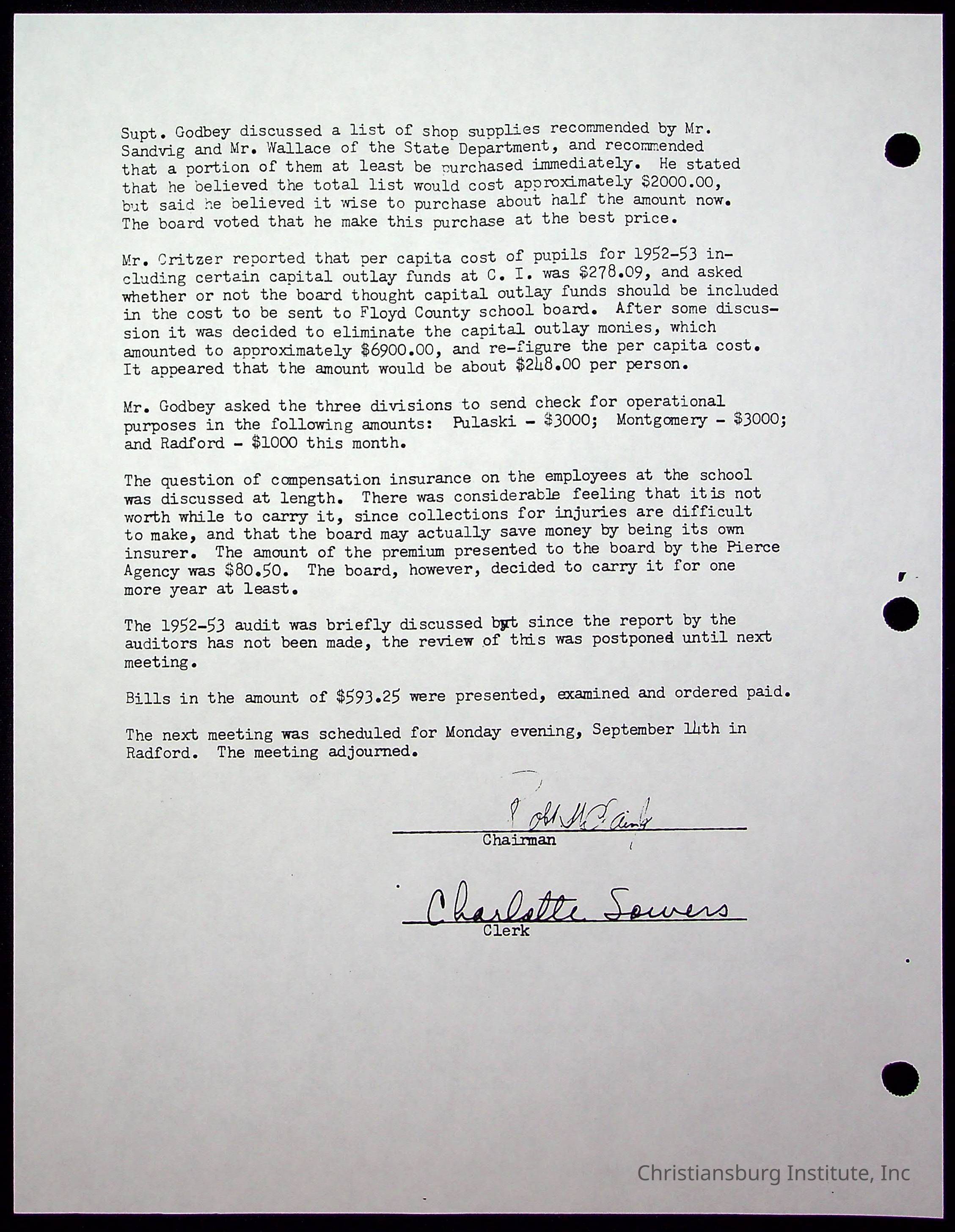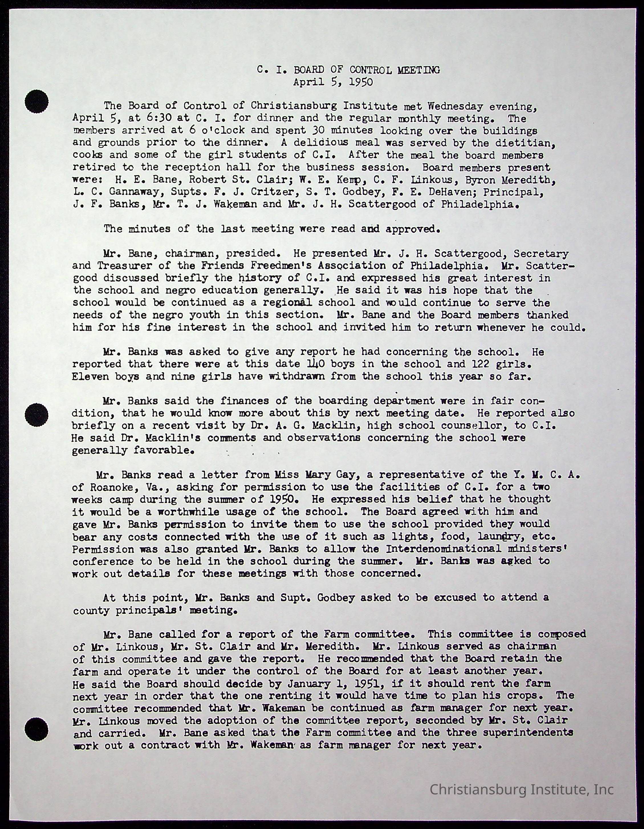 Christiansburg Industrial Institute Board Minutes, July 1947-August 1963 (photocopy)Description