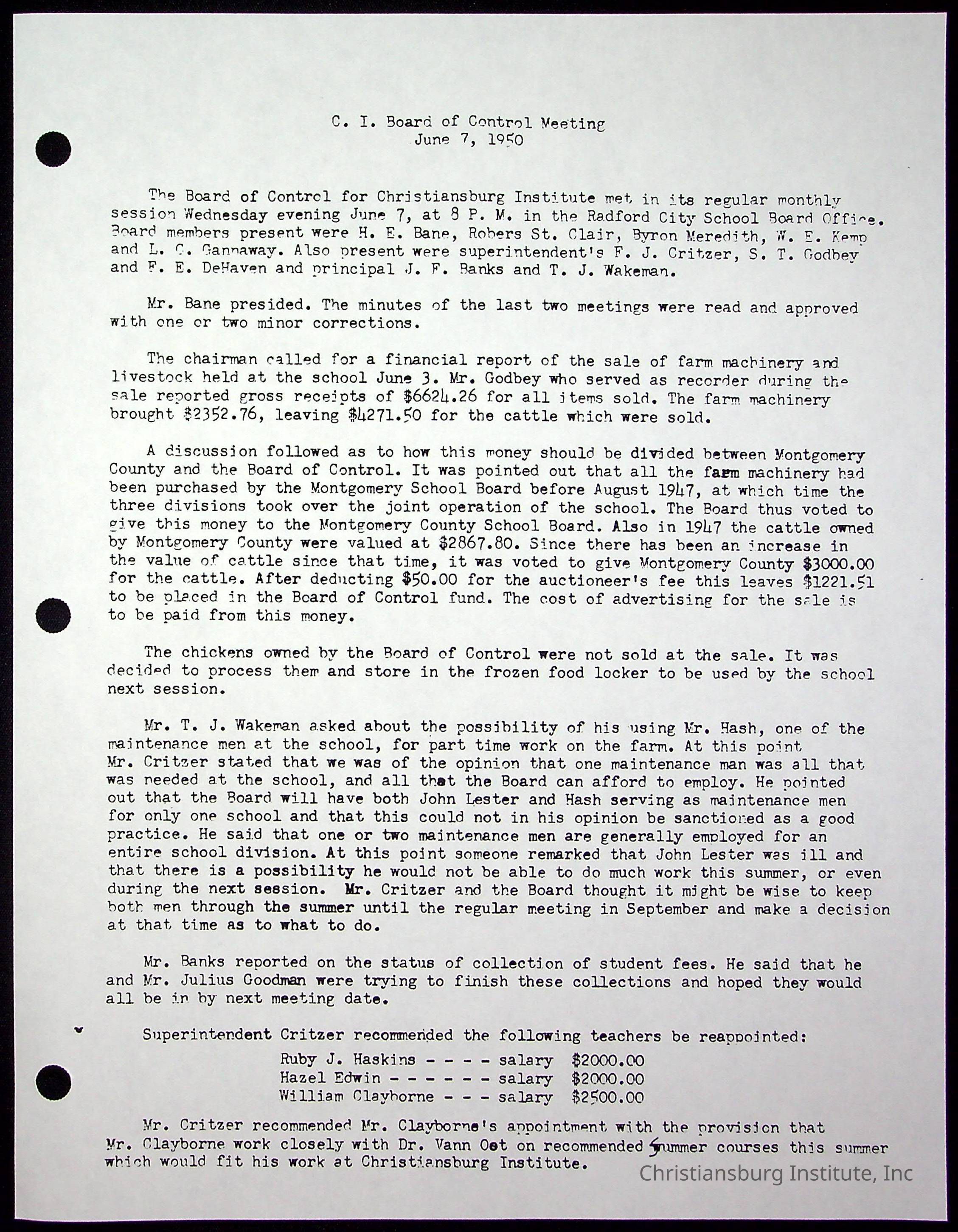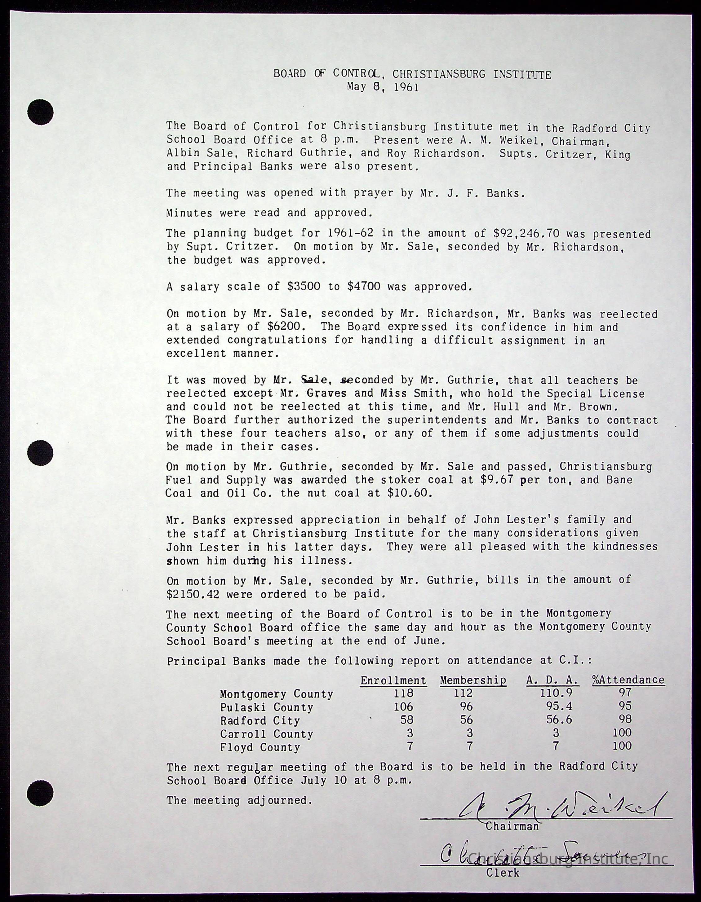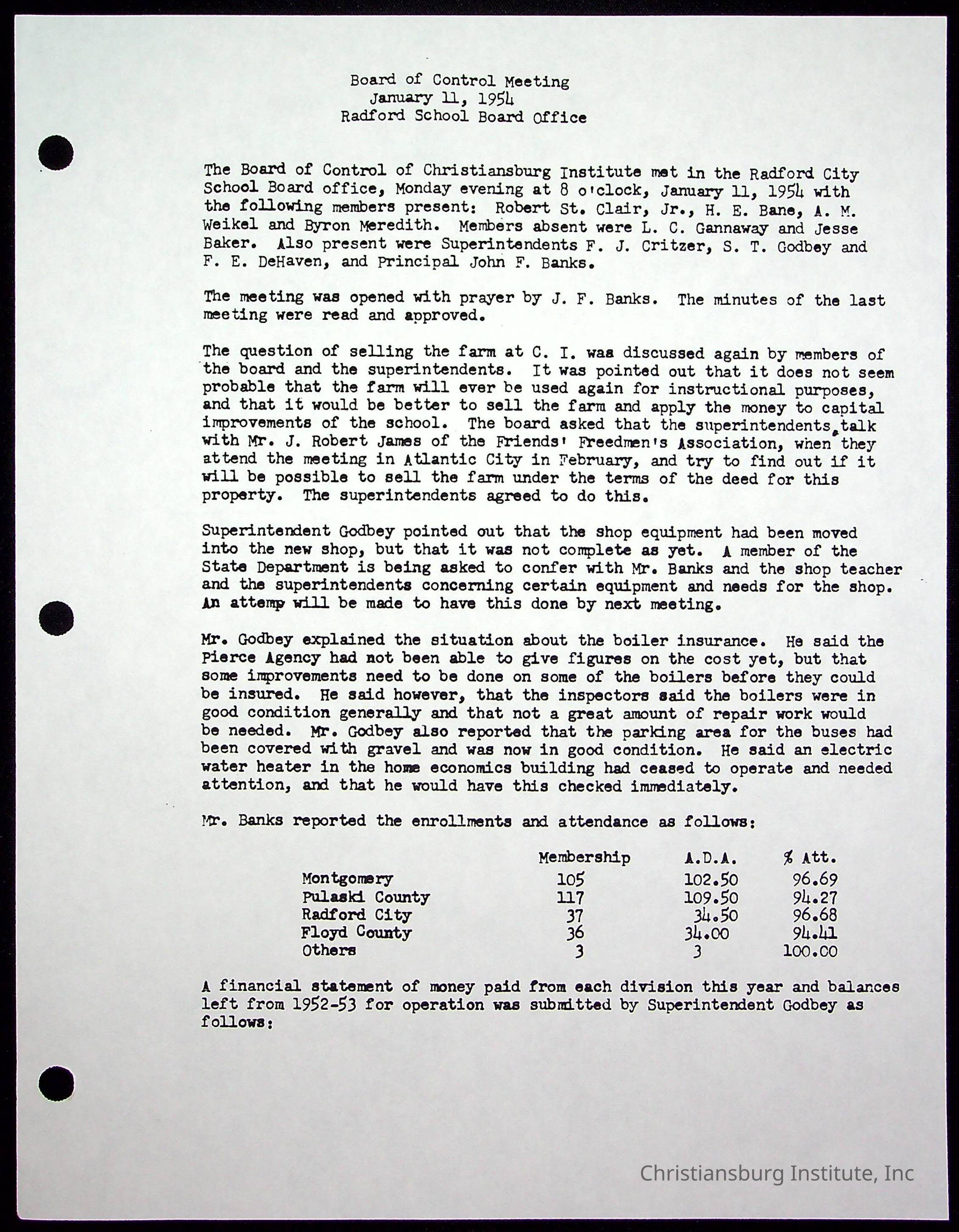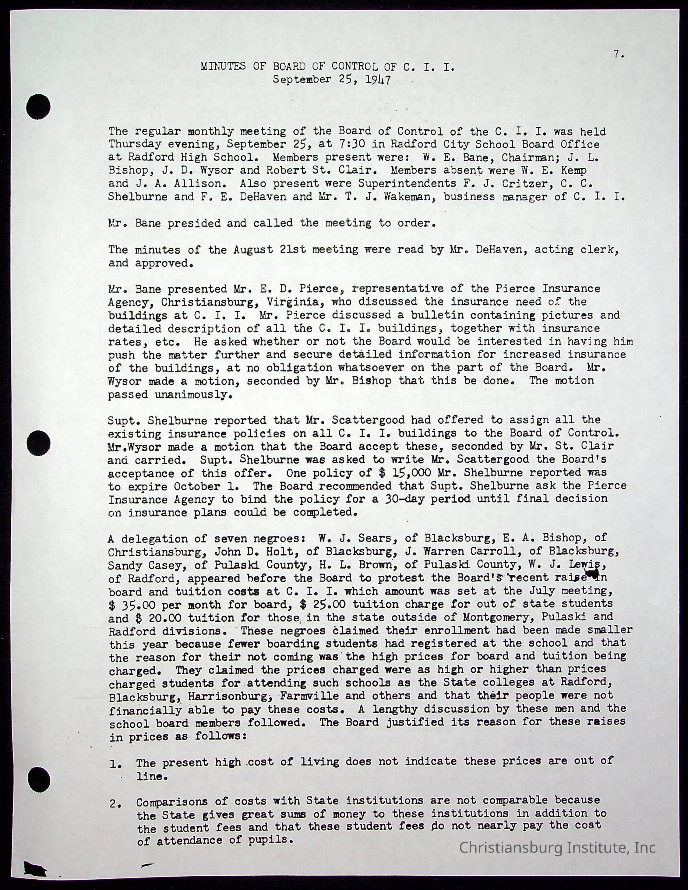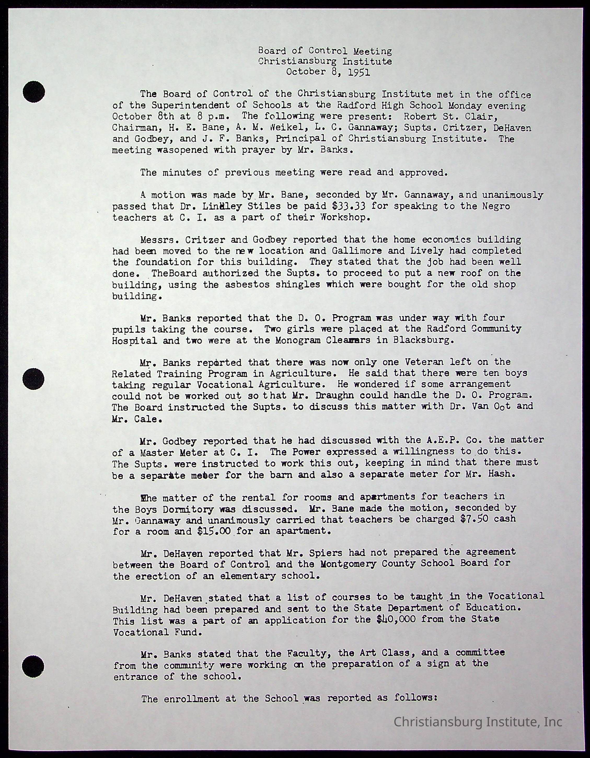 Christiansburg Industrial Institute Board Minutes, July 1947-August 1963 (photocopy)Description