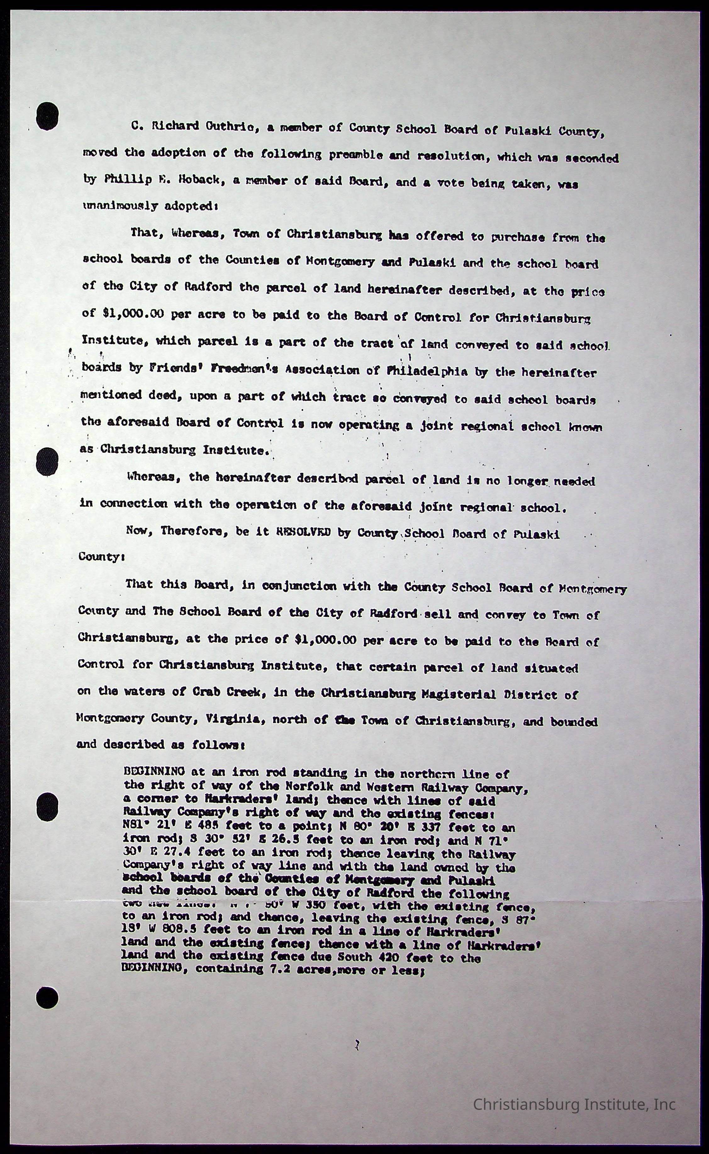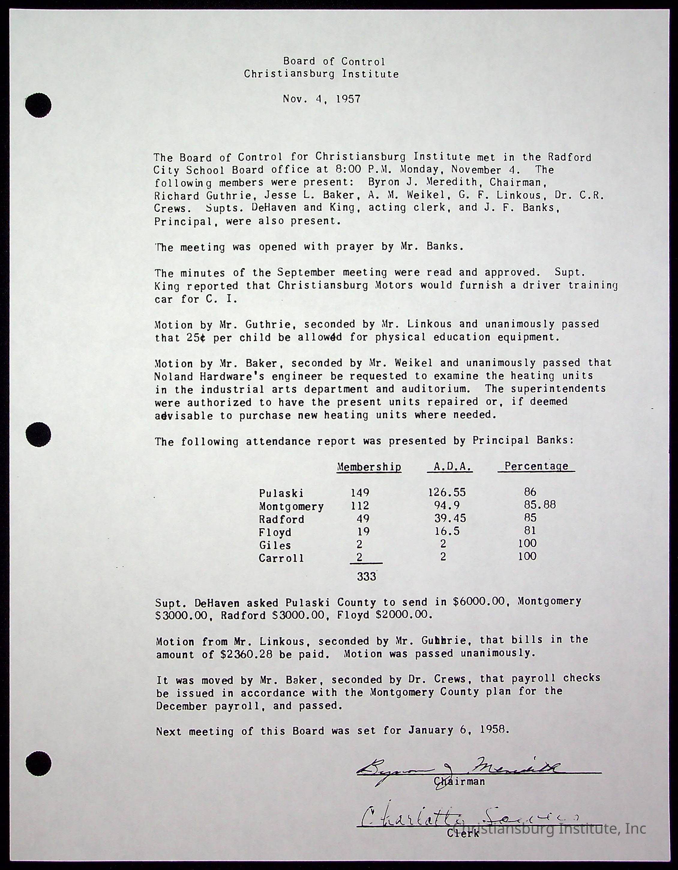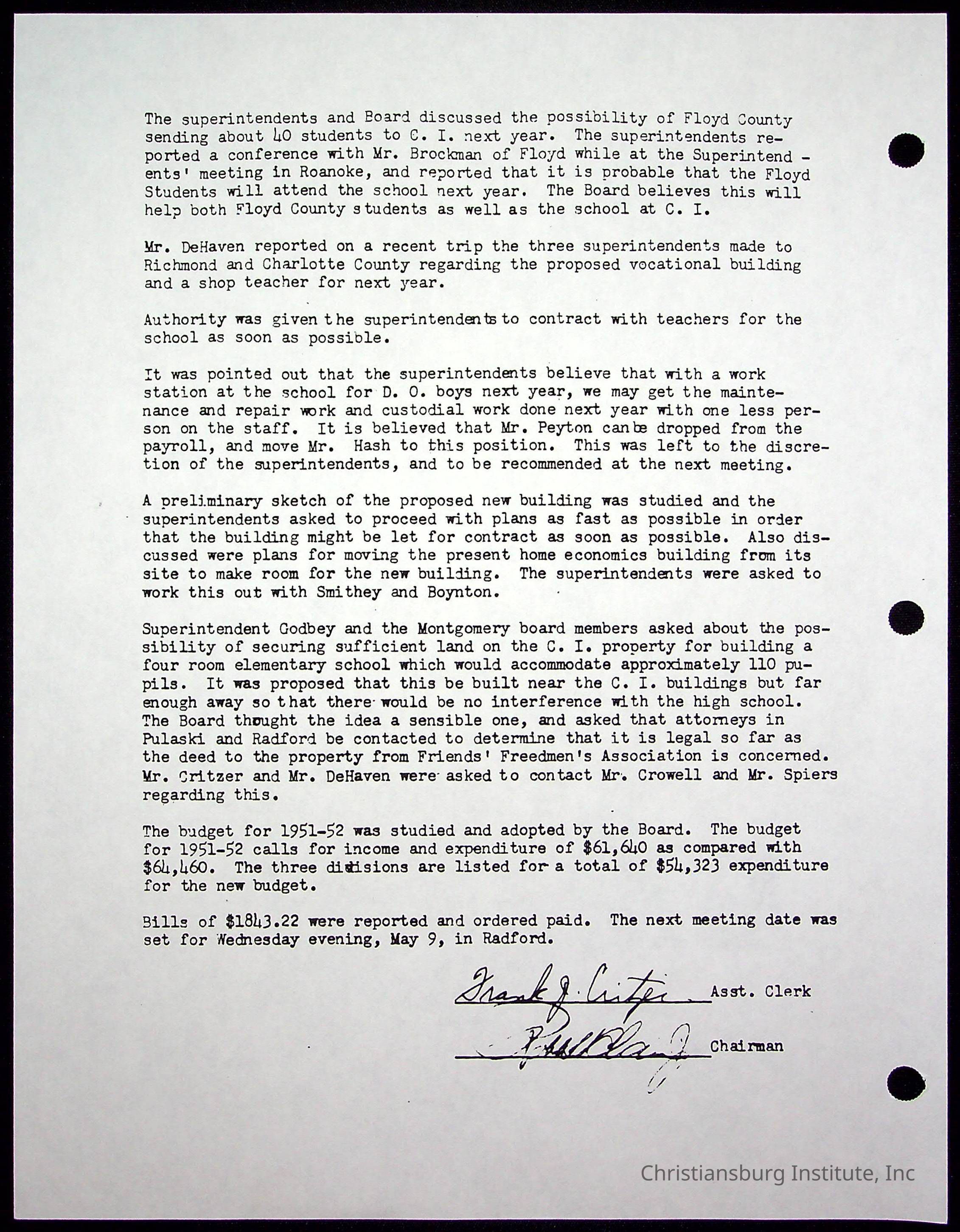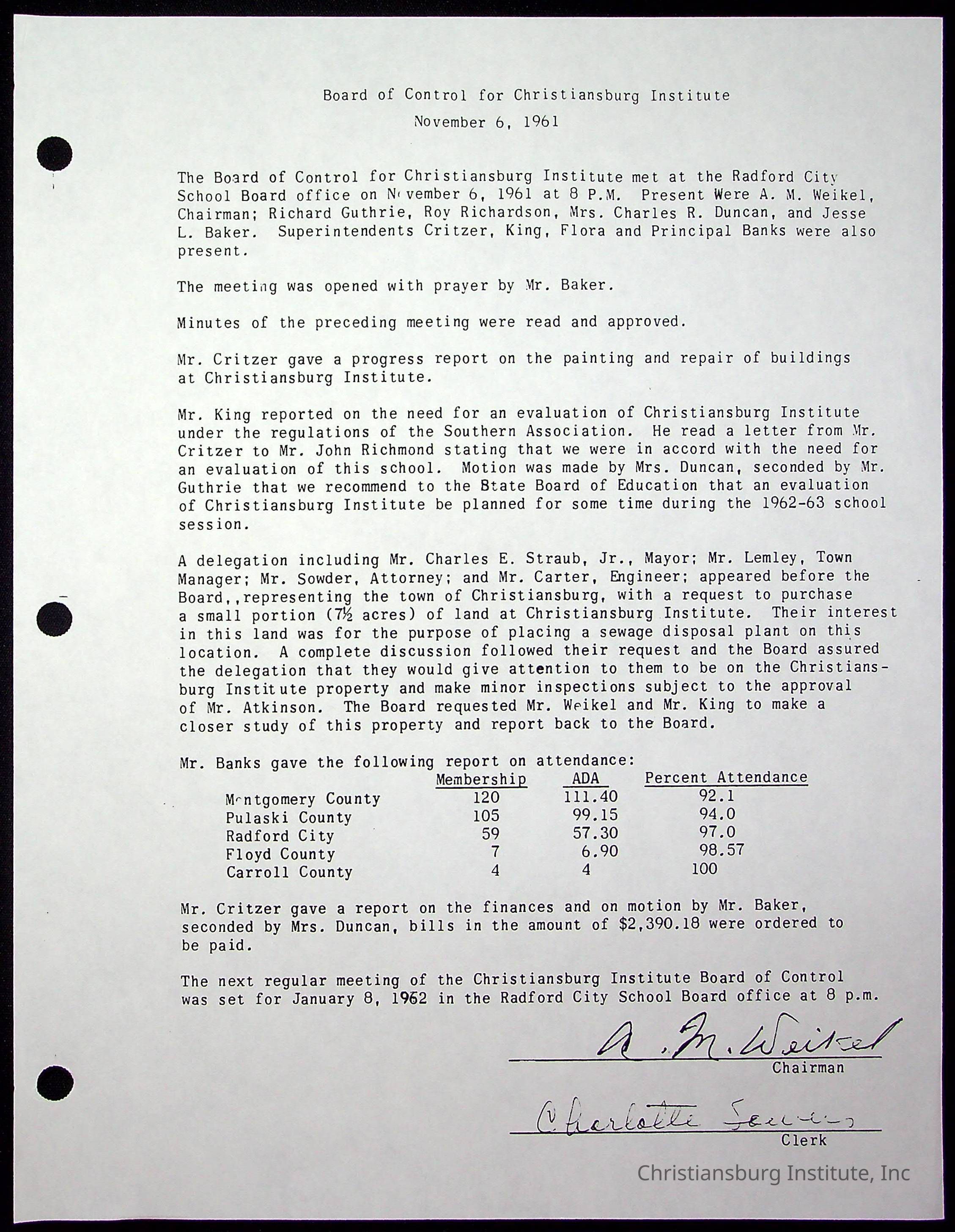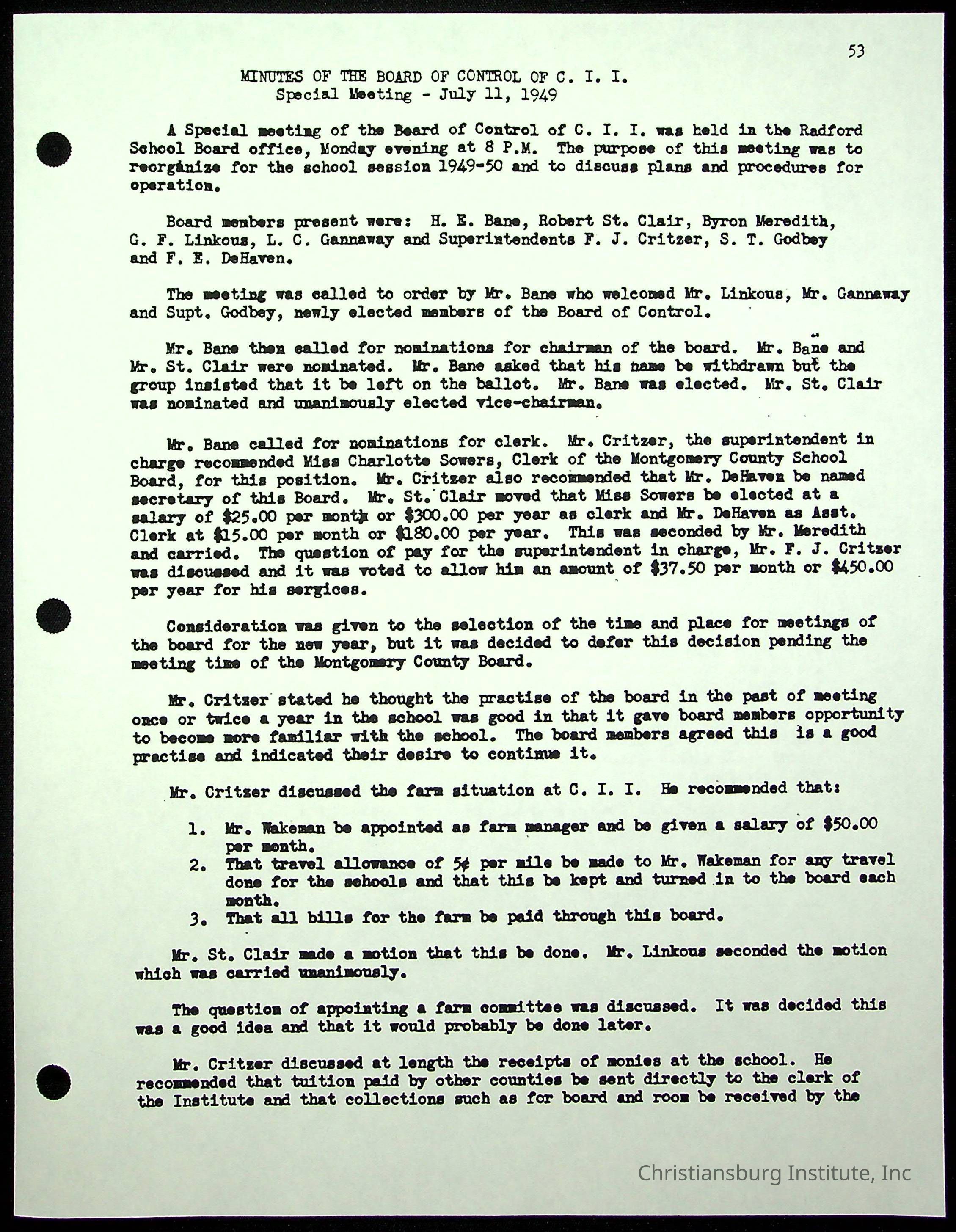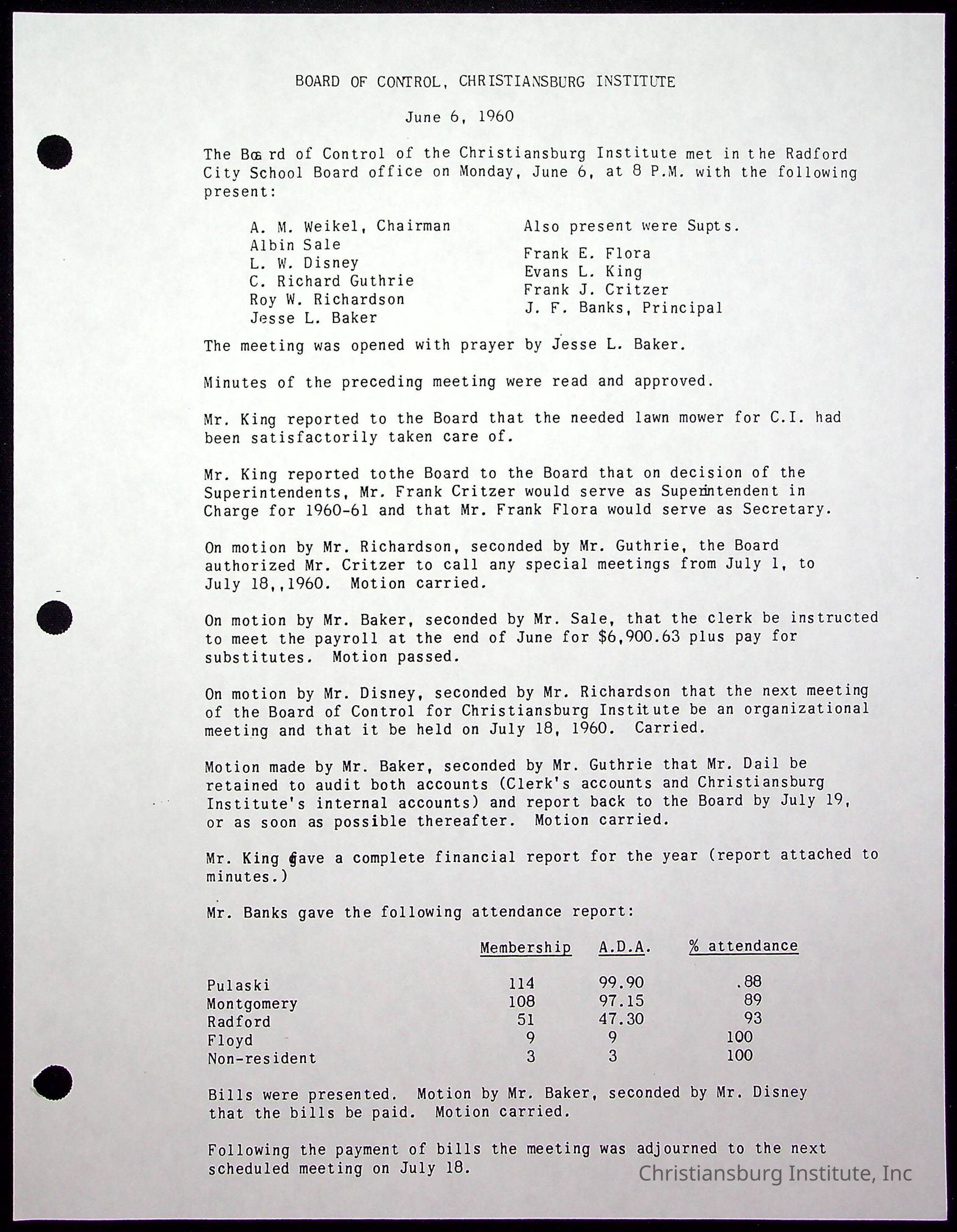 Christiansburg Industrial Institute Board Minutes, July 1947-August 1963 (photocopy)Description