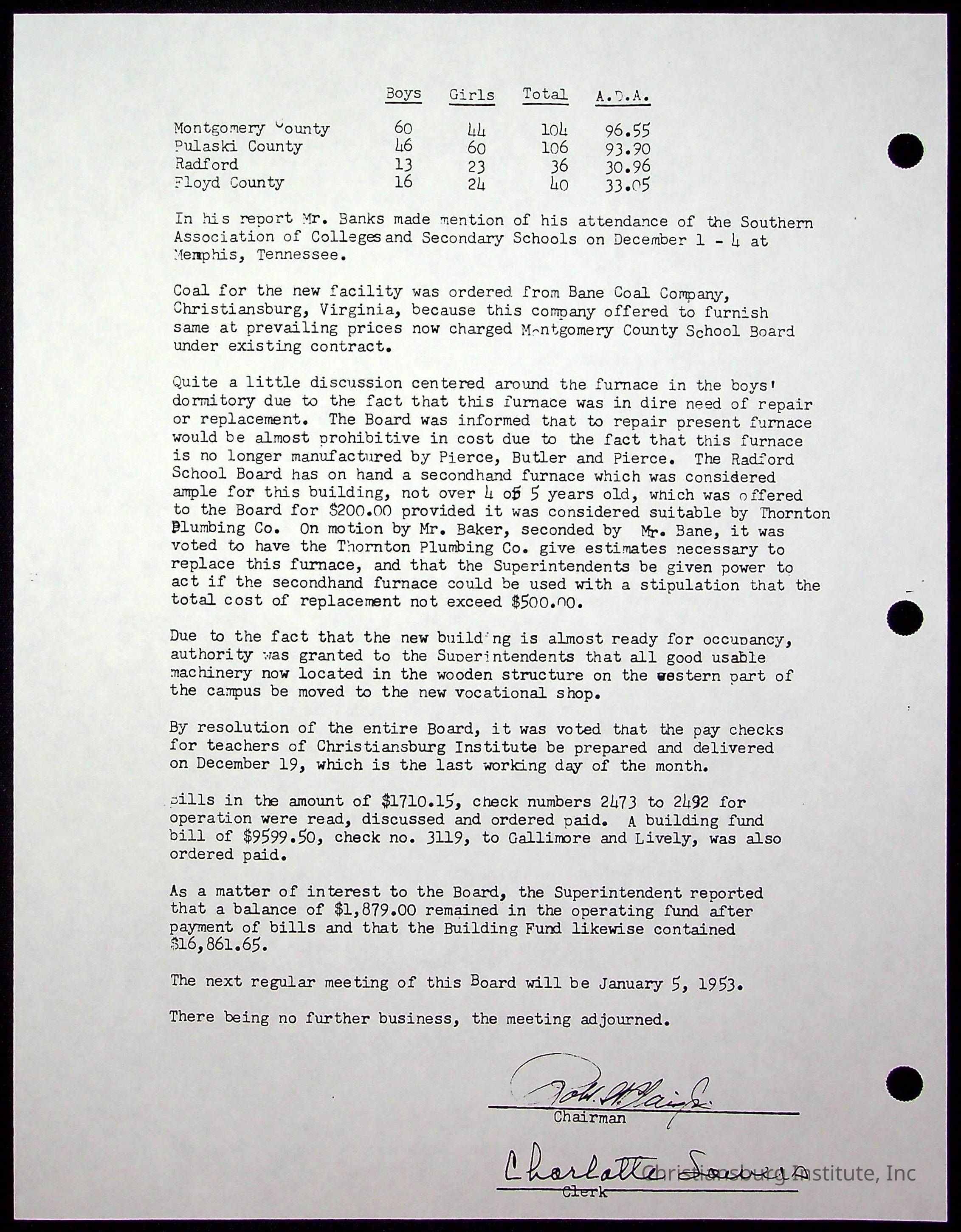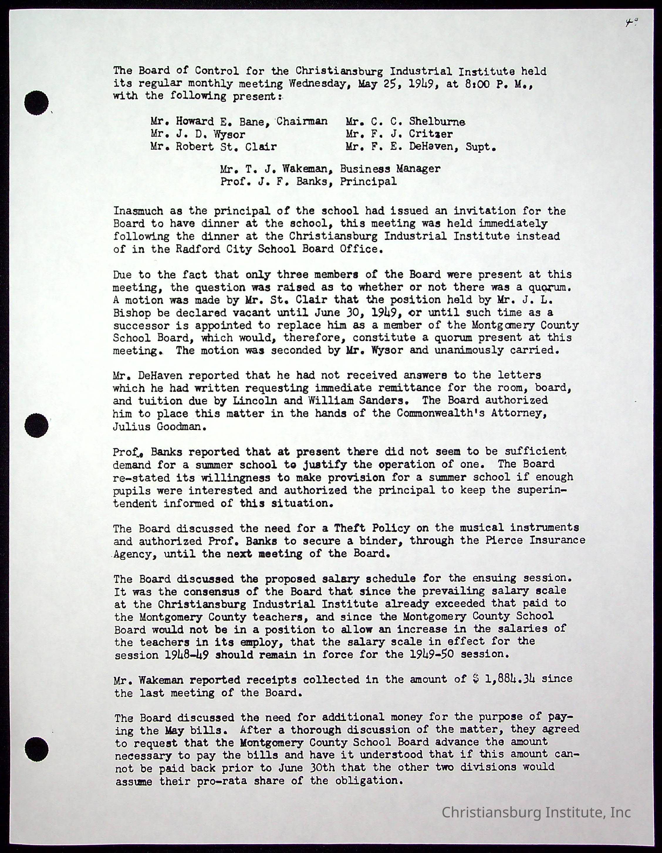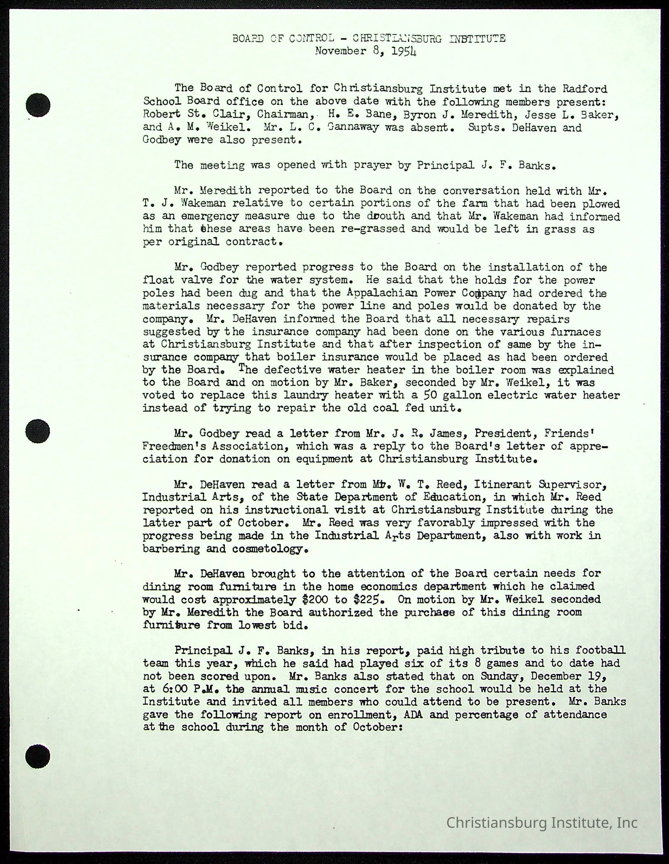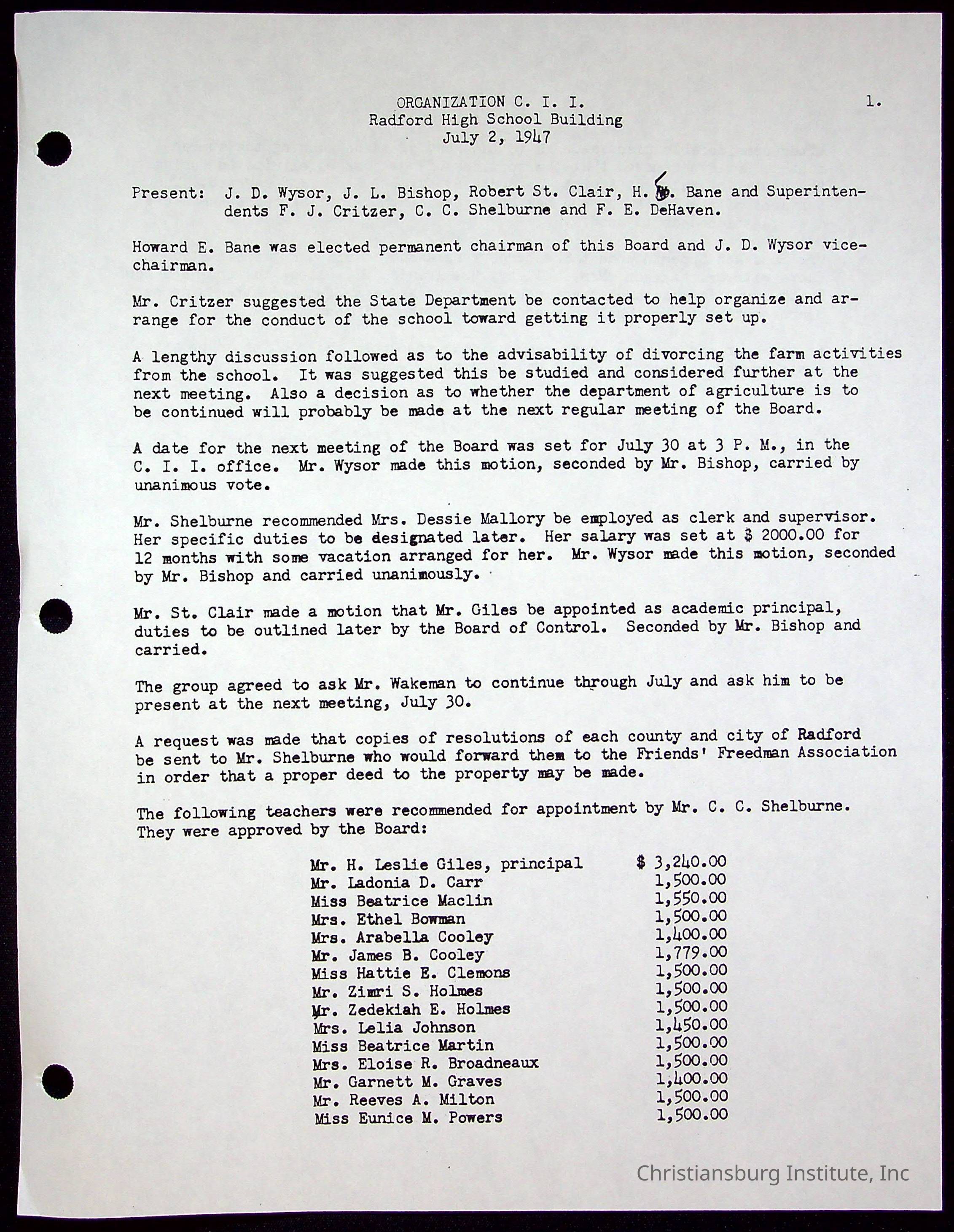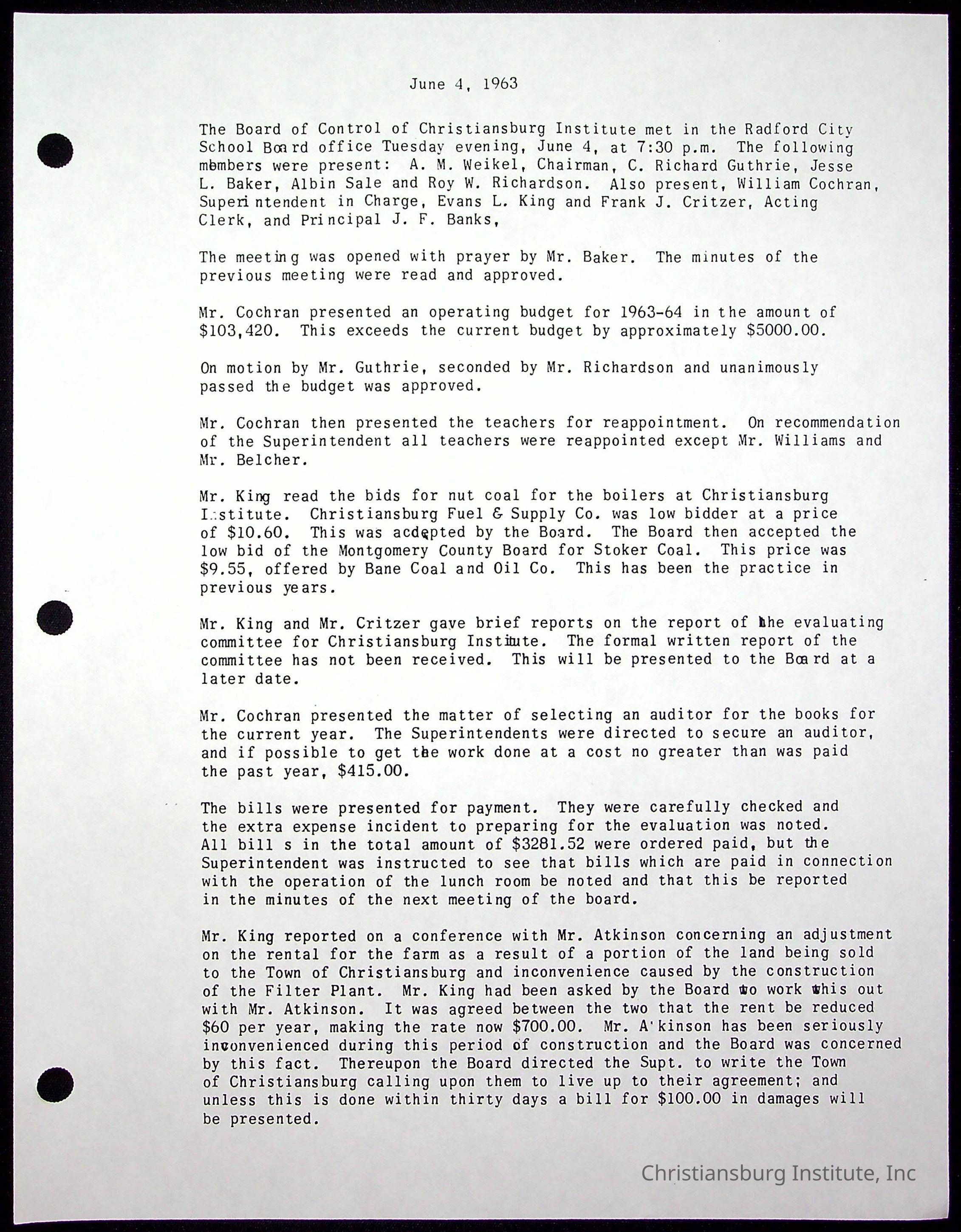 Christiansburg Industrial Institute Board Minutes, July 1947-August 1963 (photocopy)Description