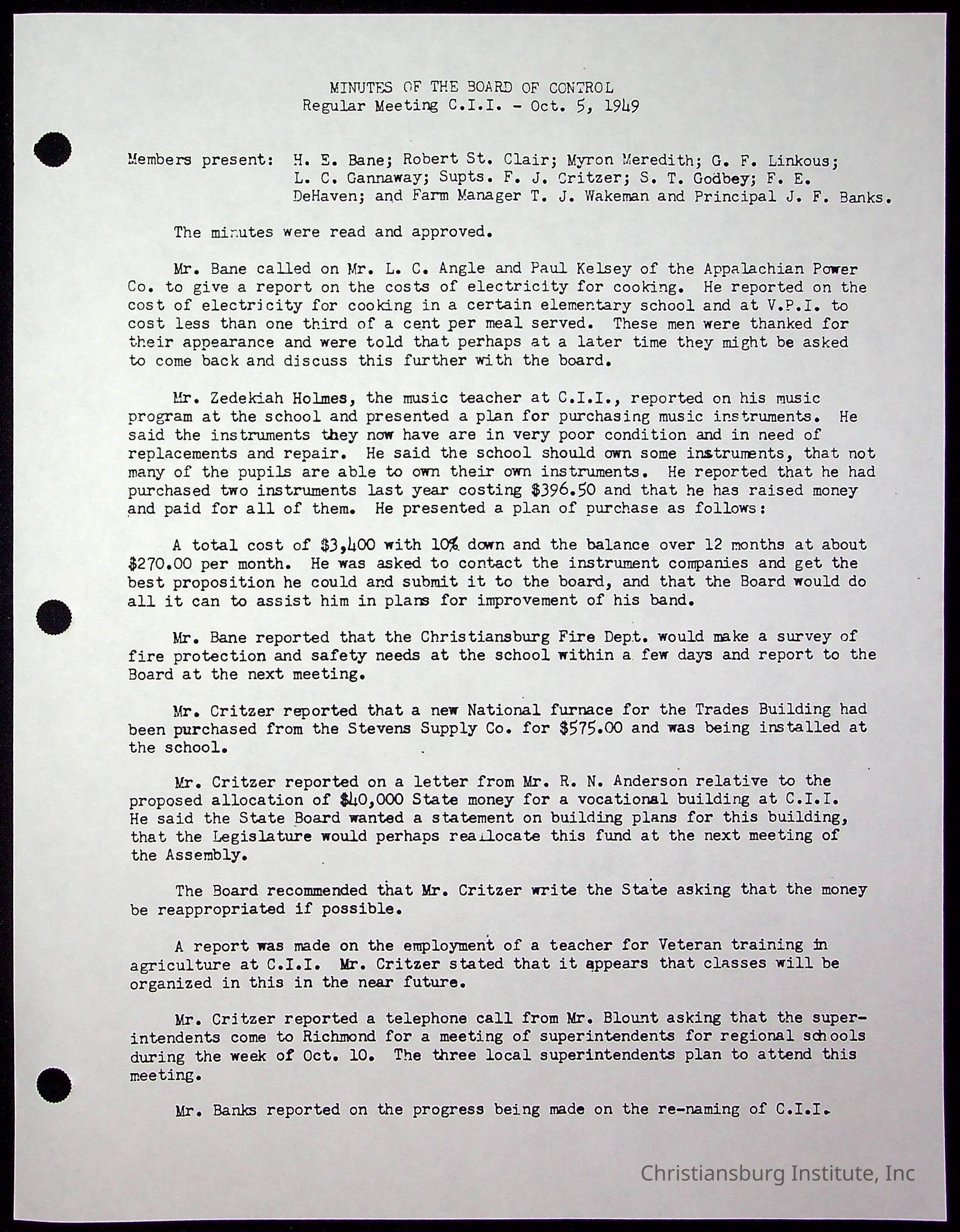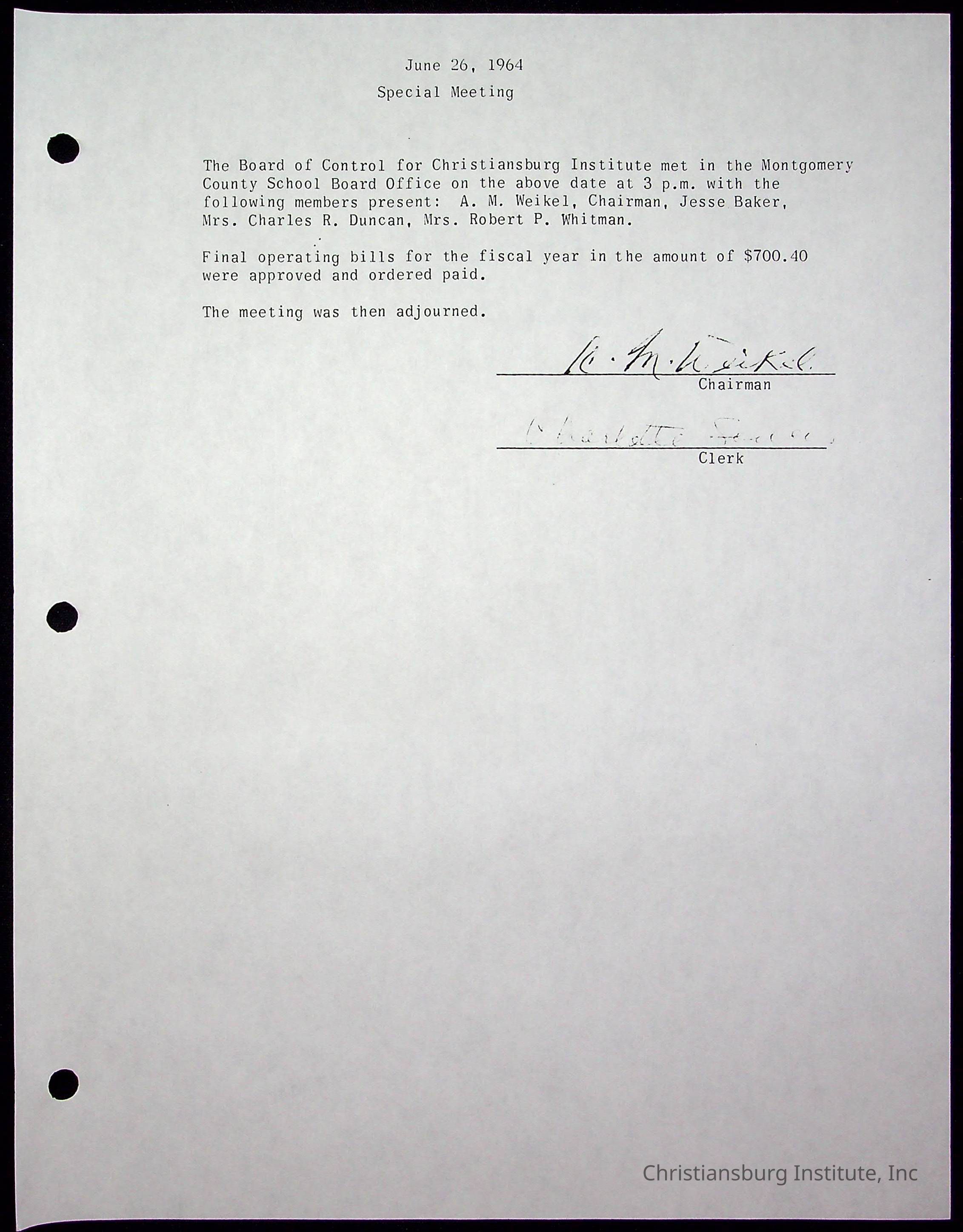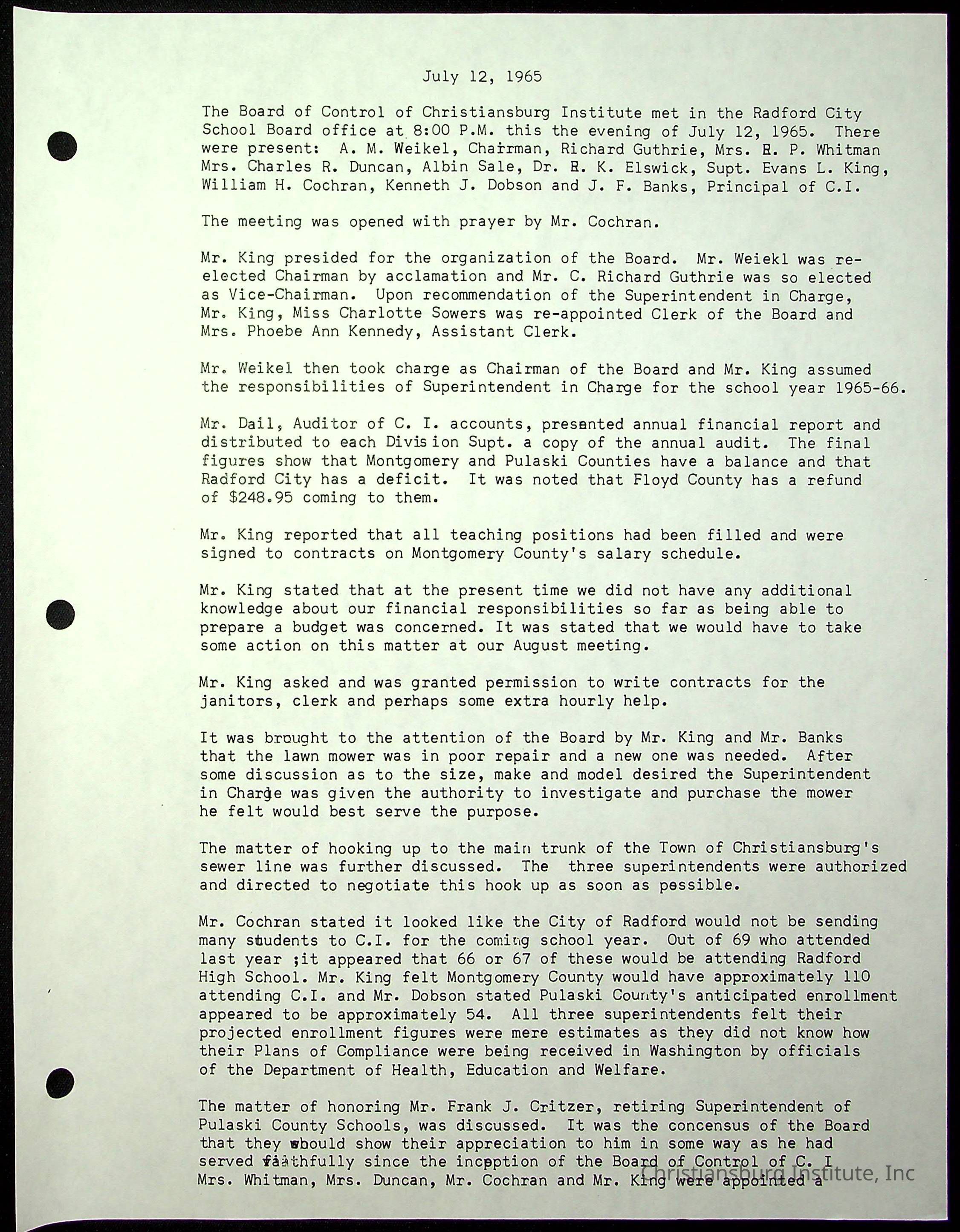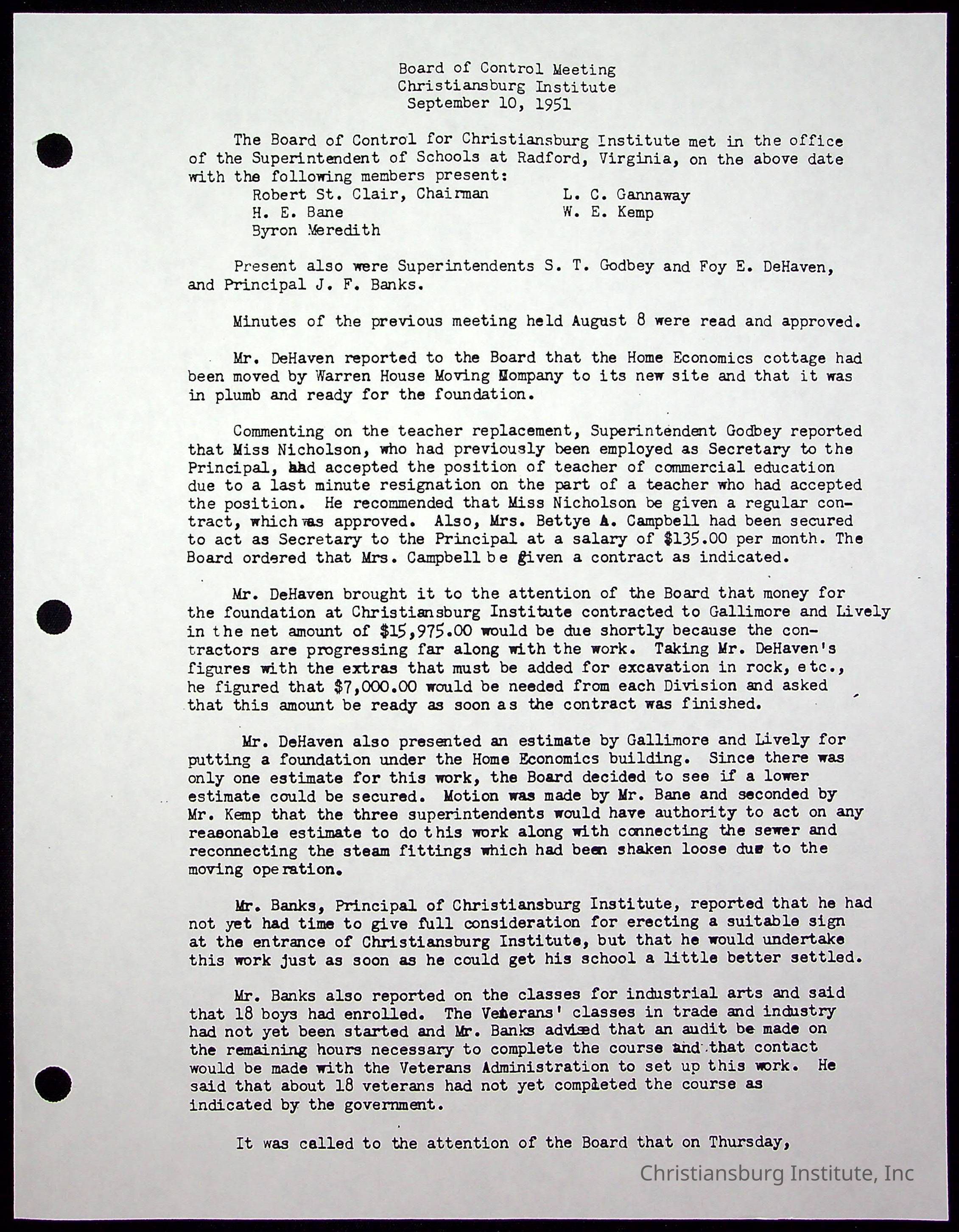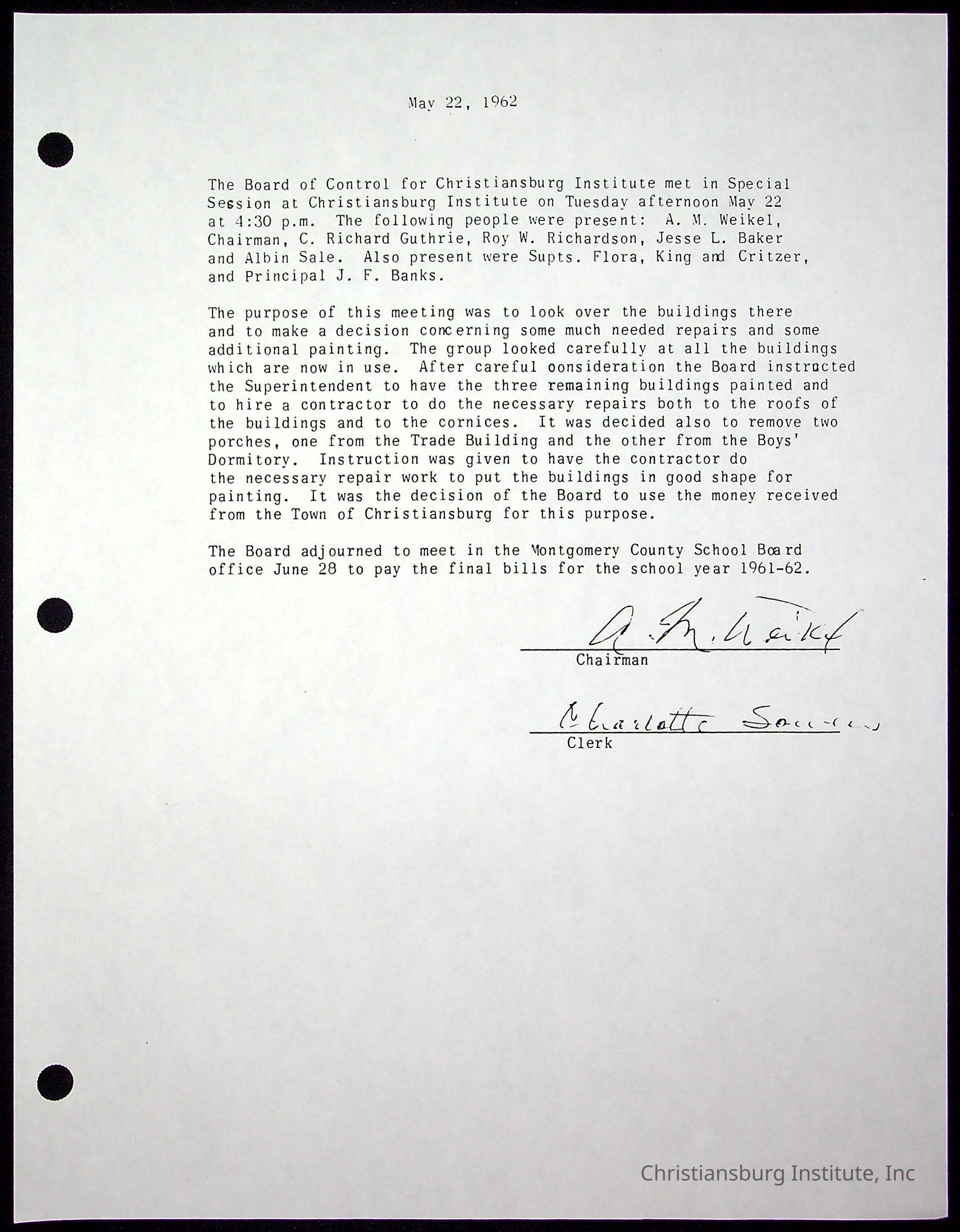 Christiansburg Industrial Institute Board Minutes, July 1947-August 1963 (photocopy)Description