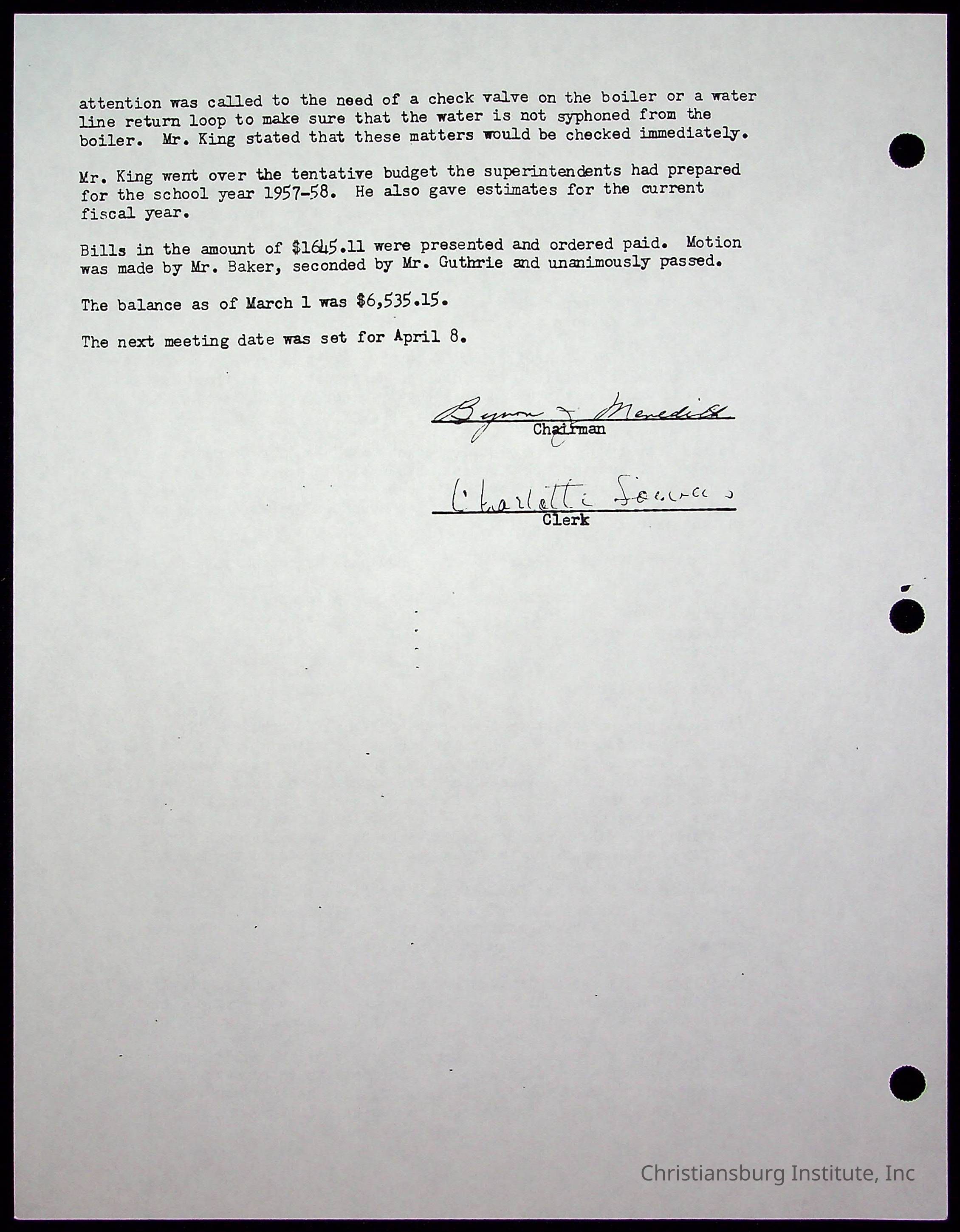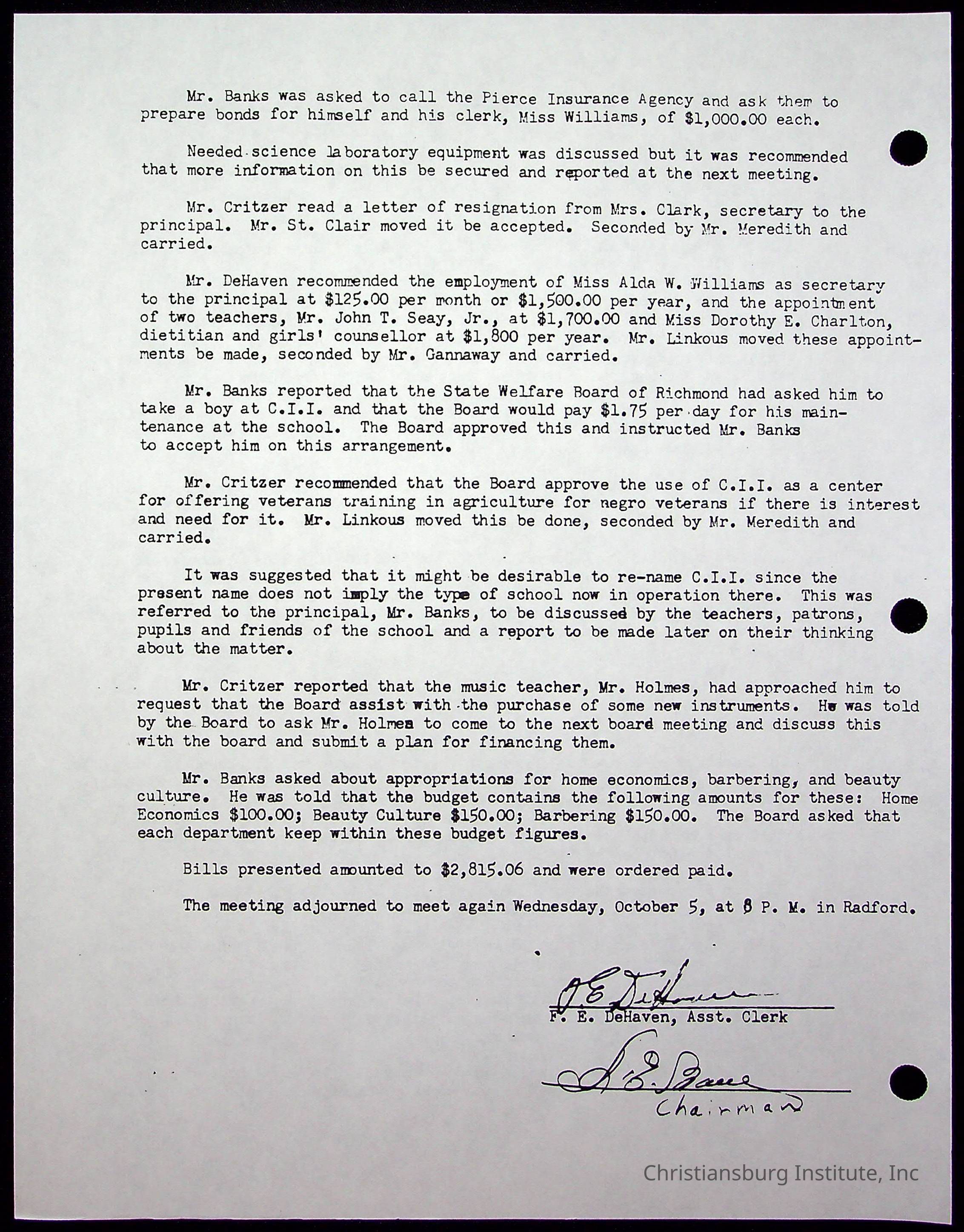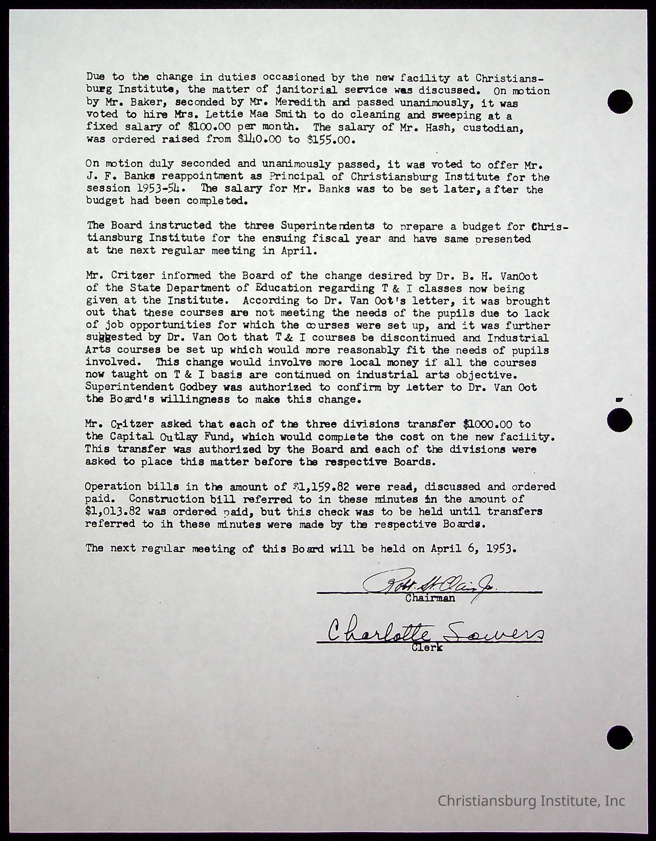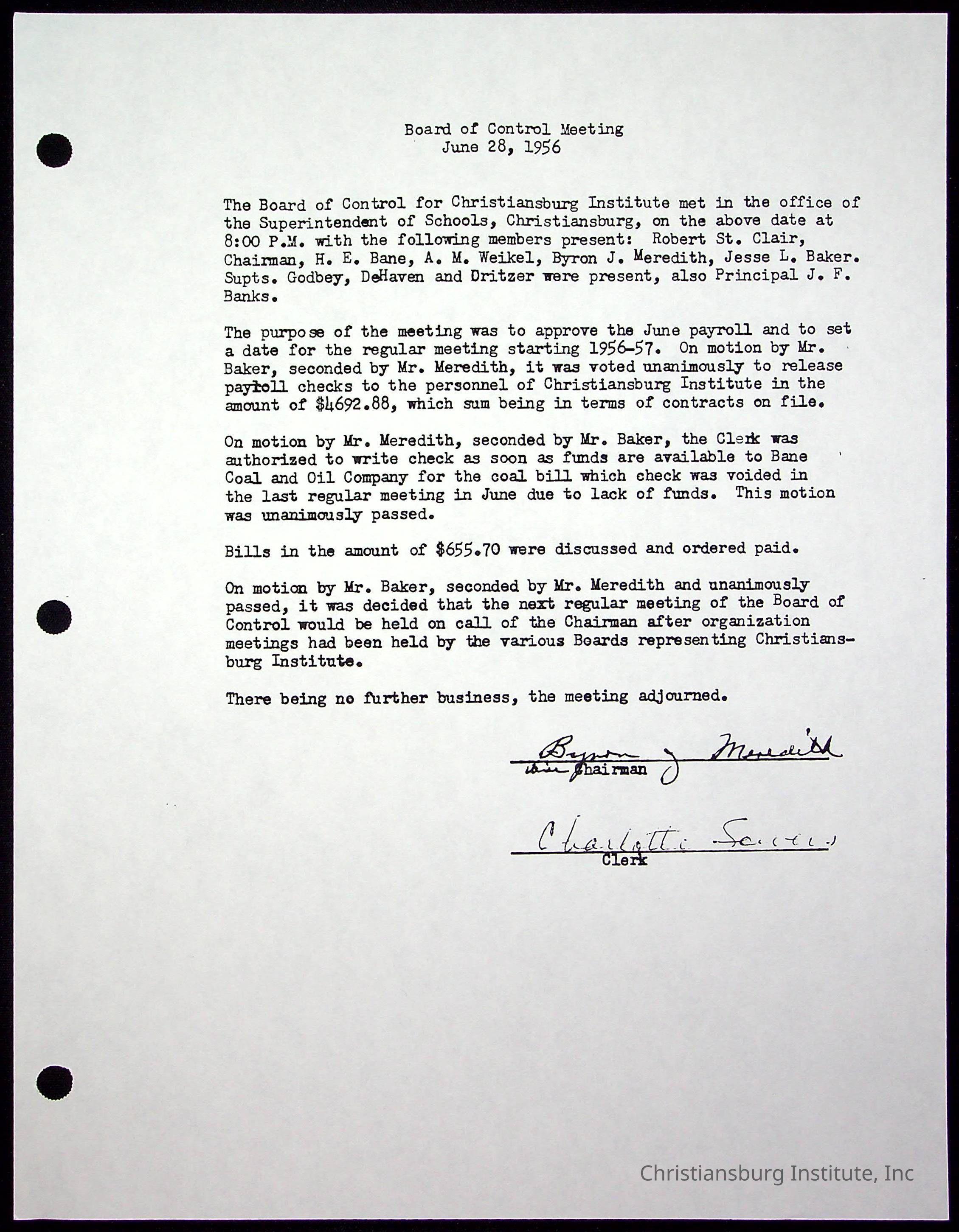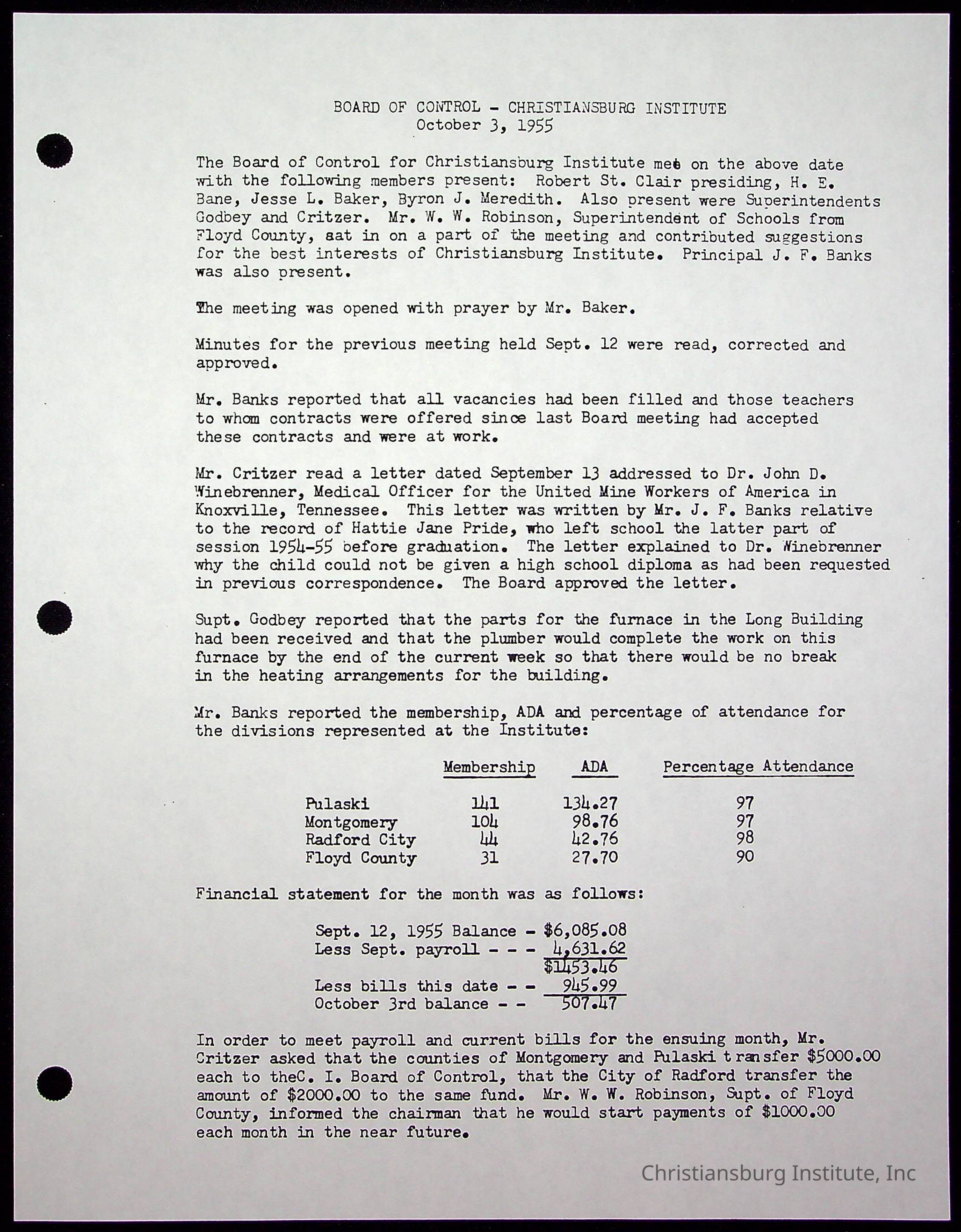 Christiansburg Industrial Institute Board Minutes, July 1947-August 1963 (photocopy)Description