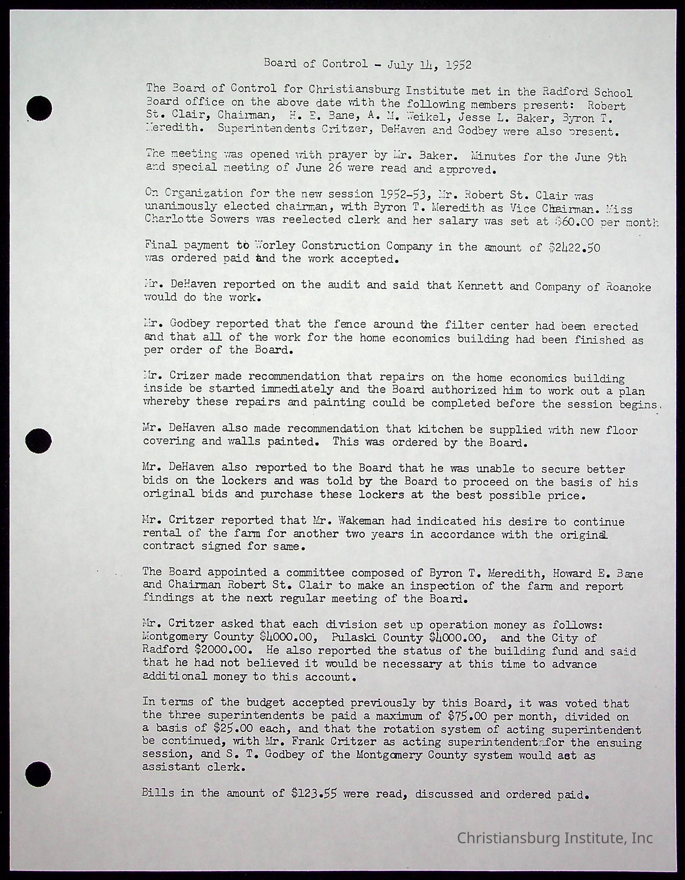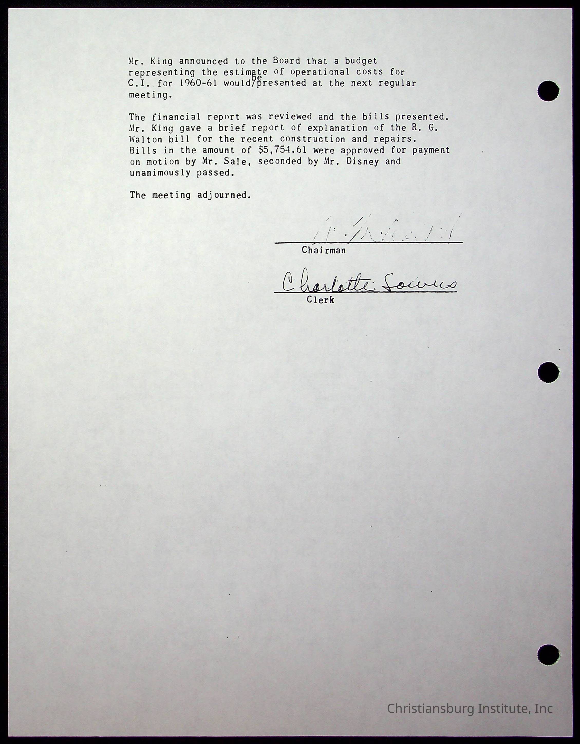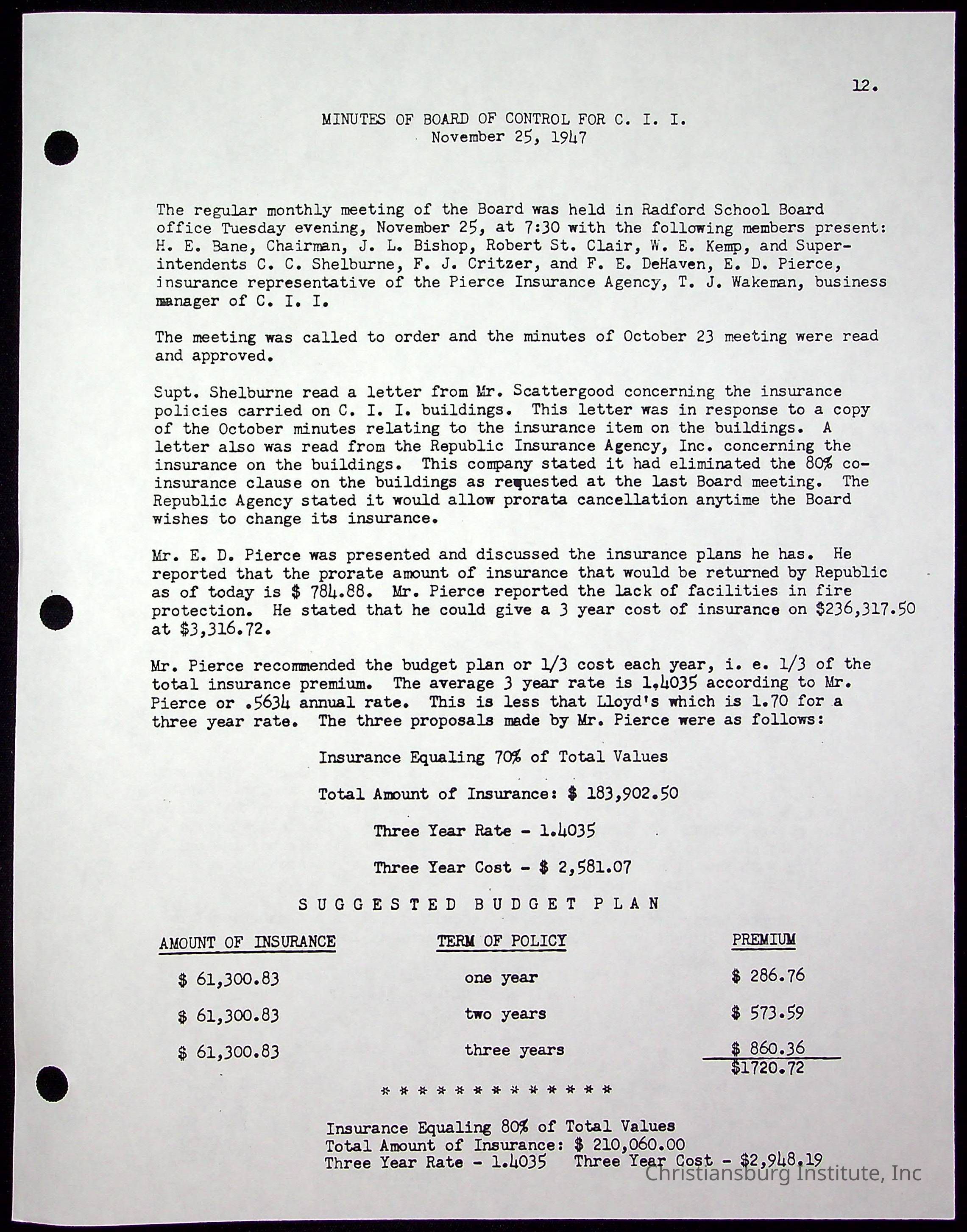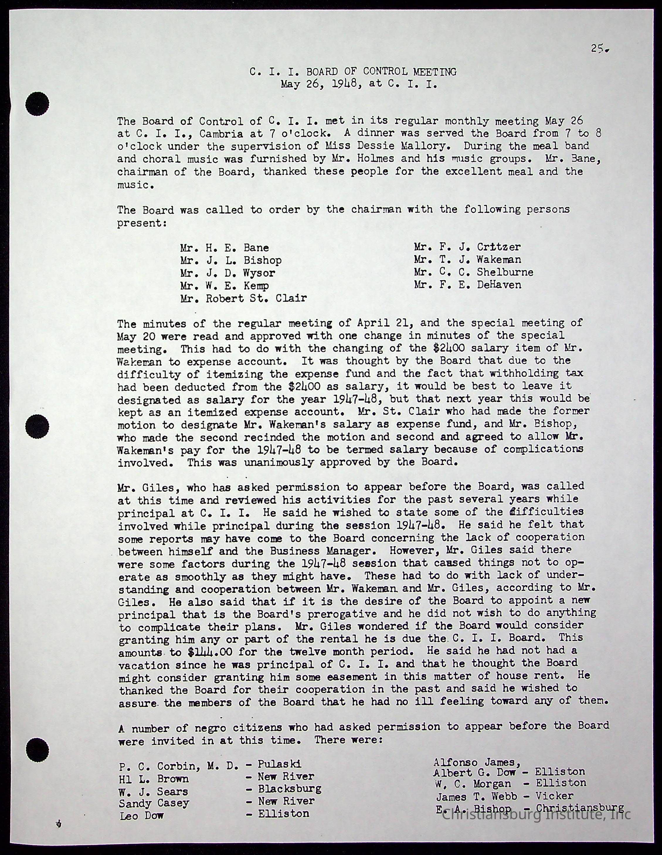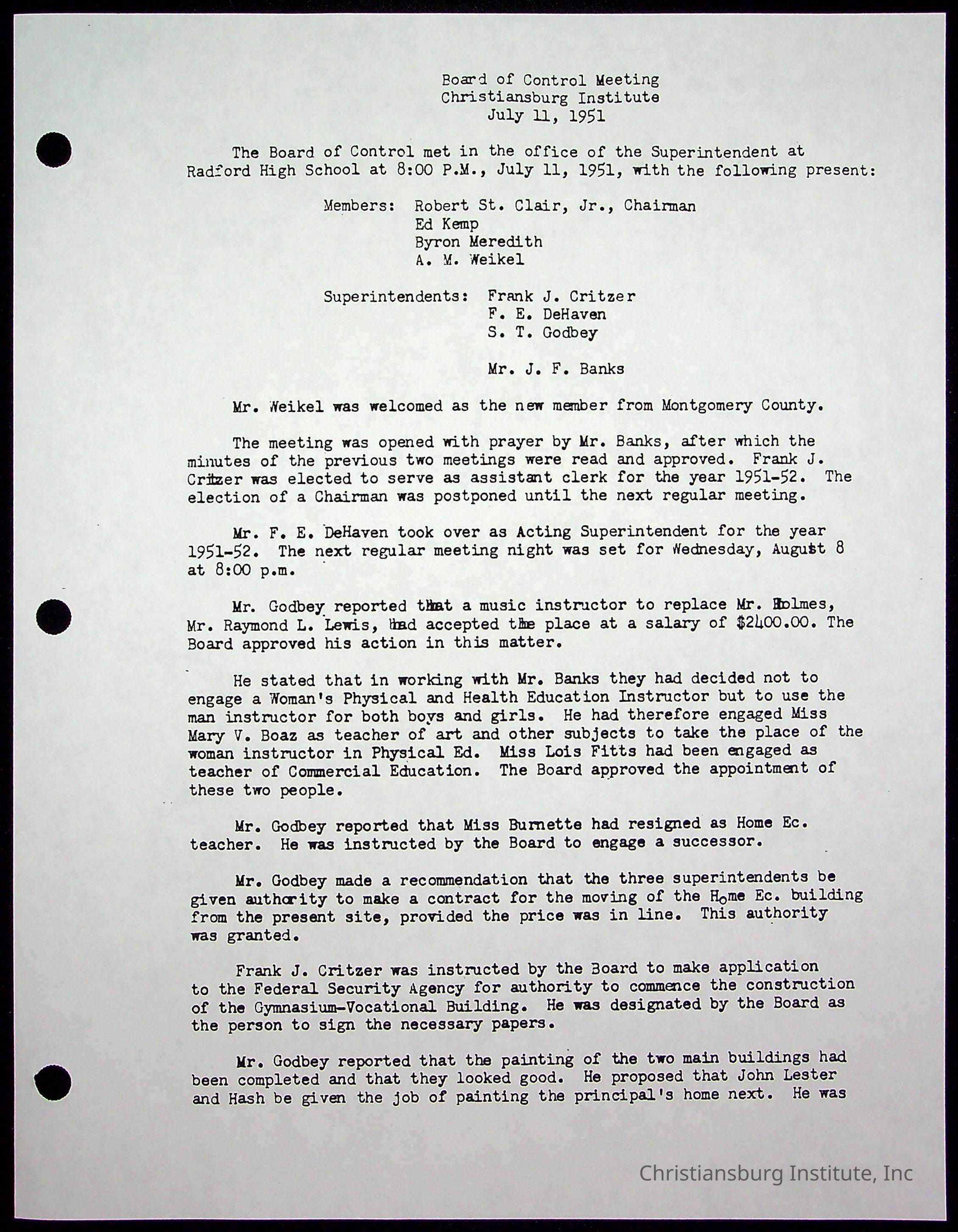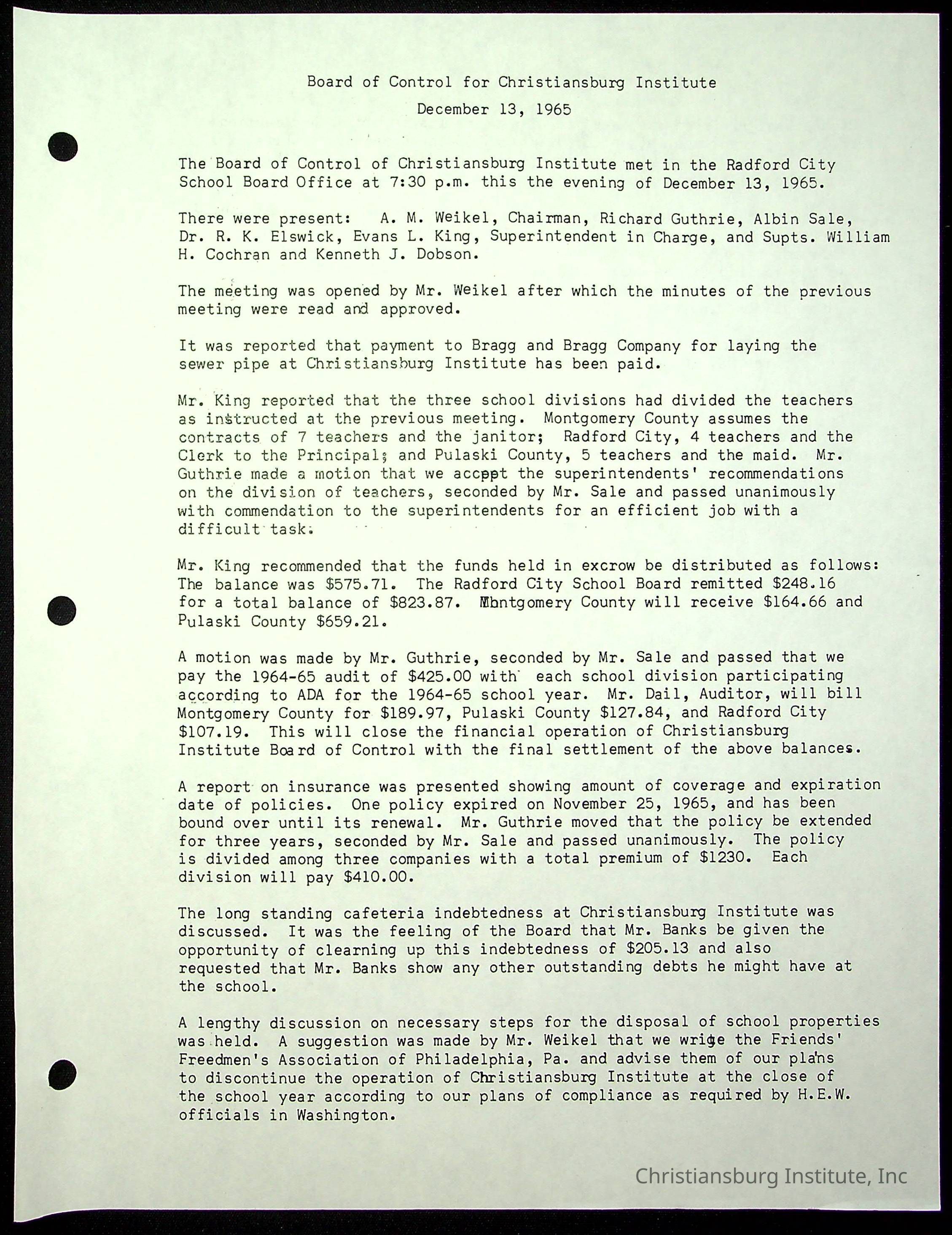 Christiansburg Industrial Institute Board Minutes, July 1947-August 1963 (photocopy)Description