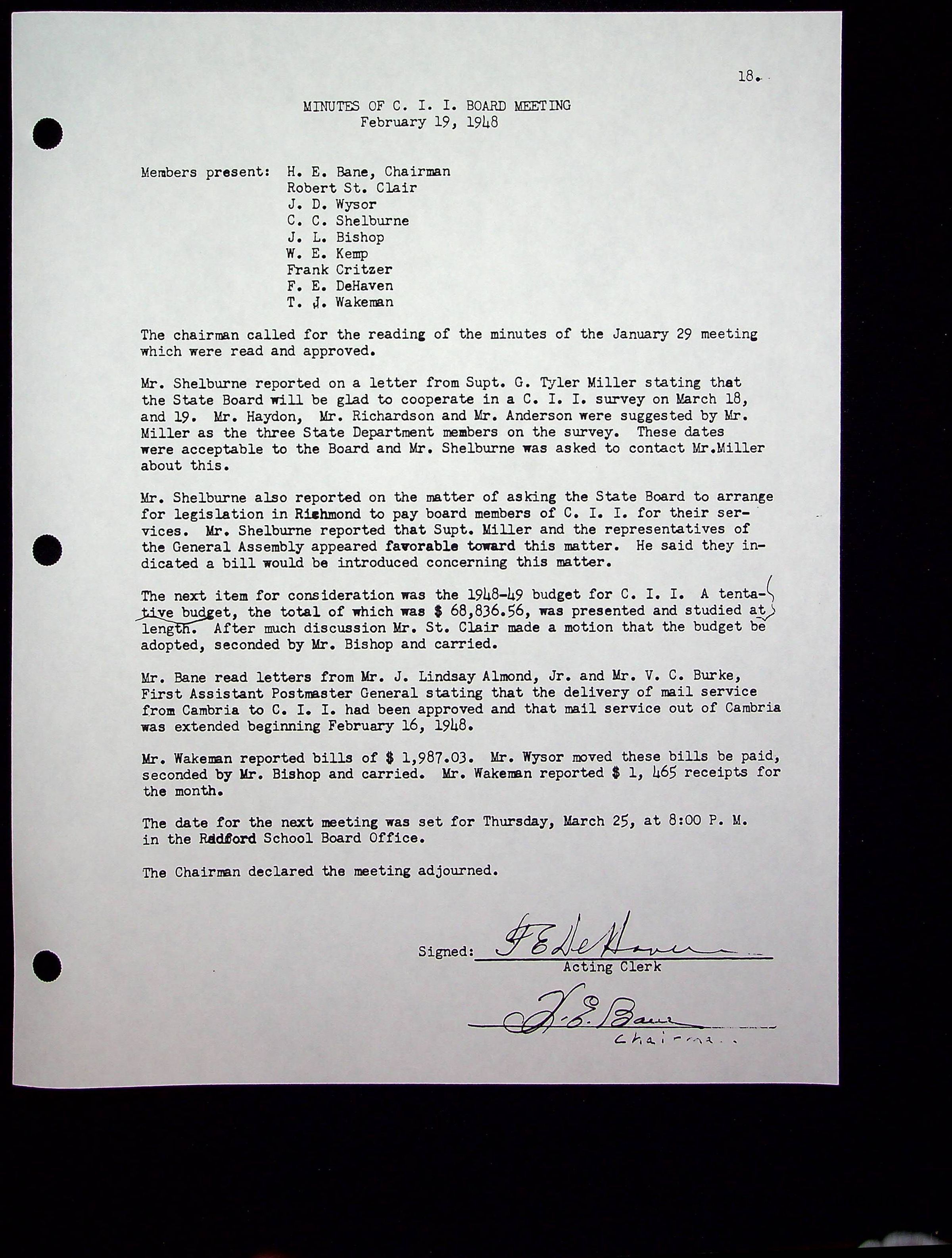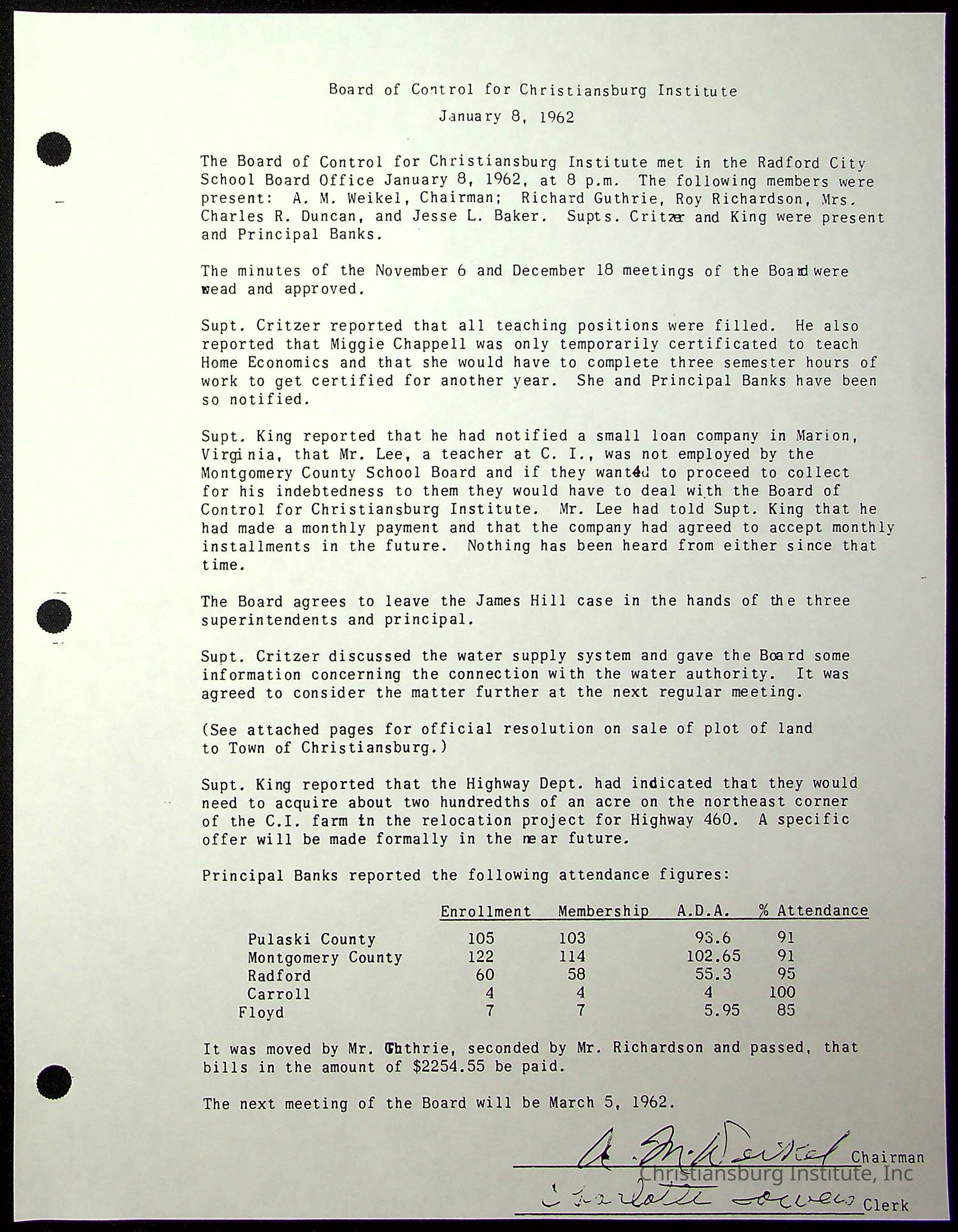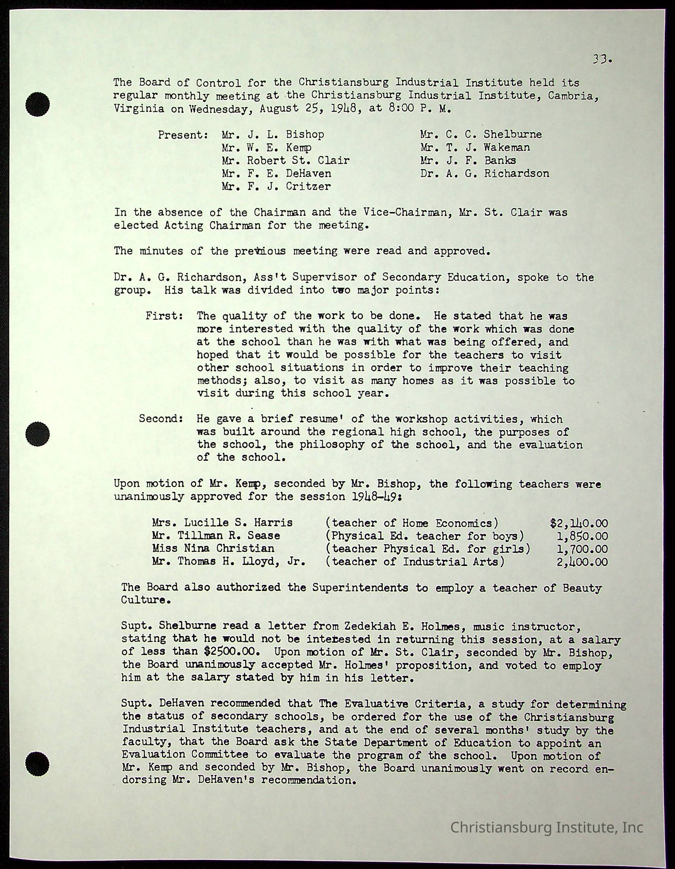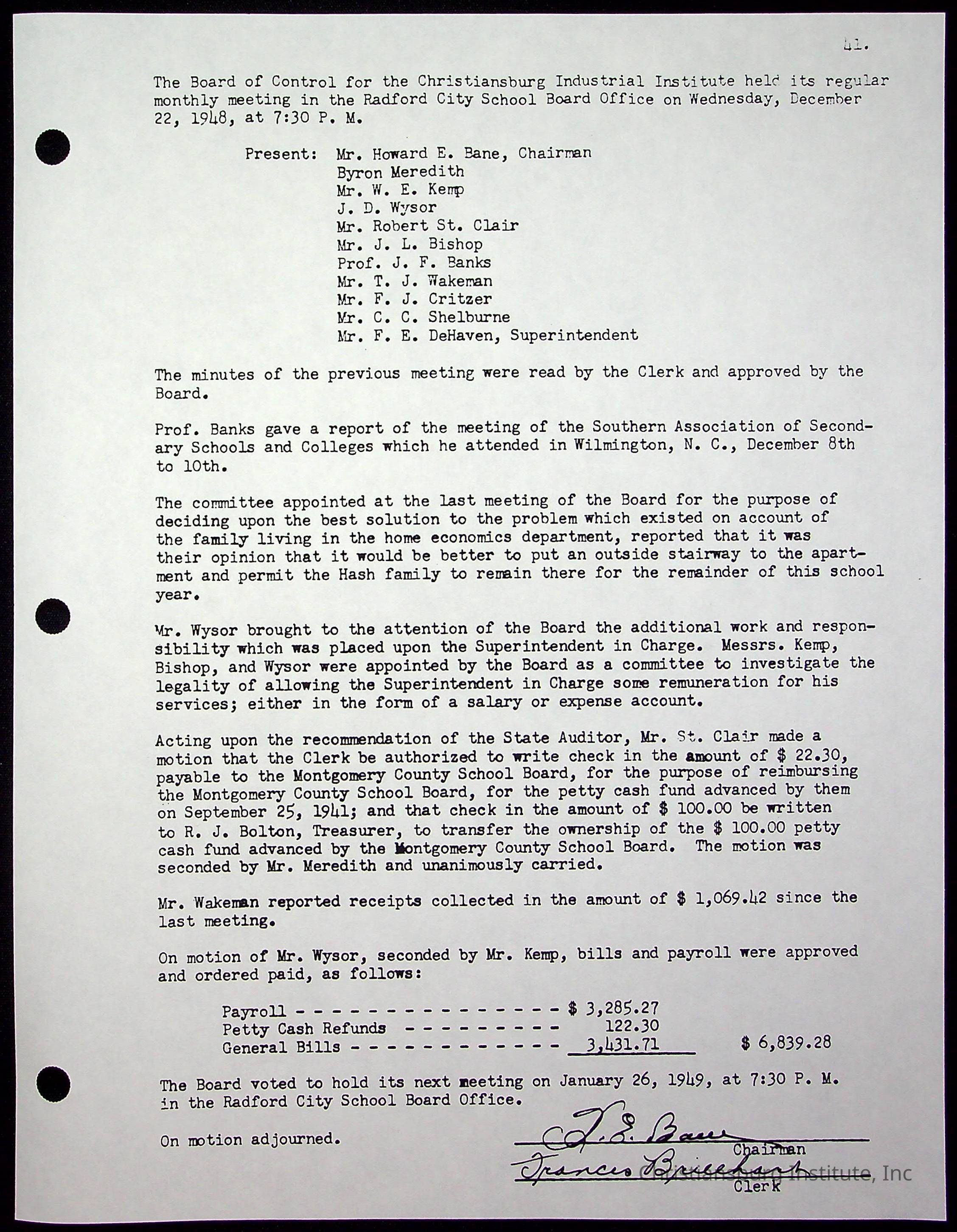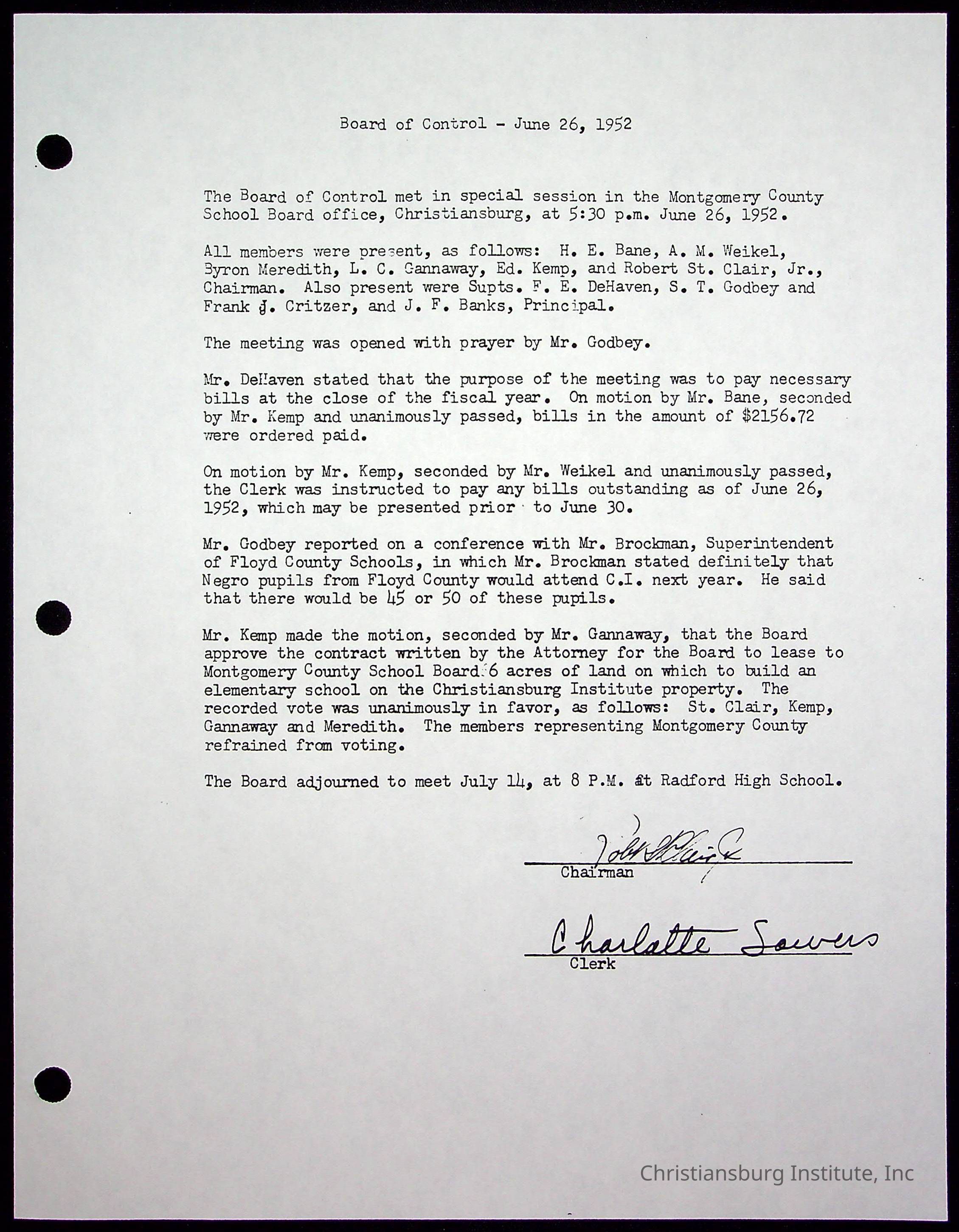 Christiansburg Industrial Institute Board Minutes, July 1947-August 1963 (photocopy)Description