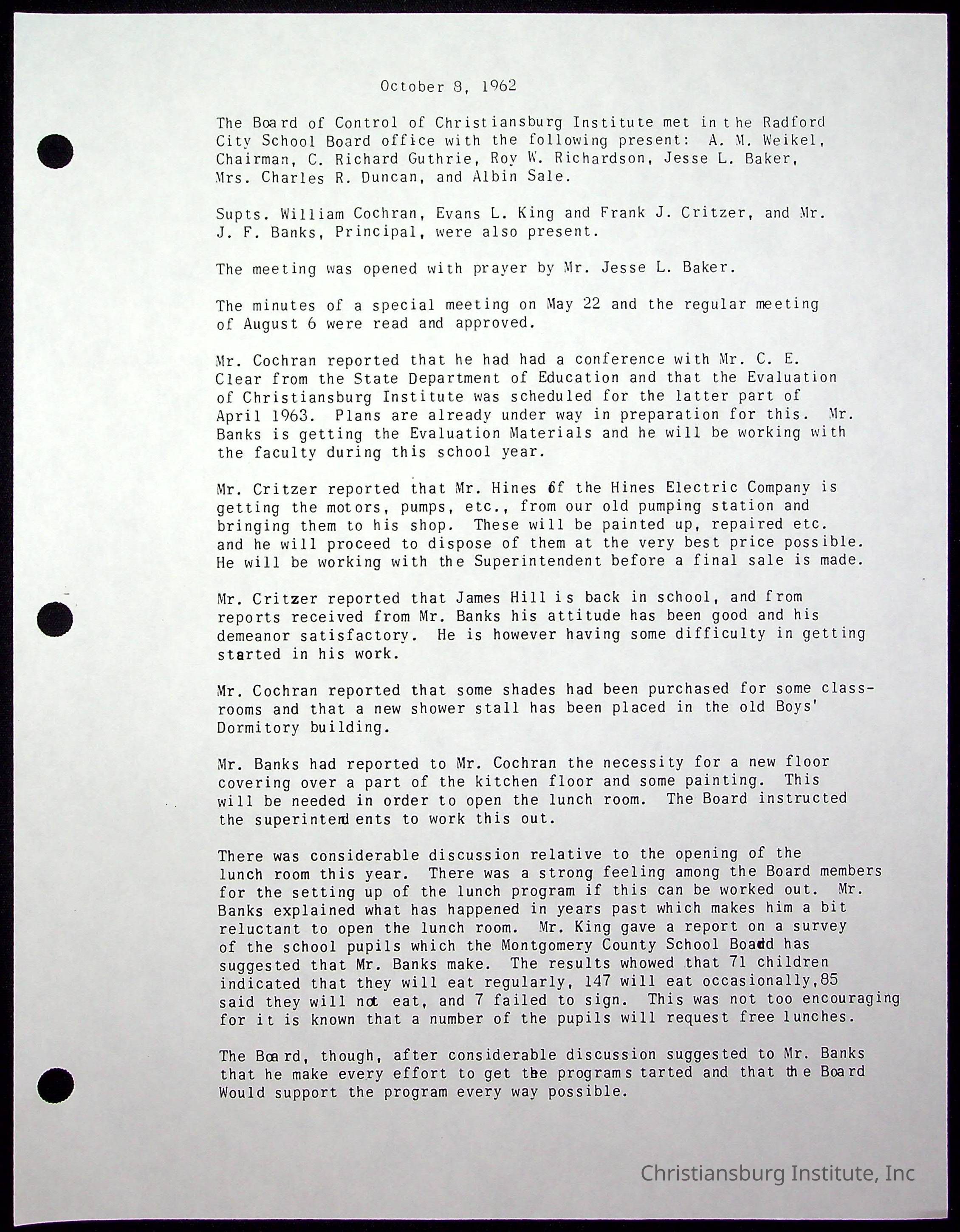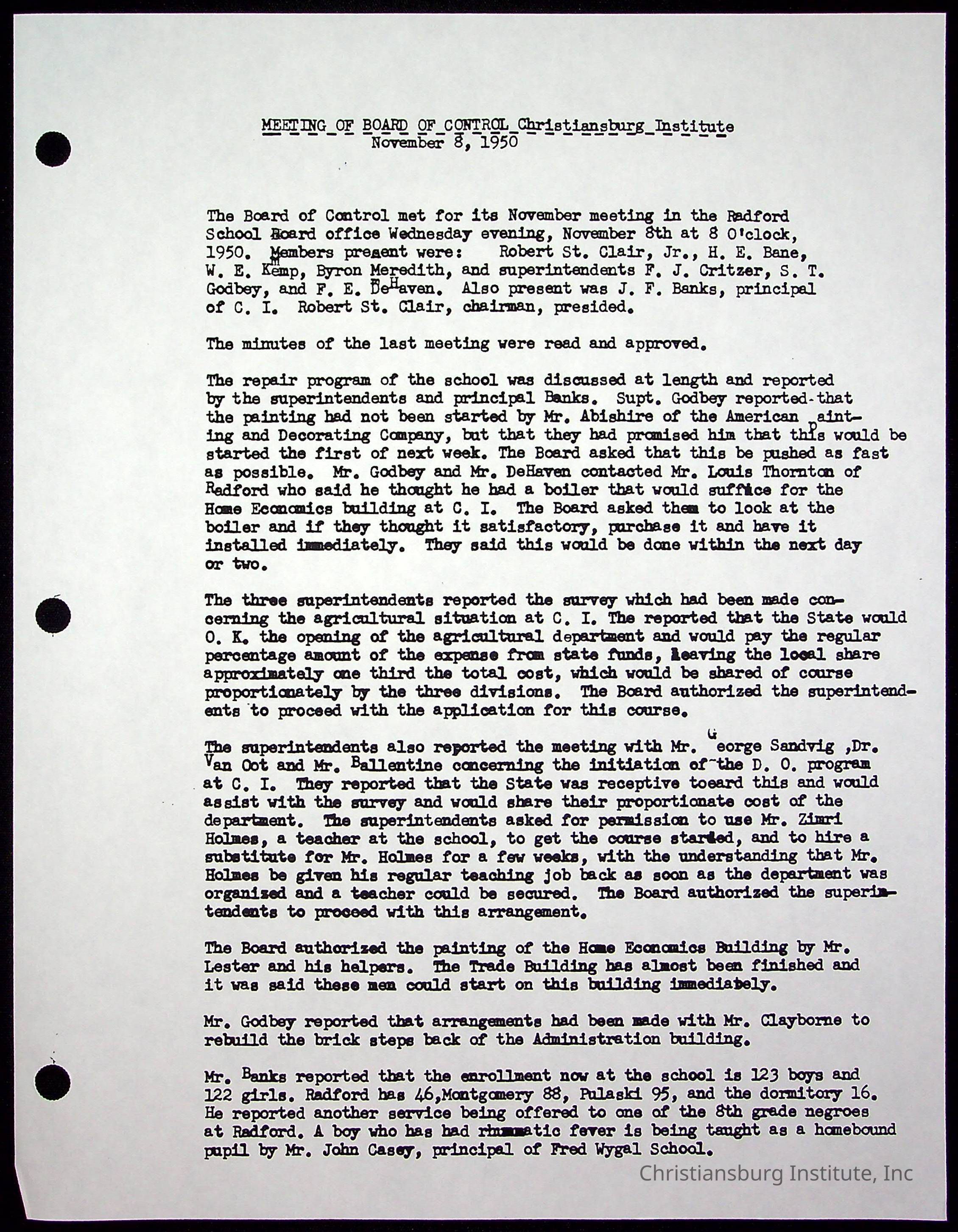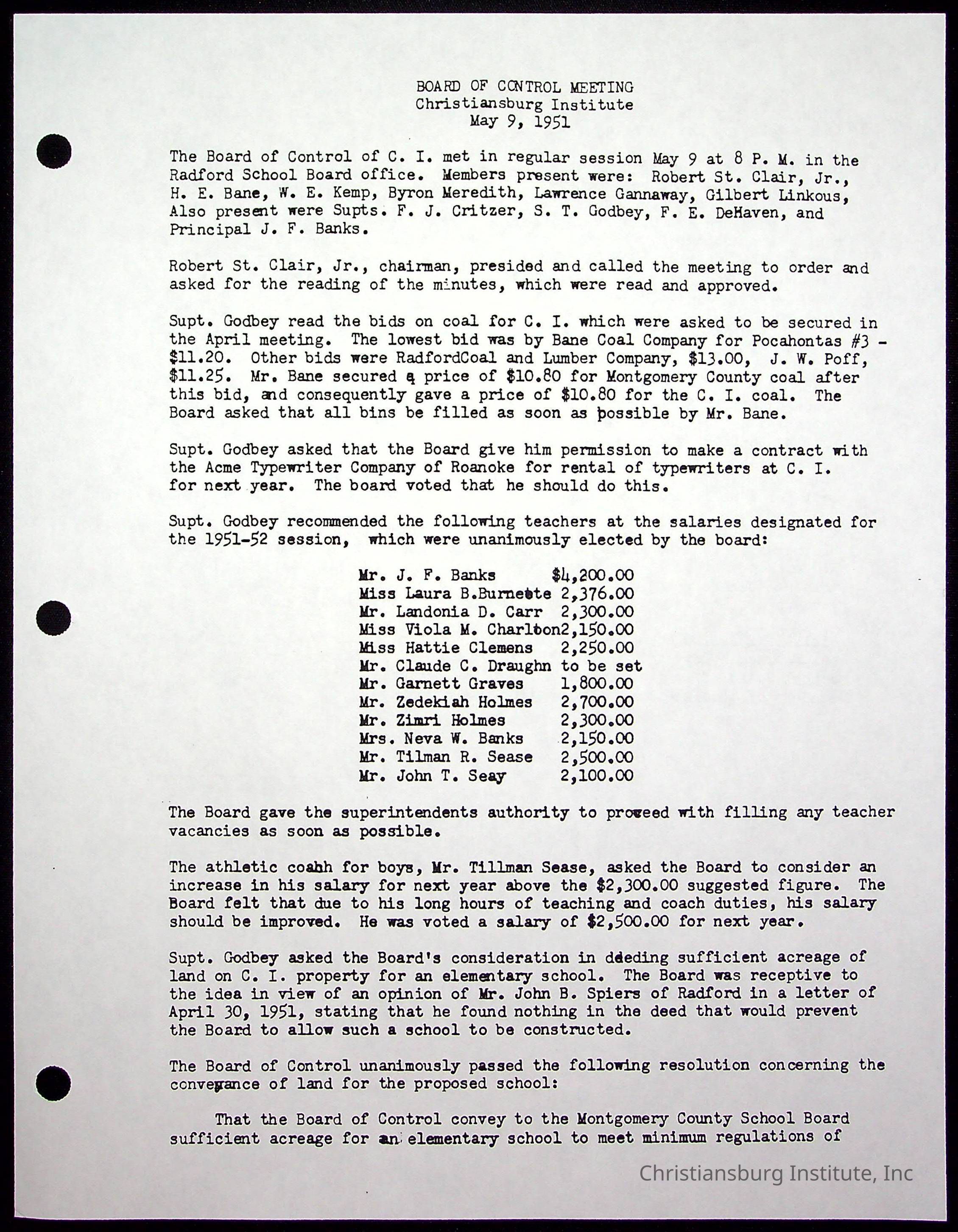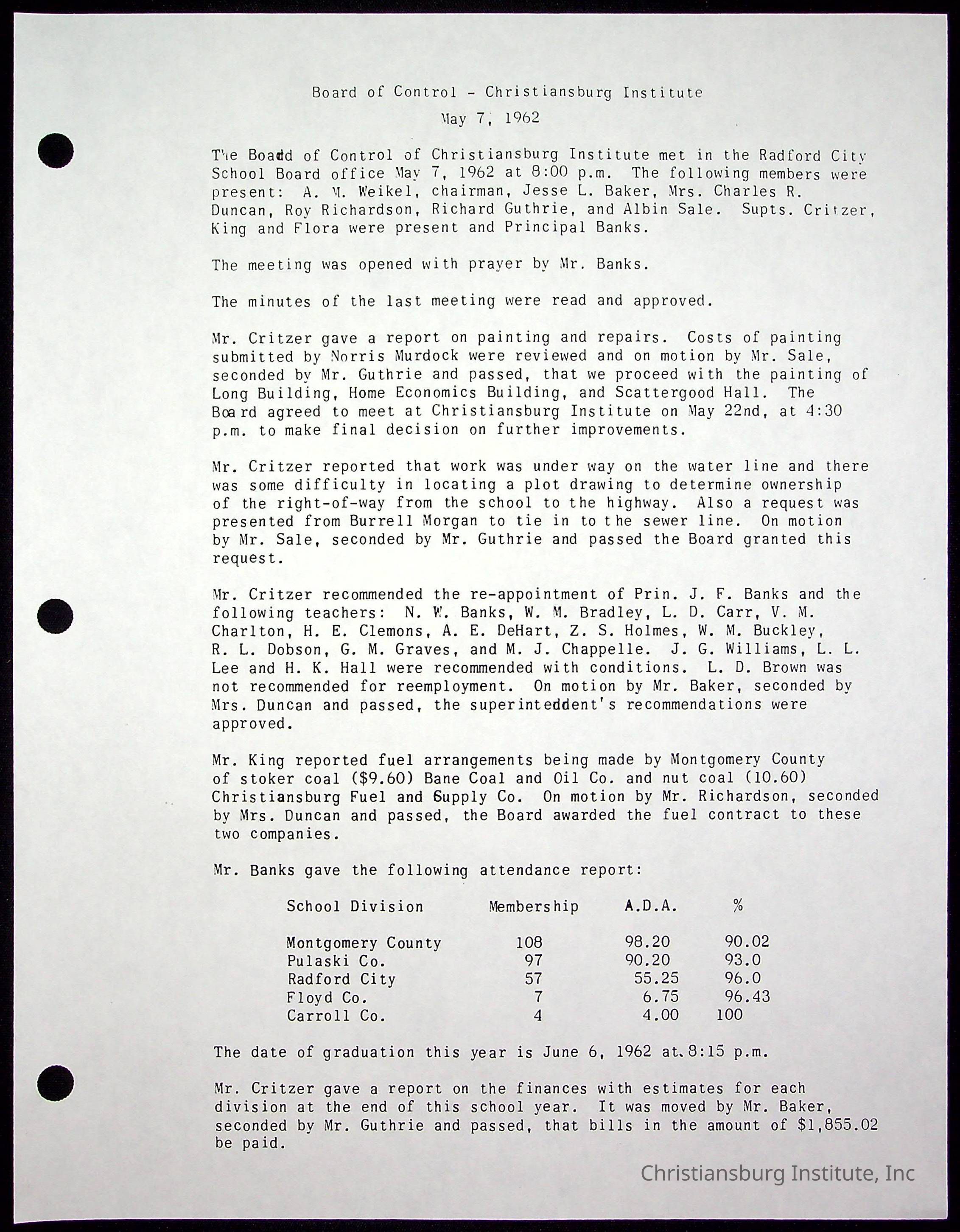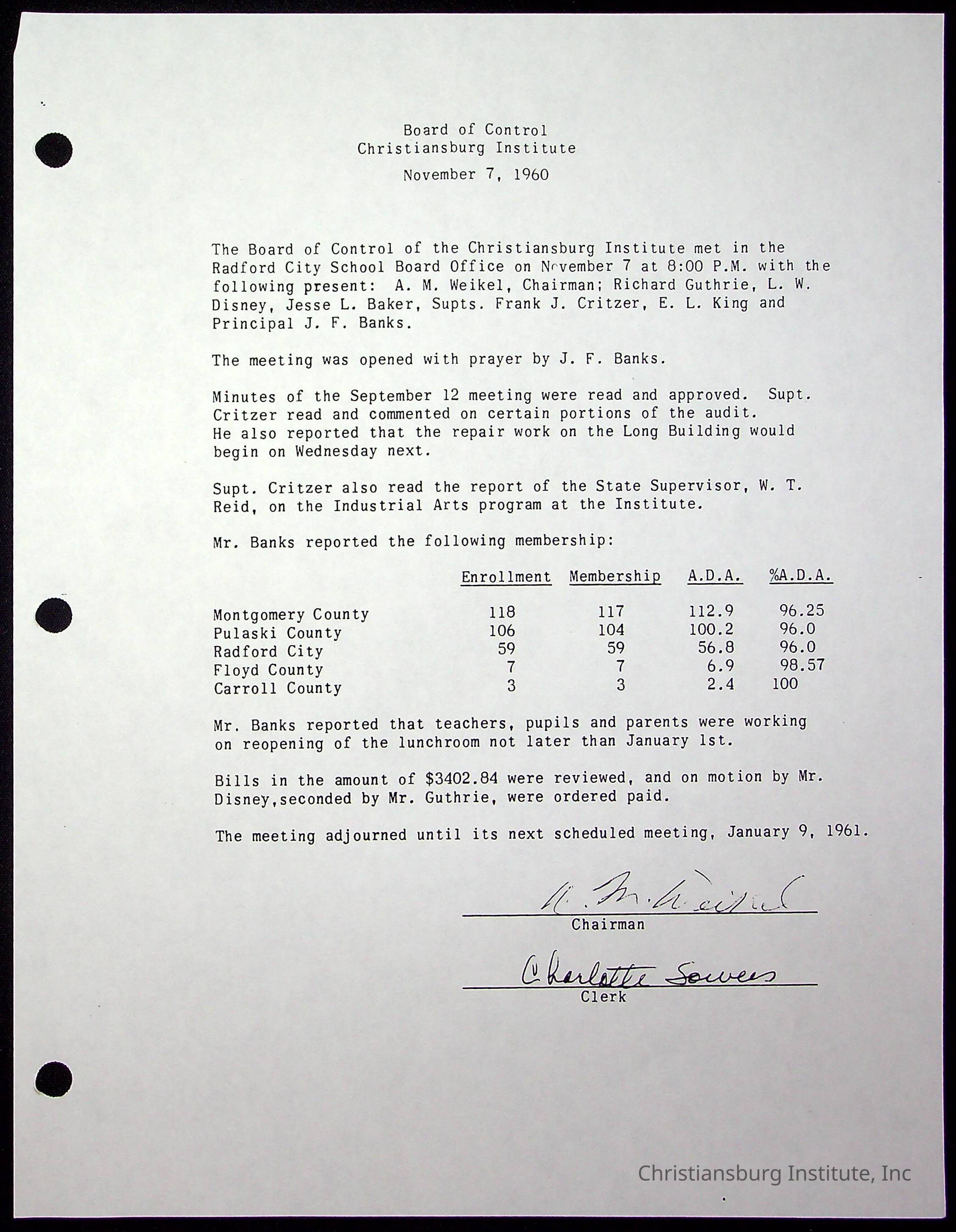 Christiansburg Industrial Institute Board Minutes, July 1947-August 1963 (photocopy)Description
