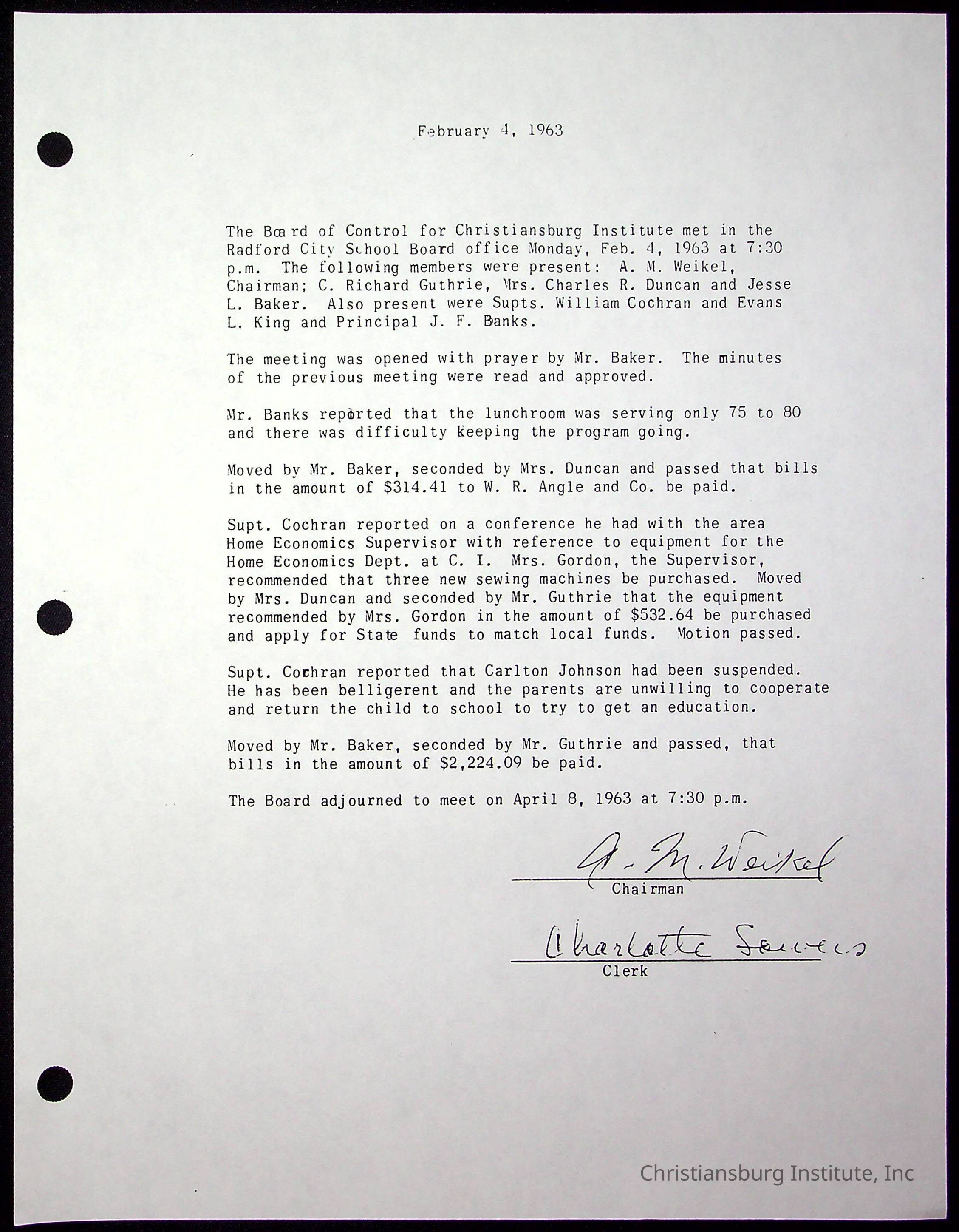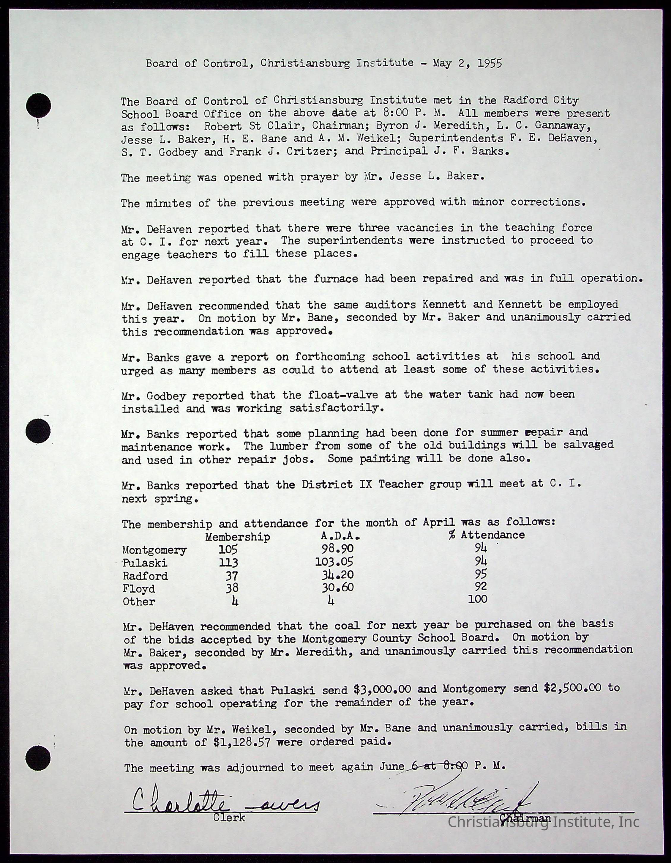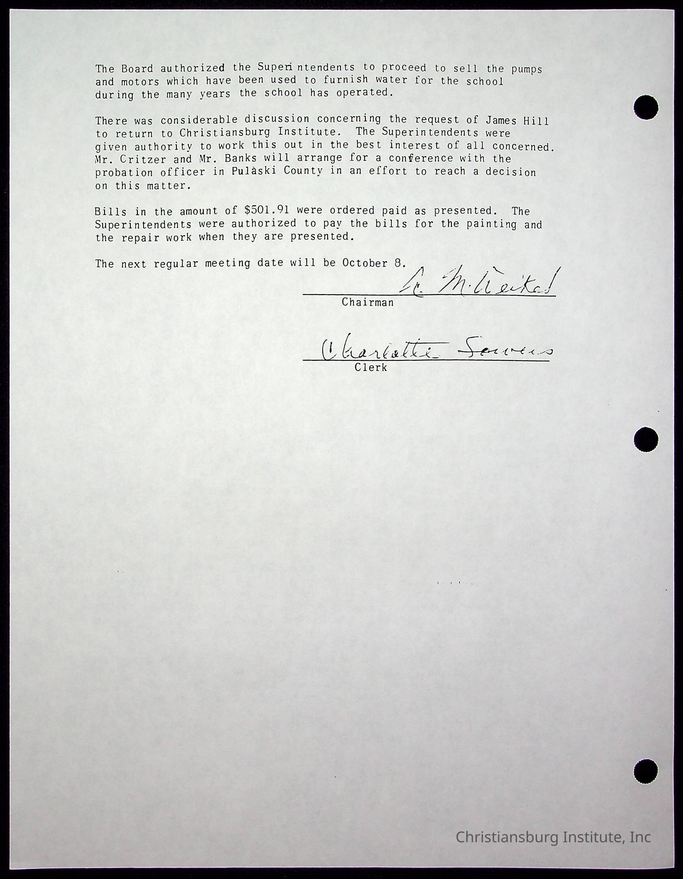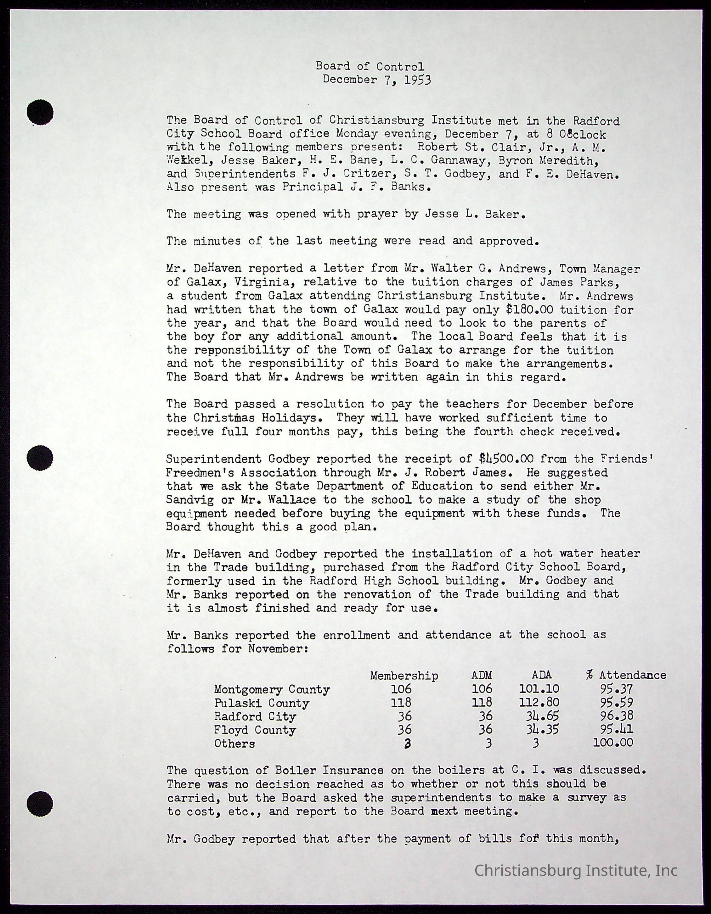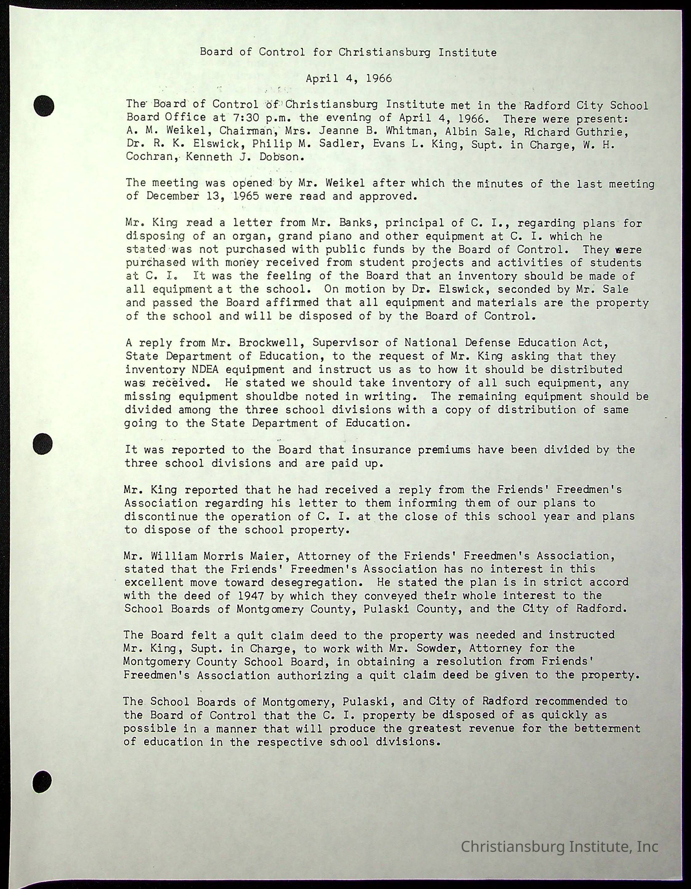 Christiansburg Industrial Institute Board Minutes, July 1947-August 1963 (photocopy)Description