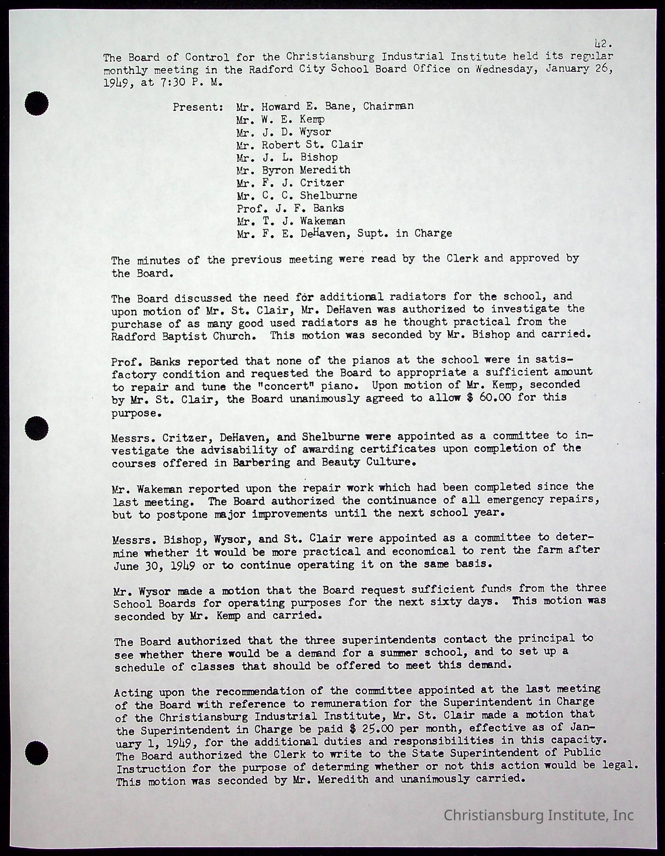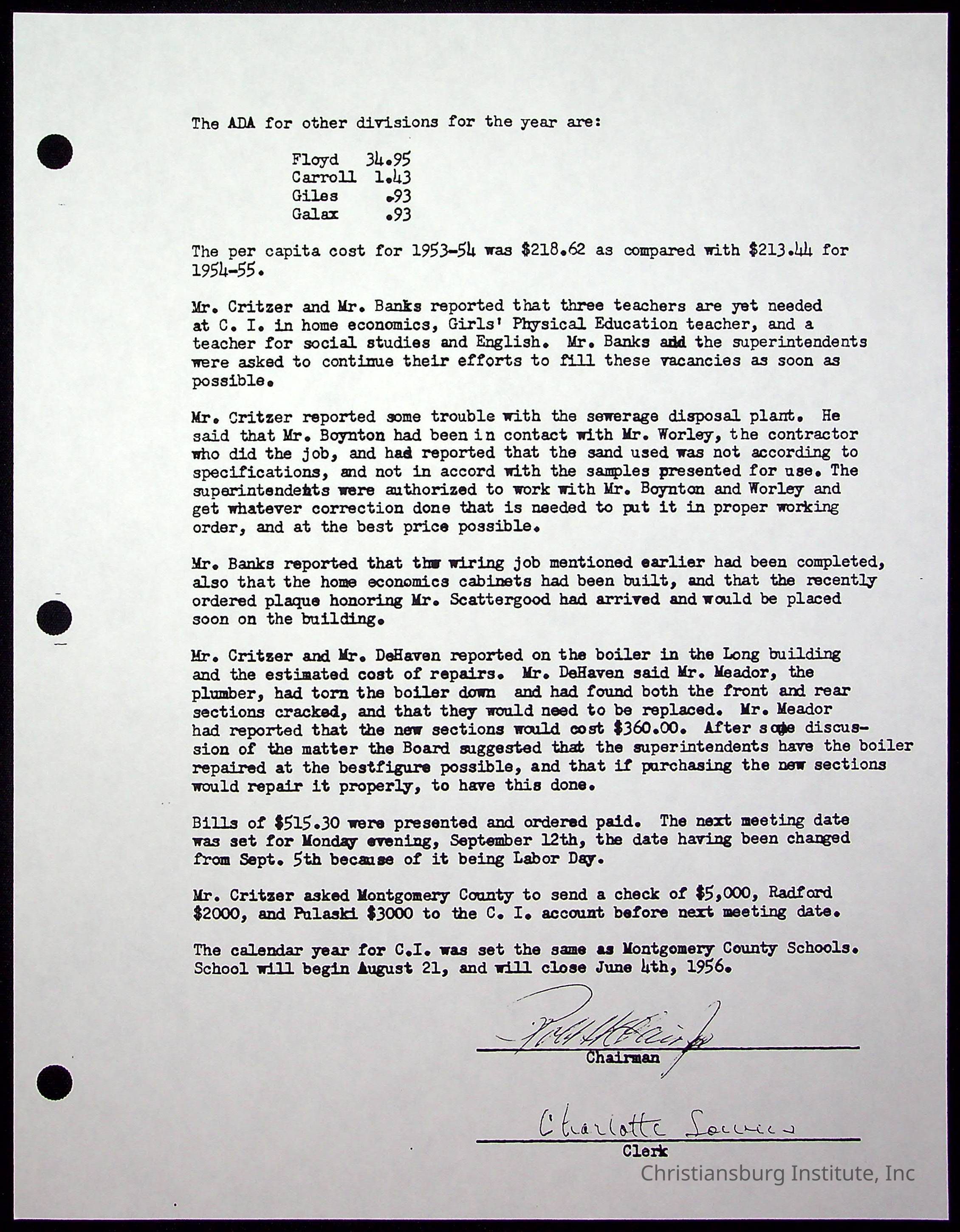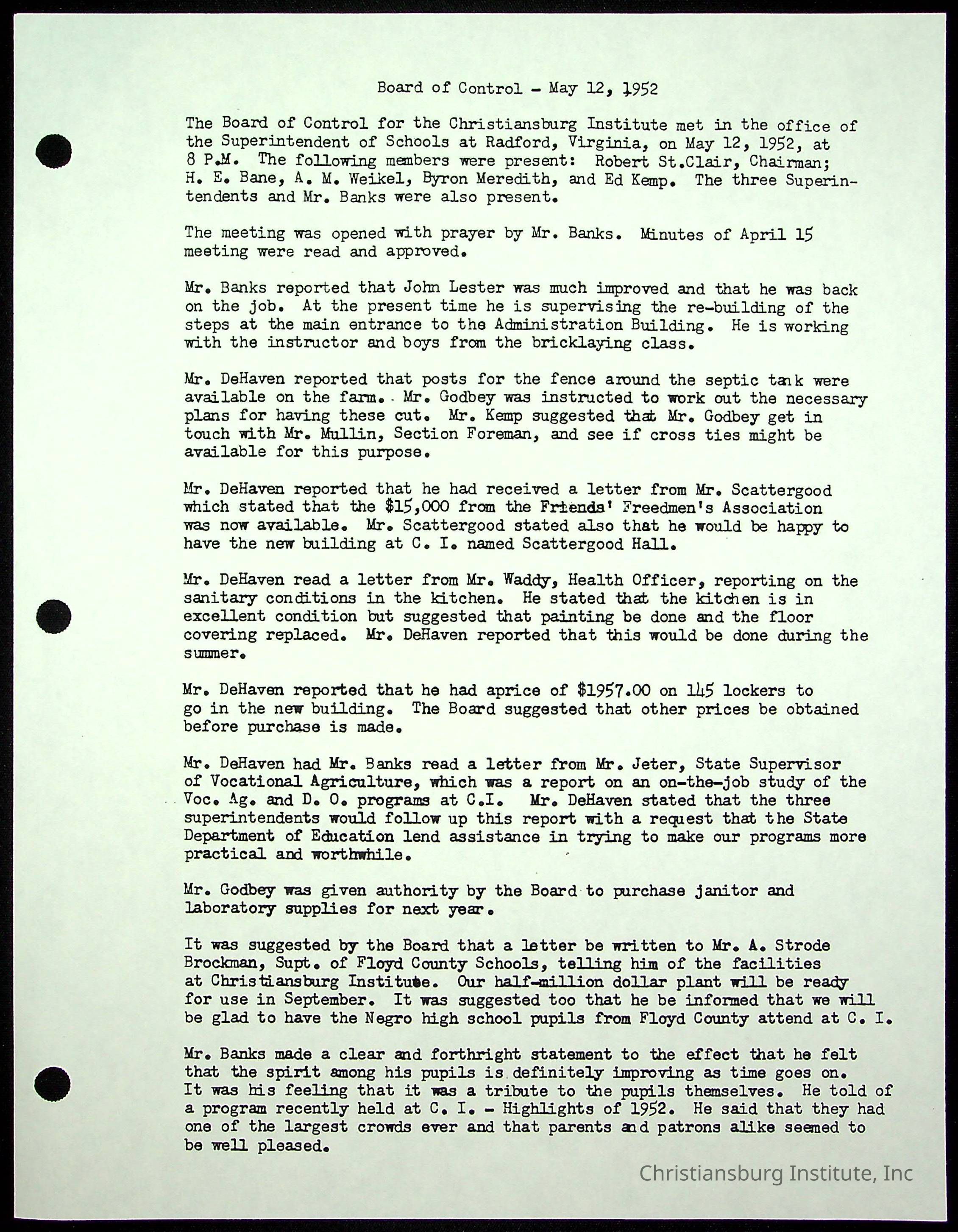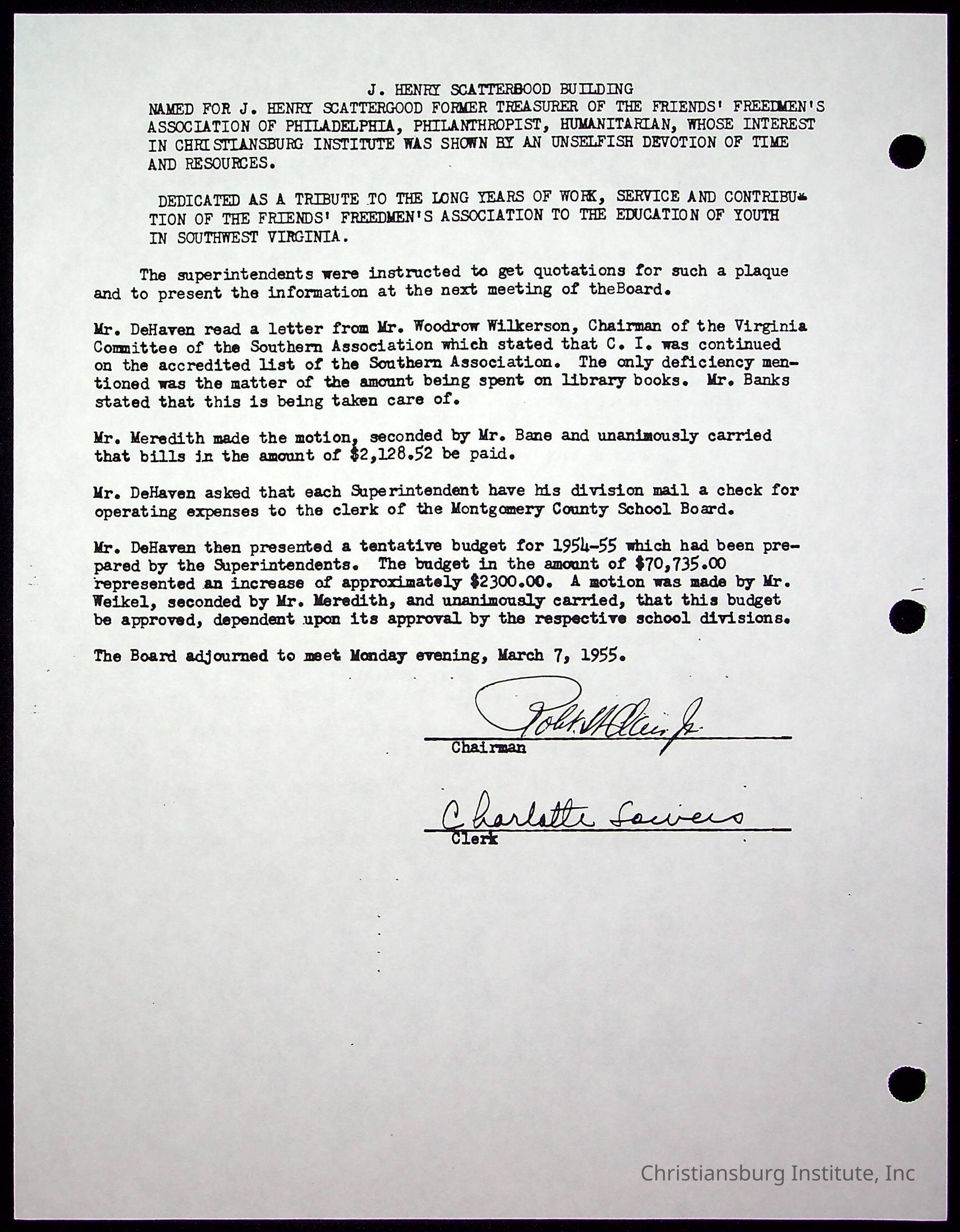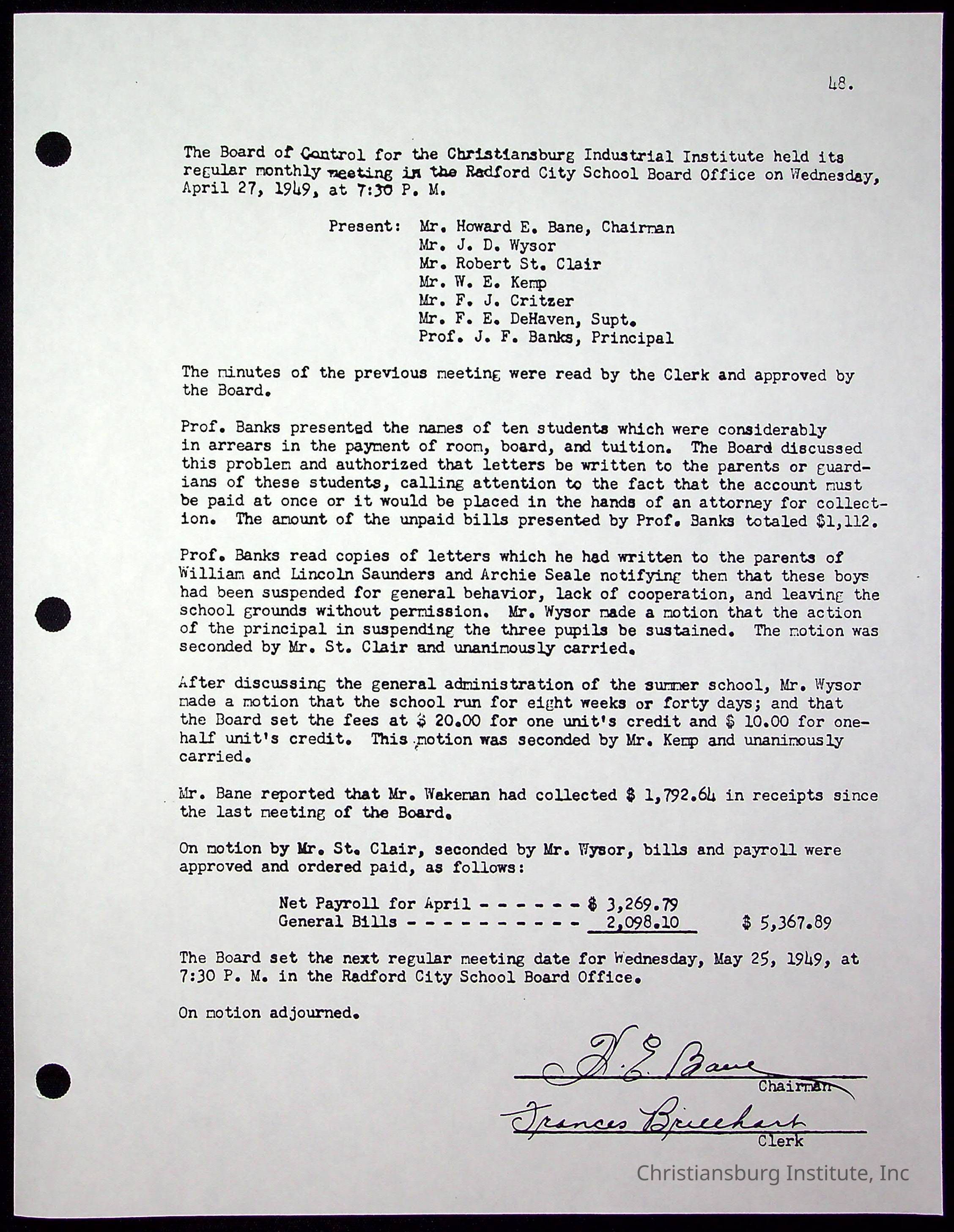 Christiansburg Industrial Institute Board Minutes, July 1947-August 1963 (photocopy)Description
