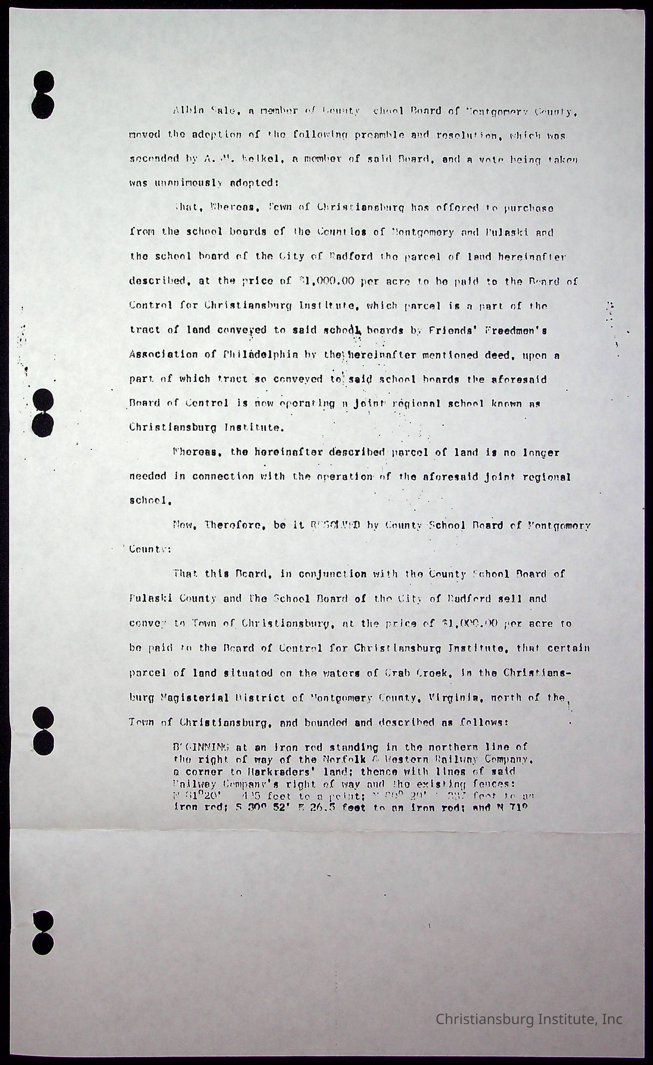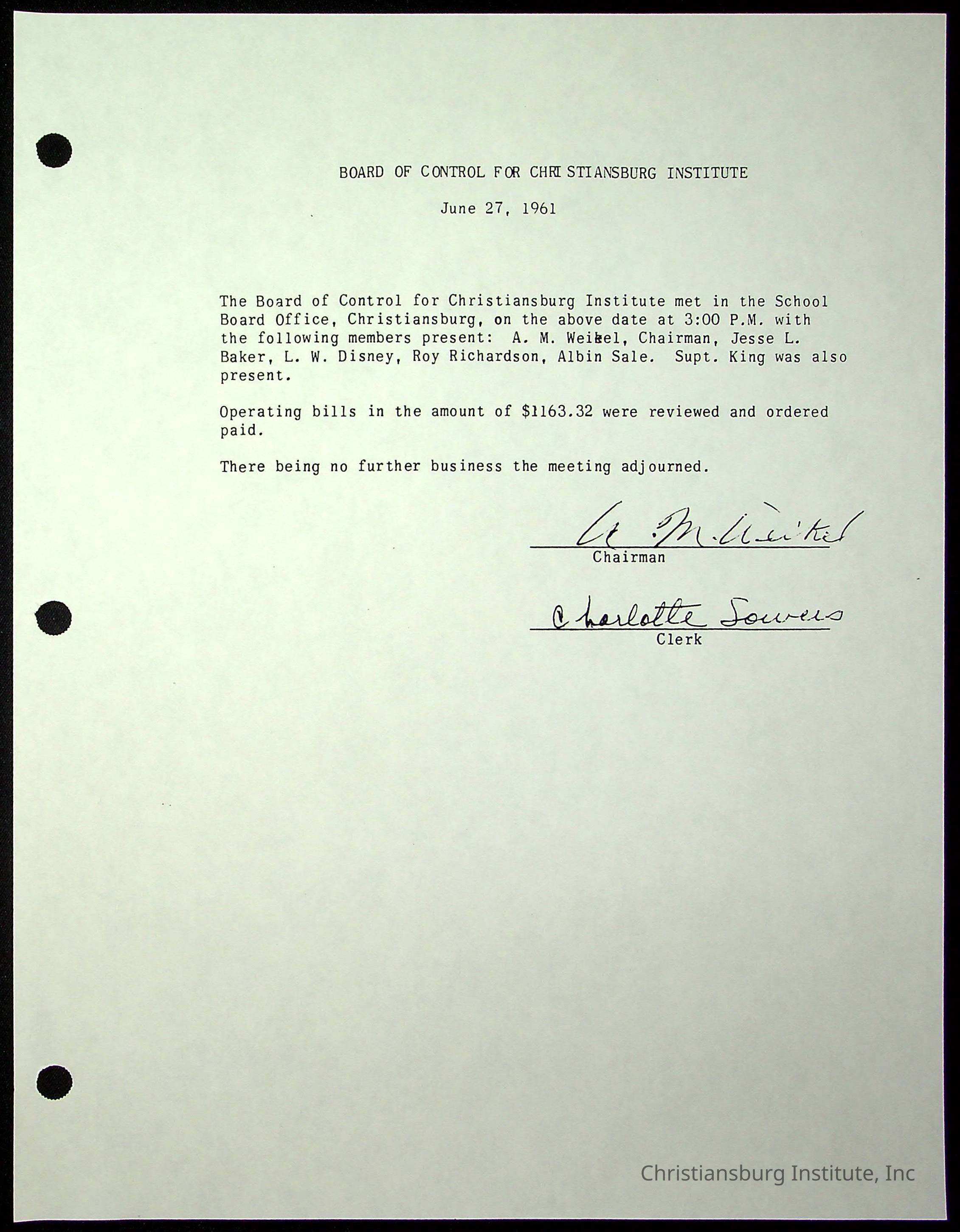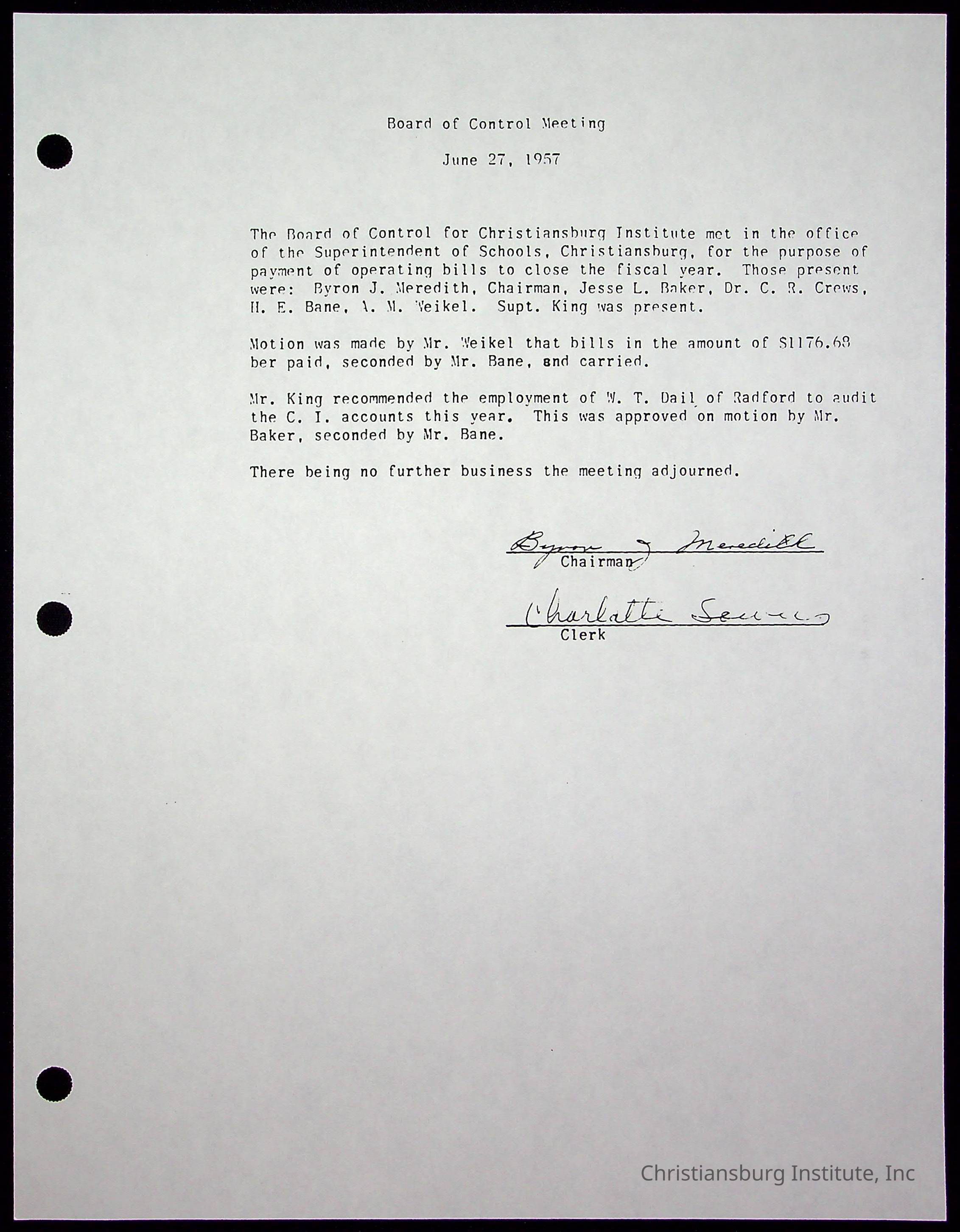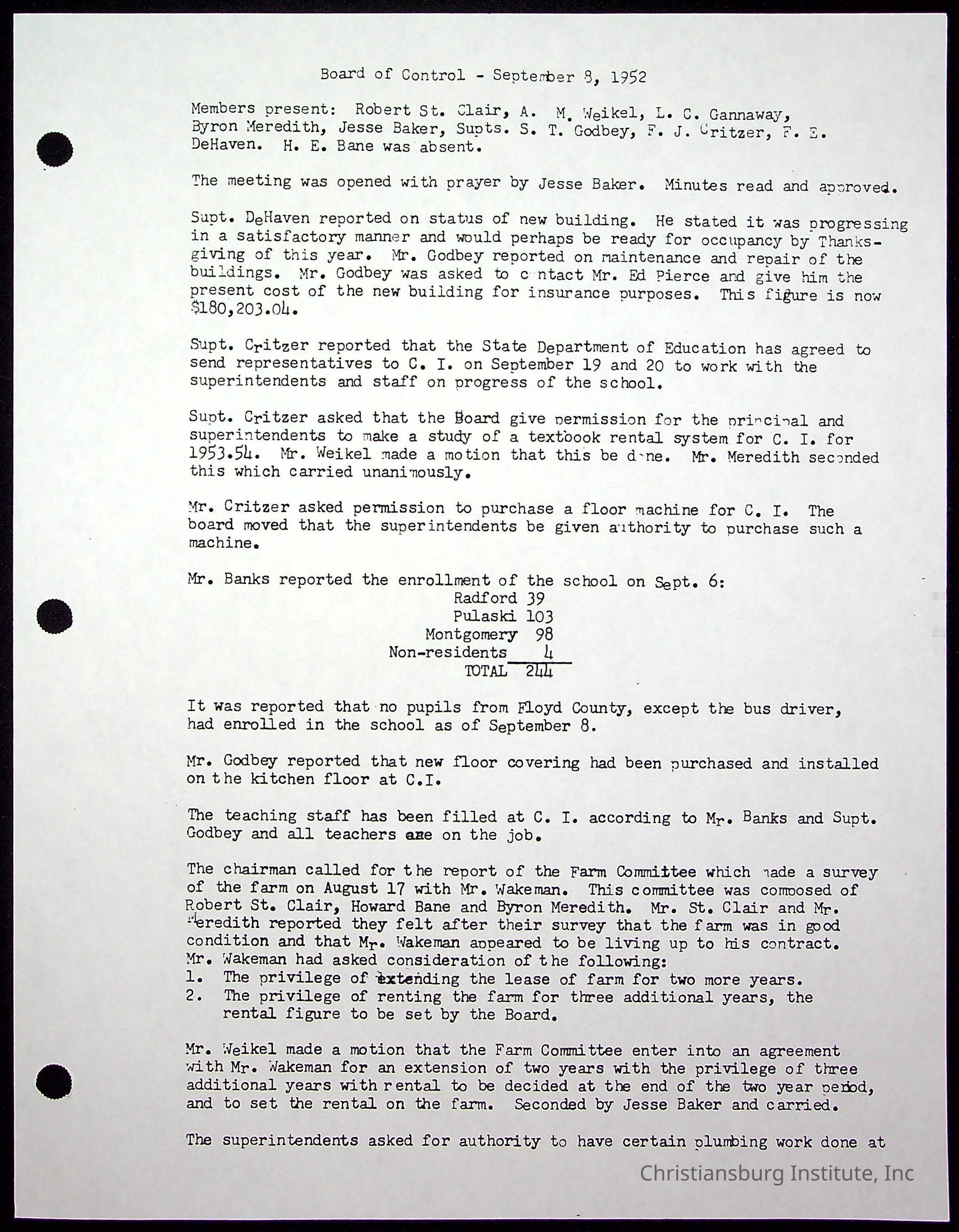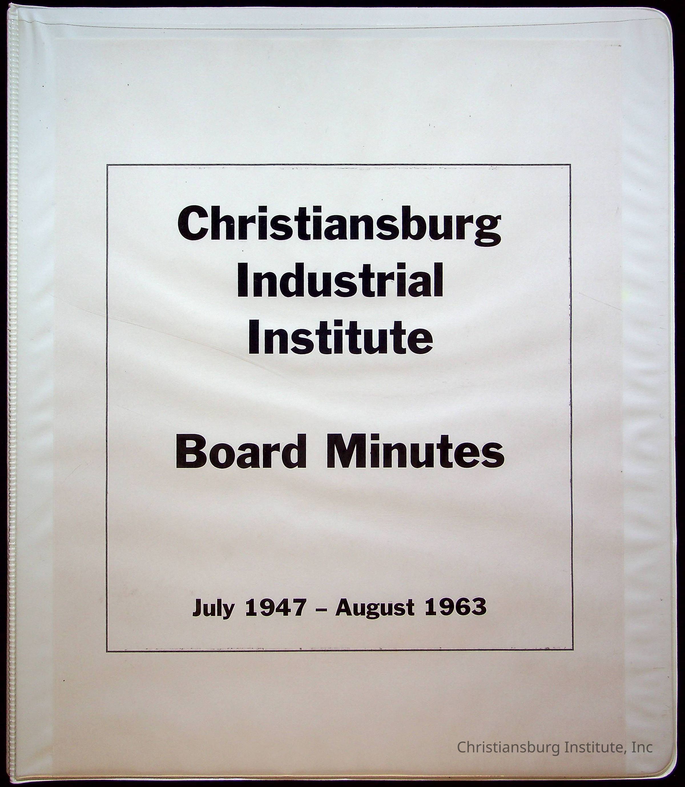 A binder of a photocopy version of the Christiansburg Industrial Institute board minutes from July 1947 through August 1963.Creator