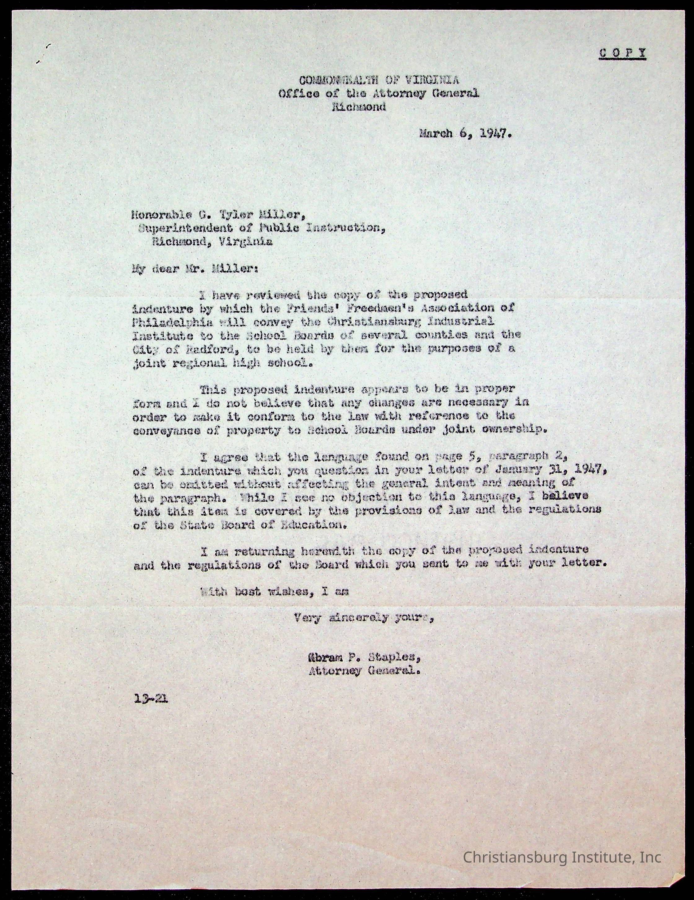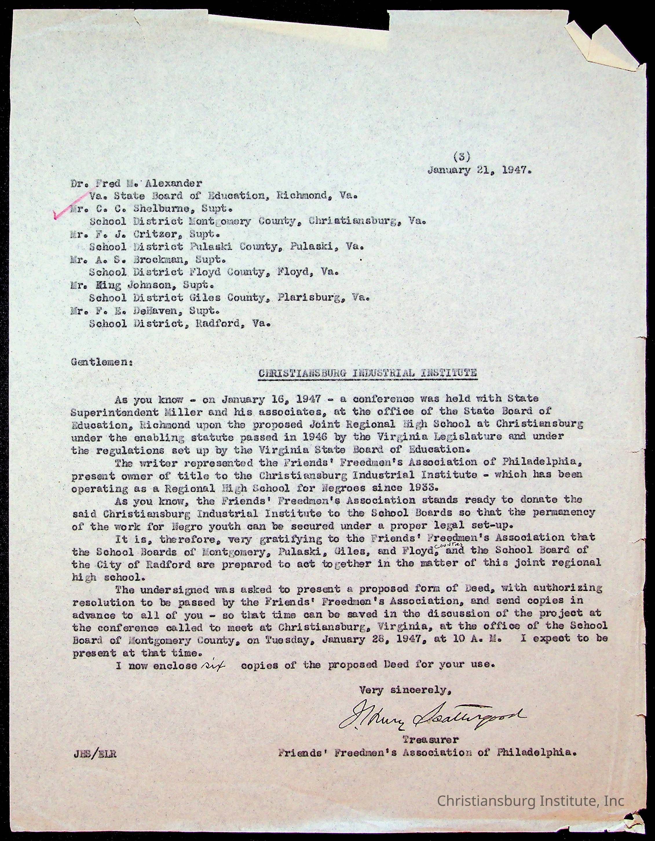 An archive of materials relating to the deed for Christiansburg Industrial Institute, which was handed over to the school boards of Montgomery County, Pulaski County, Floyd County, Giles County, and Radford from the Friends' Freedmen's Association in 1947.Collection