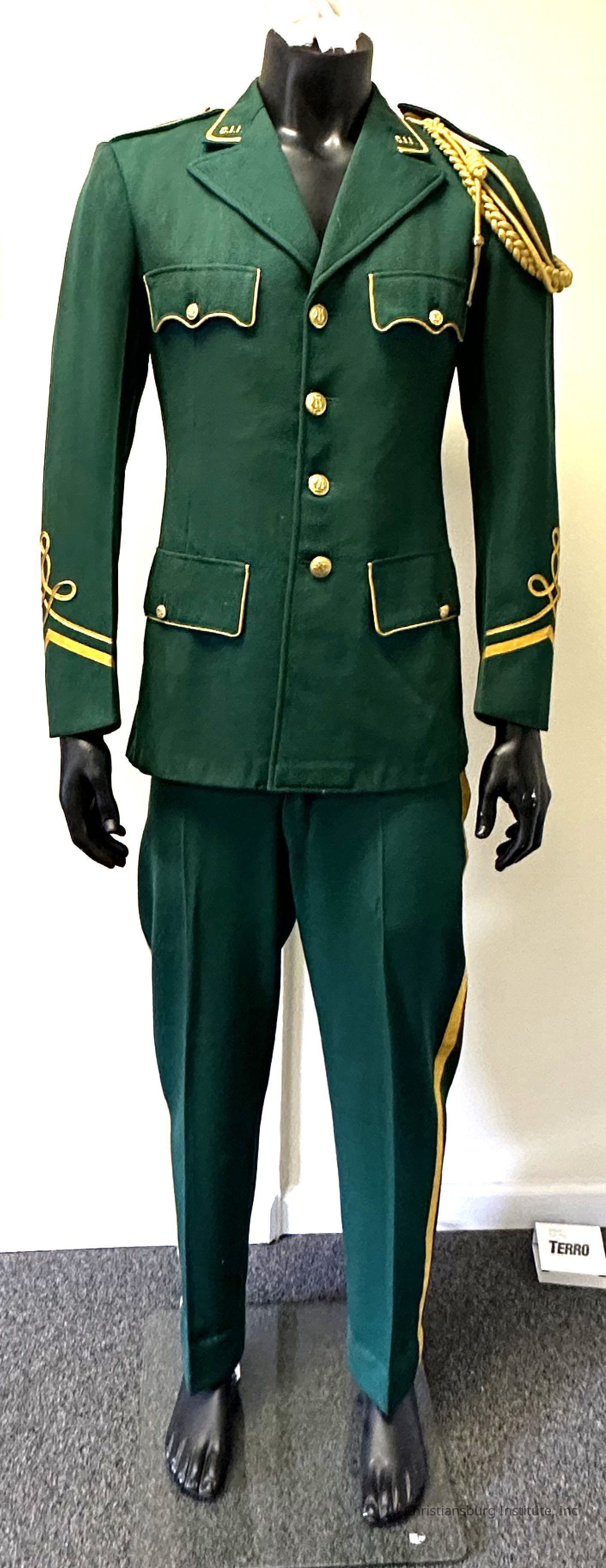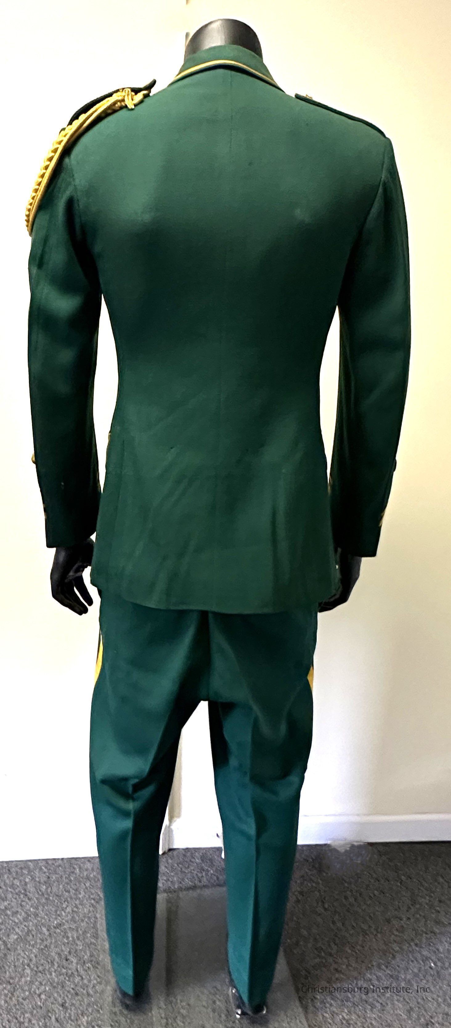A Christiansburg Industrial Institute green band uniform, including; pants and jacket with gold buttons and embossed lapel, undated. This band uniform was worn by Thompson Lester.Collection