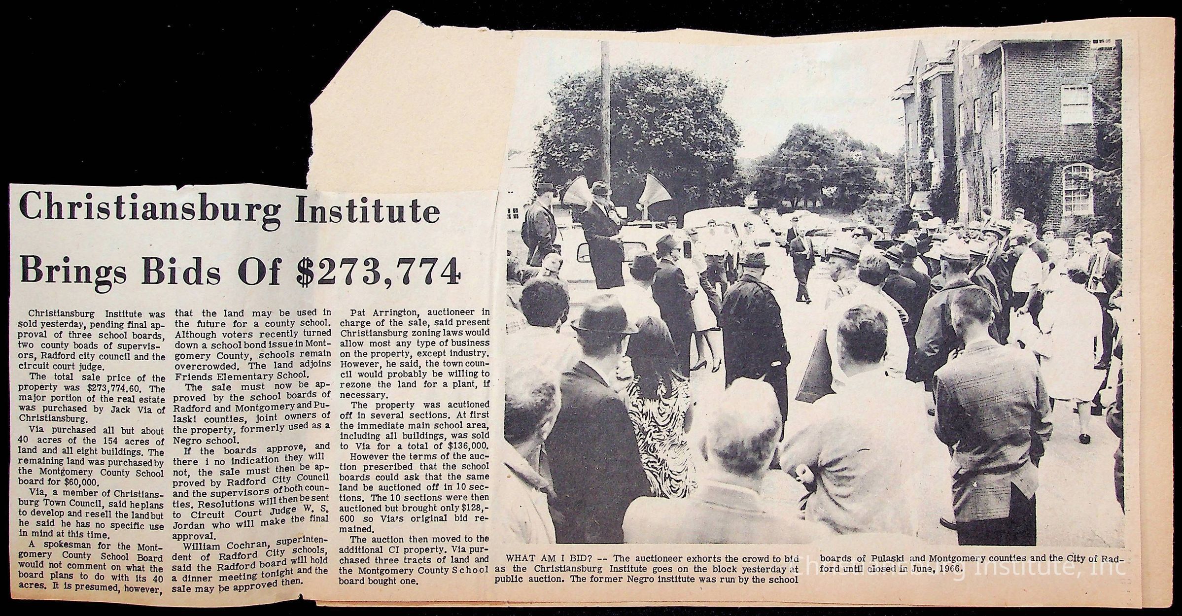 A newspaper clipping titled 'Christiansburg Institute Brings Bids of $273,774' written in the year 1967 and features a story about the sale of Christiansburg Institute.