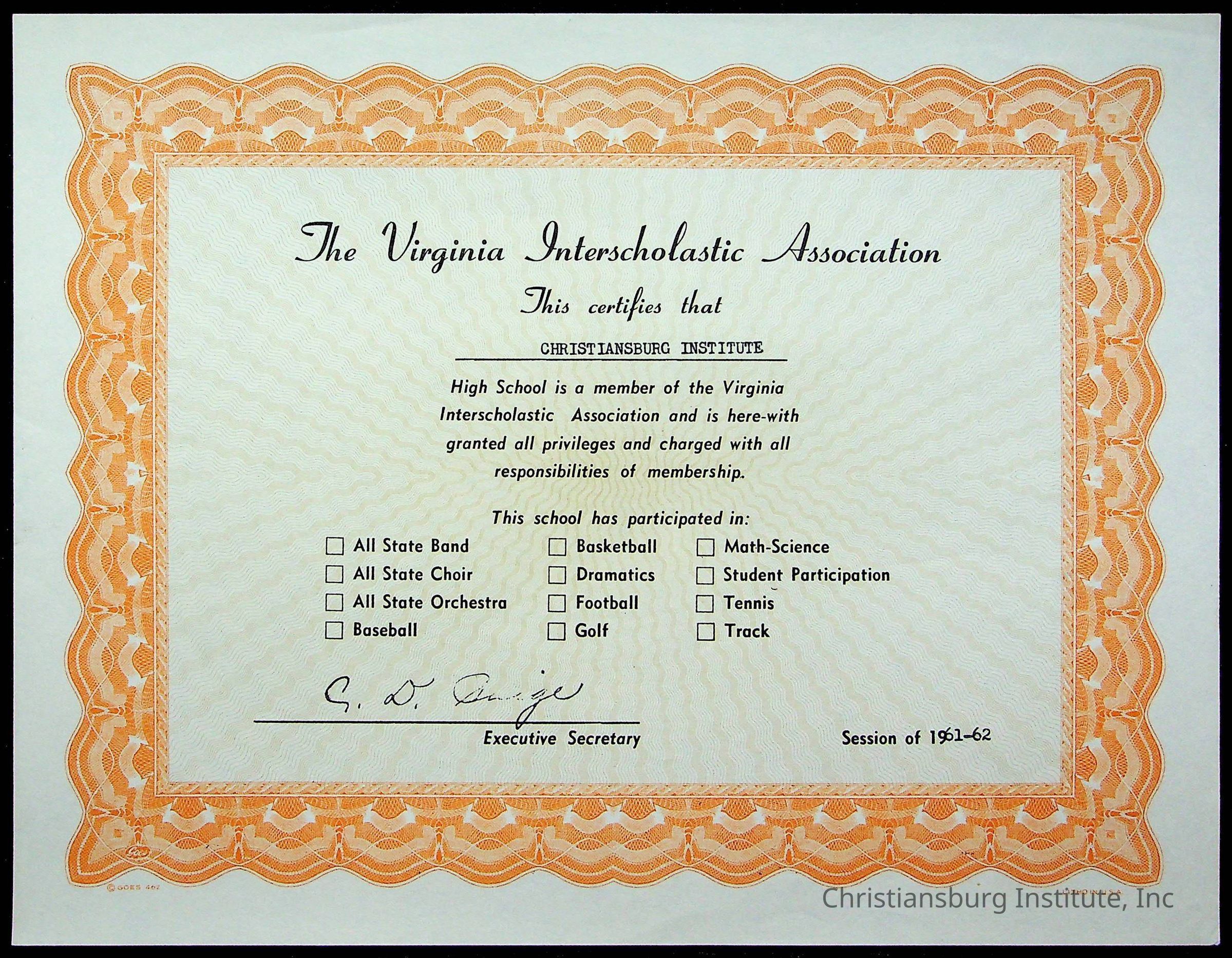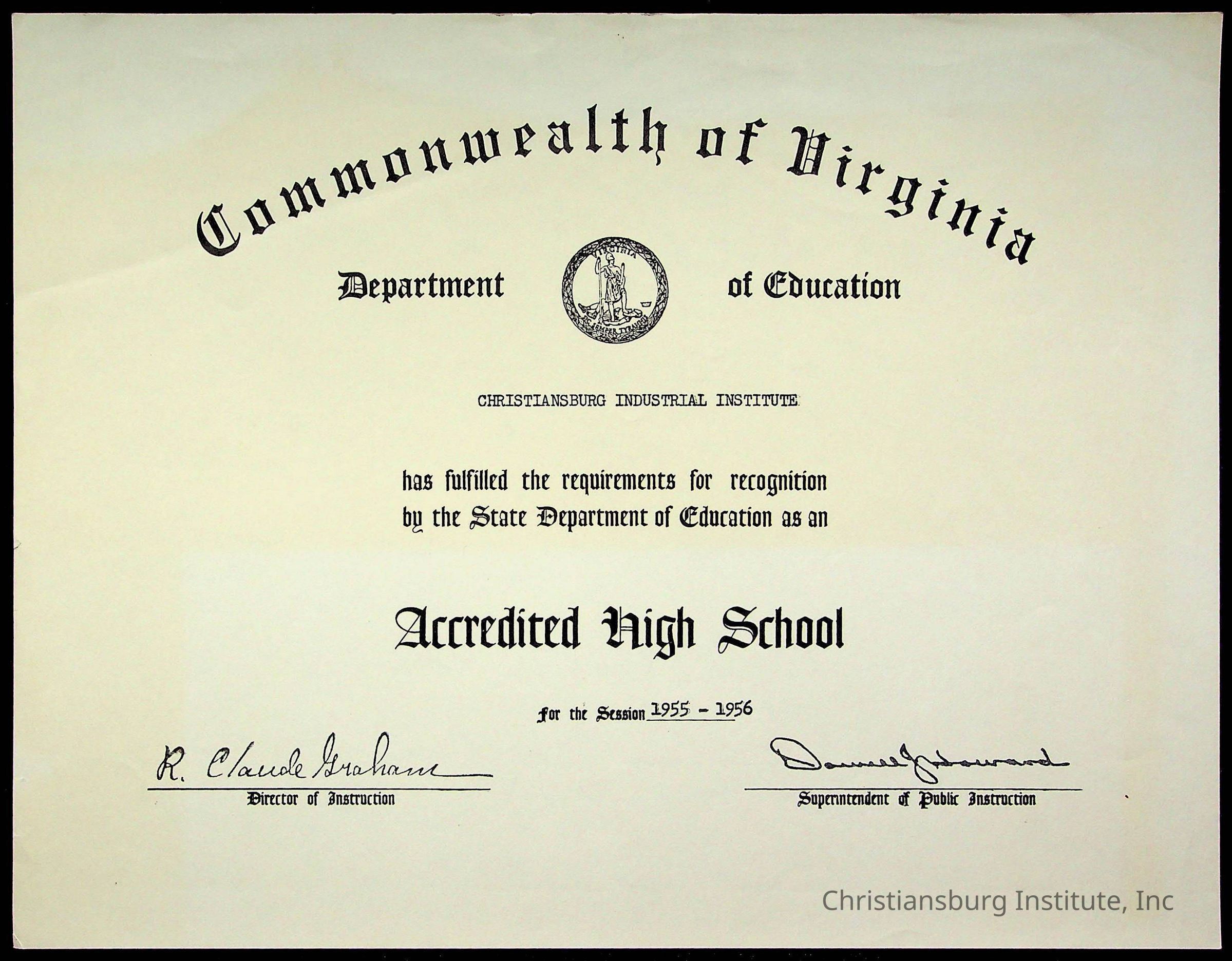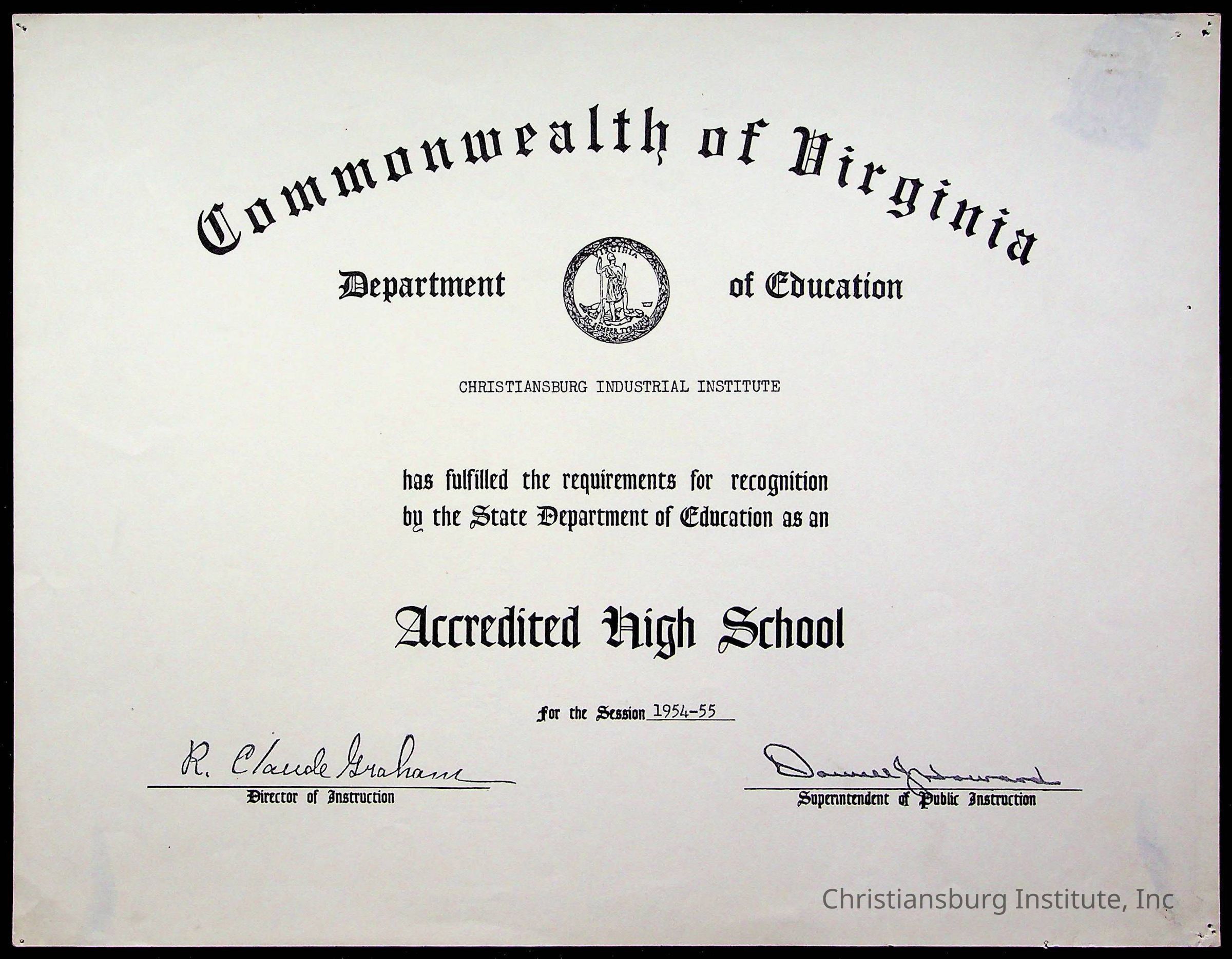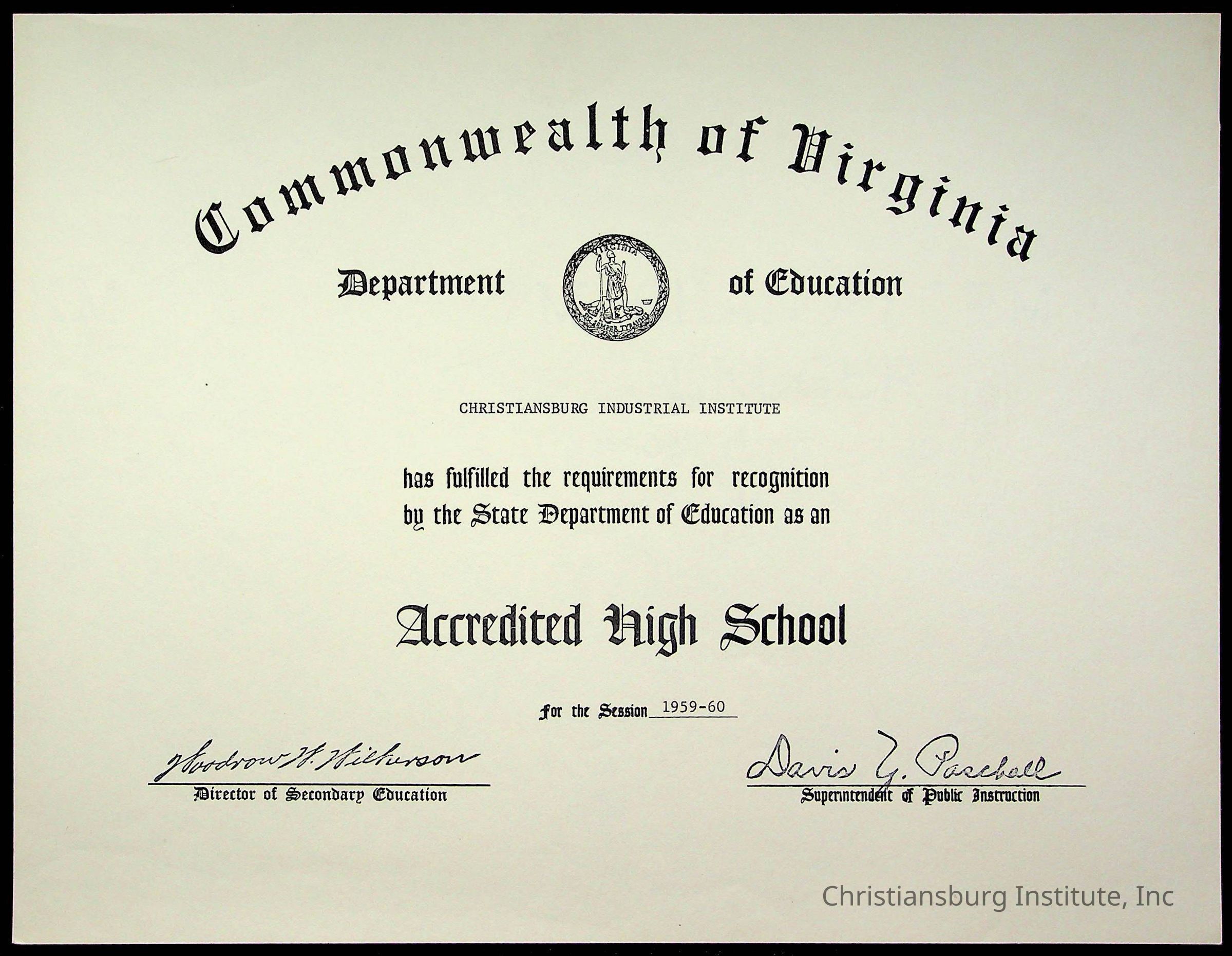An archive of certificates issued to Christiansburg Institute including from the Commonwealth of Virginia, Boys Town, and the Virginia Interscholastic Association, date range 1951-1965.Collection